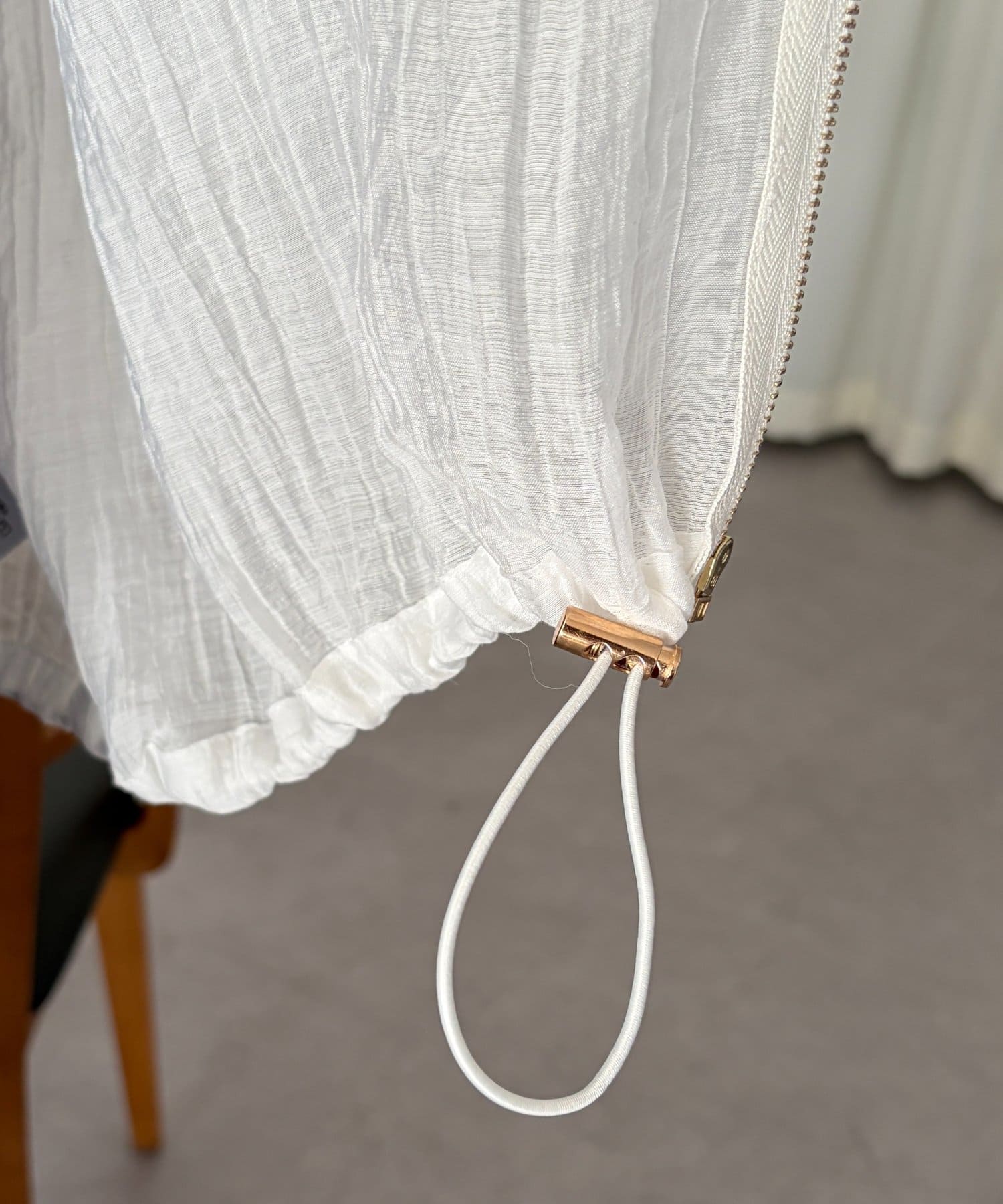 両サイドの裾部分にはドロストが付いており、ギャザーを寄せると丸みのあるデザインに。メリハリのあるデザインになっています。