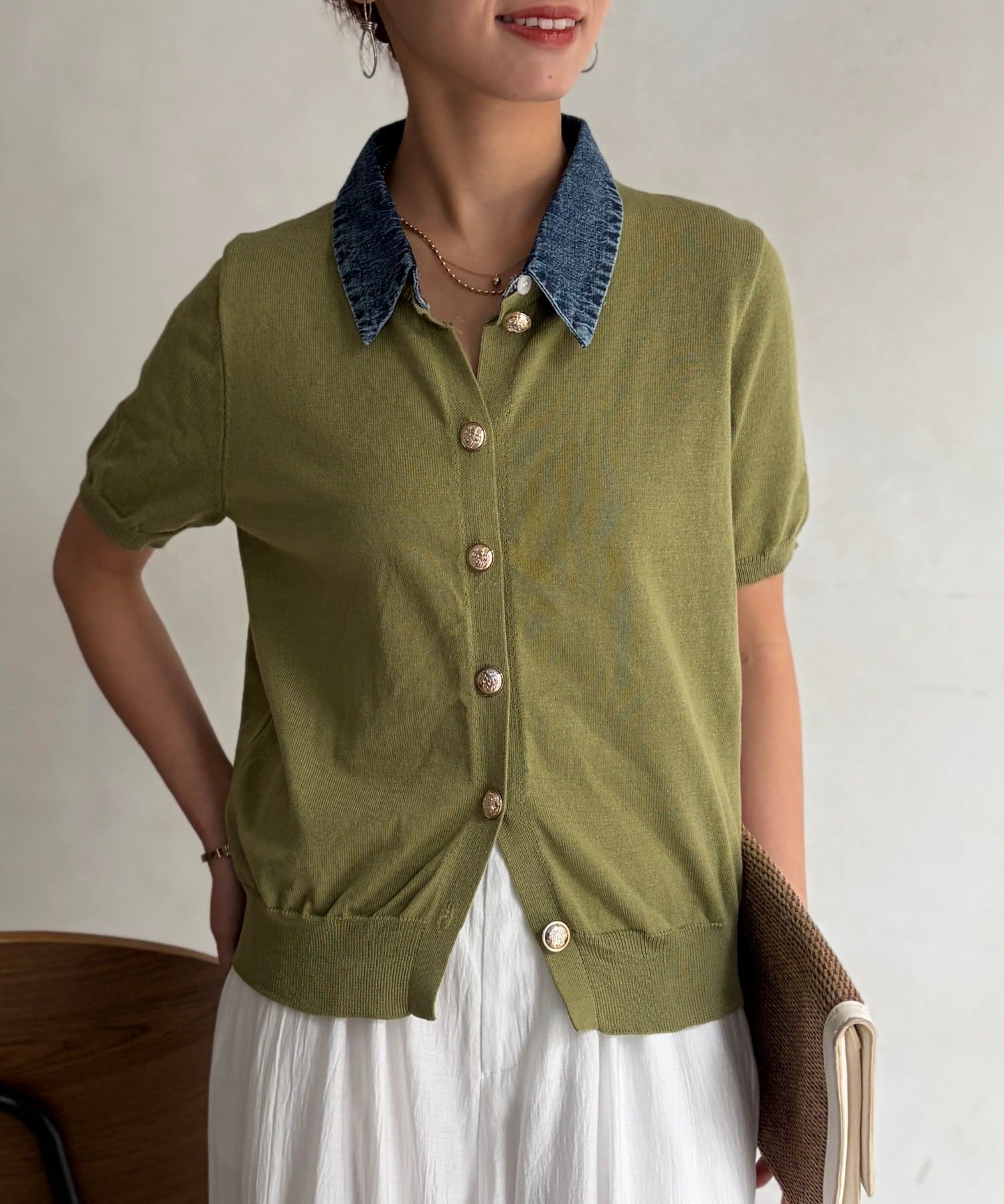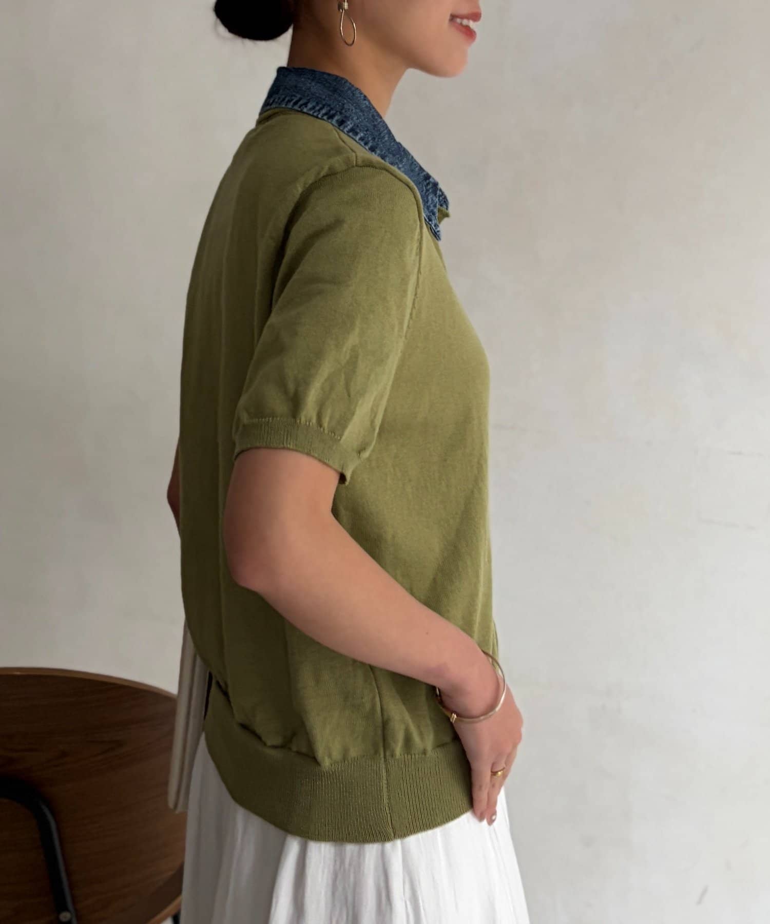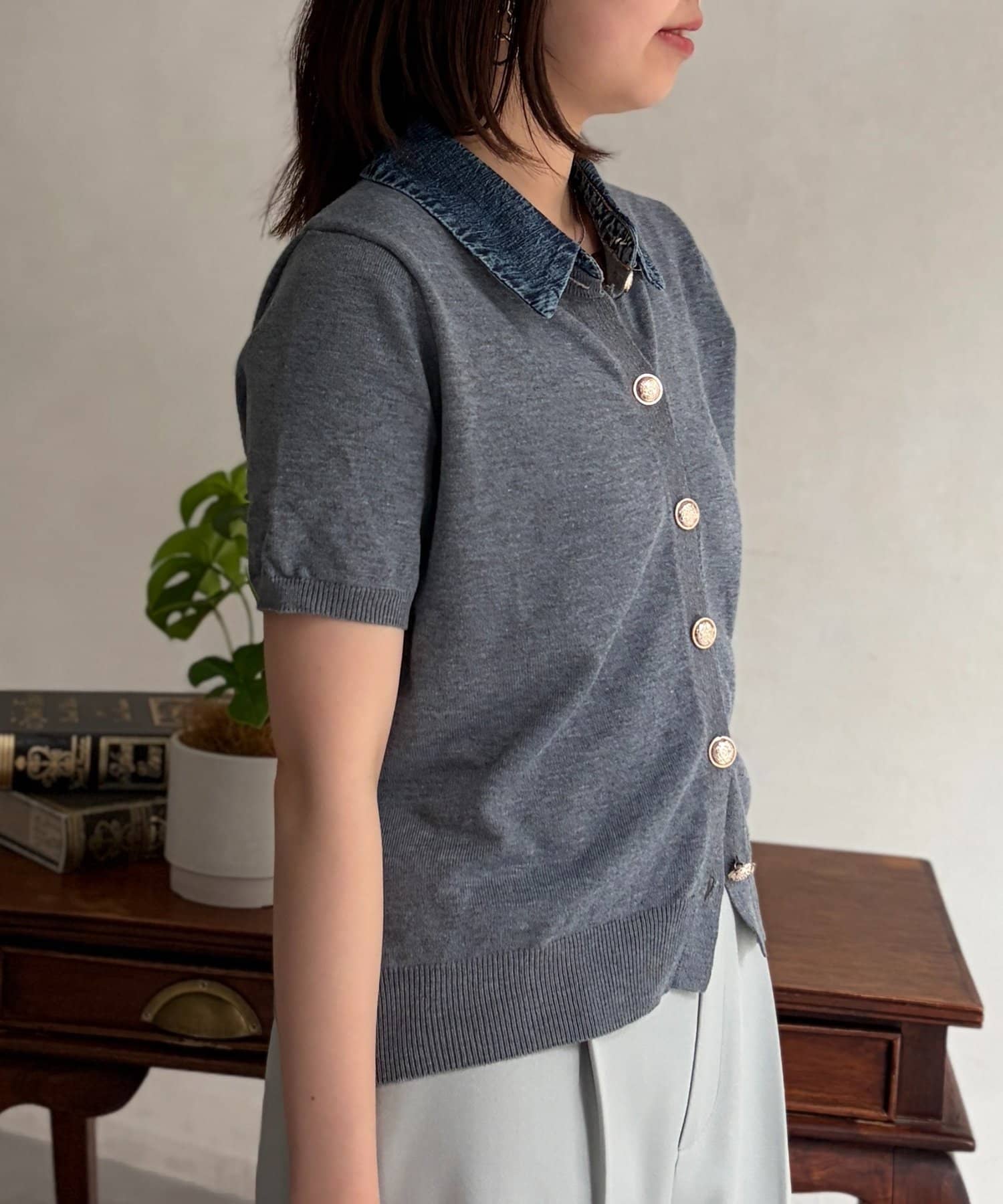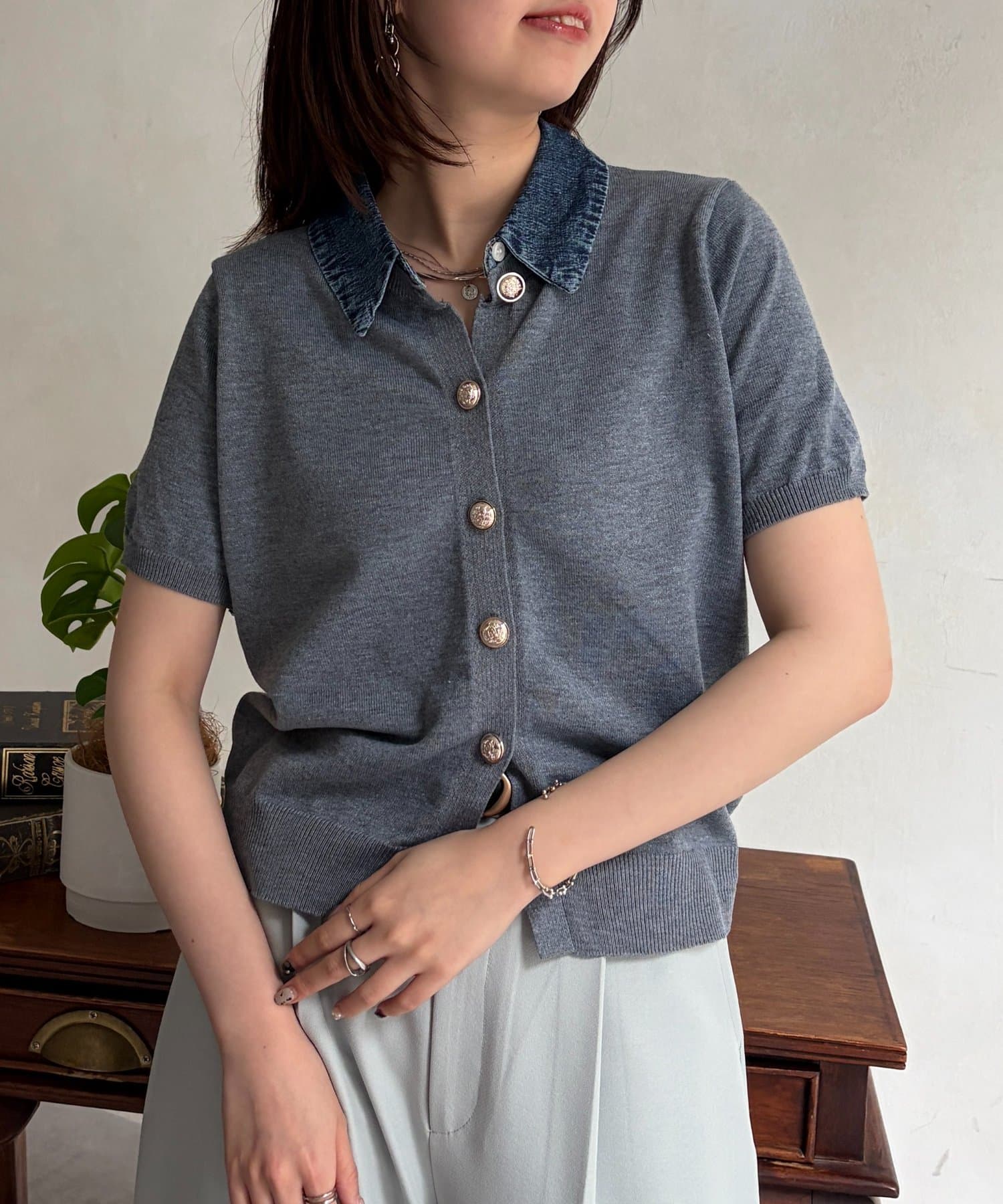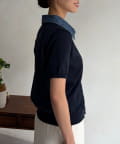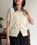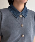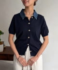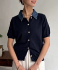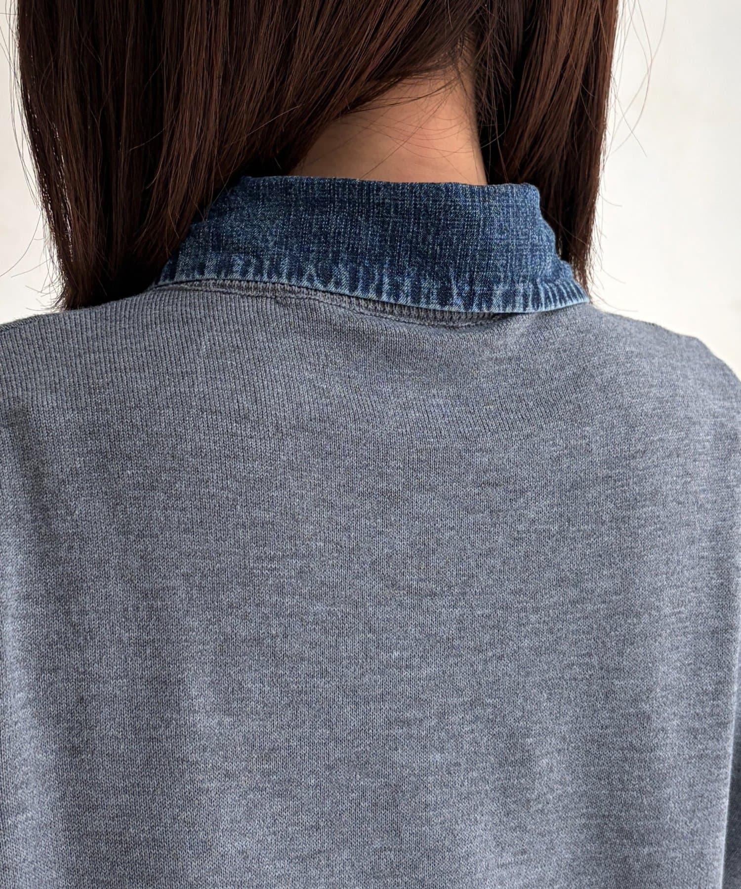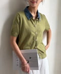 襟元のデニム素材がアクセントになったリブニットシャツ。