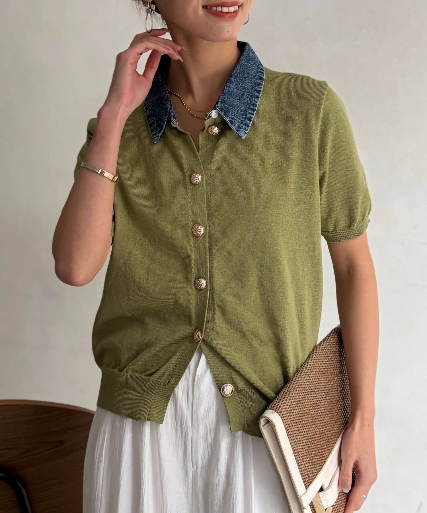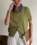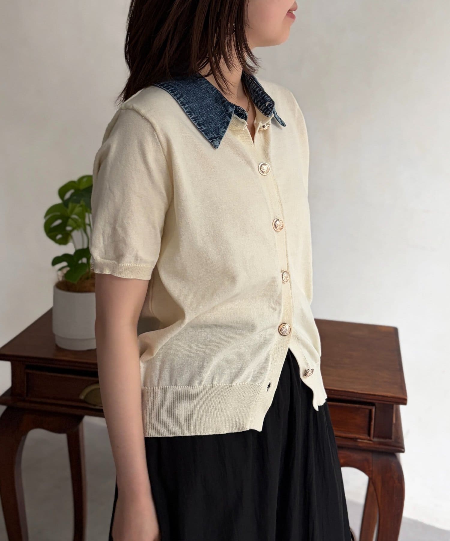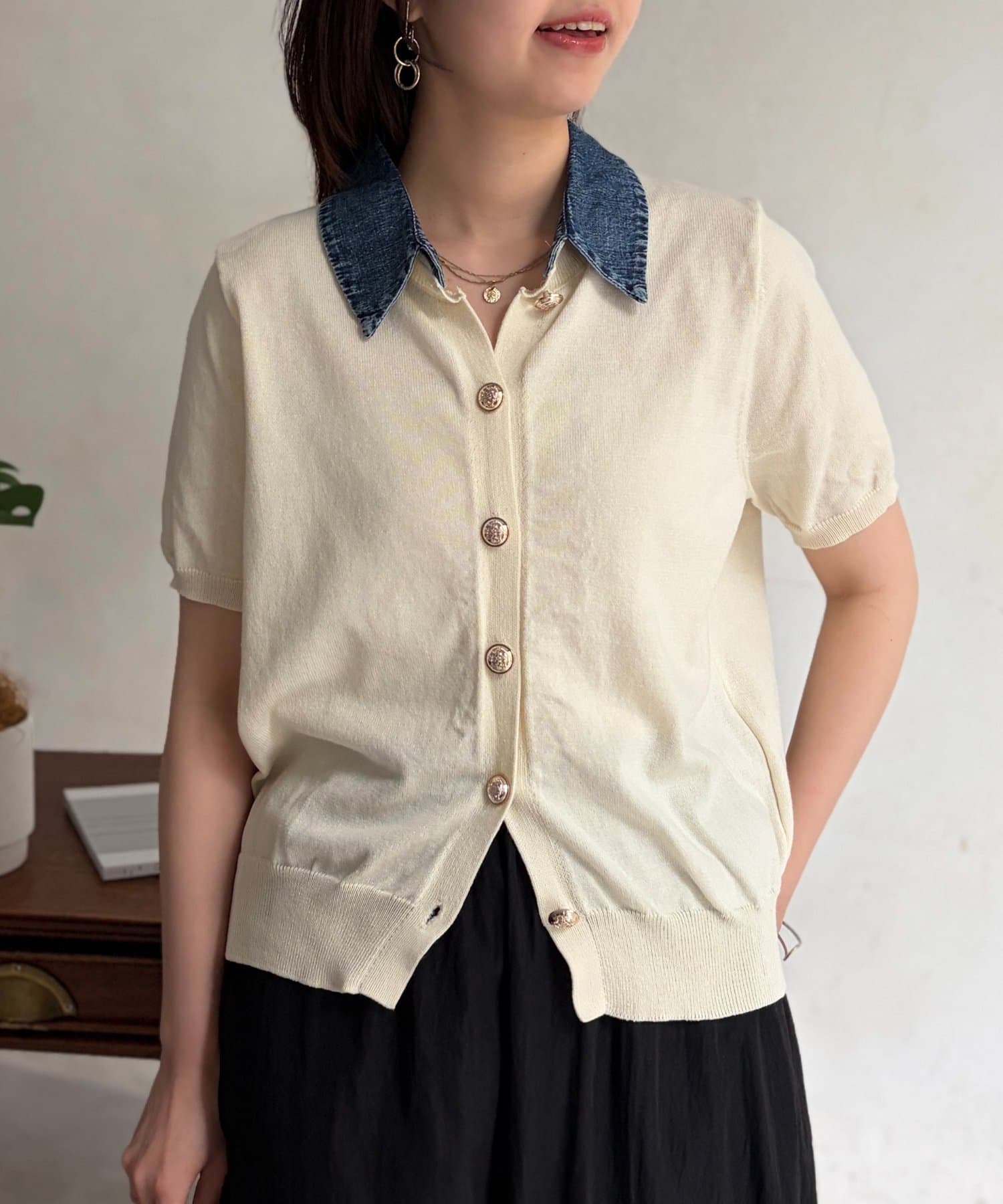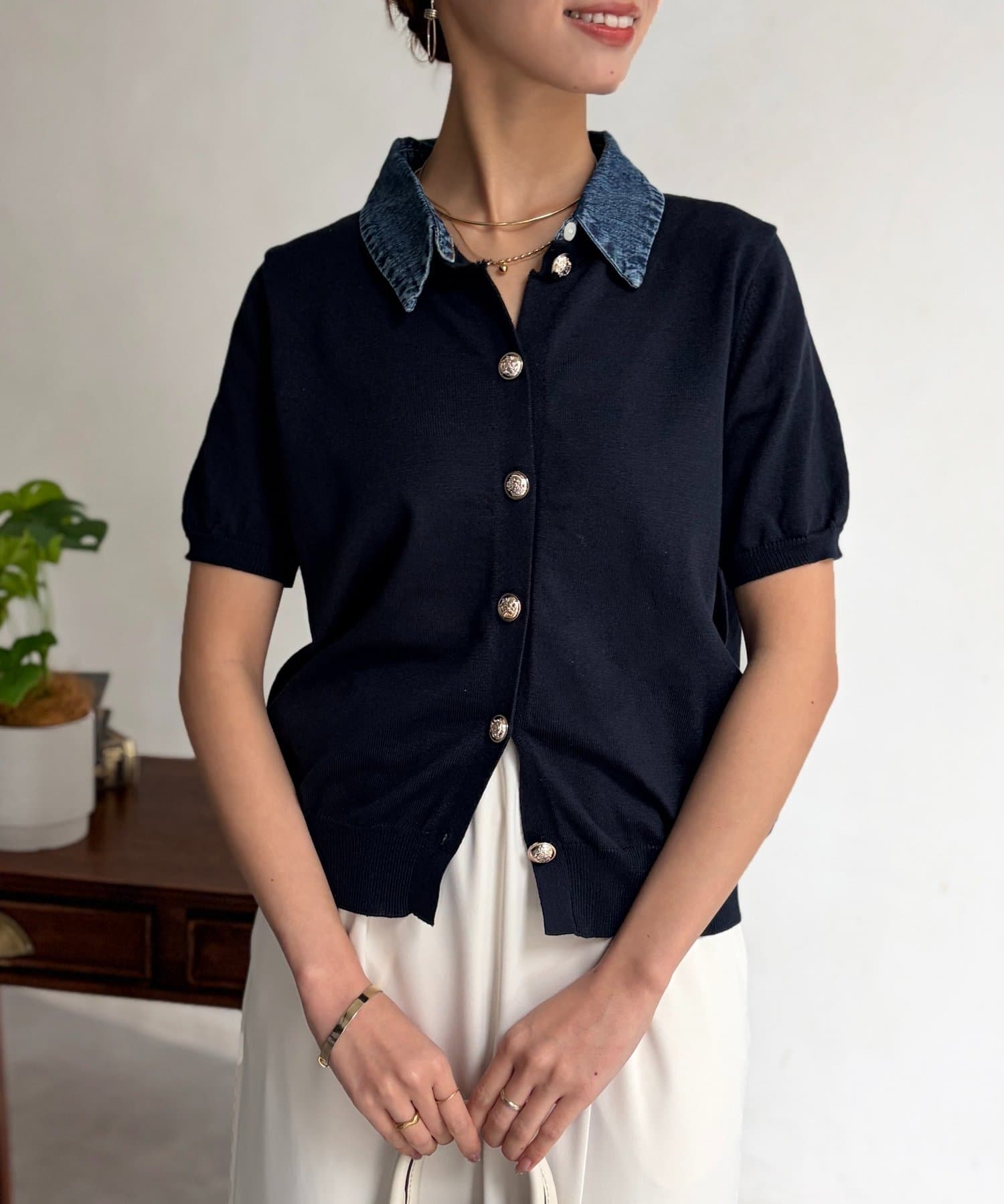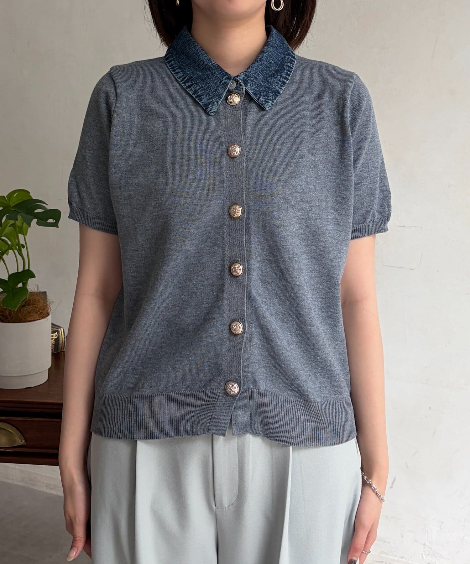 襟元のデニム素材がアクセントになったリブニットシャツ。