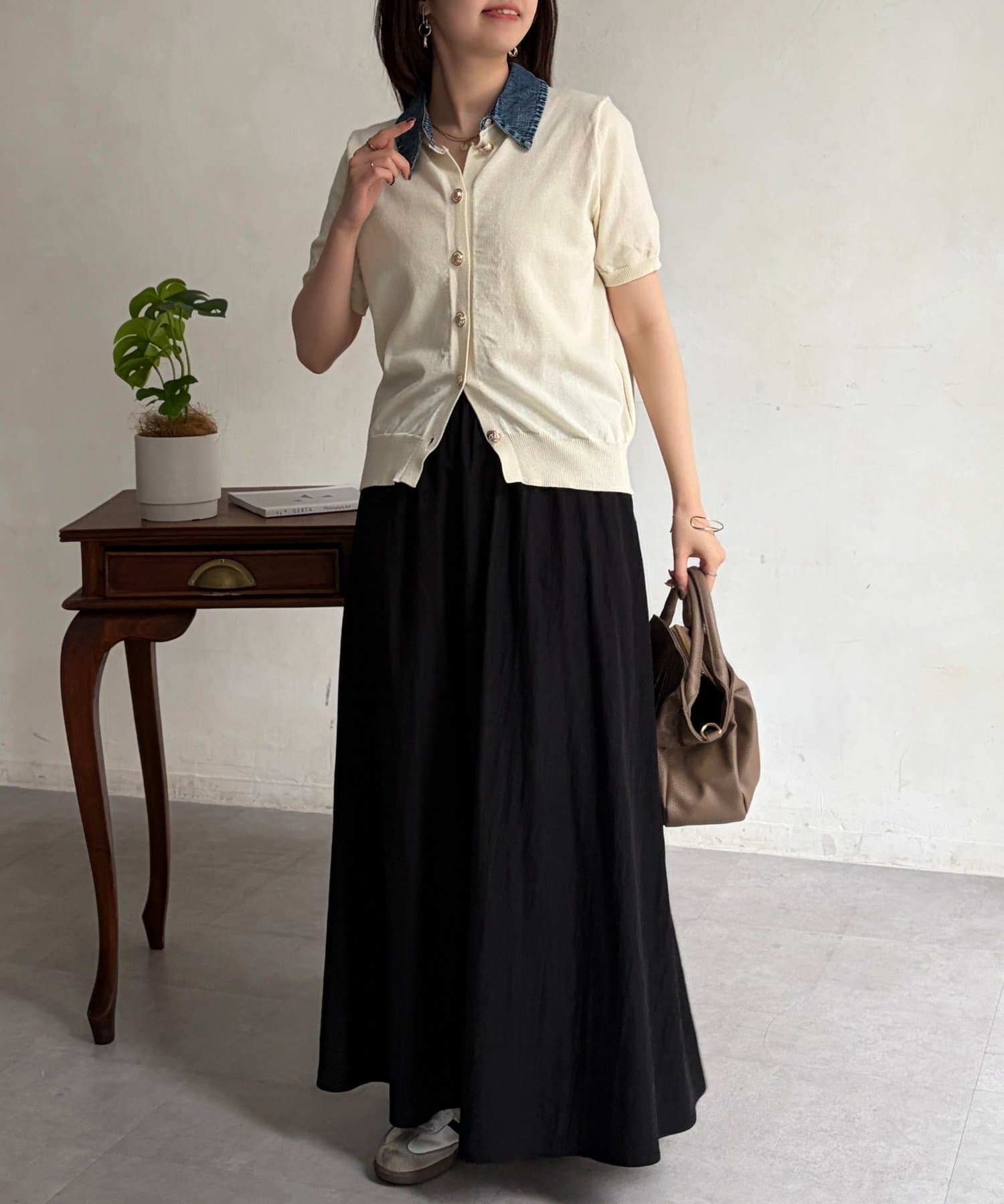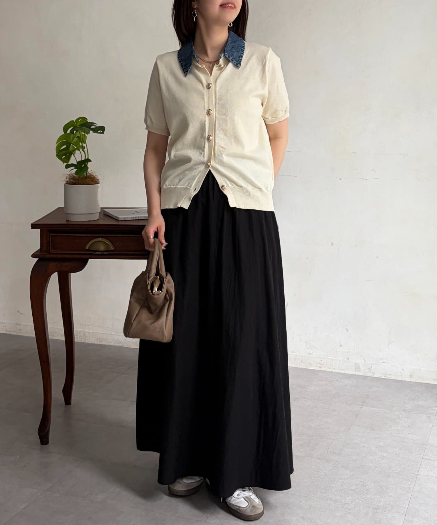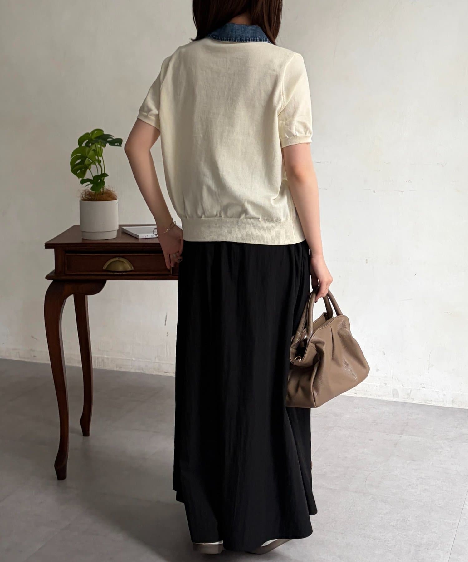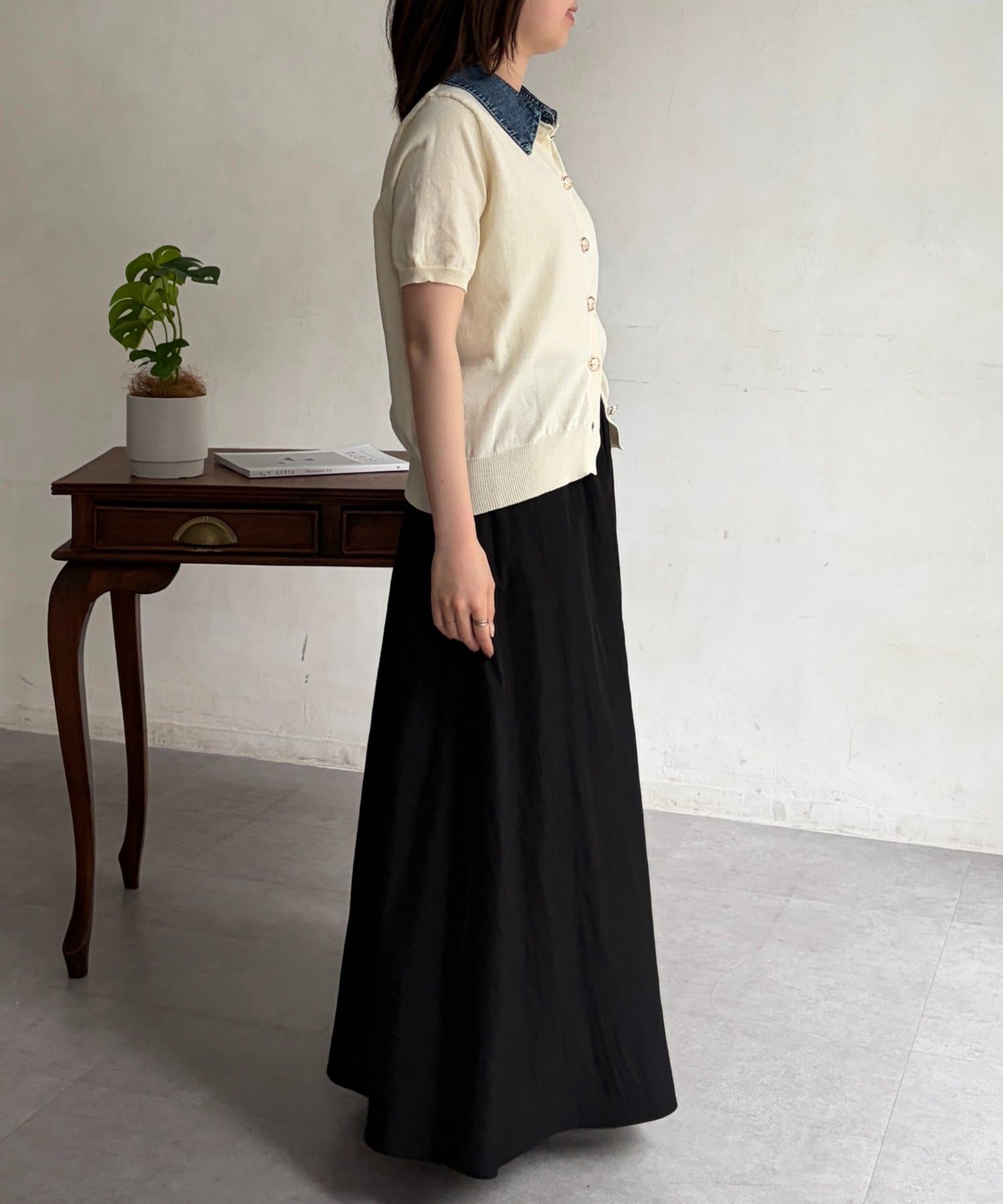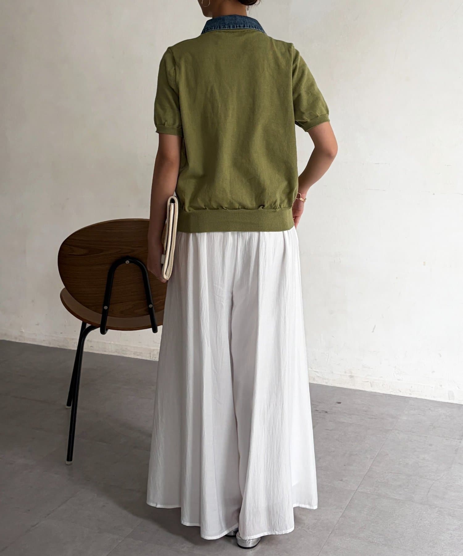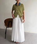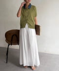 襟元のデニム素材がアクセントになったリブニットシャツ。