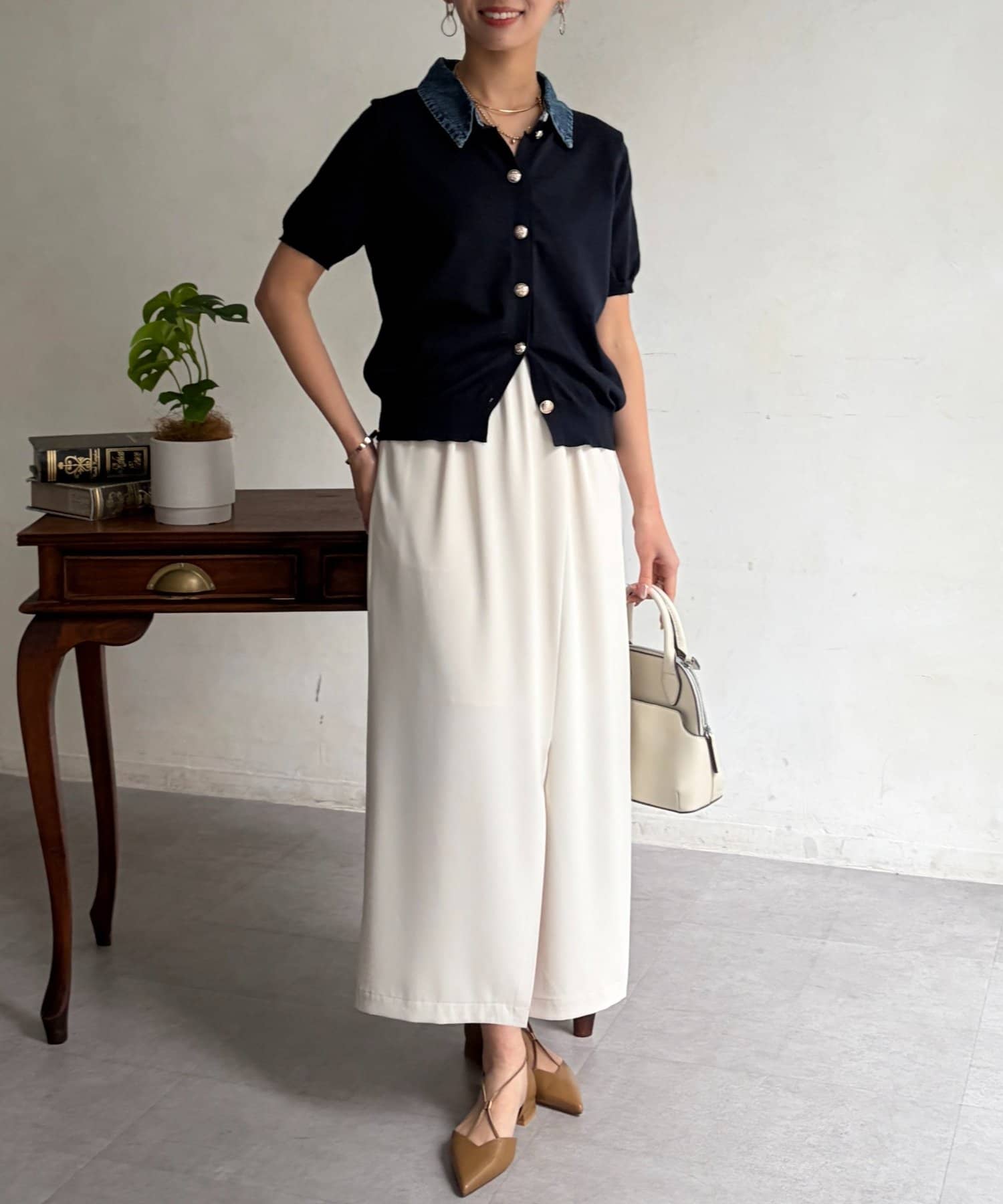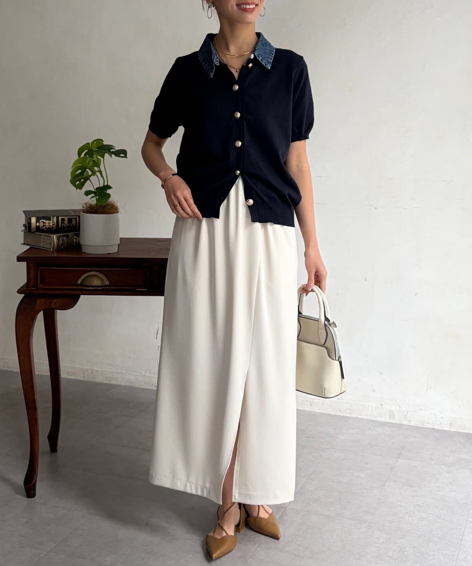 タイトスカートやスラックスと合わせて、足元はパンプスで上品にまとめてオフィスにも。