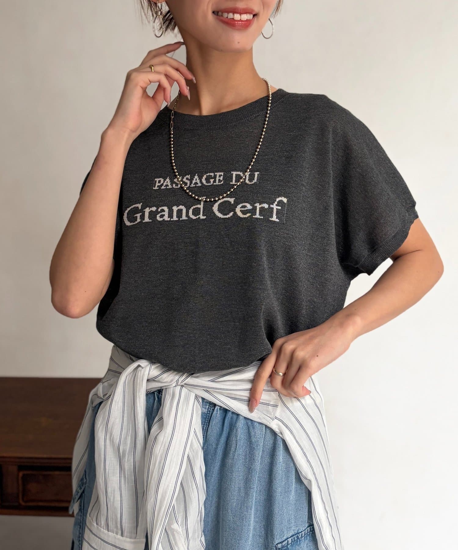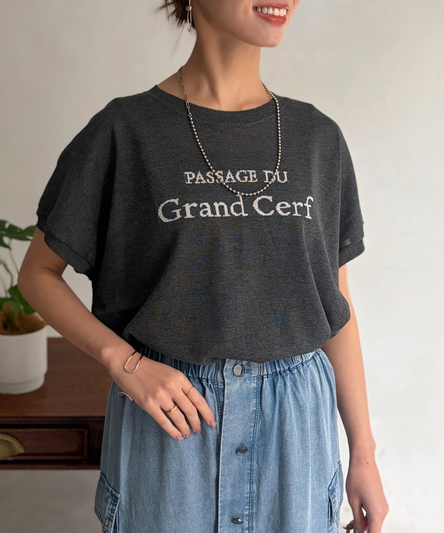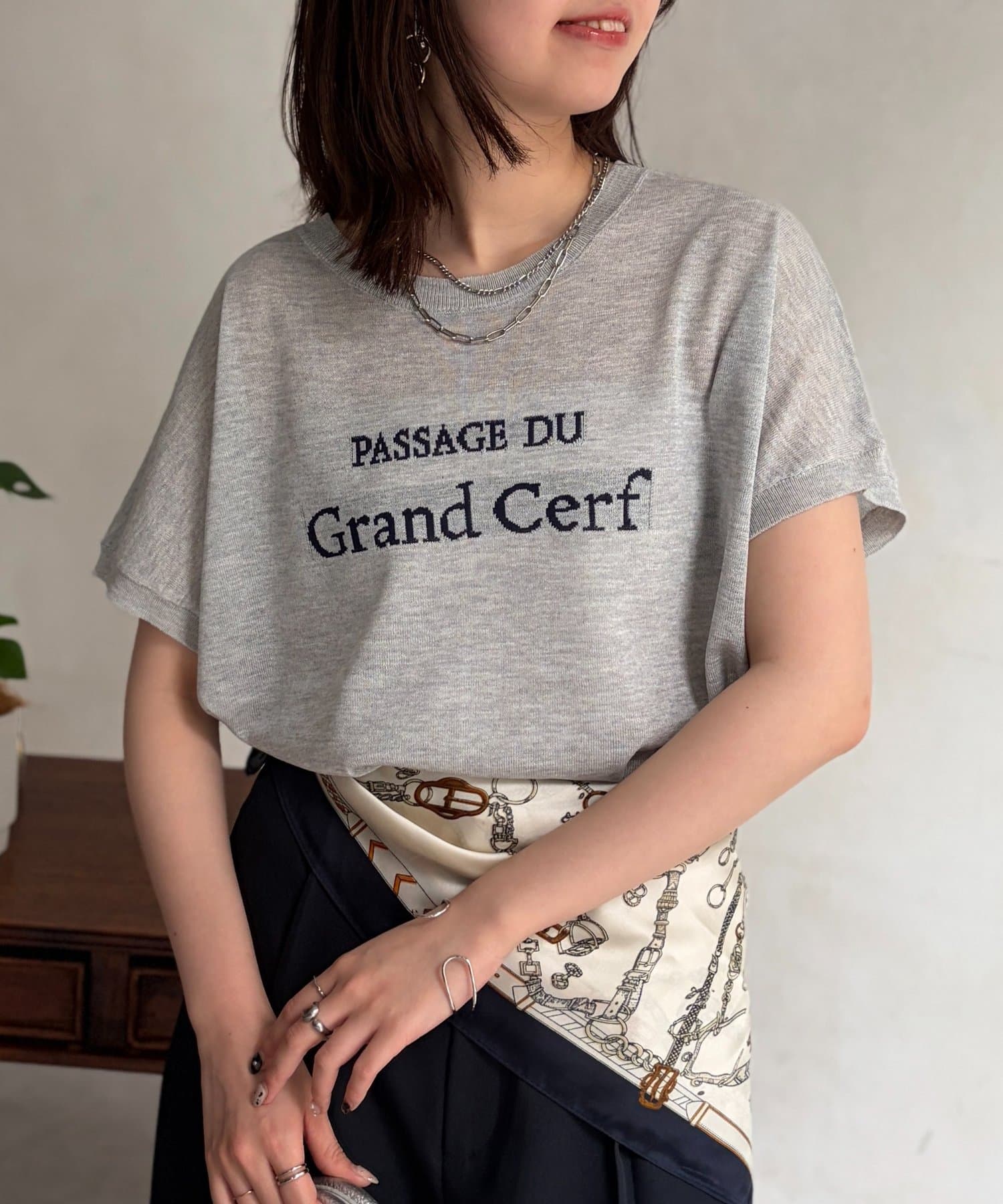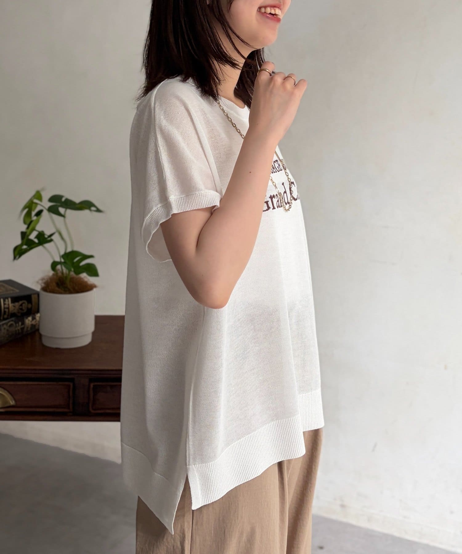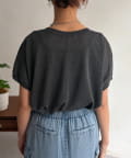 ほんのりとシアー感のある素材と、さり気ない配色で拘ったロゴがポイントの一枚。