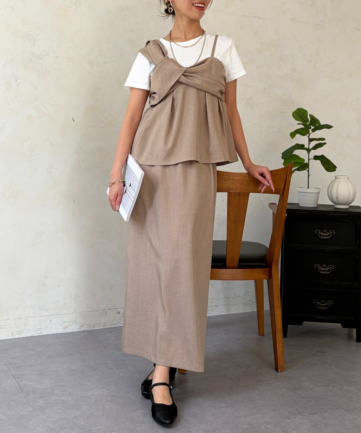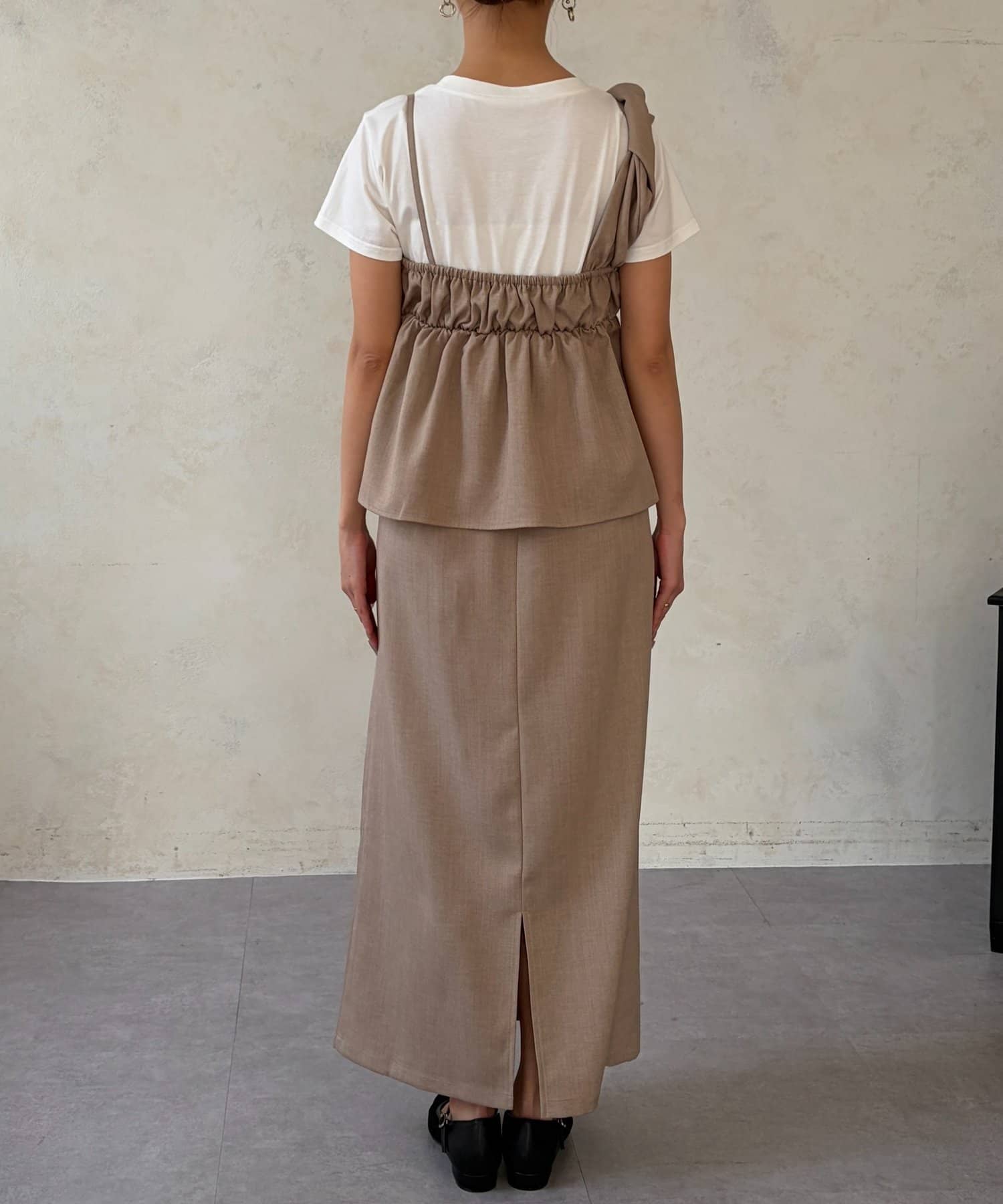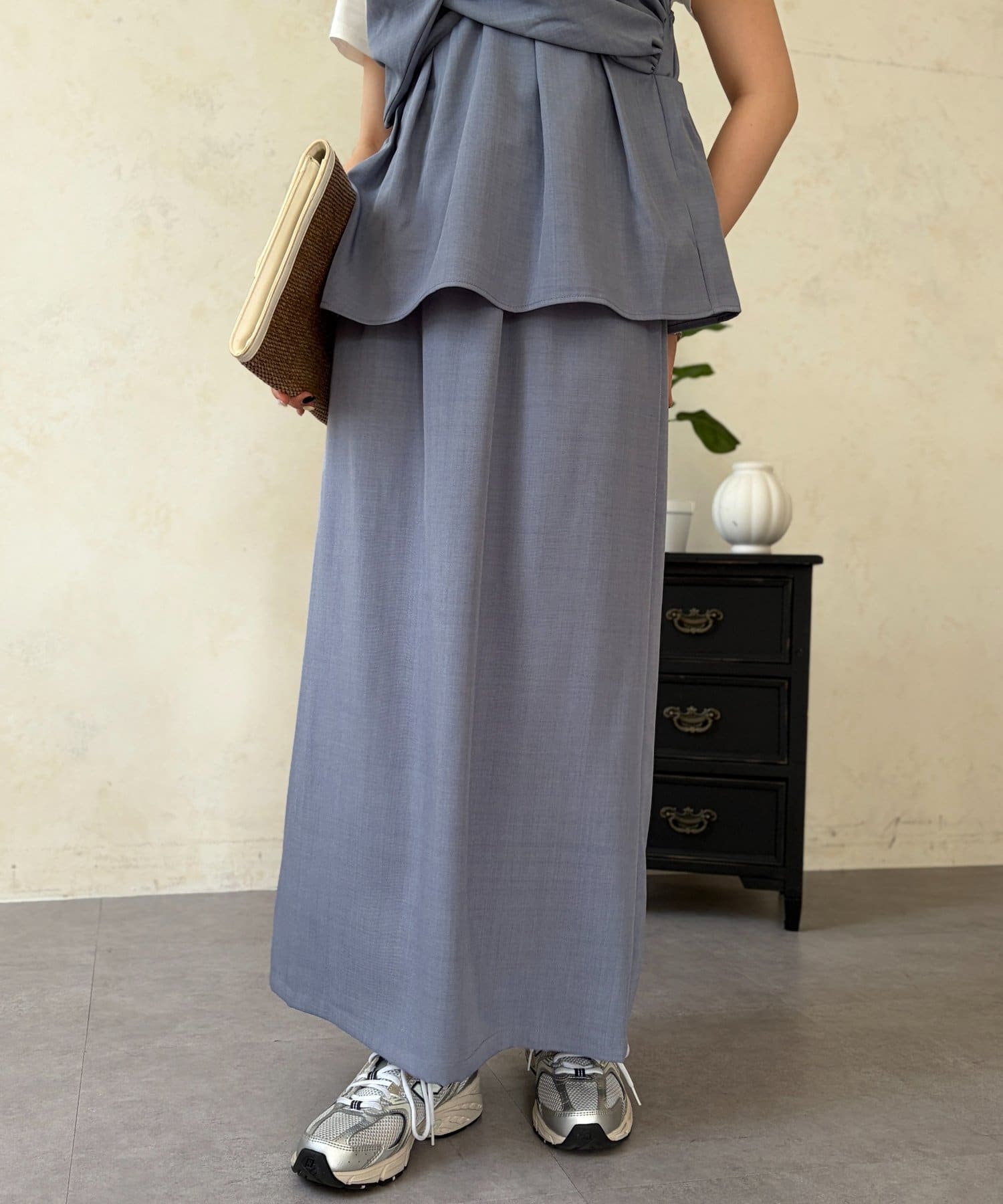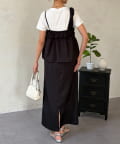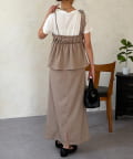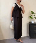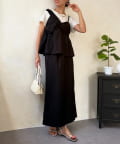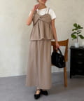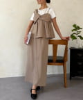 1枚でレイヤード見えするデザインのドッキングトップスと楽ちんなナロースカートのセットアイテム。