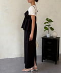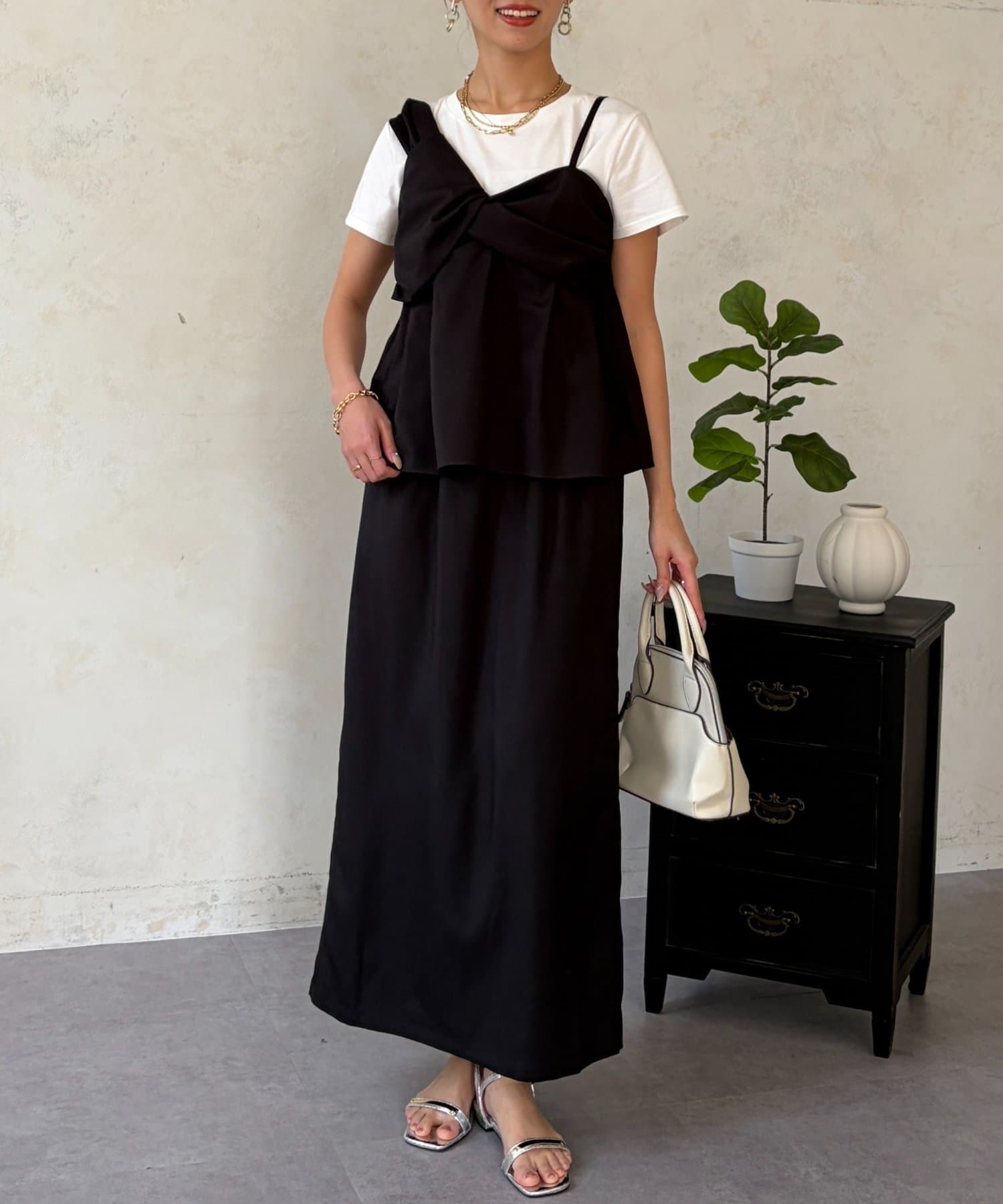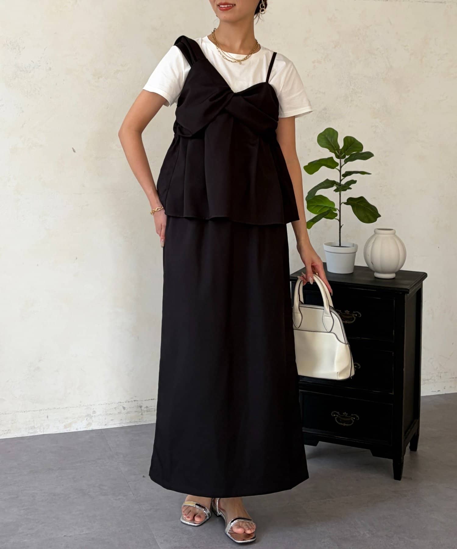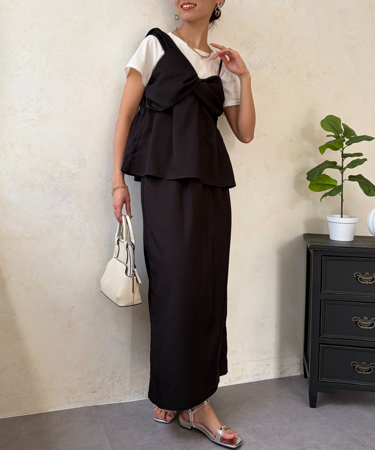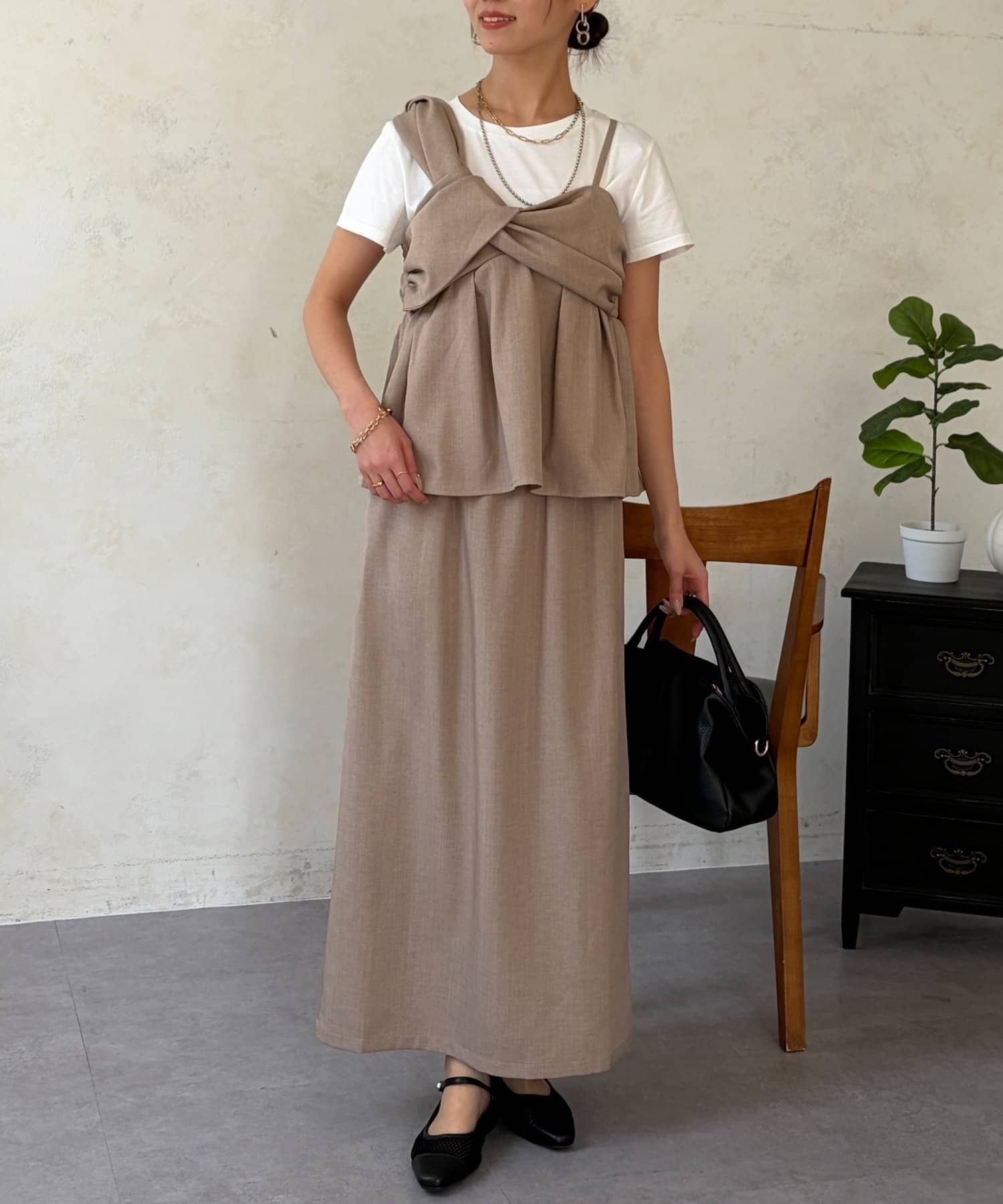 1枚でレイヤード見えするデザインのドッキングトップスと楽ちんなナロースカートのセットアイテム。