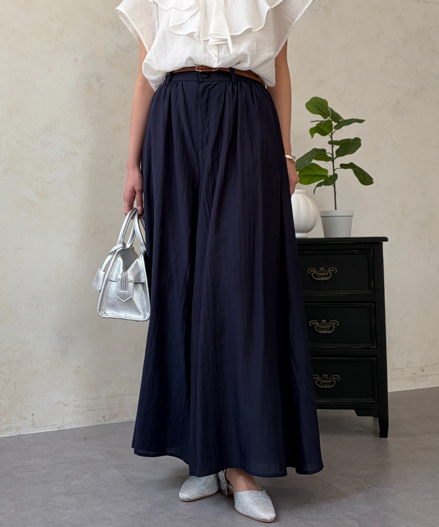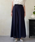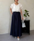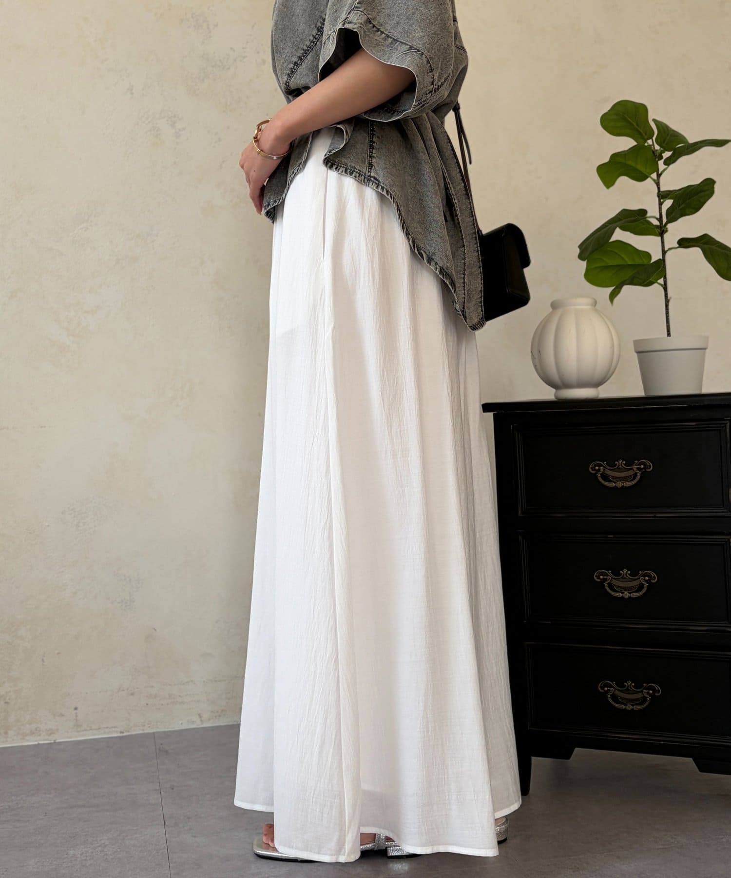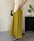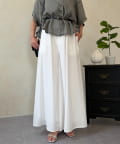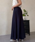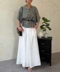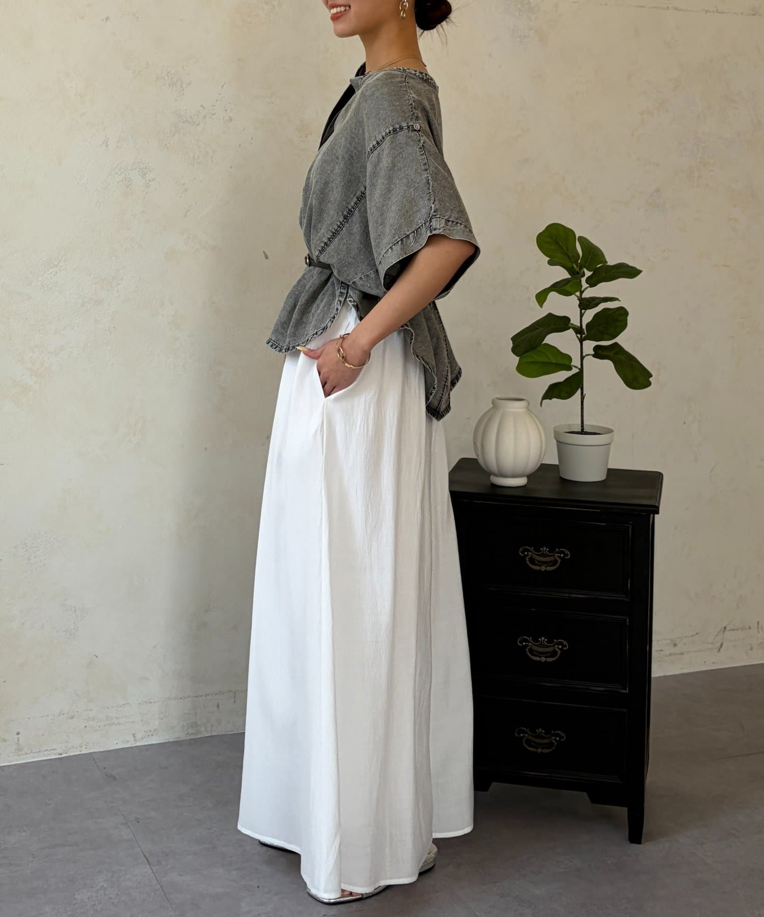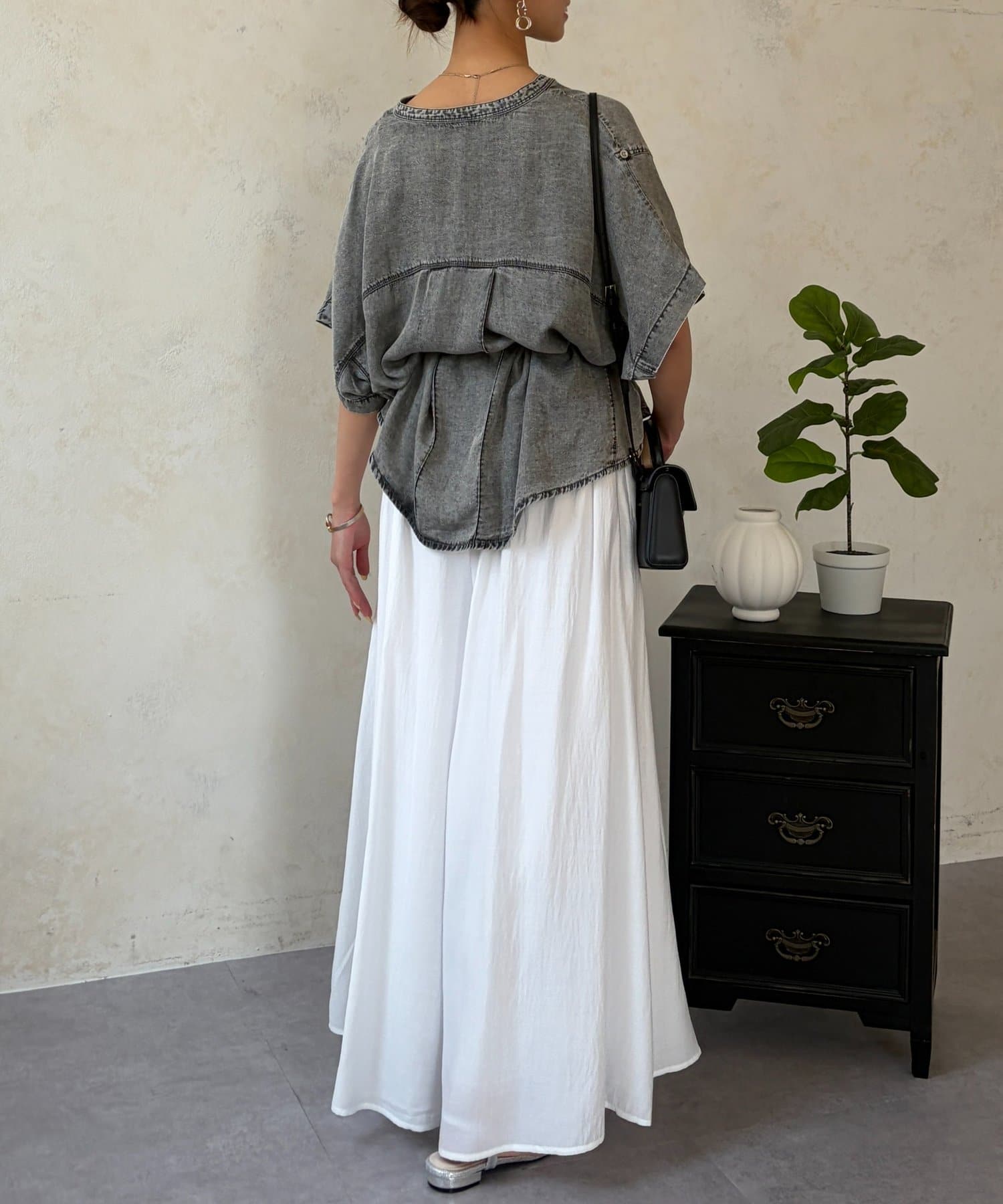 フレアシルエットでボディラインを拾いにくく、トップスとのバランスも取りやすい1着。