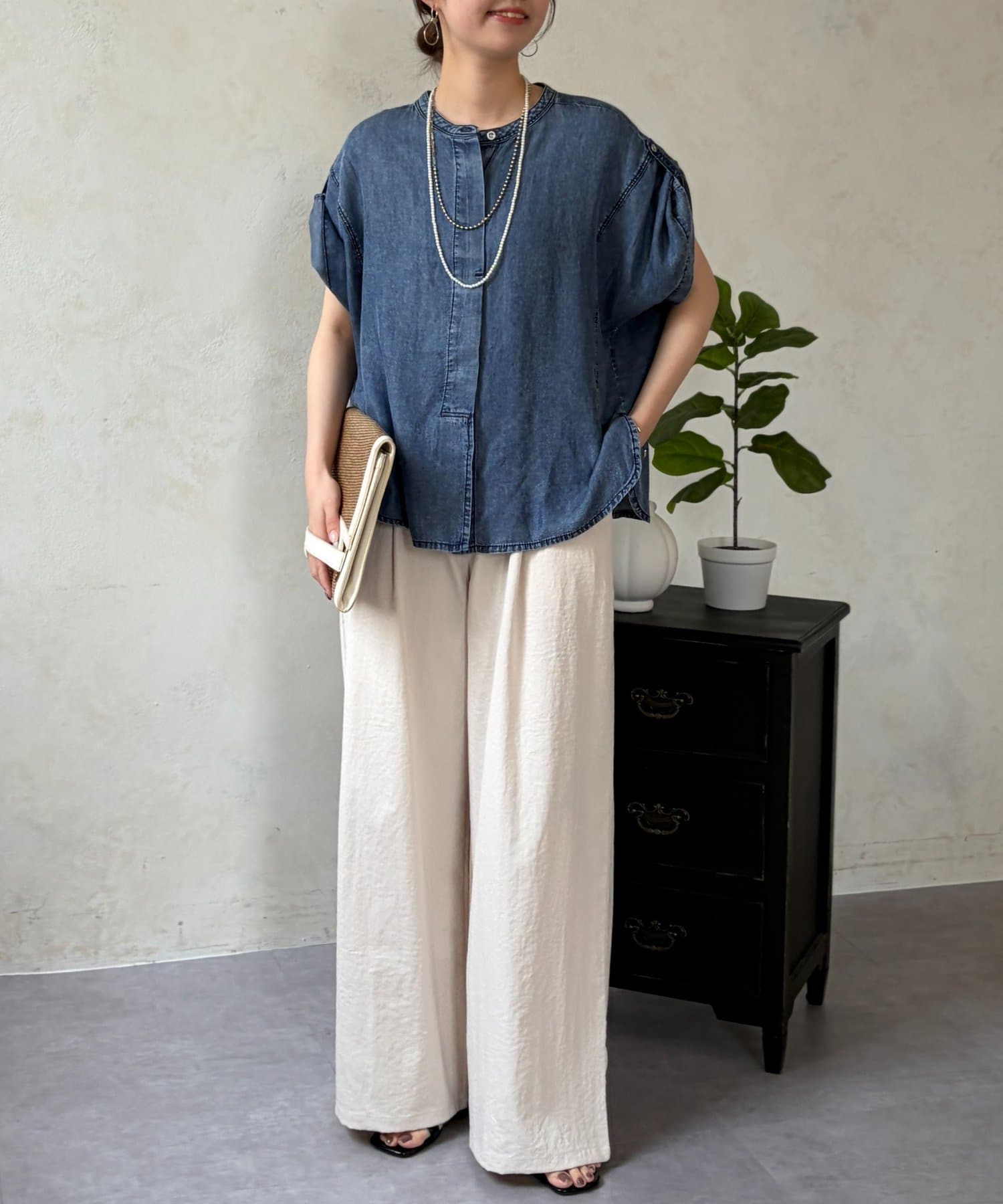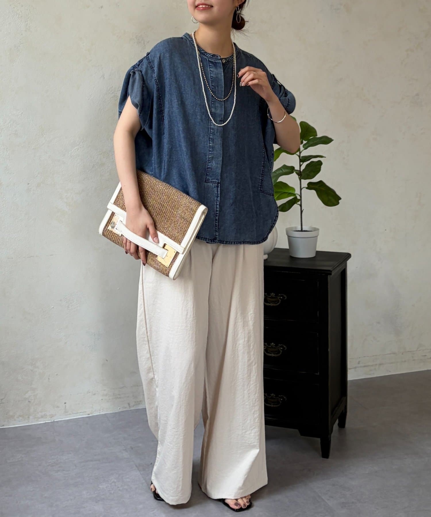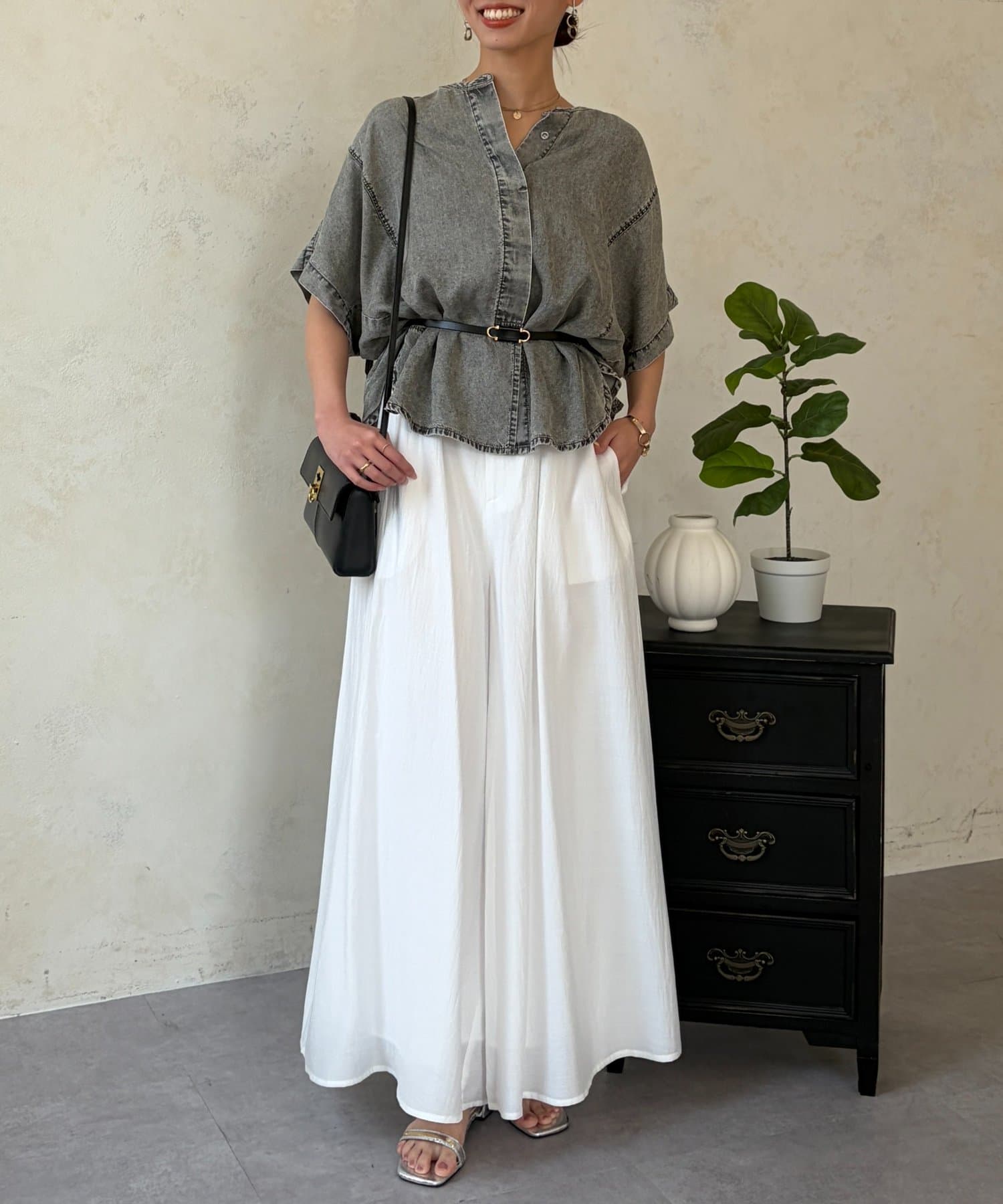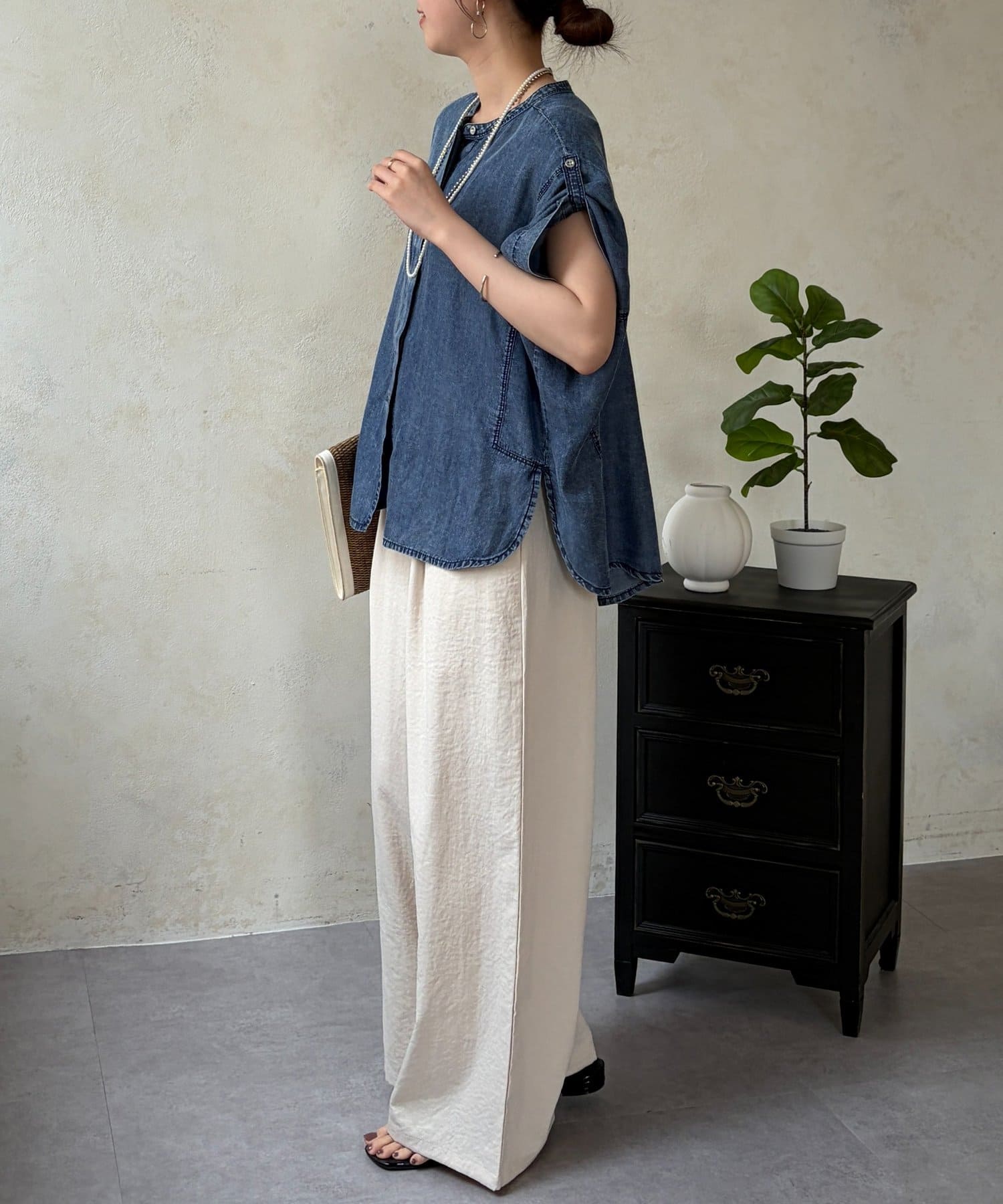 デニムパンツやワイドパンツと合わせてカジュアルスタイルはもちろん、ナロースカートなど綺麗めなボトムスと合わせたミックスコーデもおすすめです。