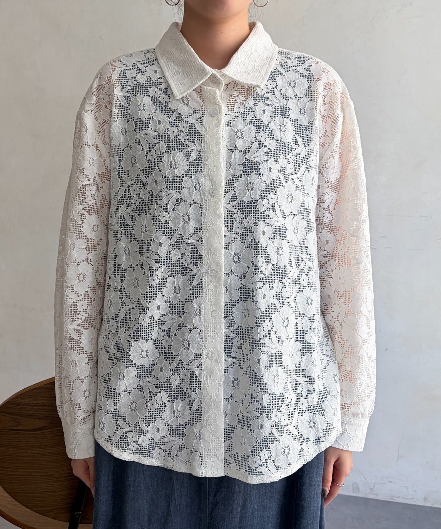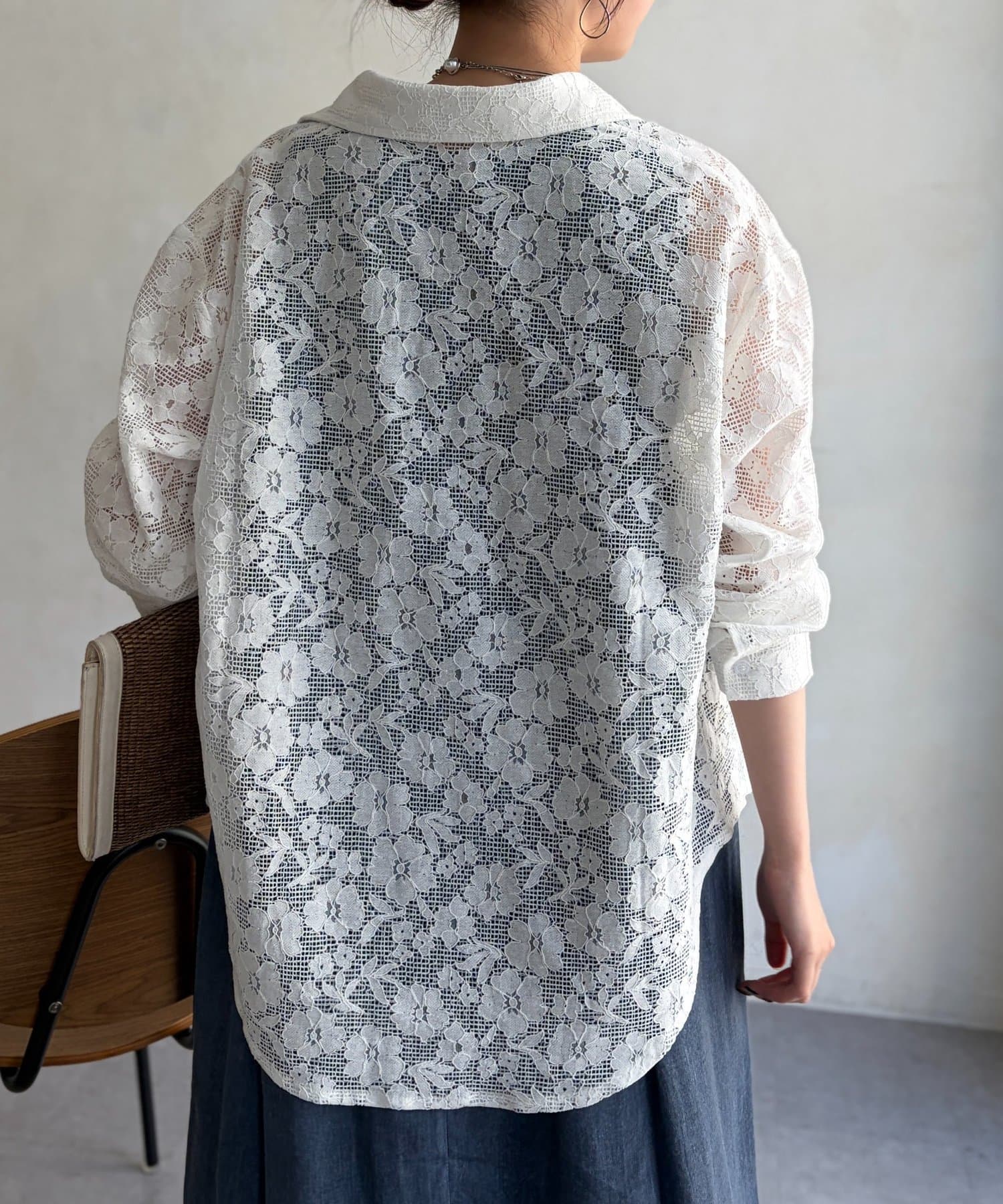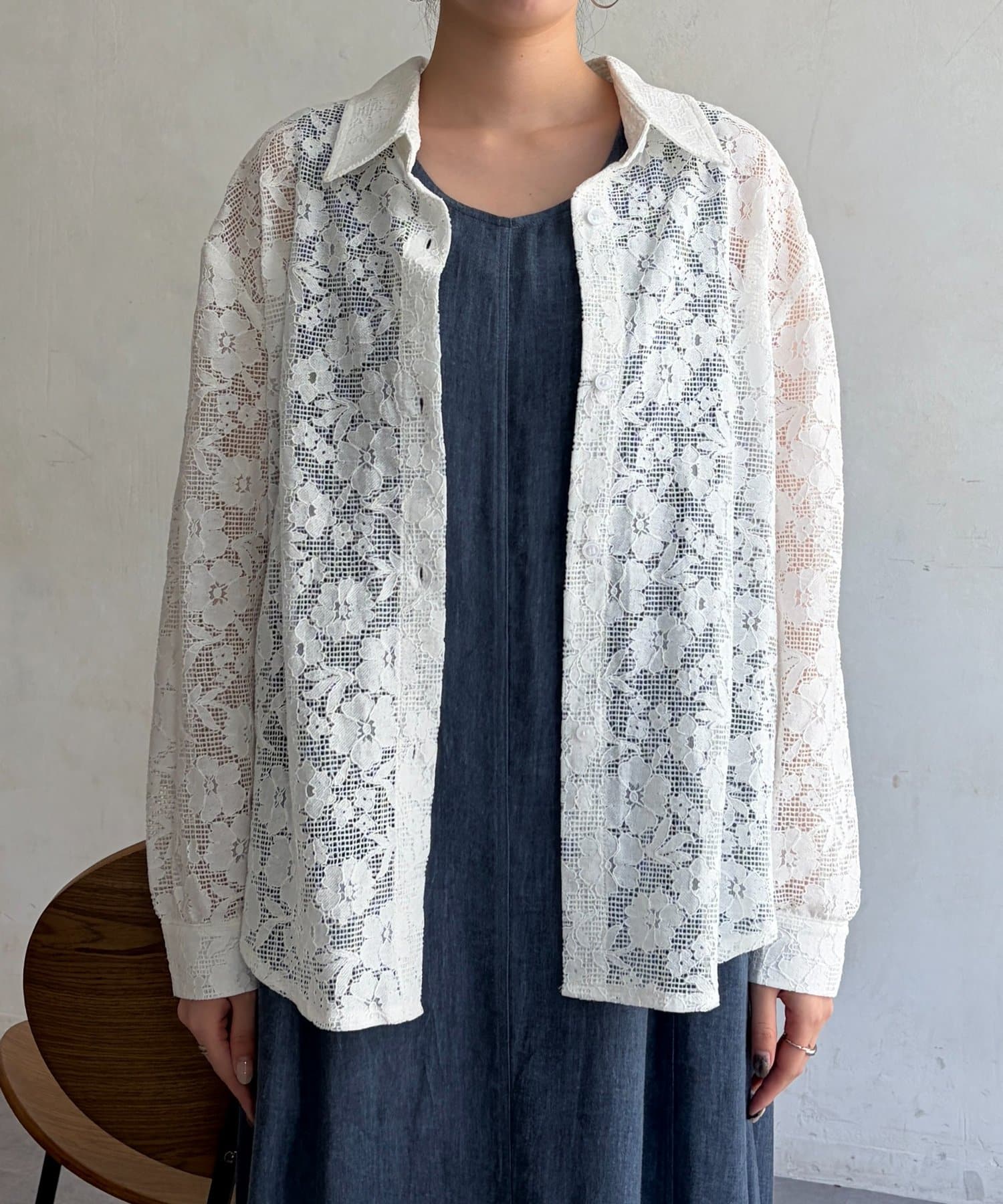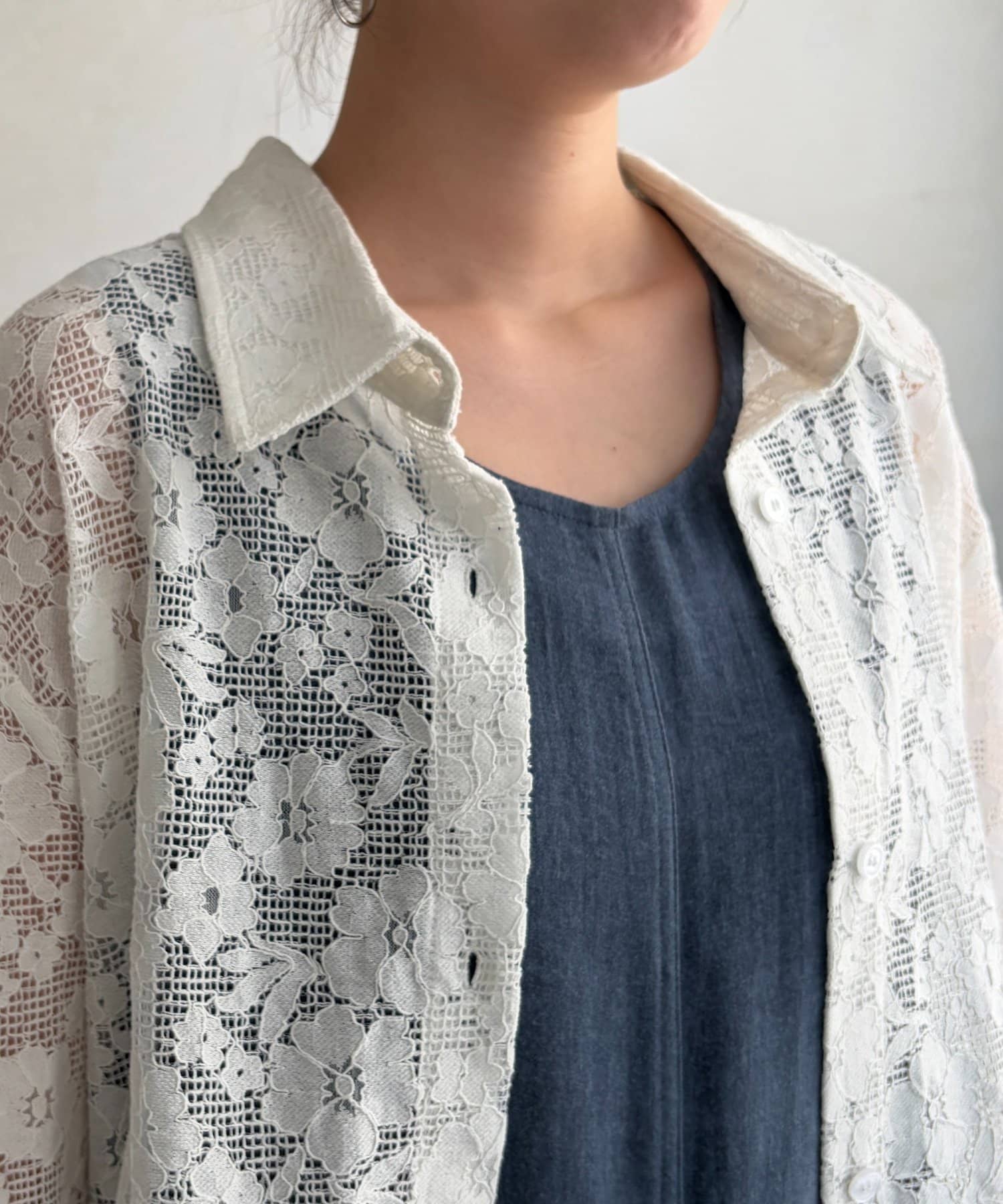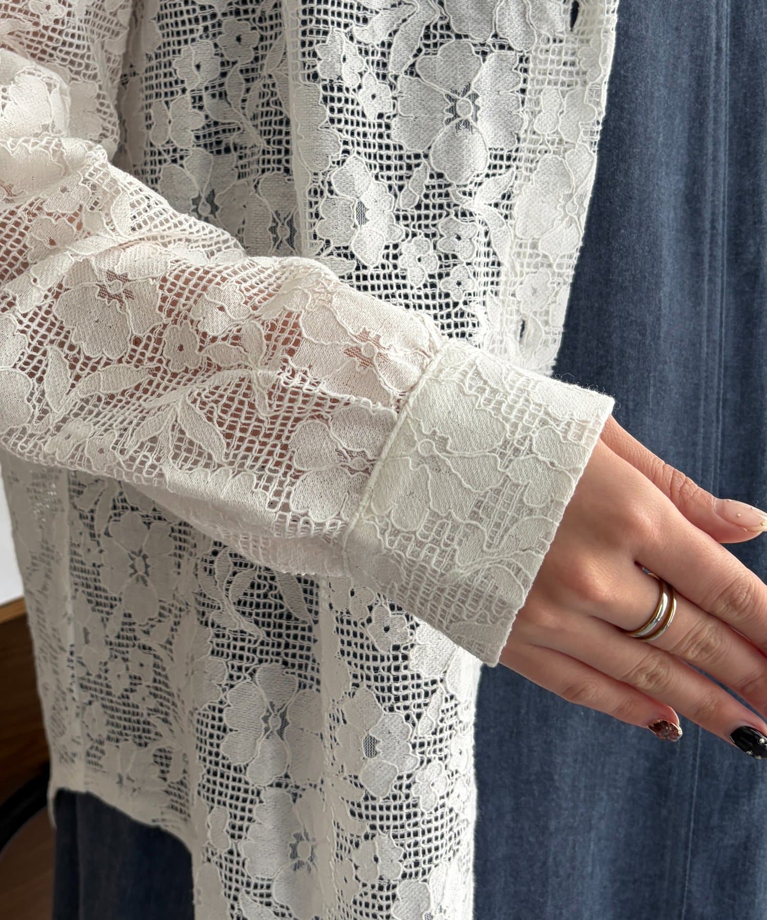 繊細なサラッとした手触りと、通気性の良いレースデザインの表情がポイントの総レース長袖シャツ。