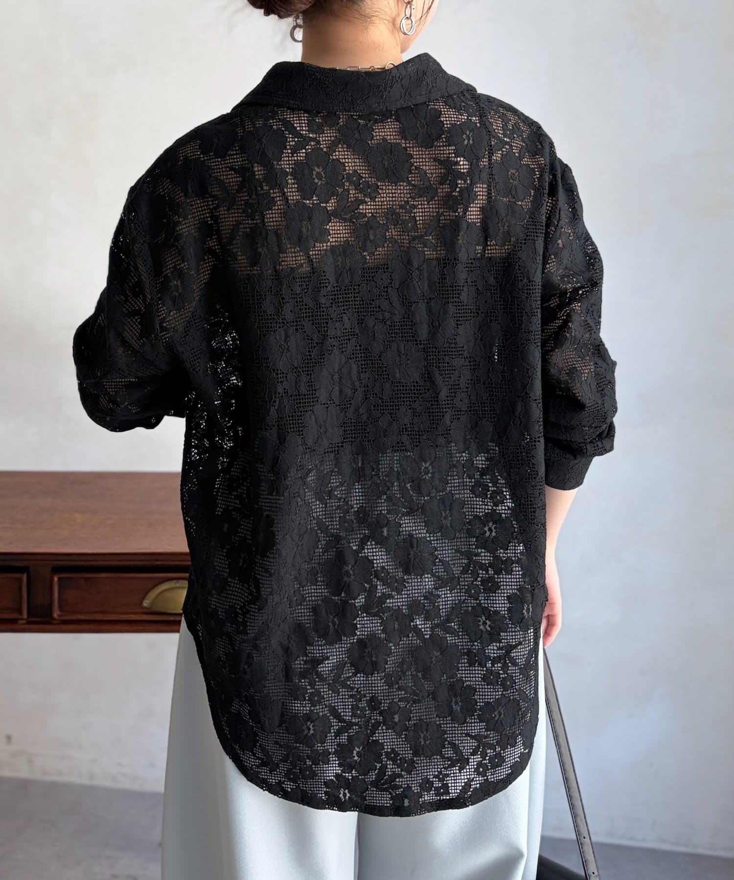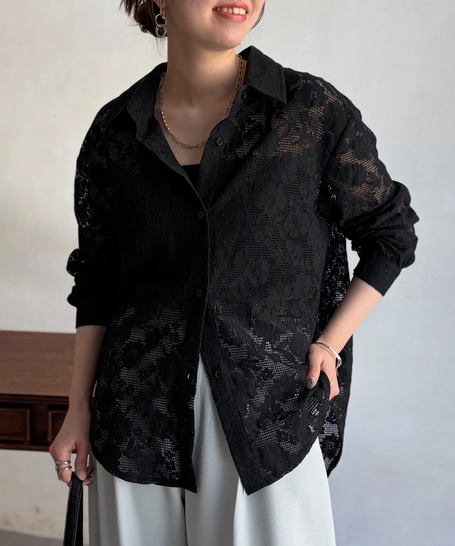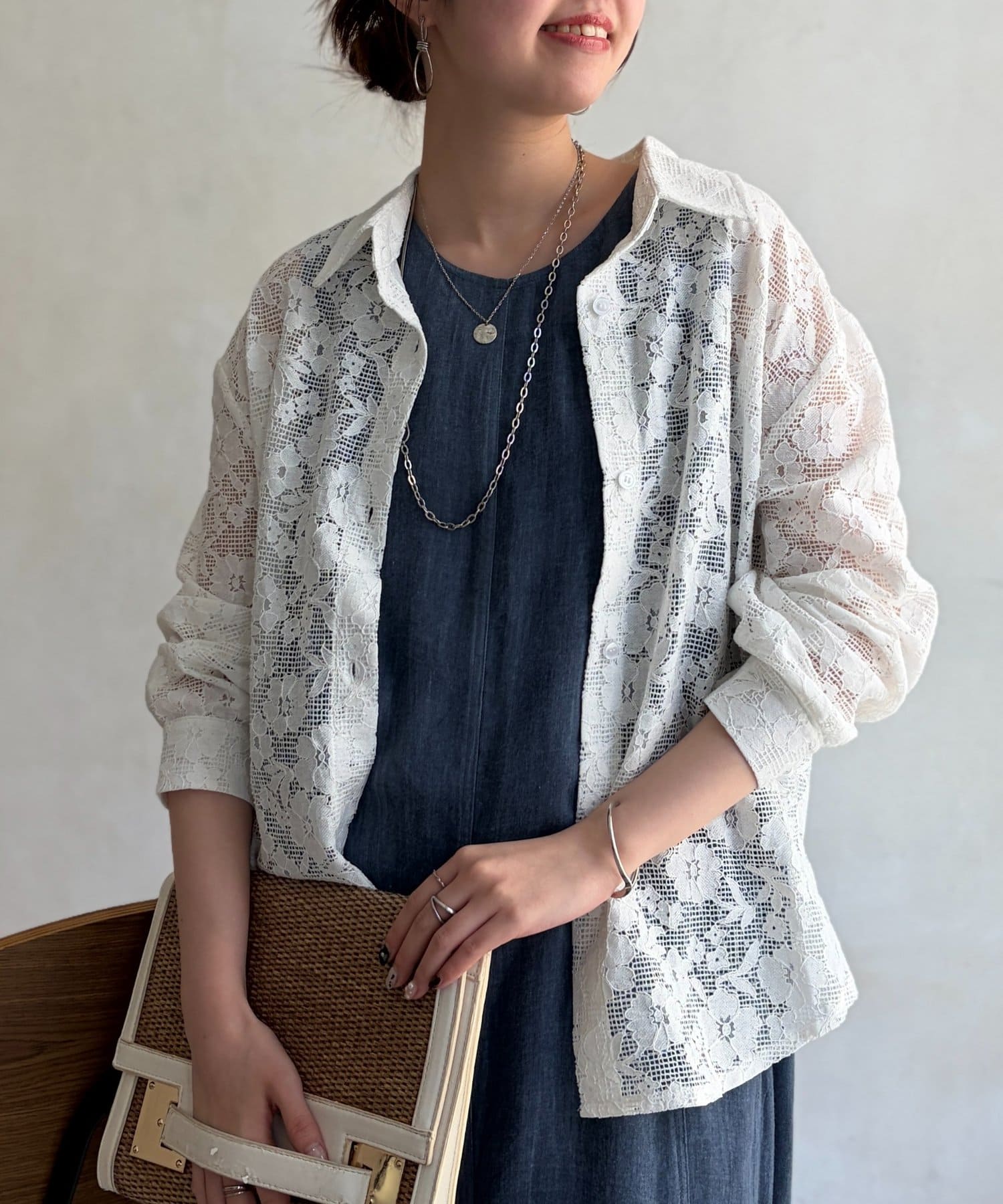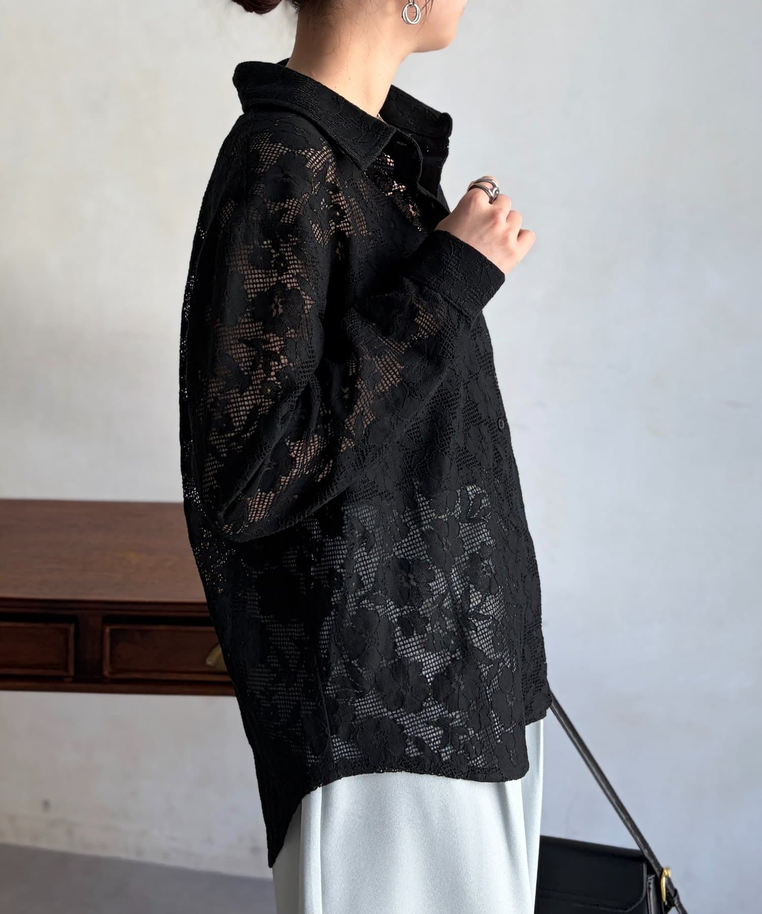 繊細なサラッとした手触りと、通気性の良いレースデザインの表情がポイントの総レース長袖シャツ。