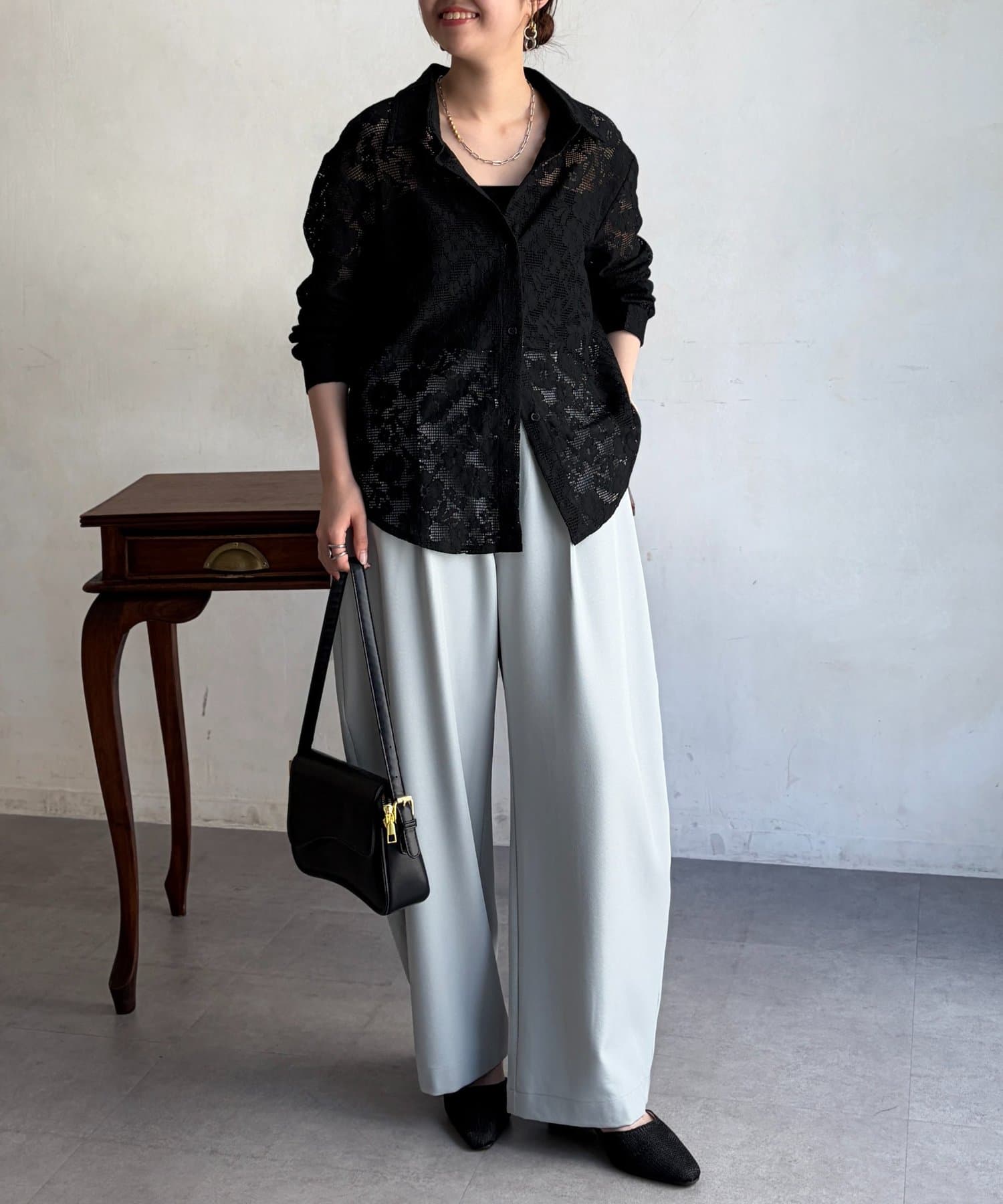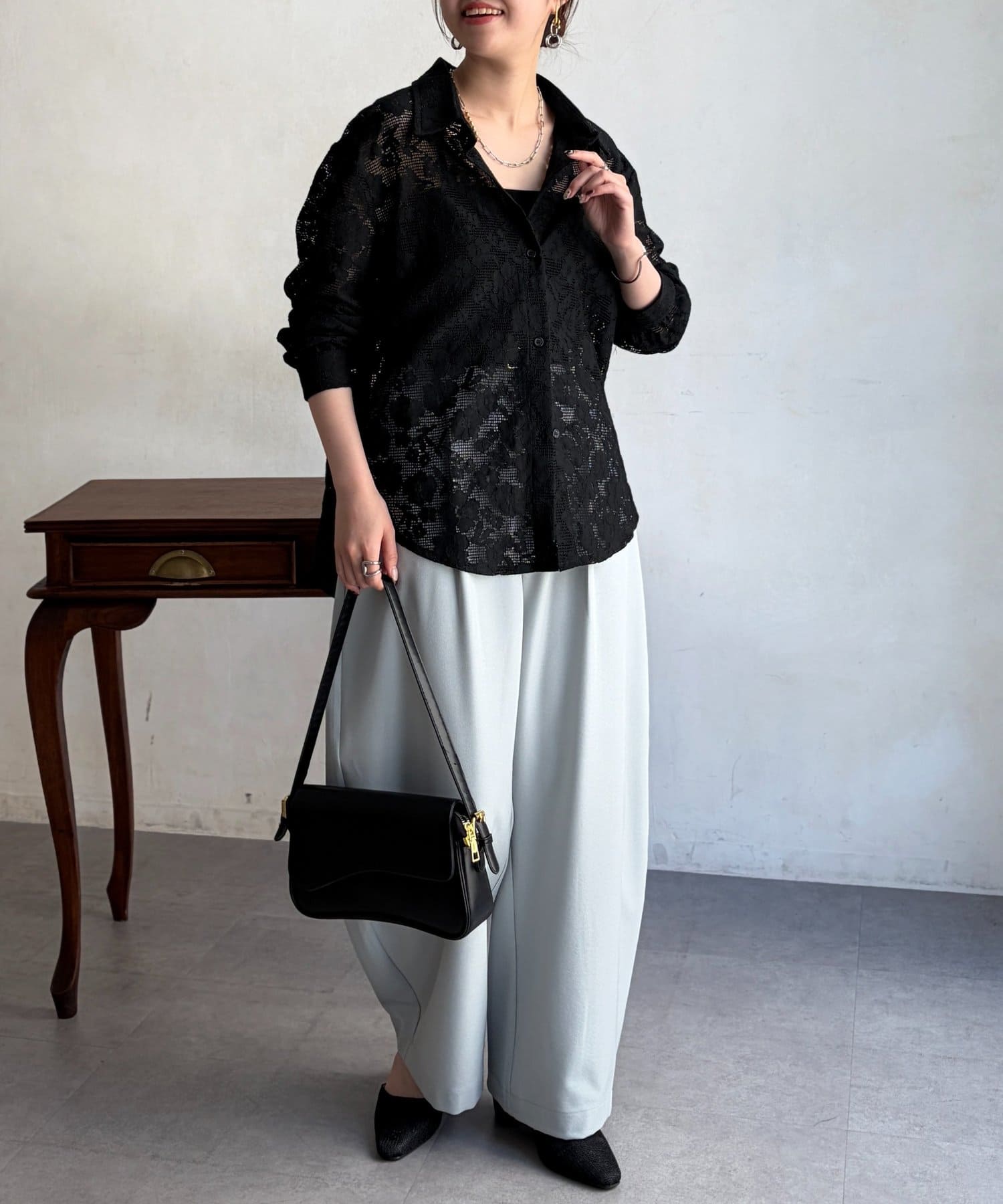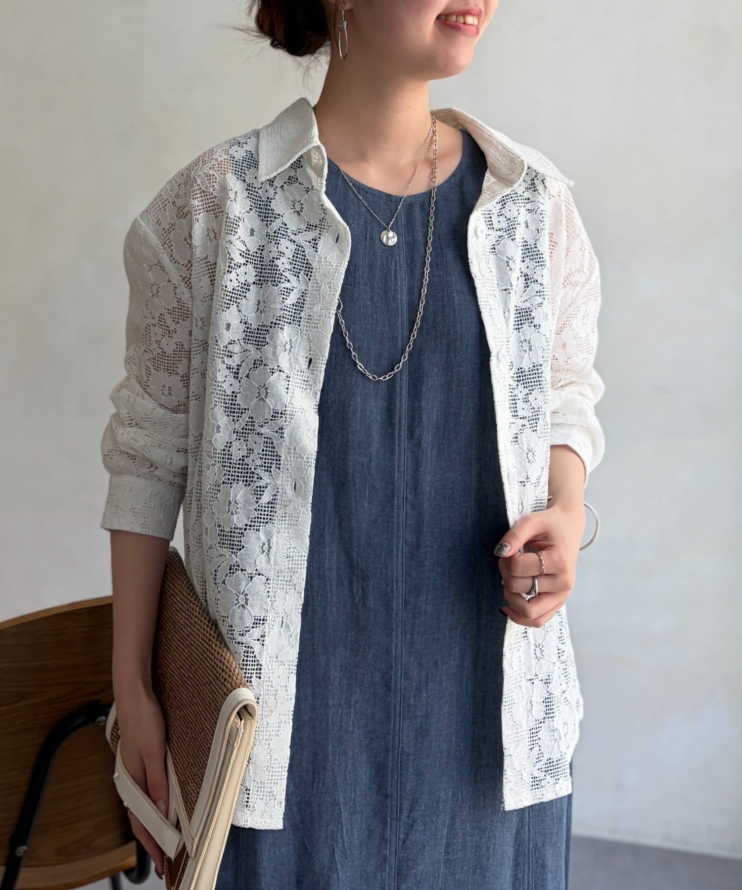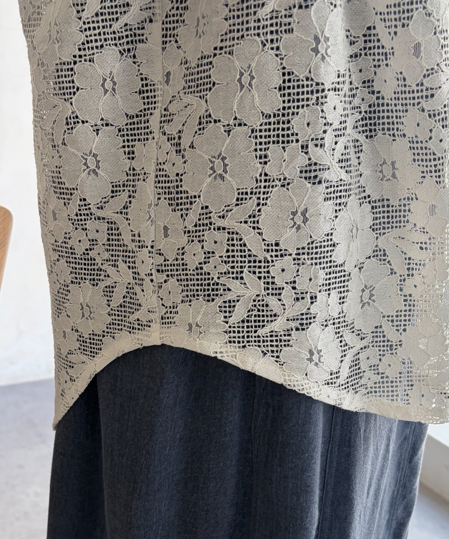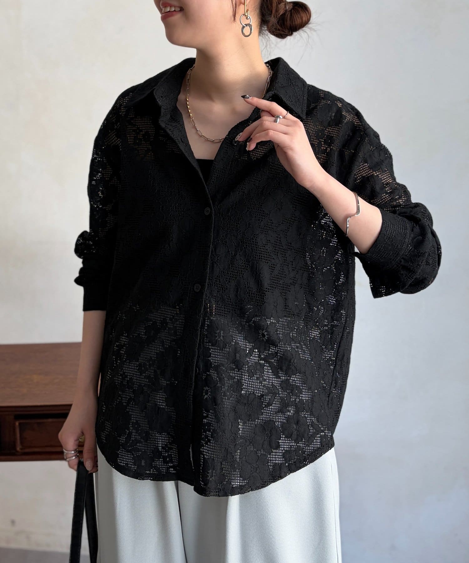 繊細なサラッとした手触りと、通気性の良いレースデザインの表情がポイントの総レース長袖シャツ。