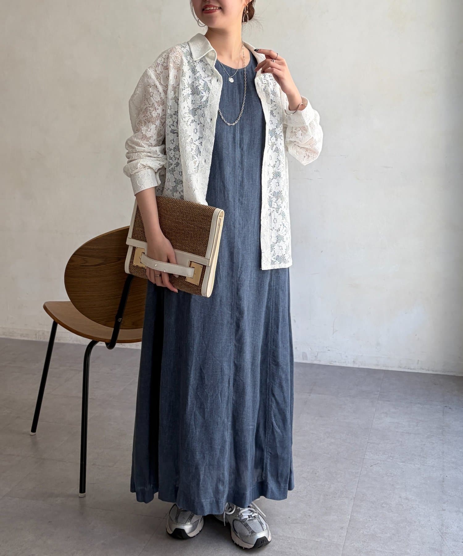 タンクトップやキャミソールと合わせて、透け感を楽しむレイヤードスタイルに。