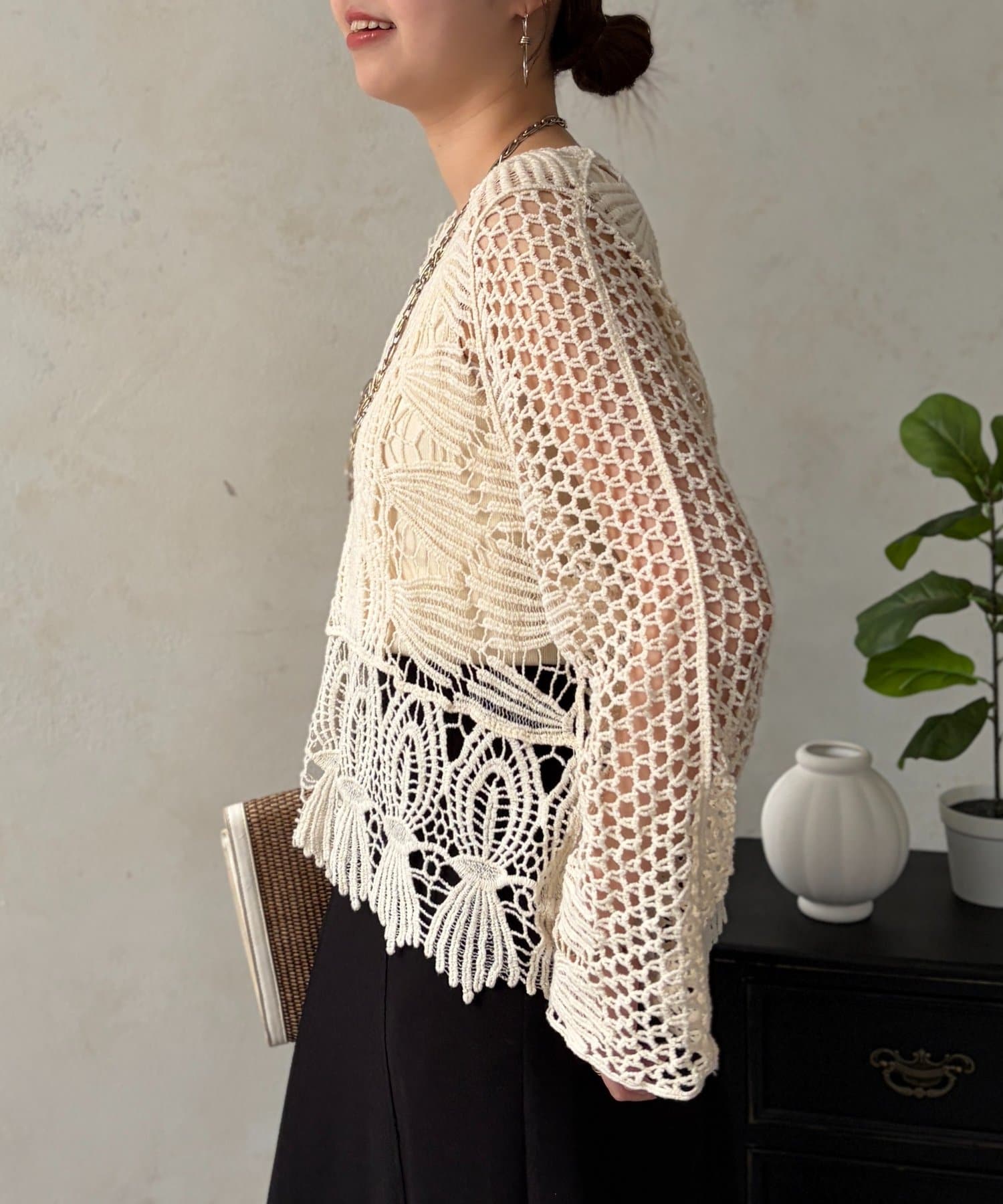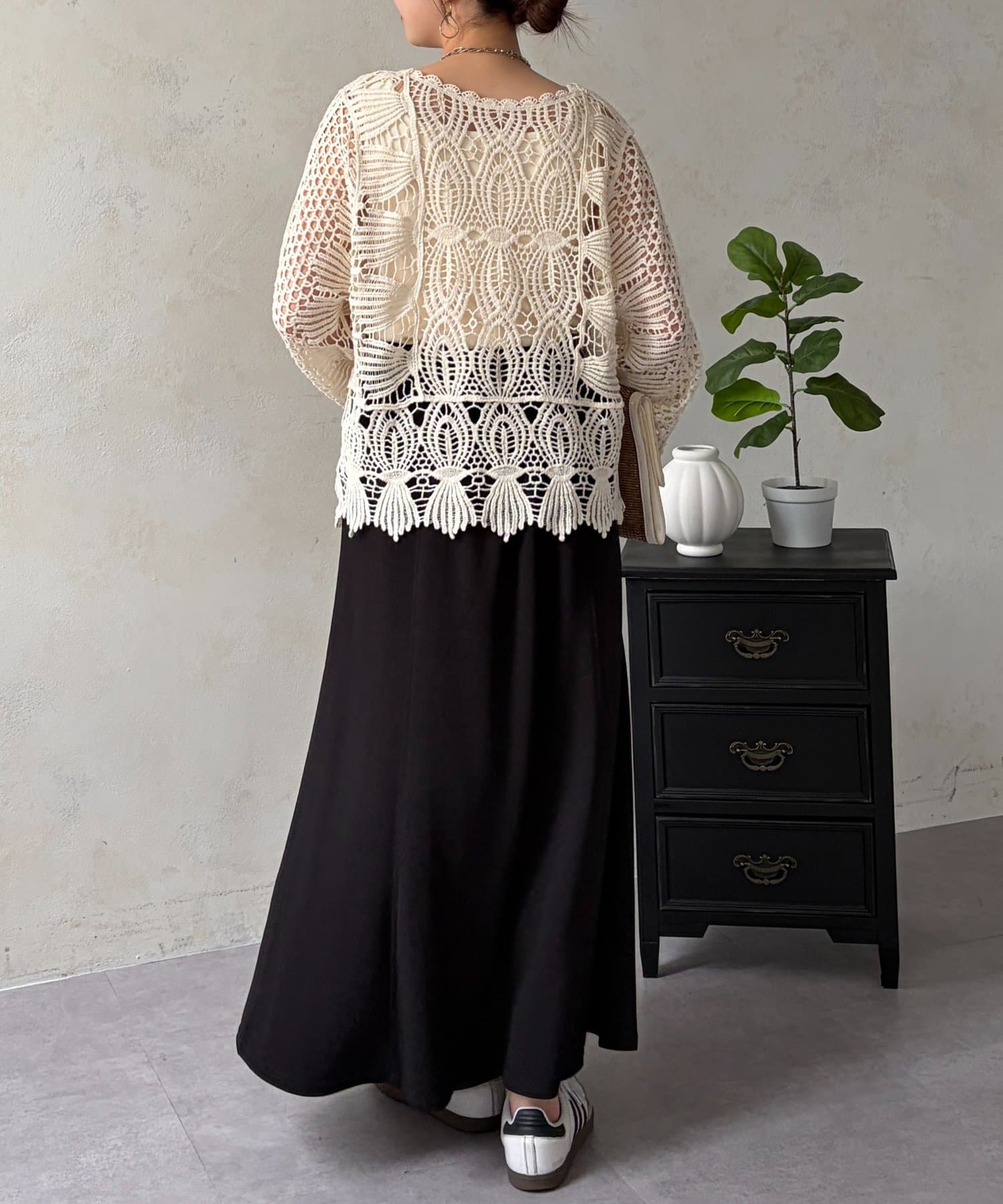 透け感のあるデザインが、夏の暑さの中でも涼しく、軽やかに過ごせる一枚です。