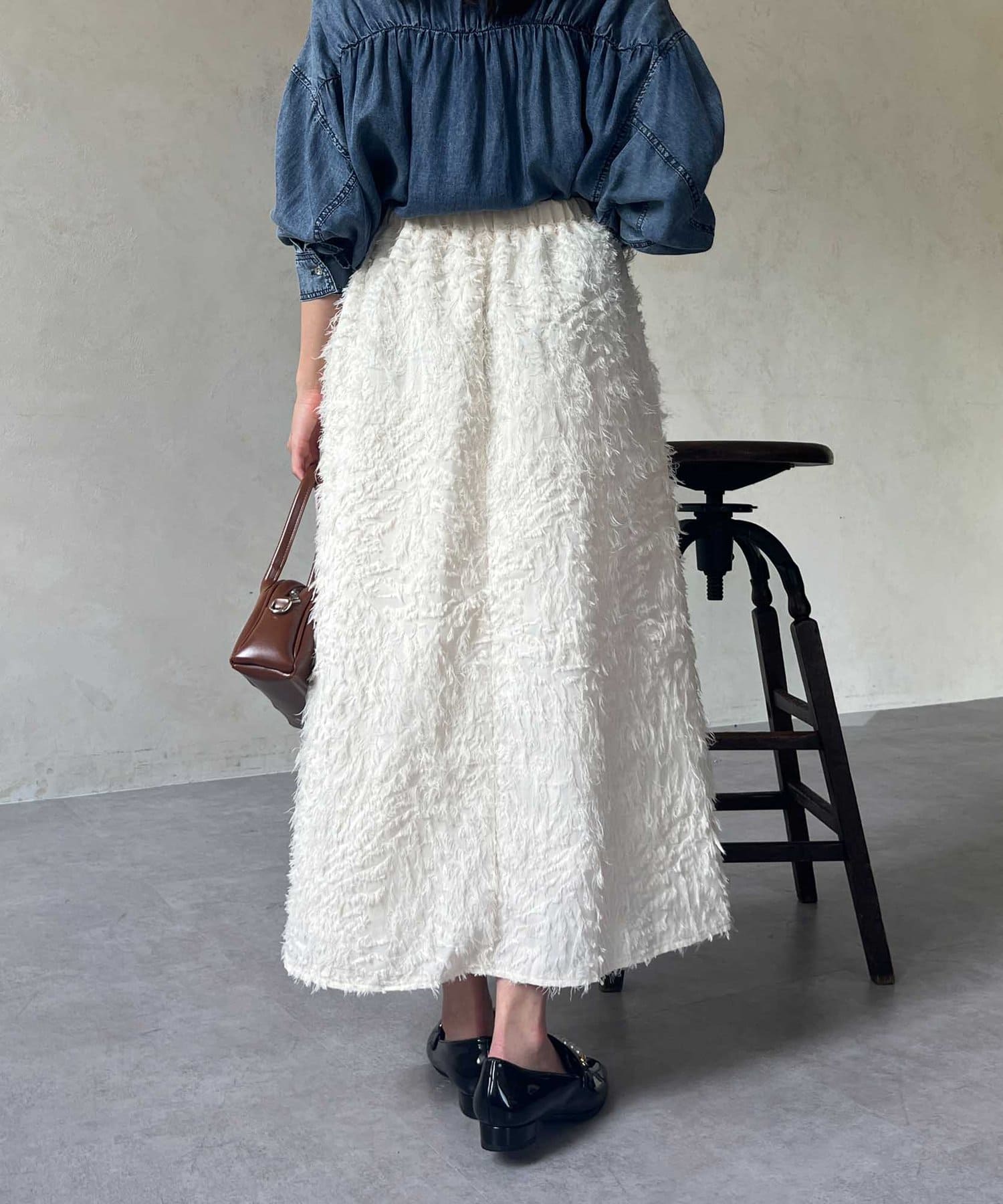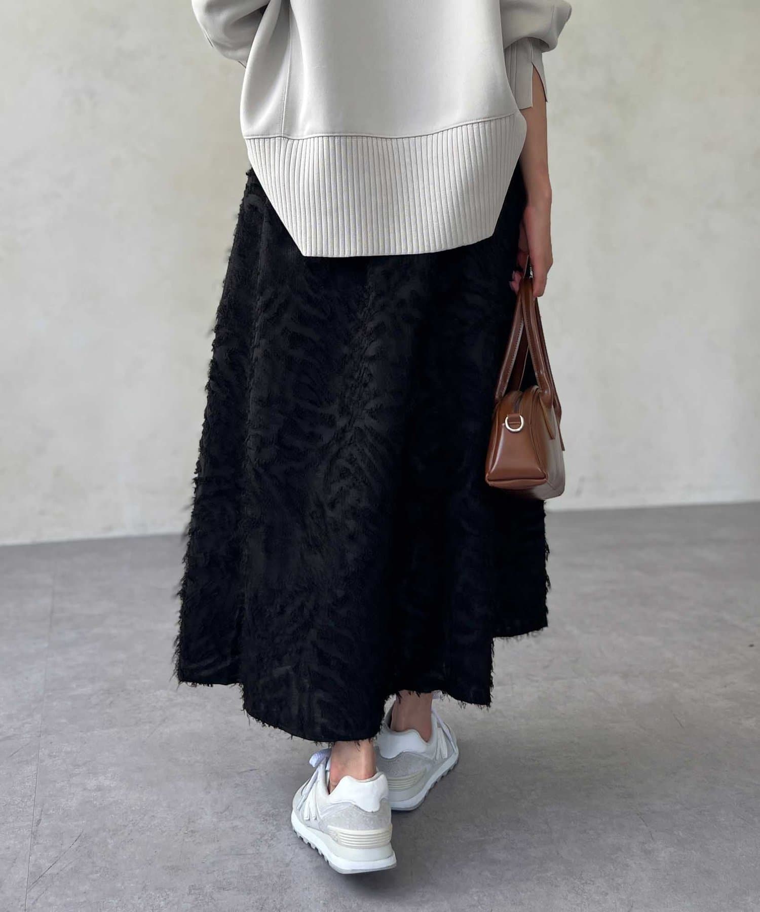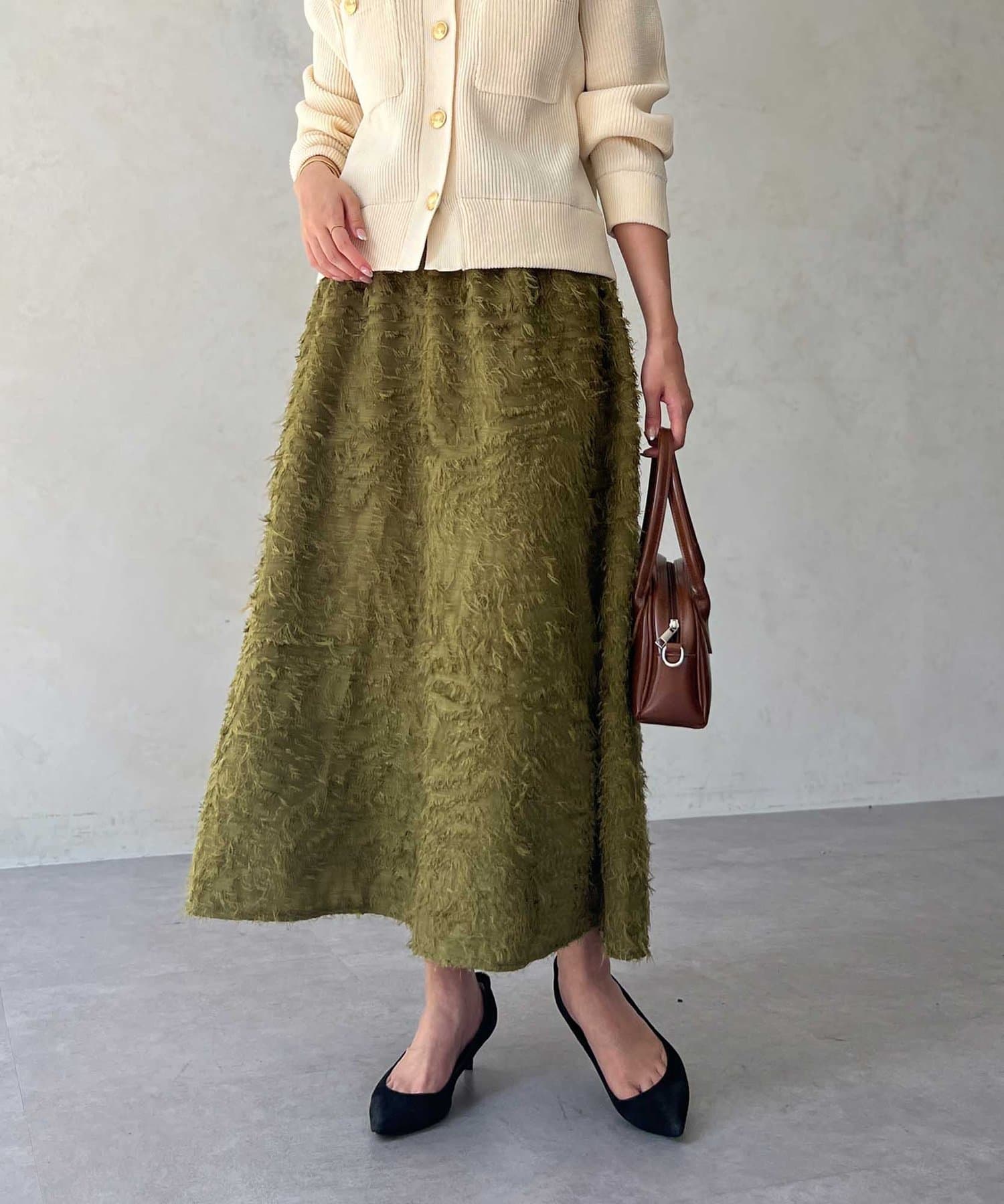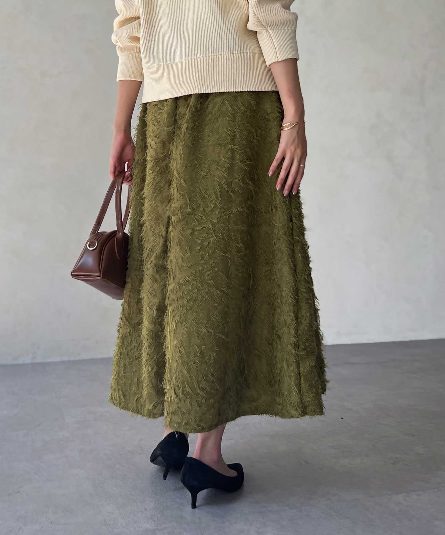 OUTLETで購入しました。腰回りはタイトで、足先に向かって広がるスカートのフレアラインがとてもきれいです。ジャガードのフリンジも程良い立体感でボリュームが出過ぎないので、ニットと合わせてももたつかずすっきり着れて最高にかわいいです!
