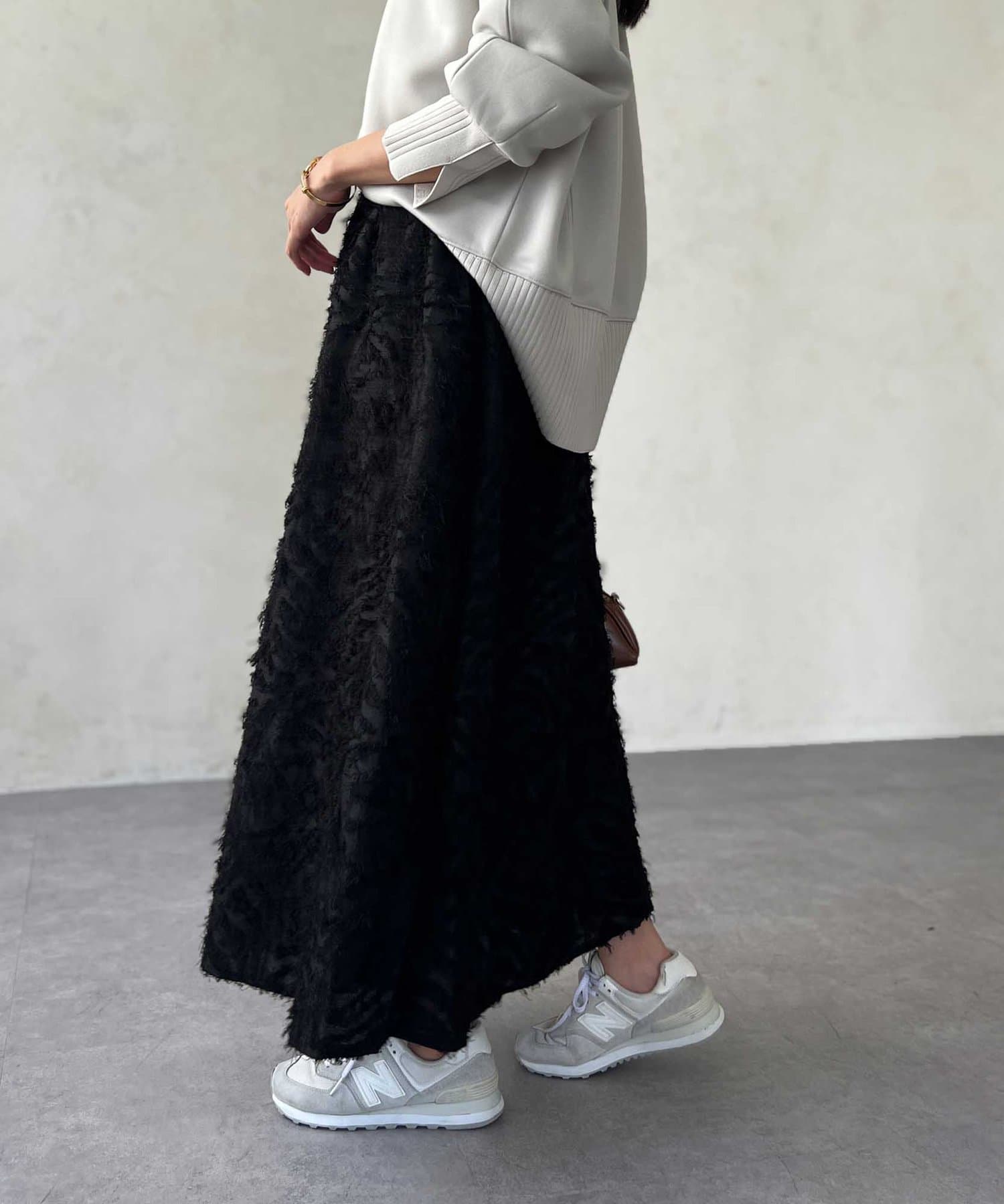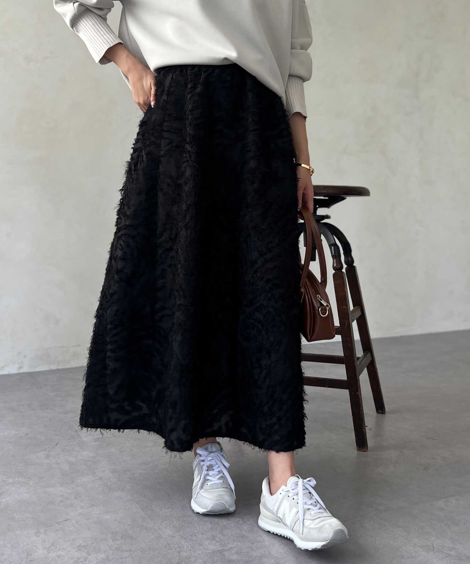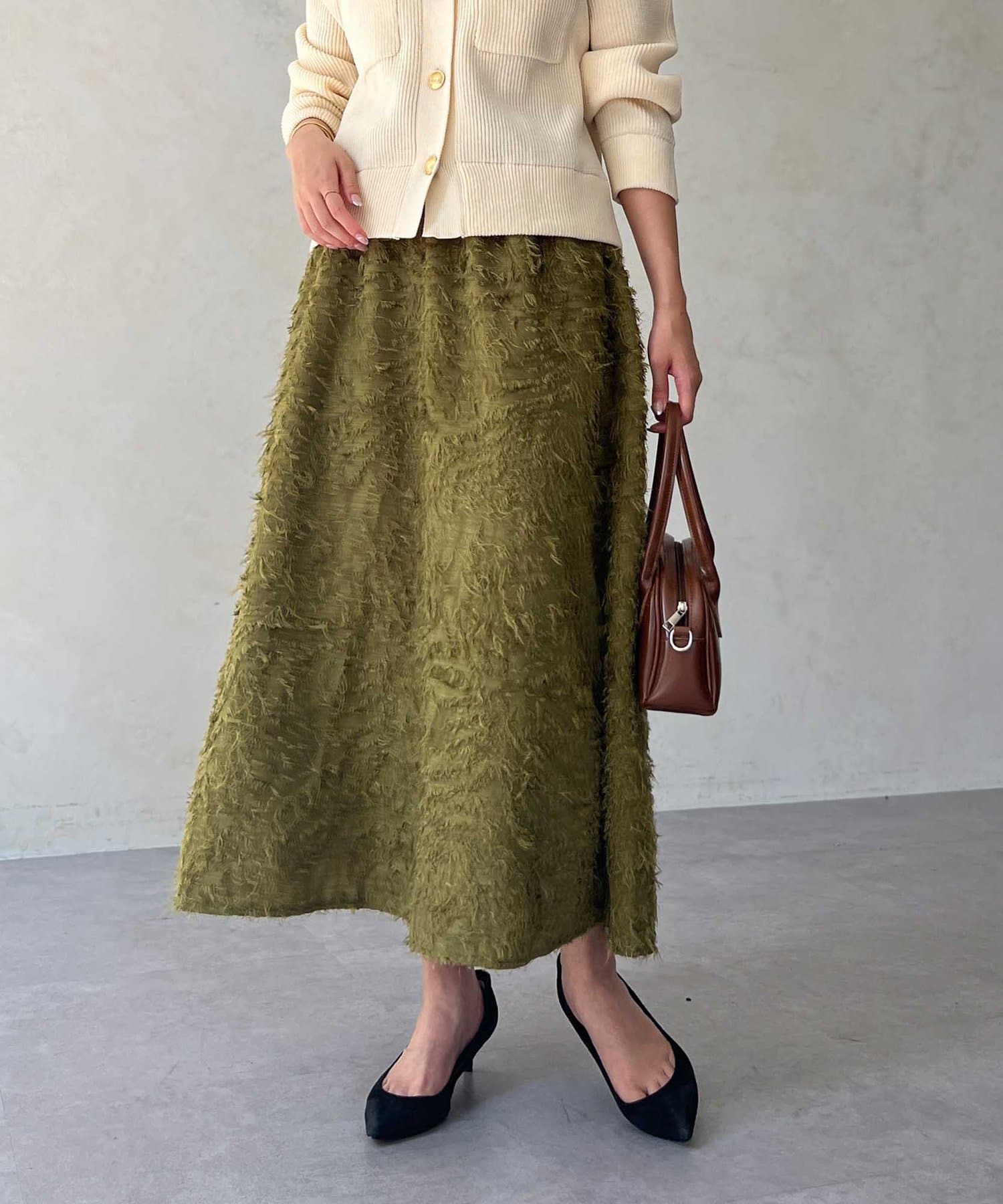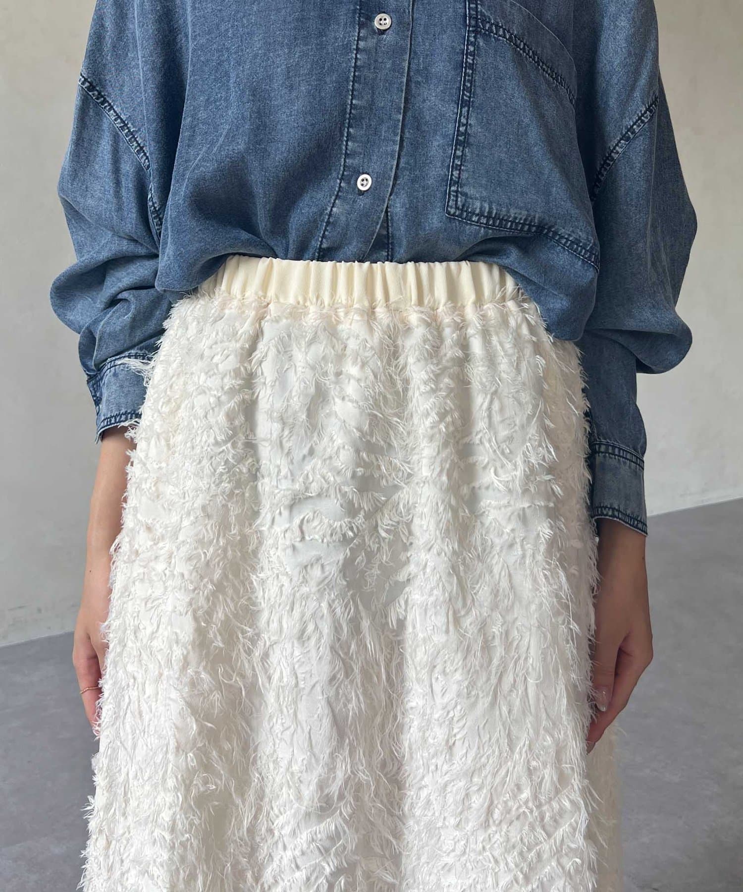 OUTLETで購入しました。腰回りはタイトで、足先に向かって広がるスカートのフレアラインがとてもきれいです。ジャガードのフリンジも程良い立体感でボリュームが出過ぎないので、ニットと合わせてももたつかずすっきり着れて最高にかわいいです!