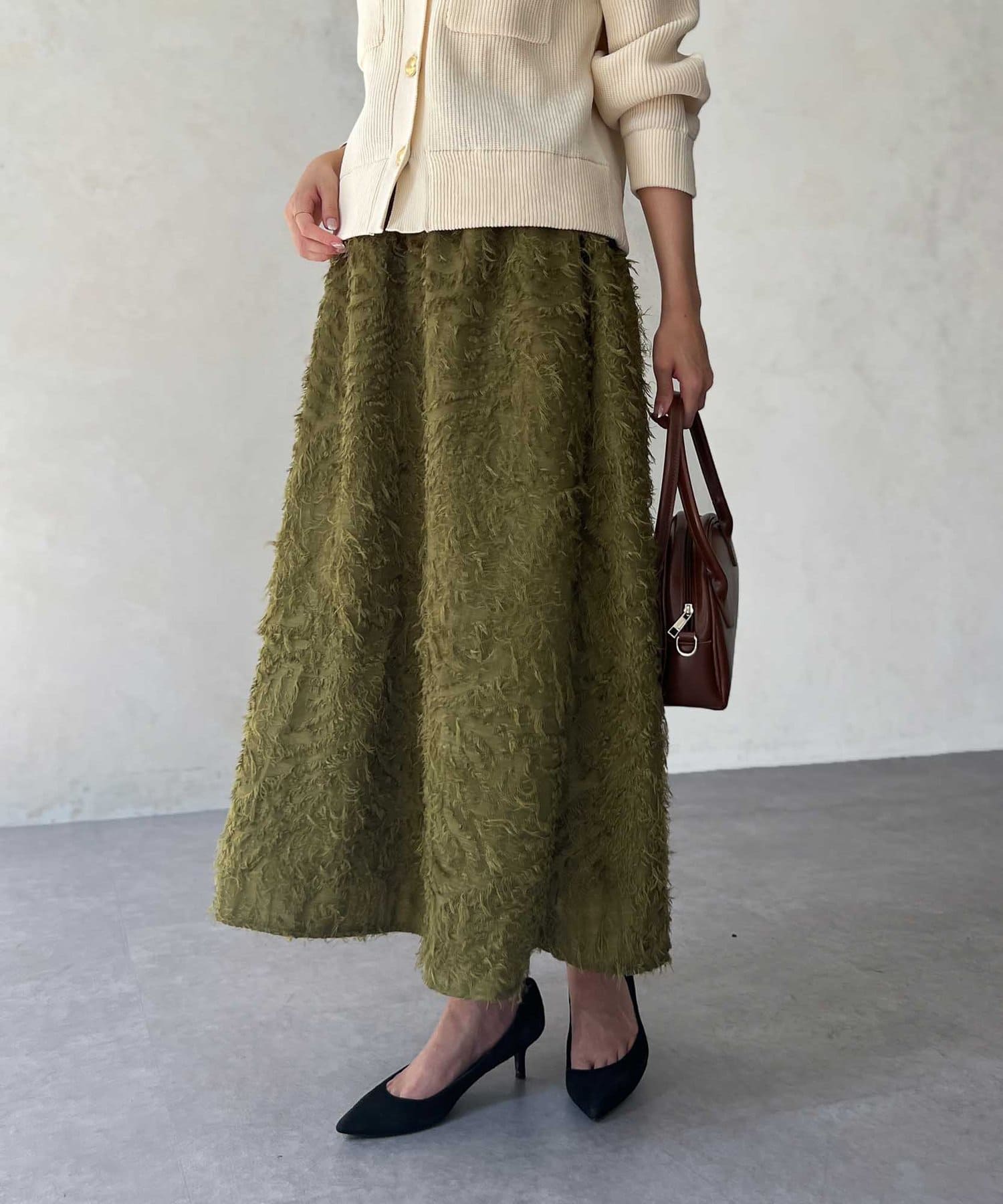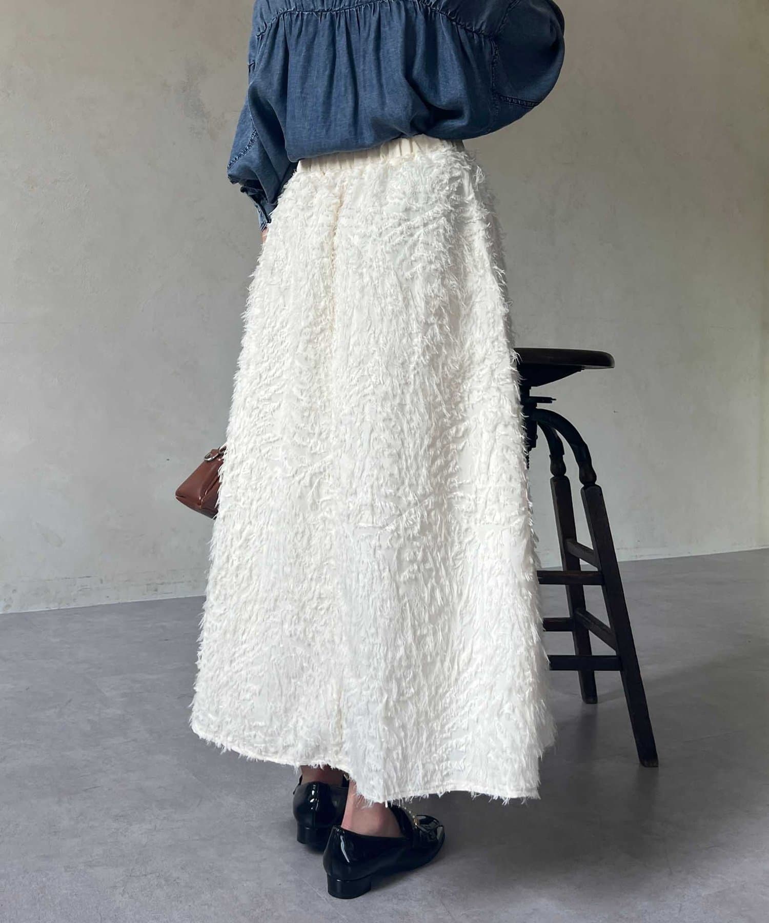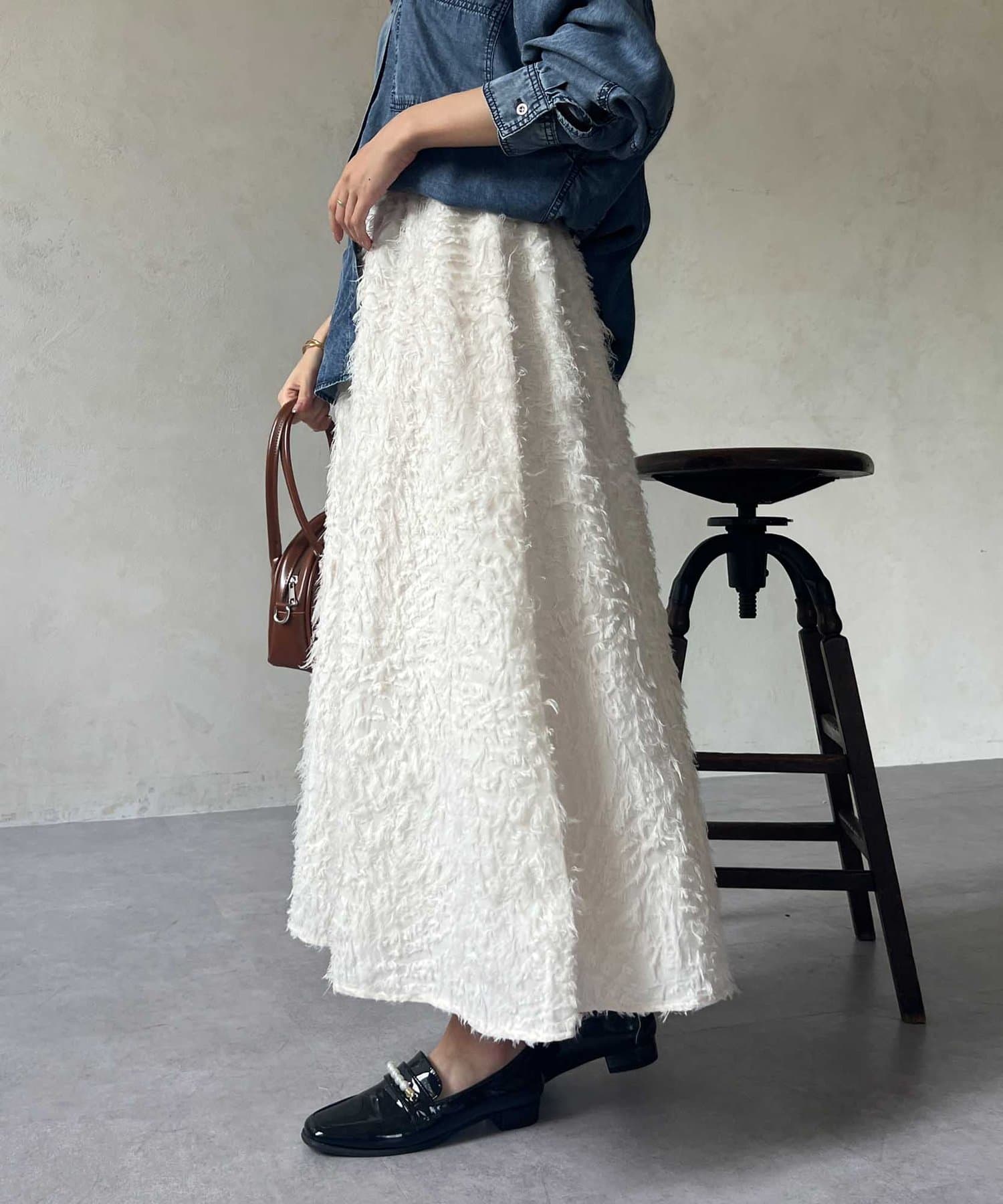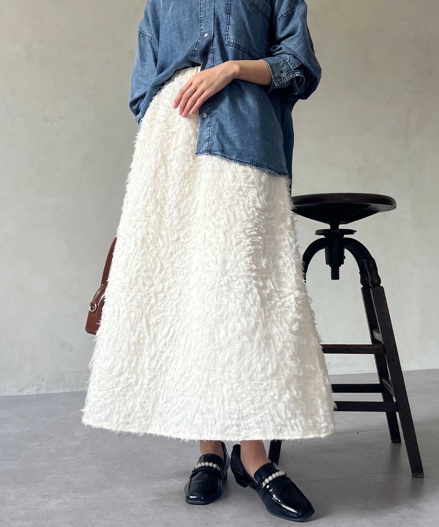 OUTLETで購入しました。腰回りはタイトで、足先に向かって広がるスカートのフレアラインがとてもきれいです。ジャガードのフリンジも程良い立体感でボリュームが出過ぎないので、ニットと合わせてももたつかずすっきり着れて最高にかわいいです!