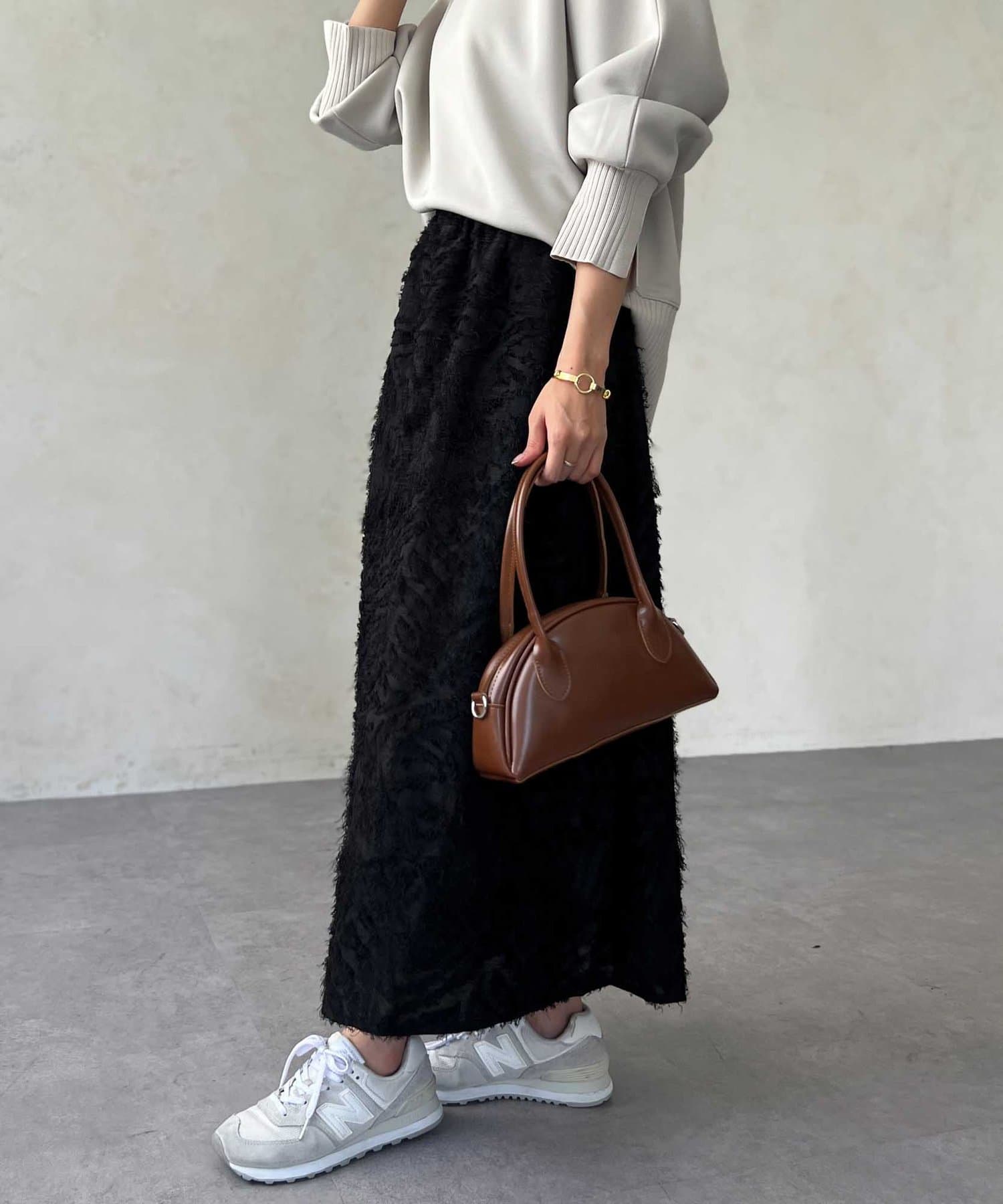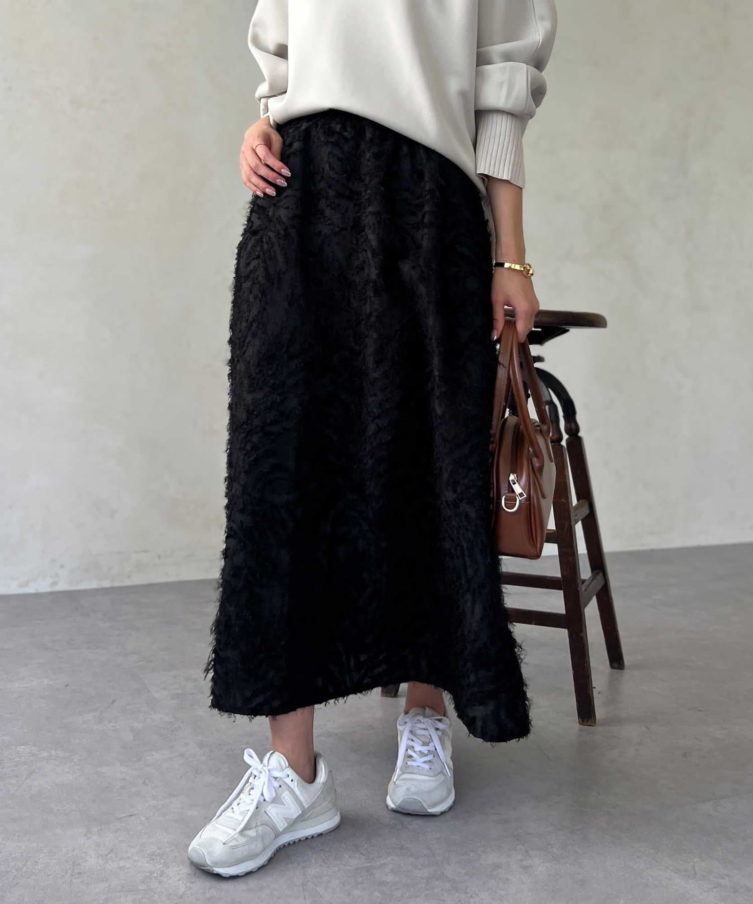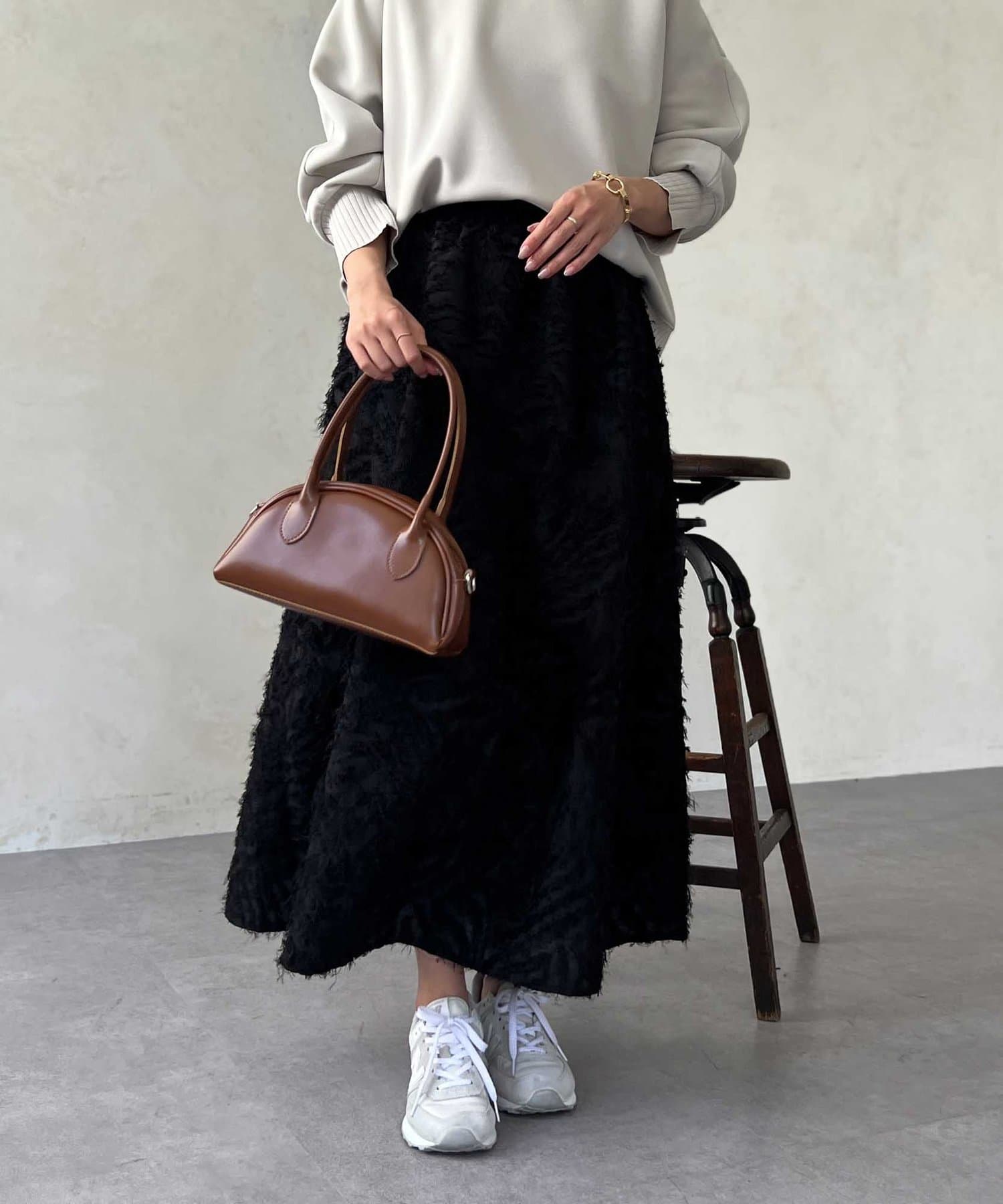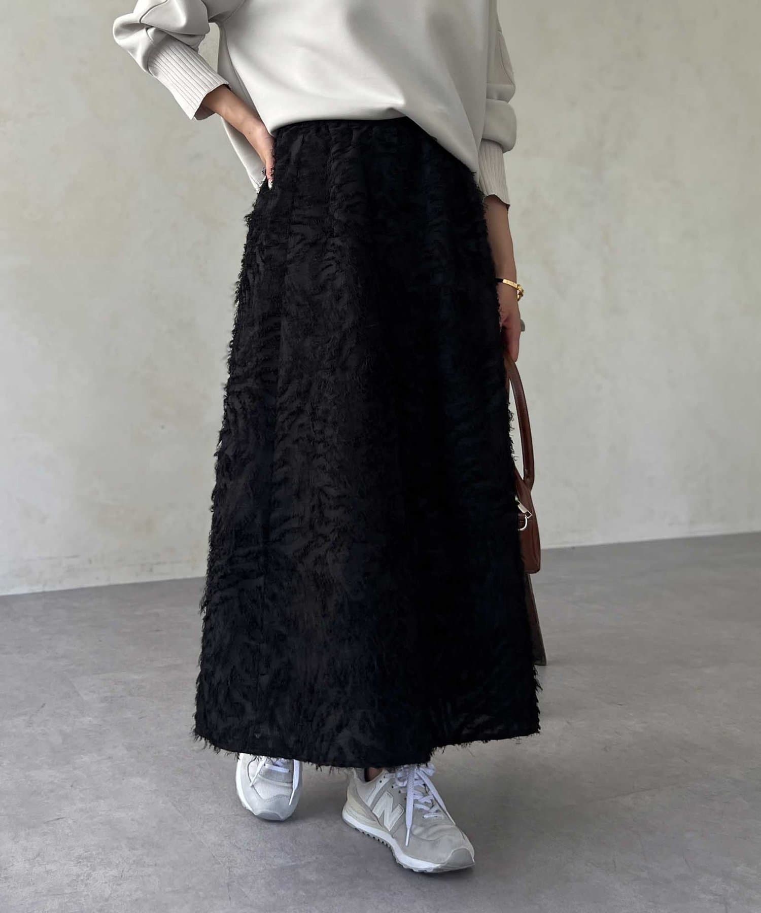 OUTLETで購入しました。腰回りはタイトで、足先に向かって広がるスカートのフレアラインがとてもきれいです。ジャガードのフリンジも程良い立体感でボリュームが出過ぎないので、ニットと合わせてももたつかずすっきり着れて最高にかわいいです!