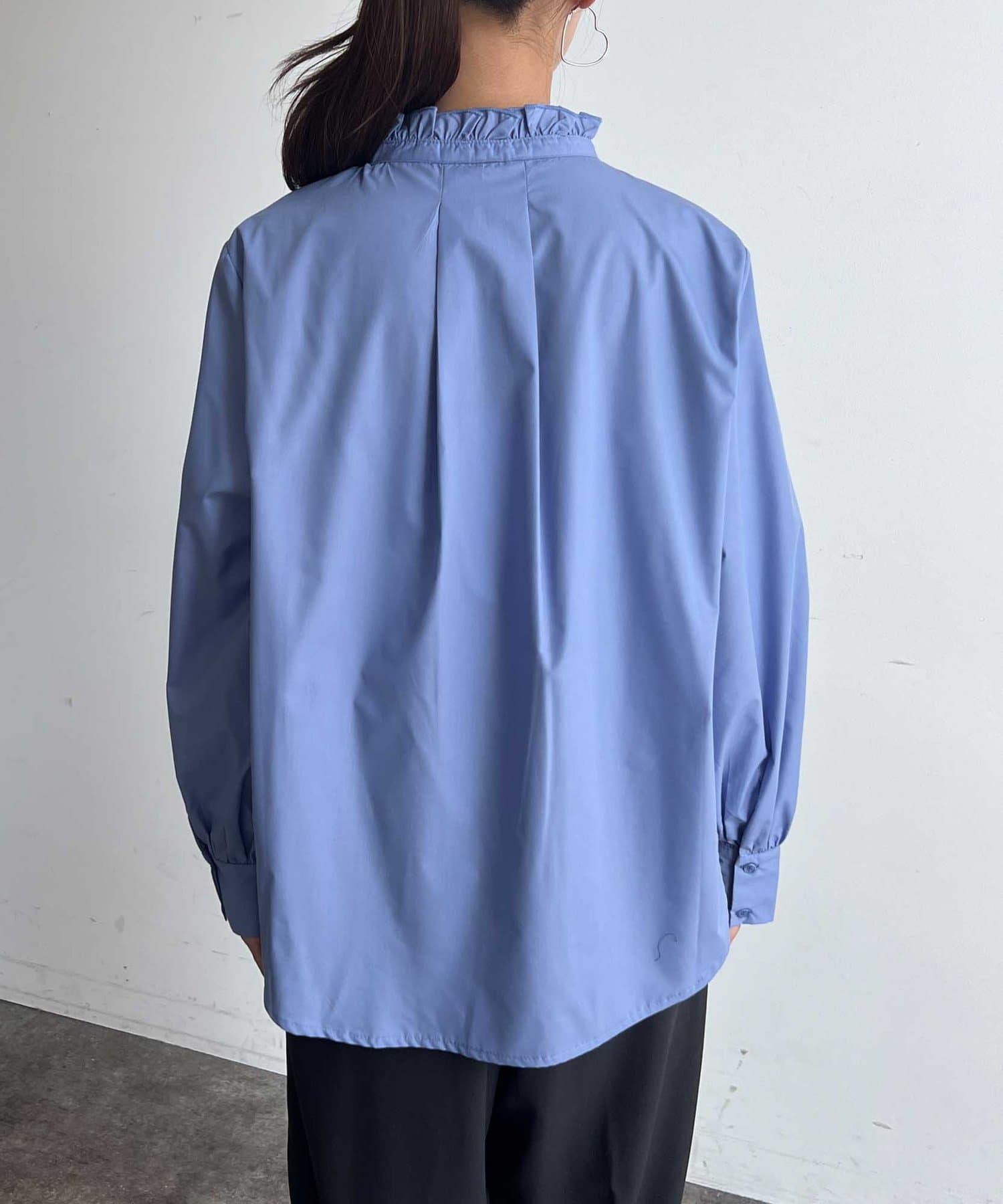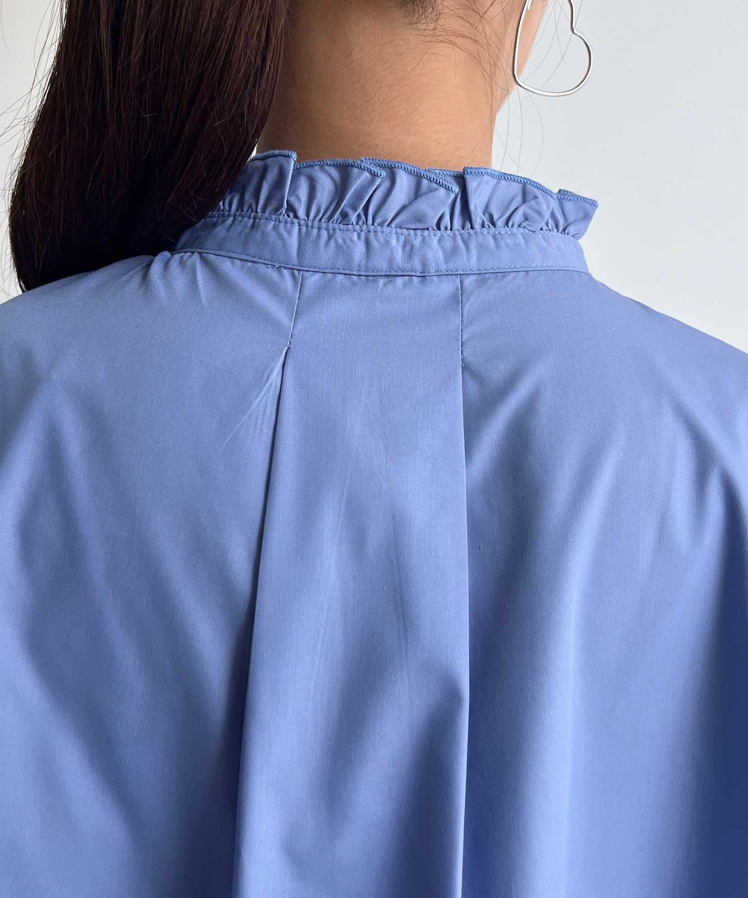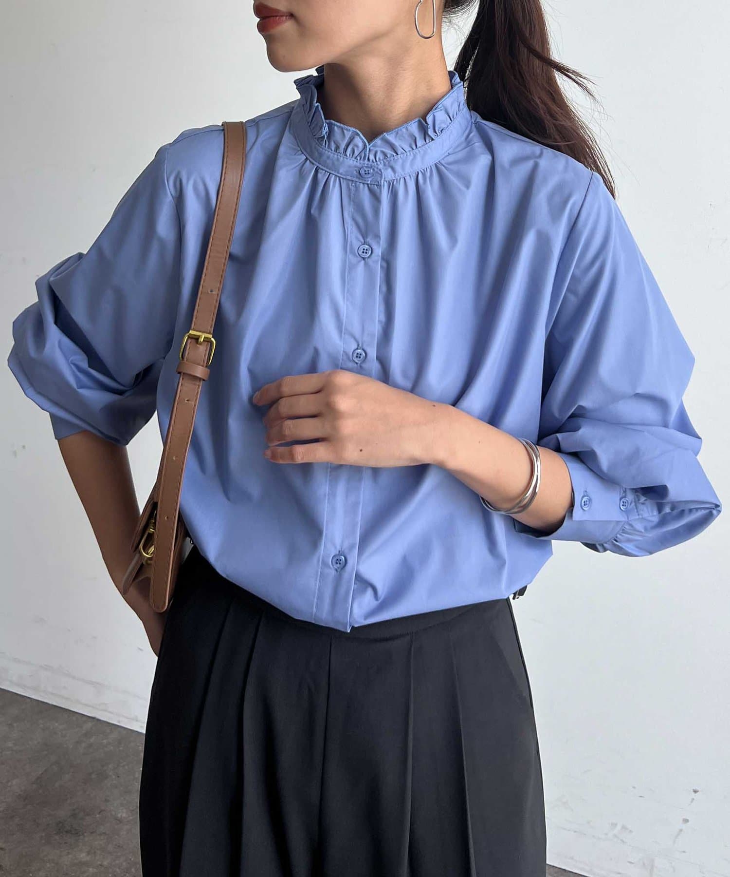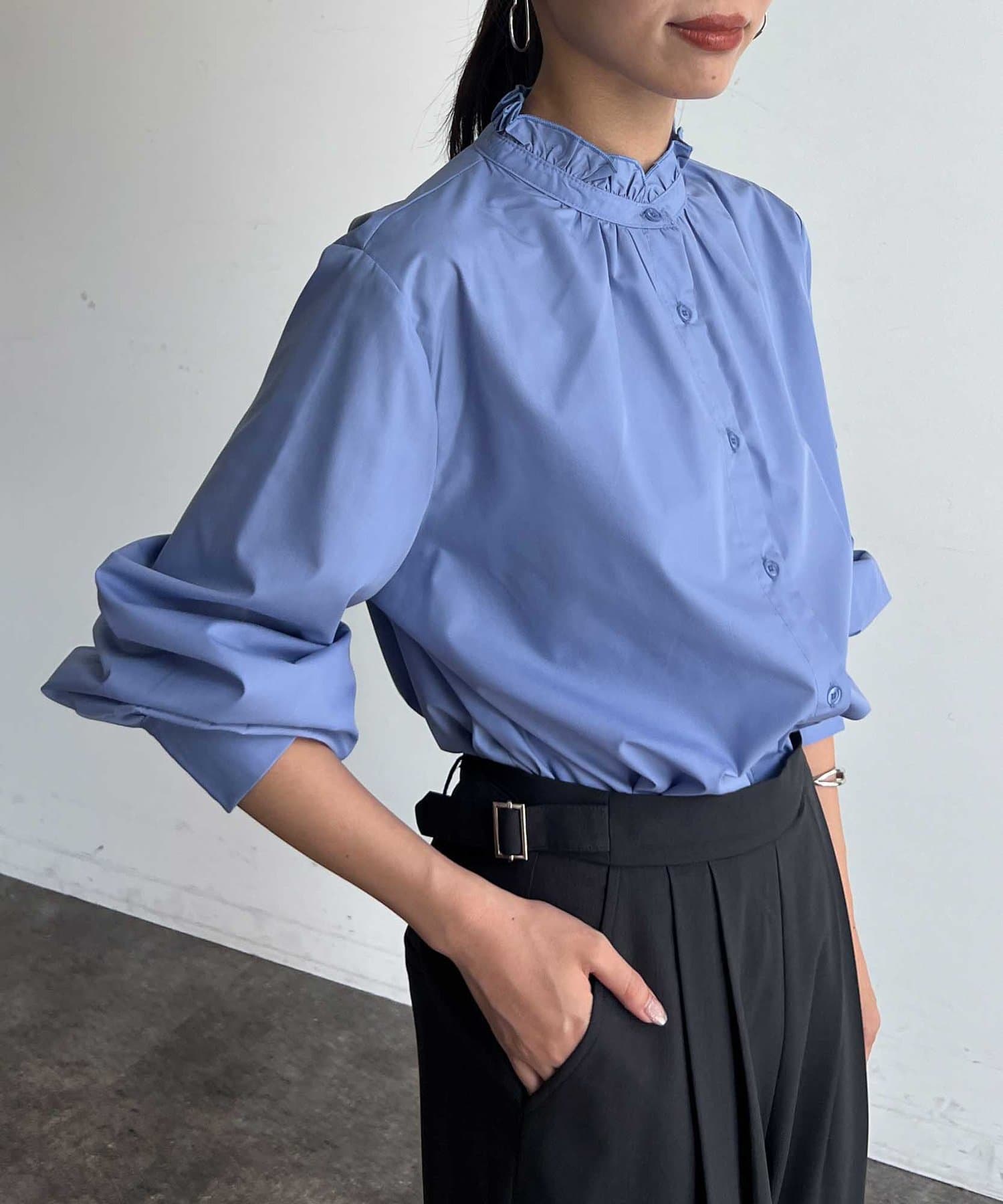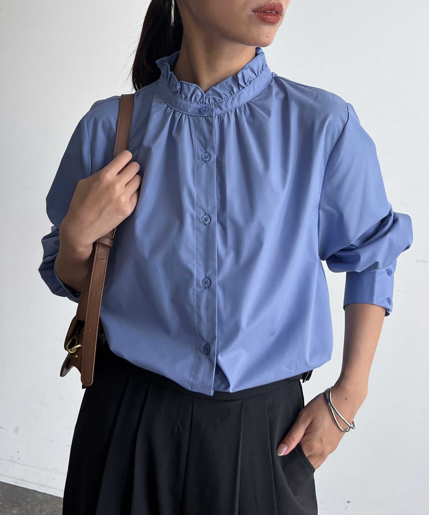 さりげないネックフリルがコーディネートのアクセントになるシャツ。