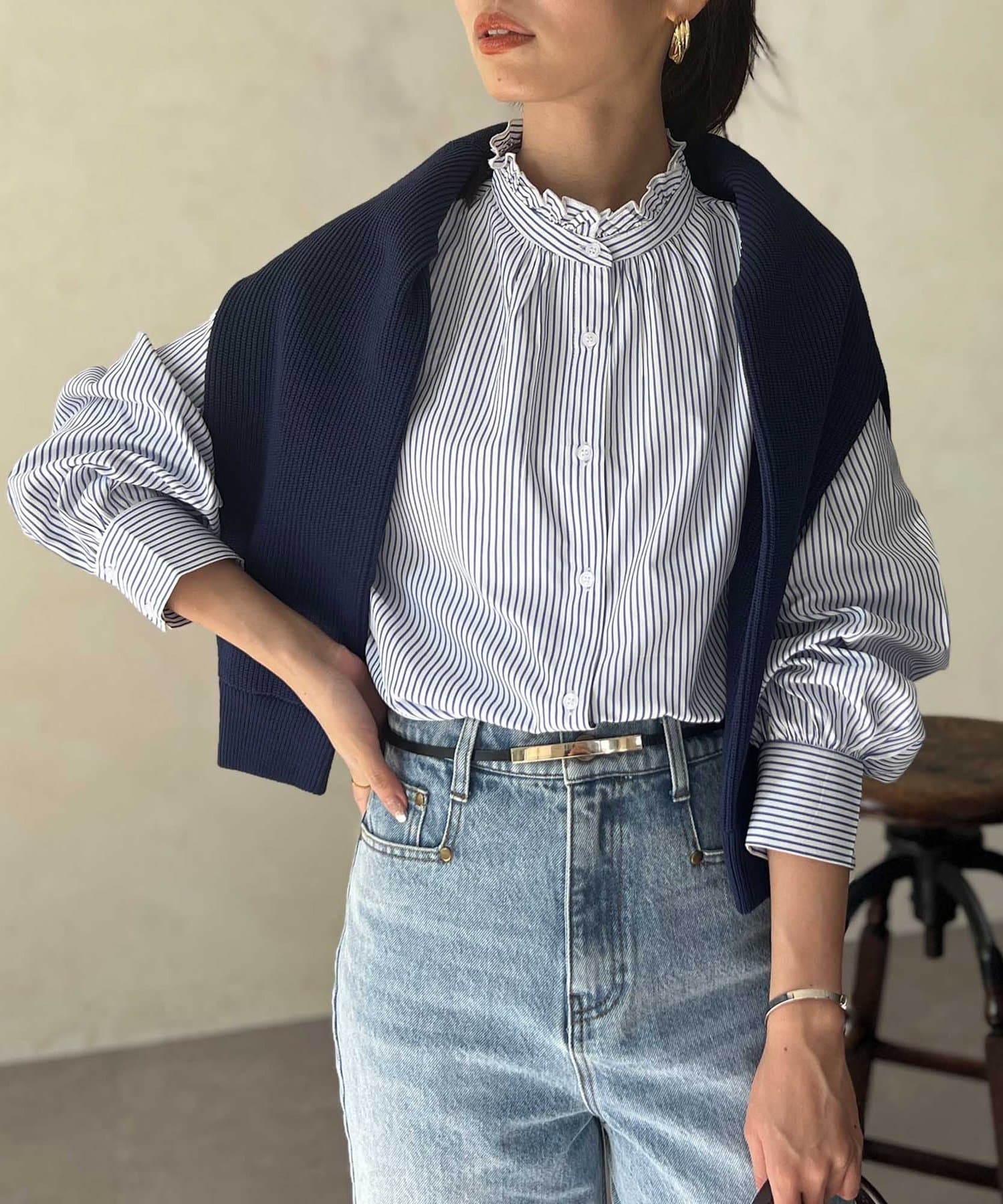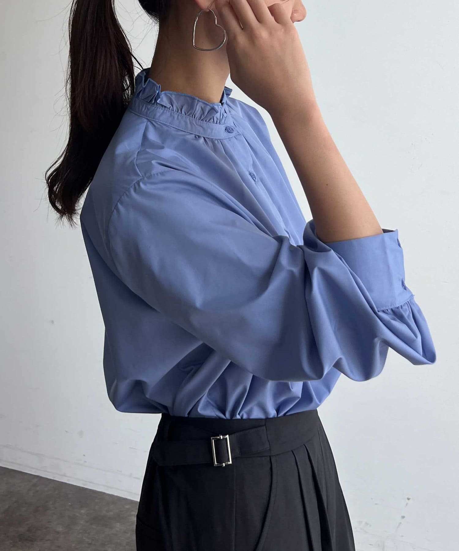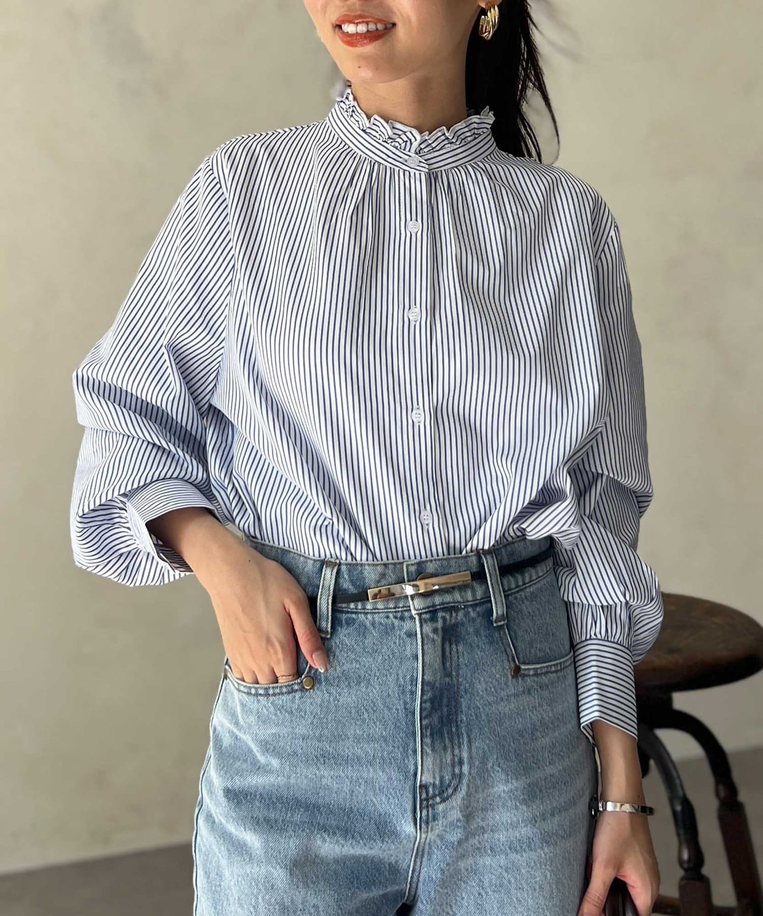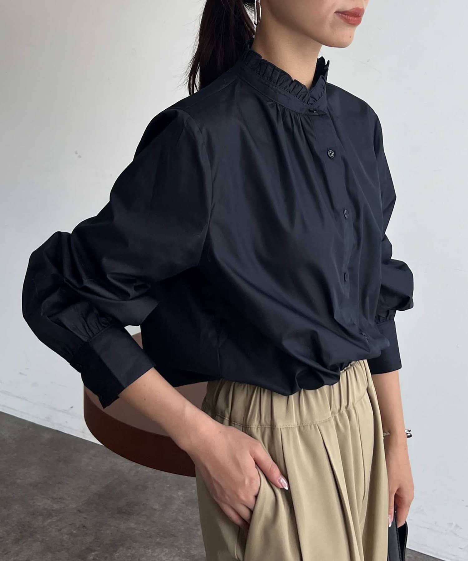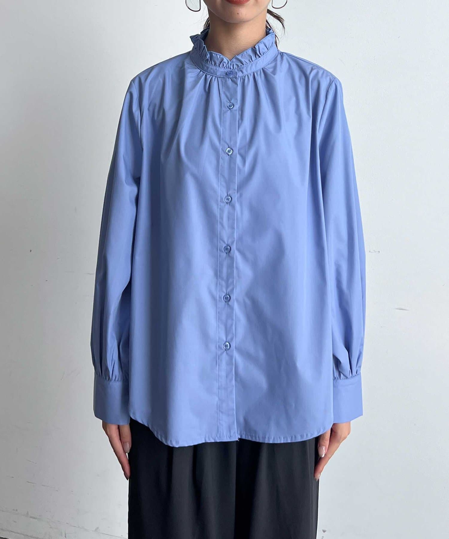さりげないネックフリルがコーディネートのアクセントになるシャツ。