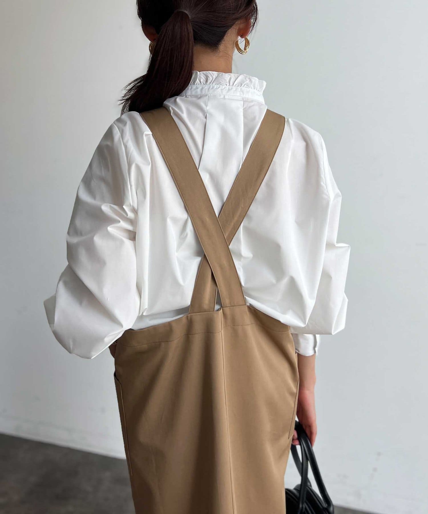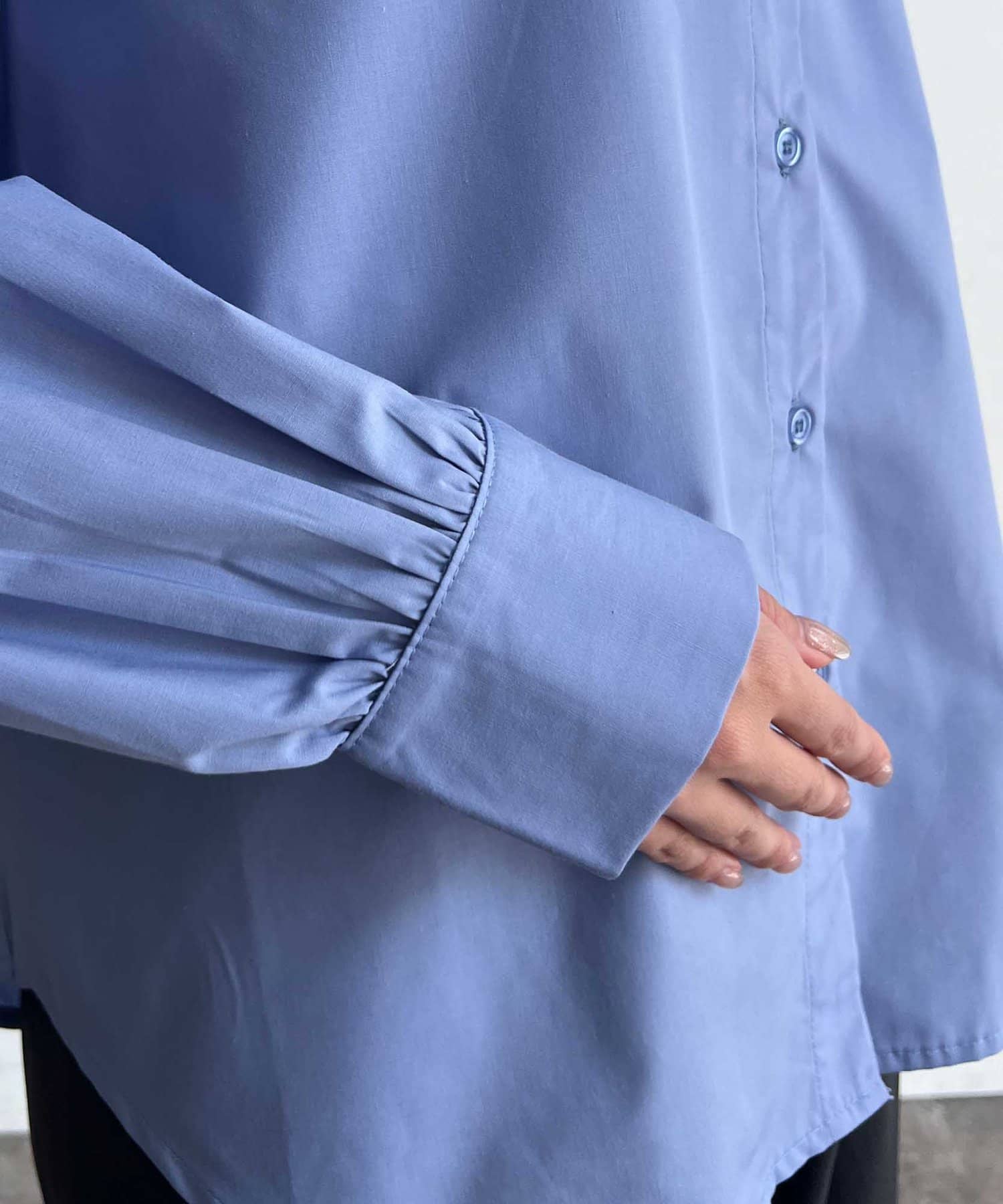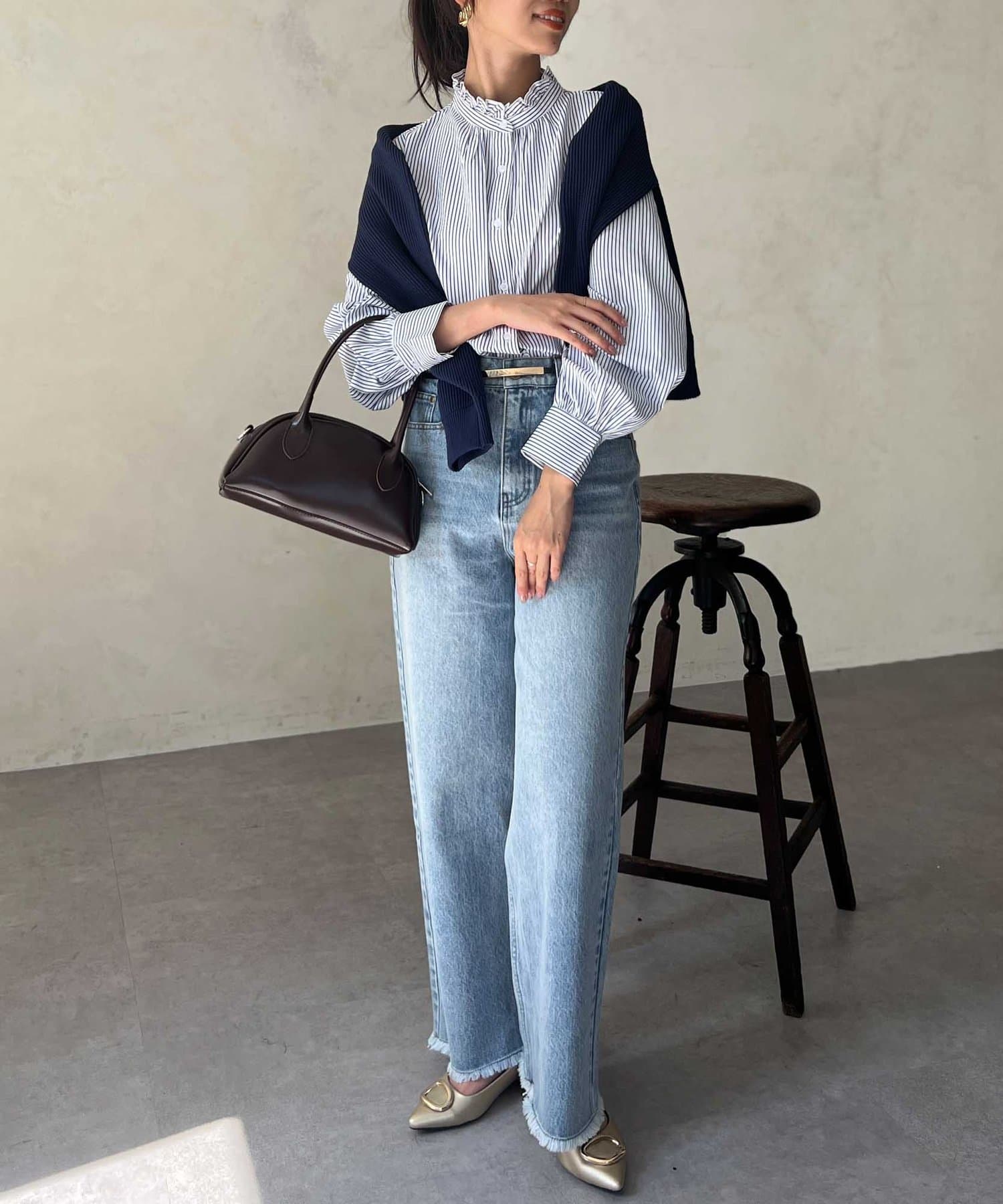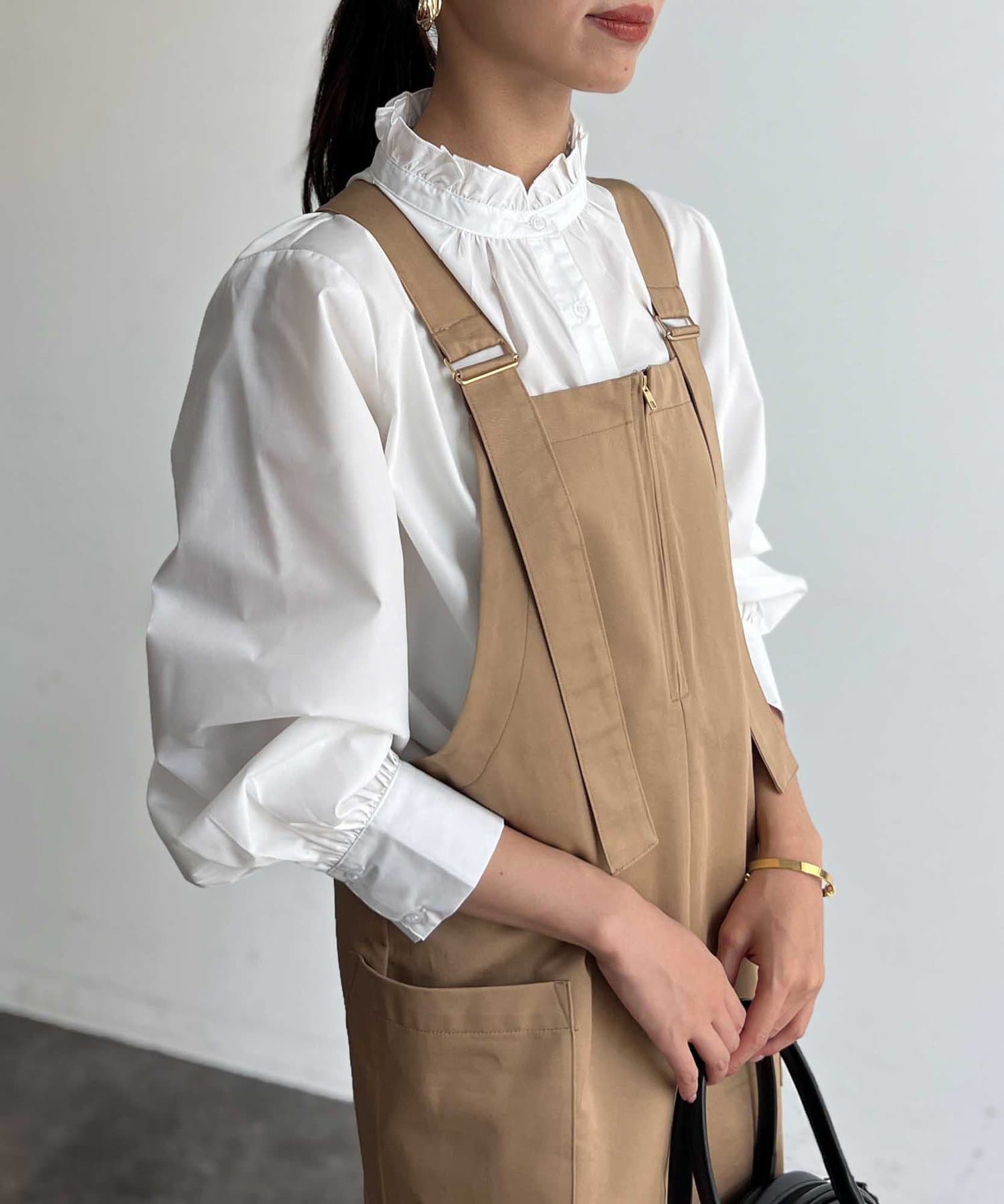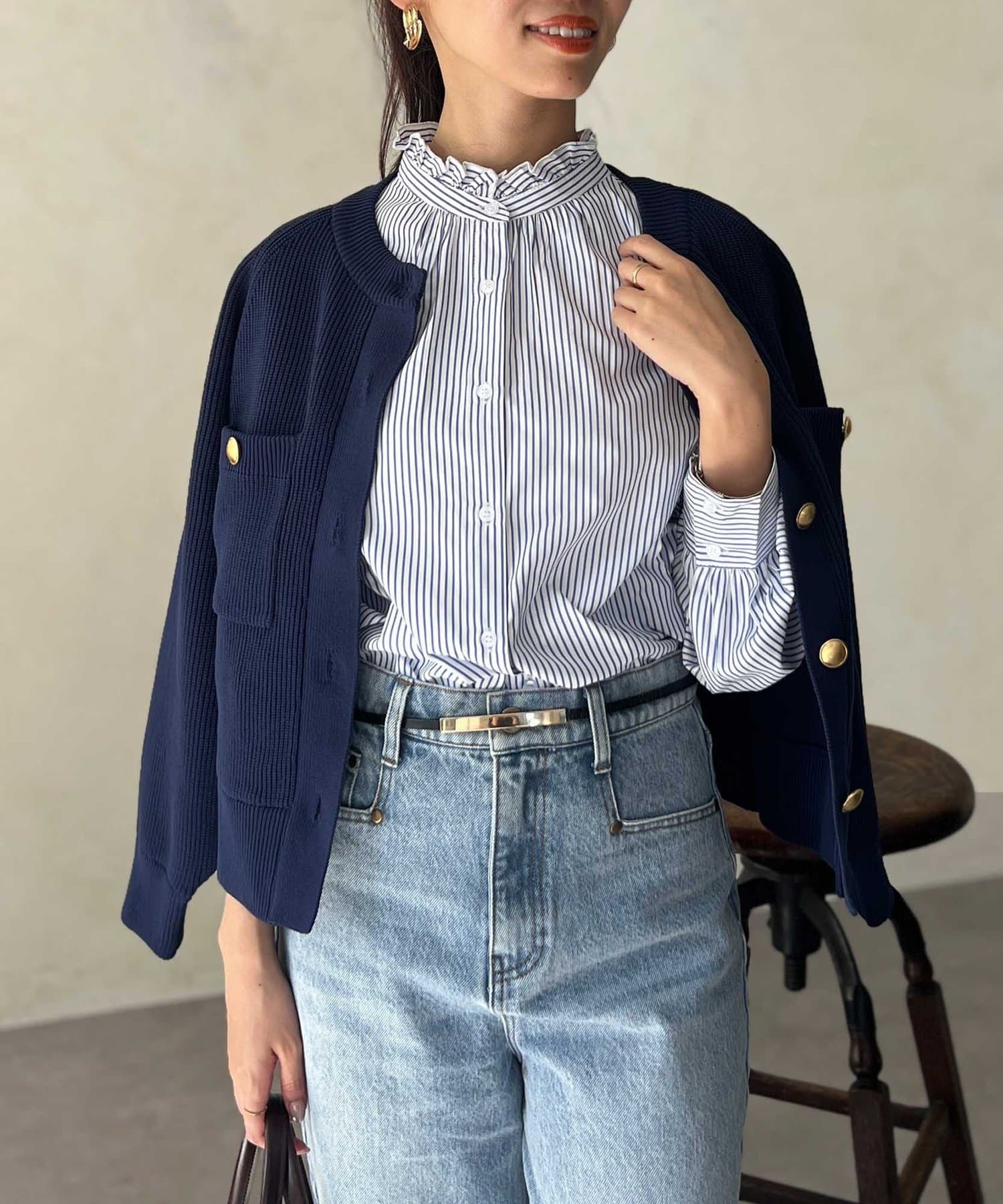 さりげないネックフリルがコーディネートのアクセントになるシャツ。