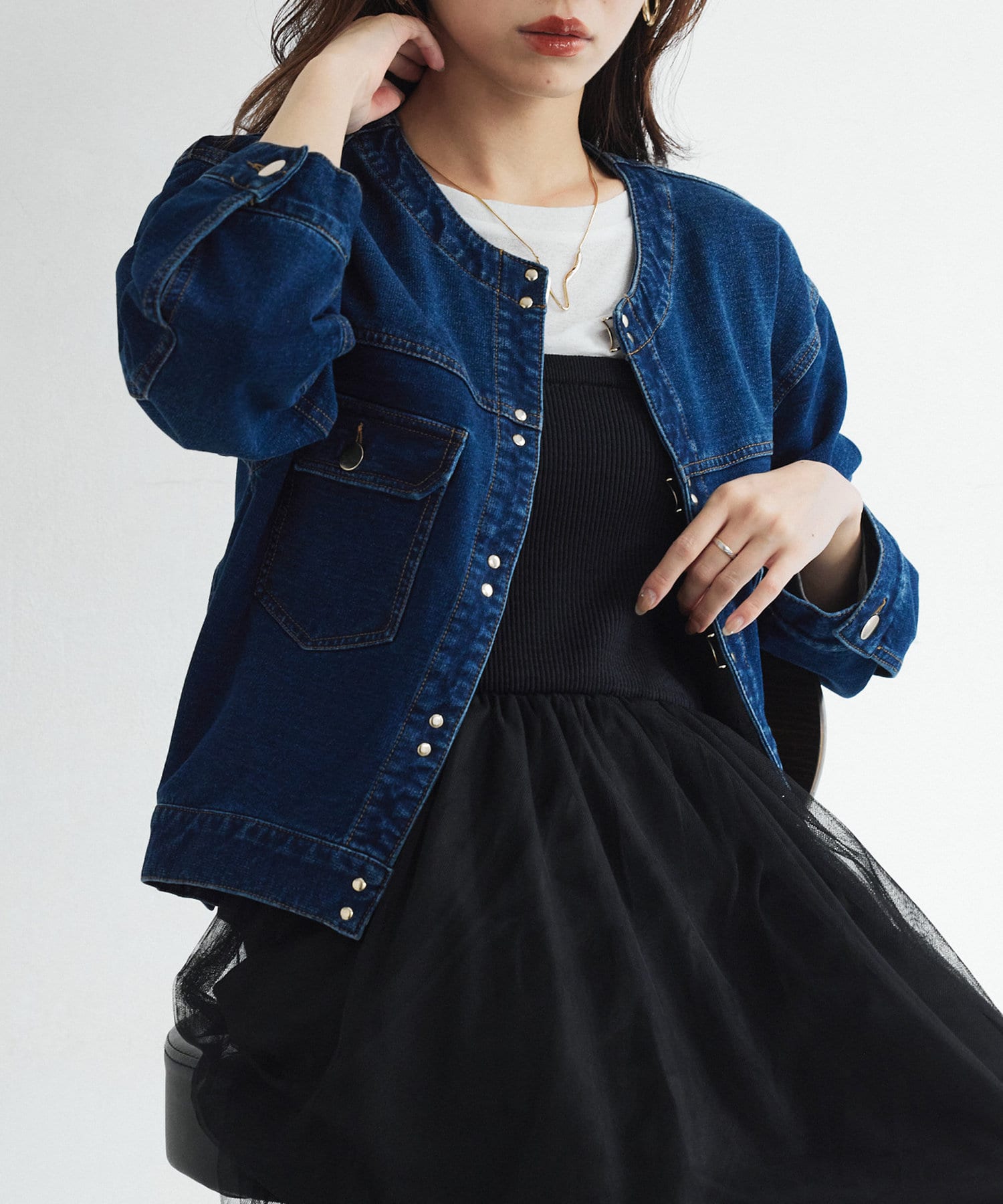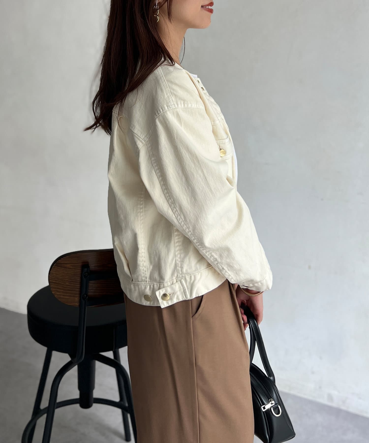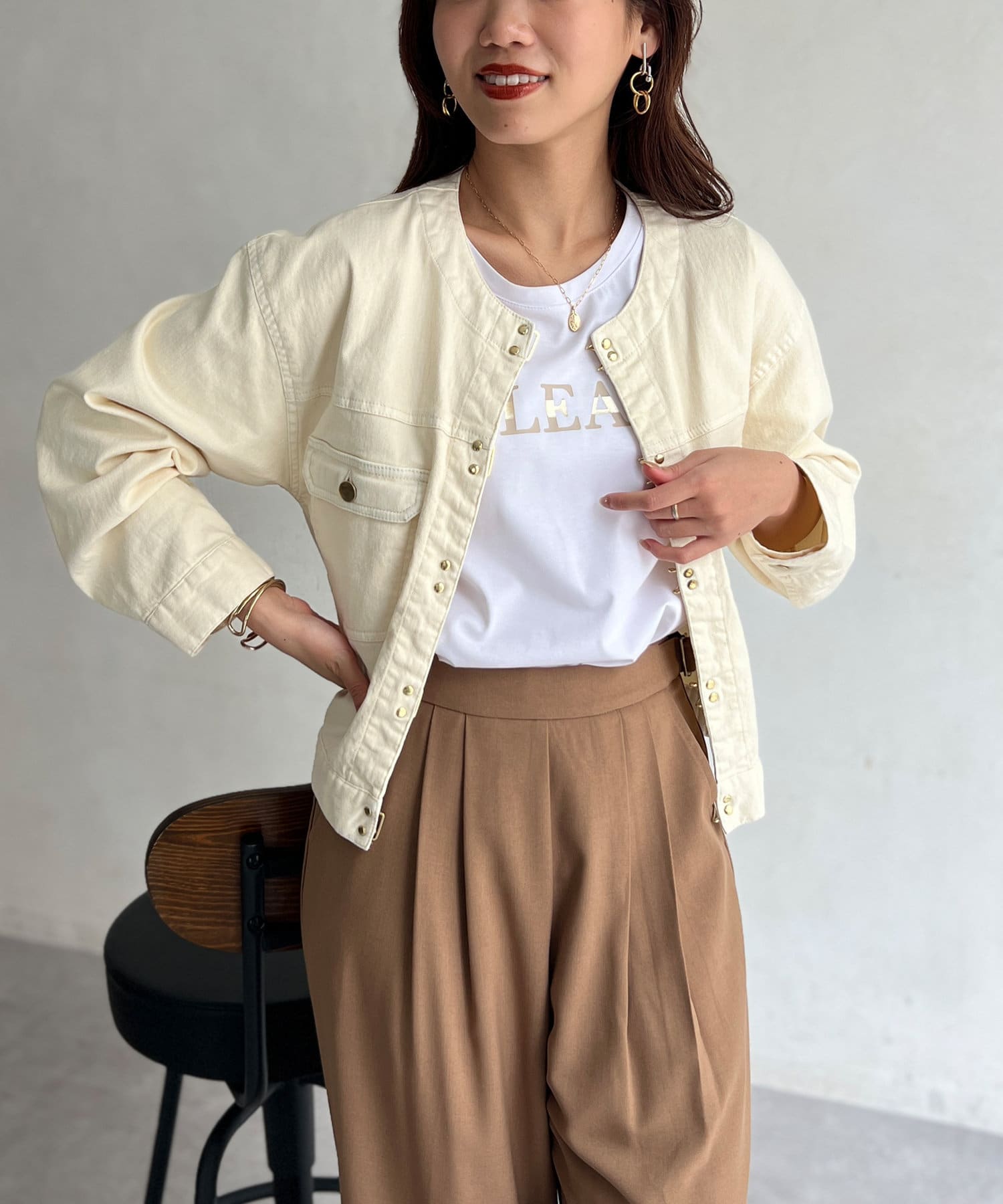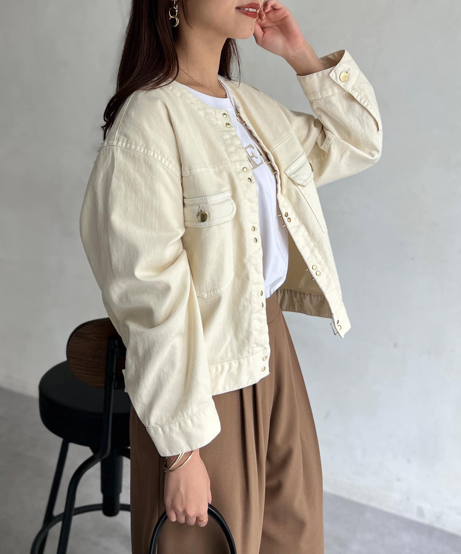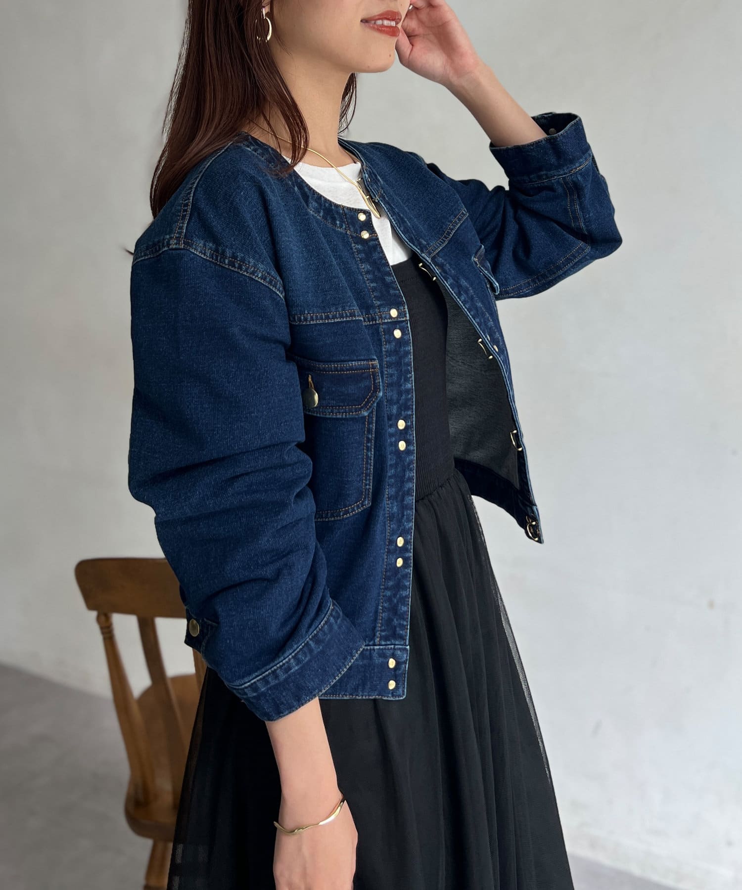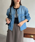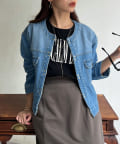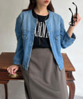 カジュアルながらも女性らしく仕上がるノーカラーのジージャン。