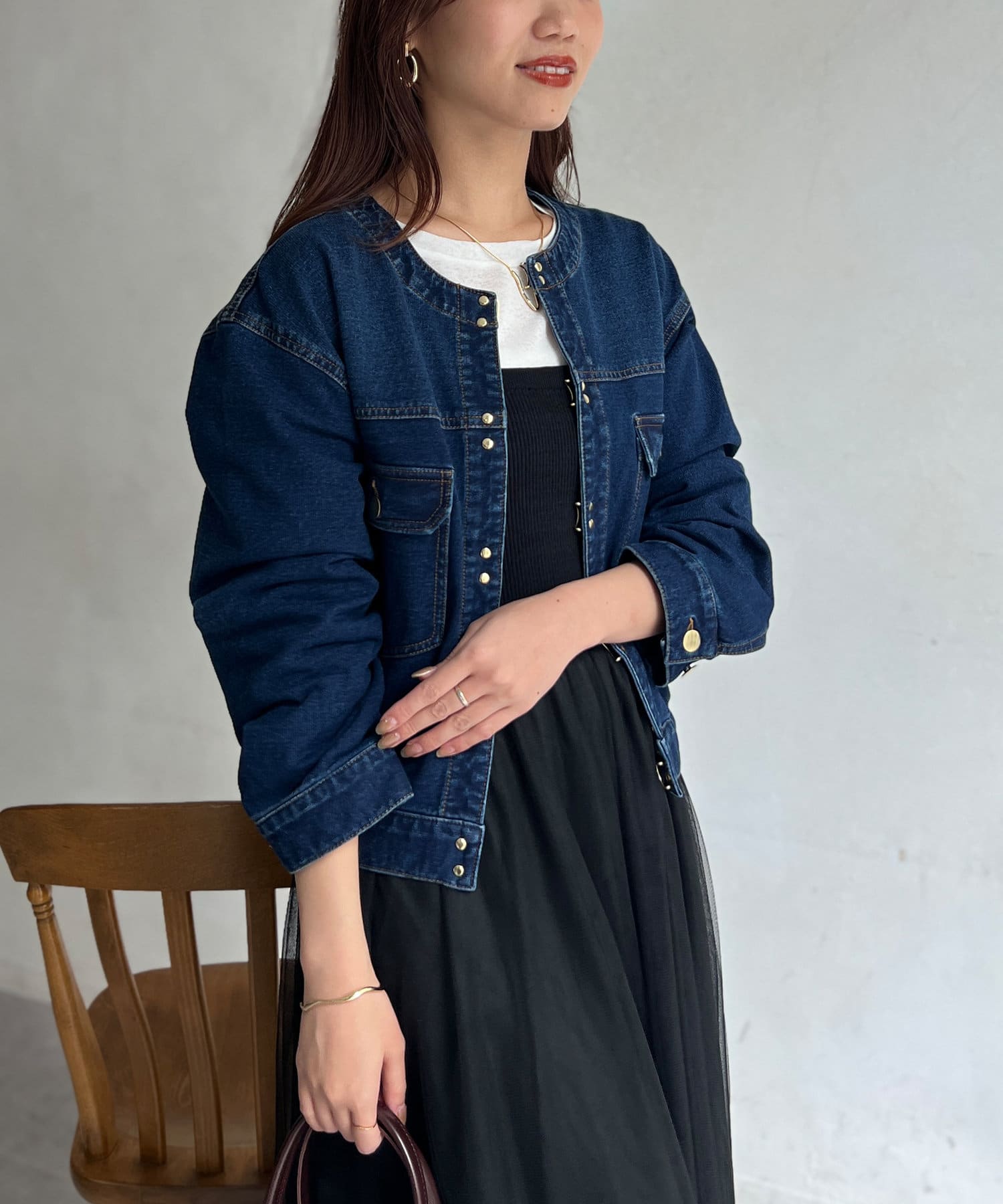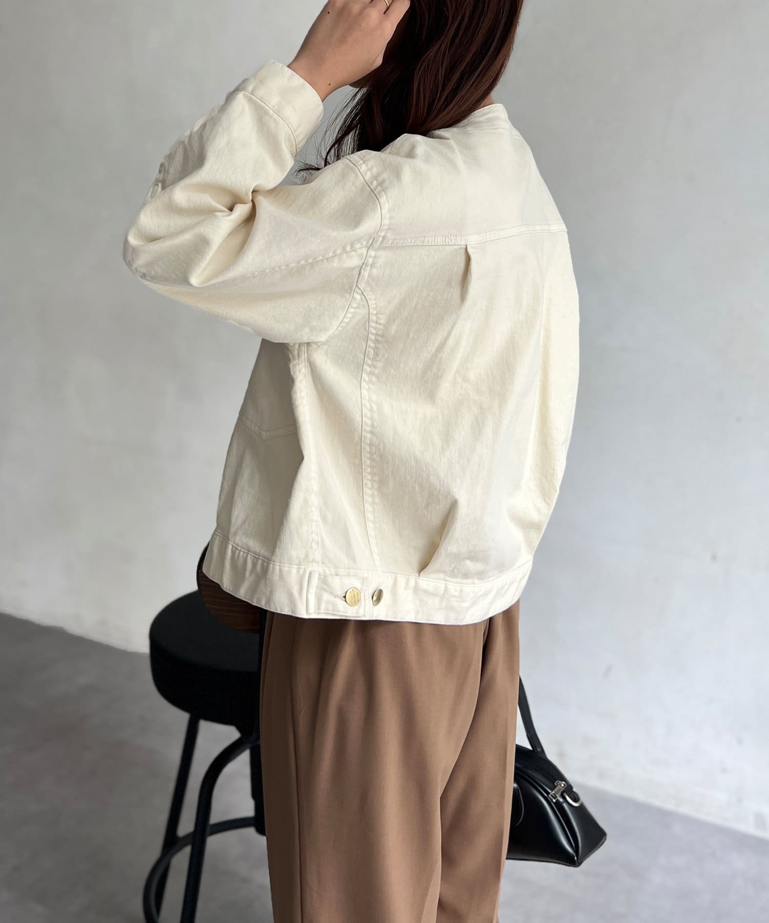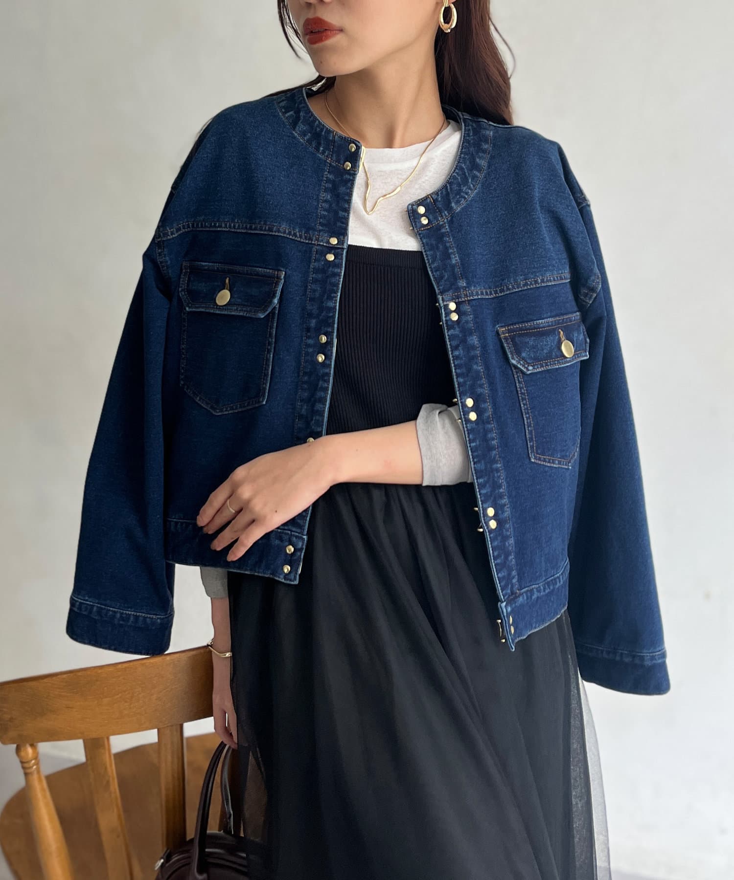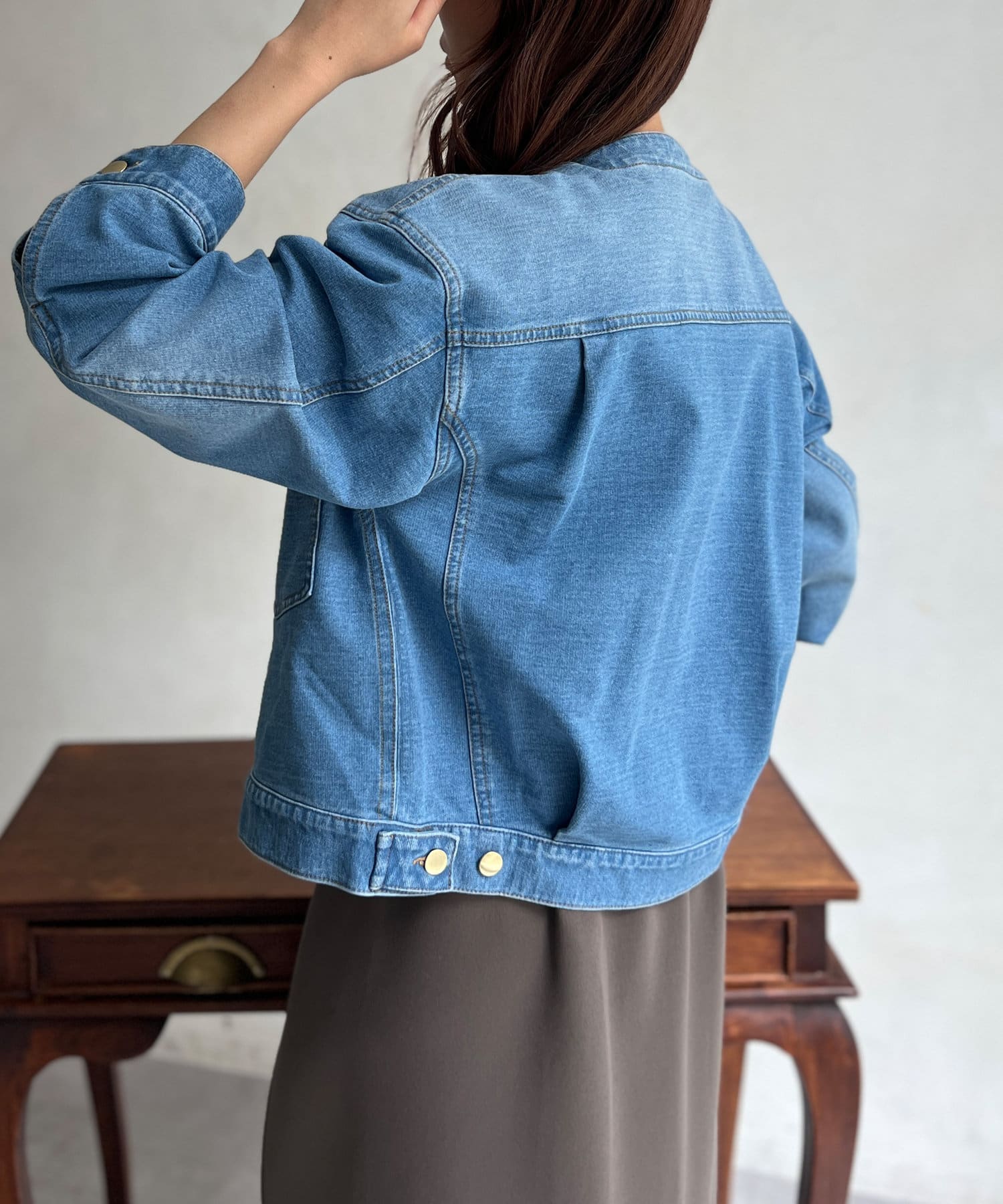 カジュアルながらも女性らしく仕上がるノーカラーのジージャン。