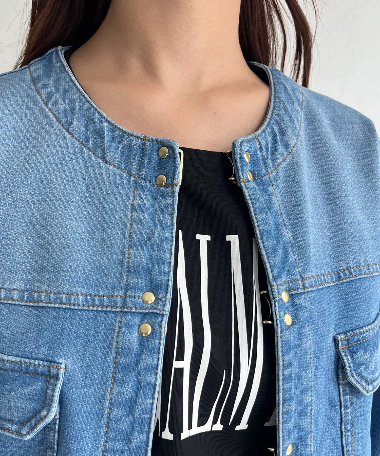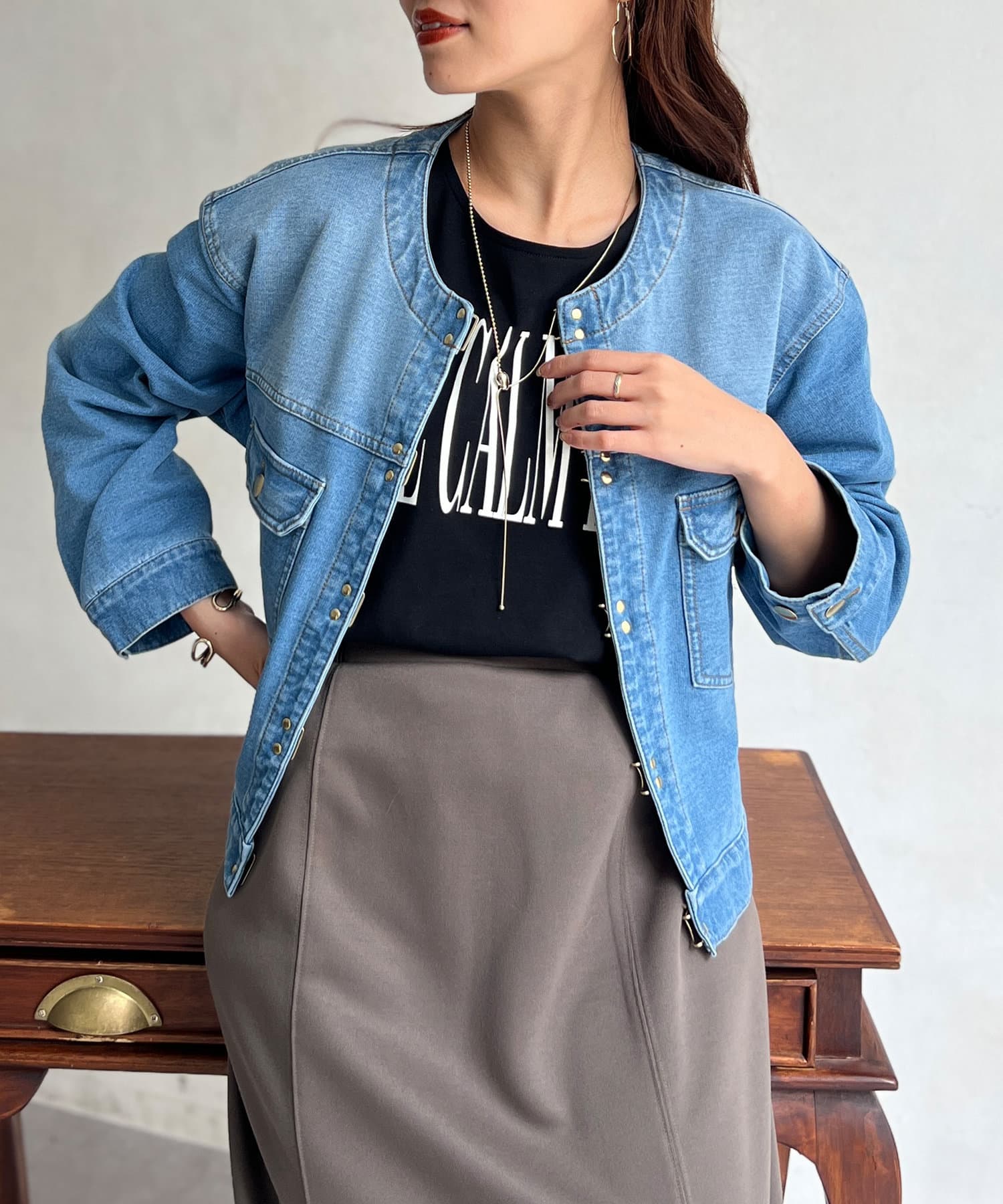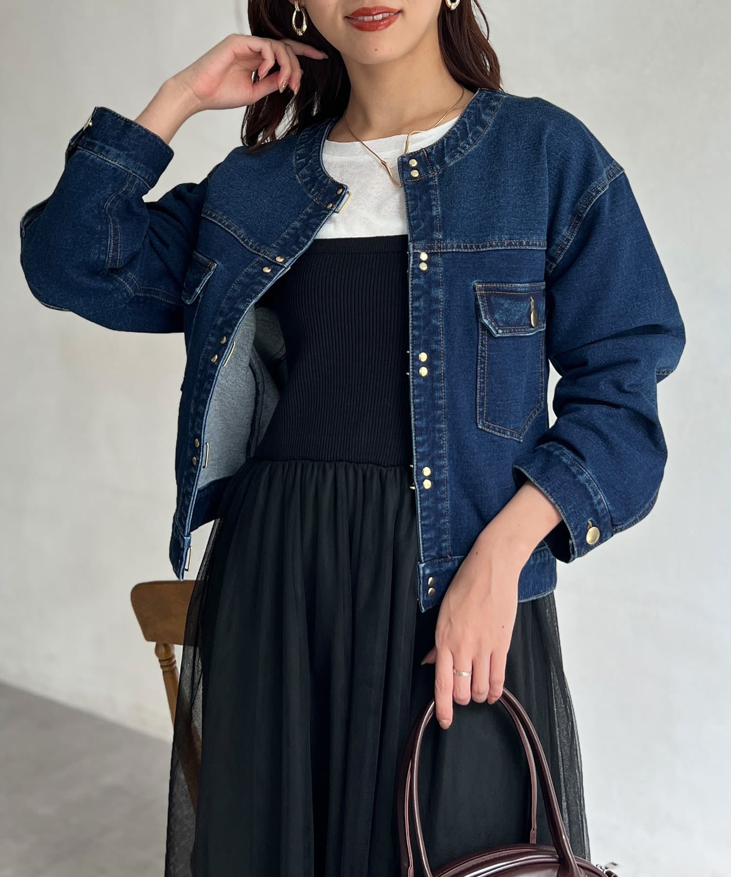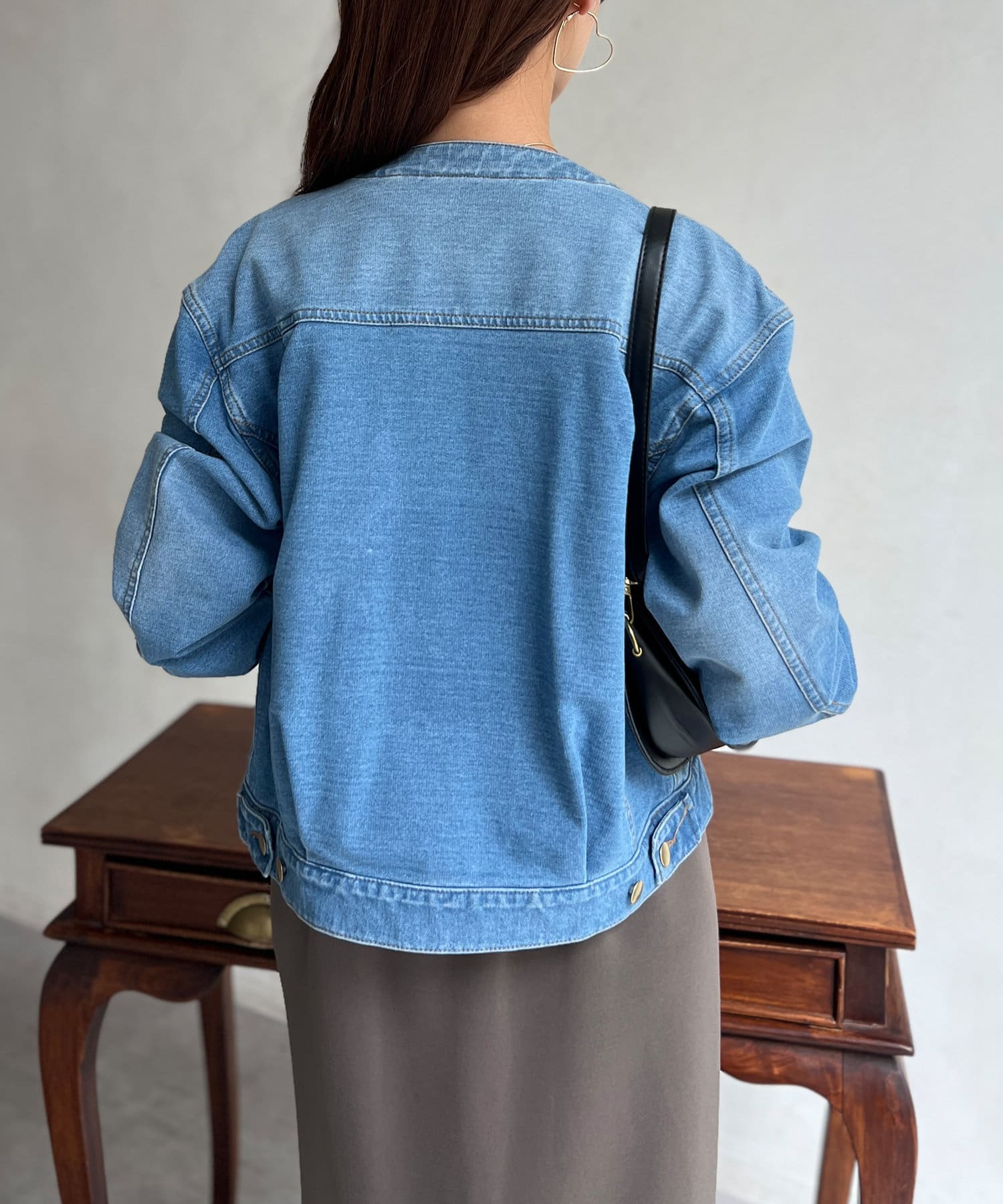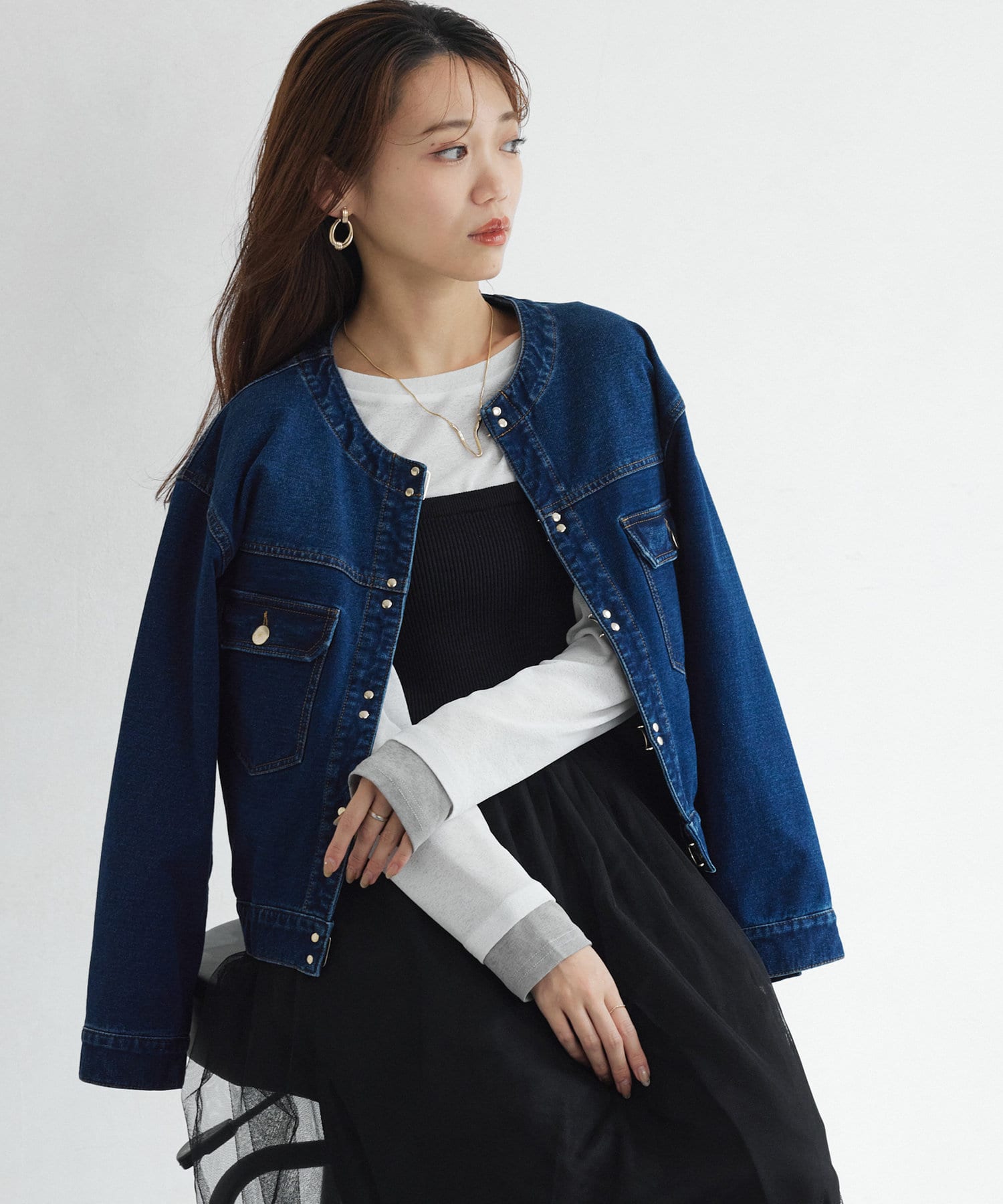 カジュアルながらも女性らしく仕上がるノーカラーのジージャン。