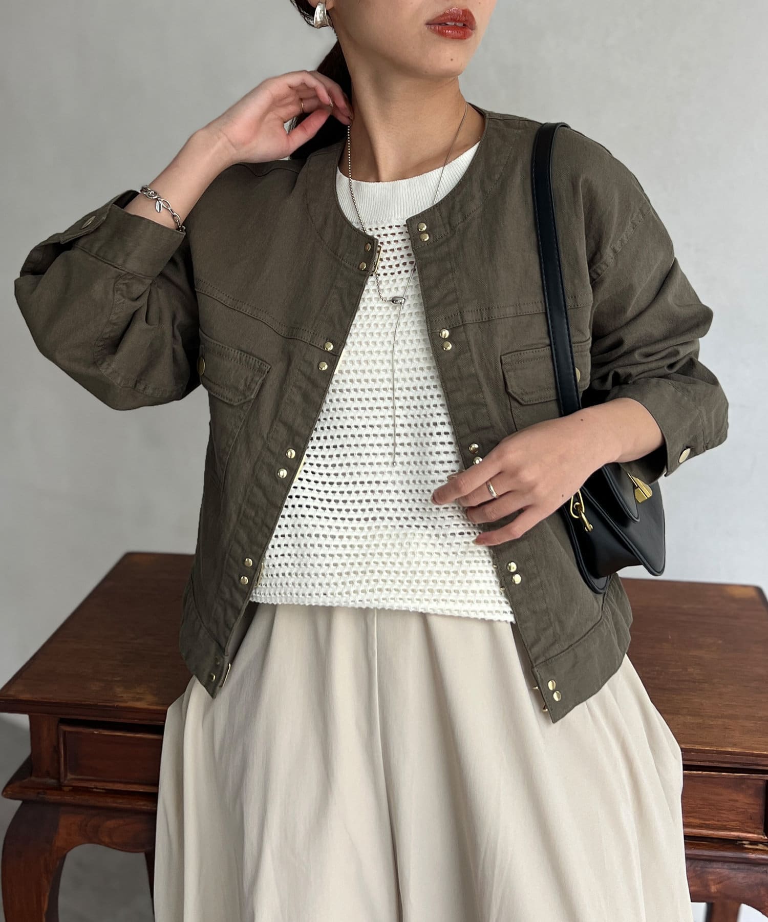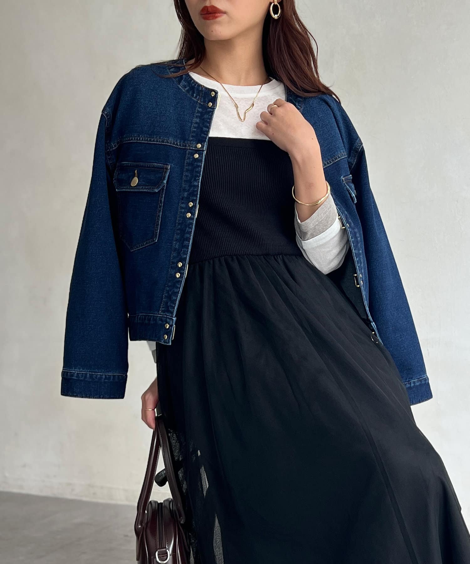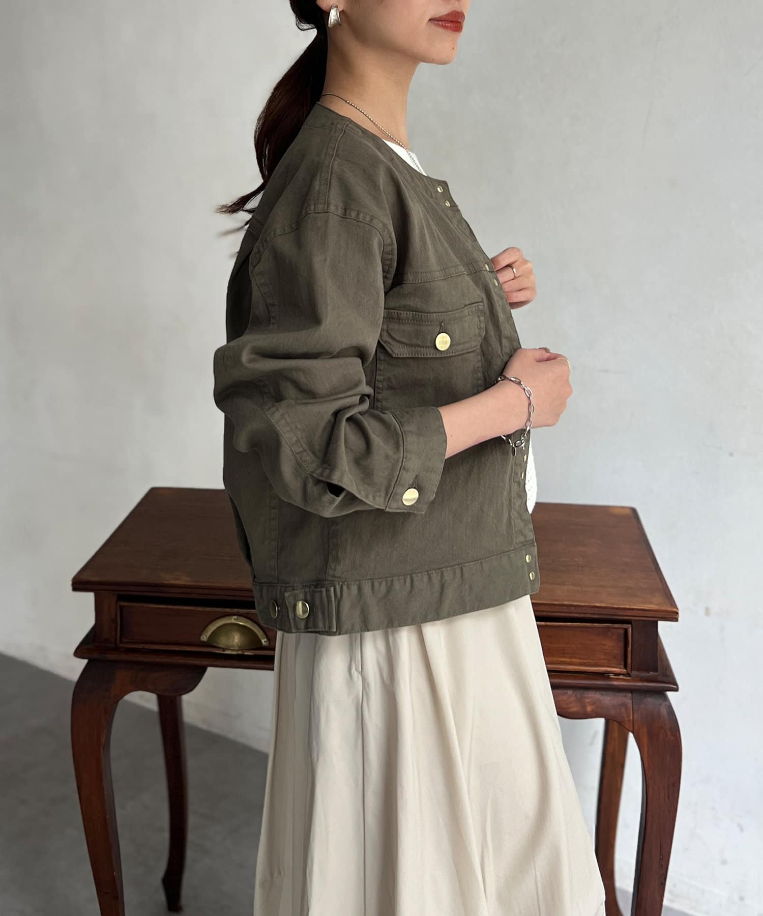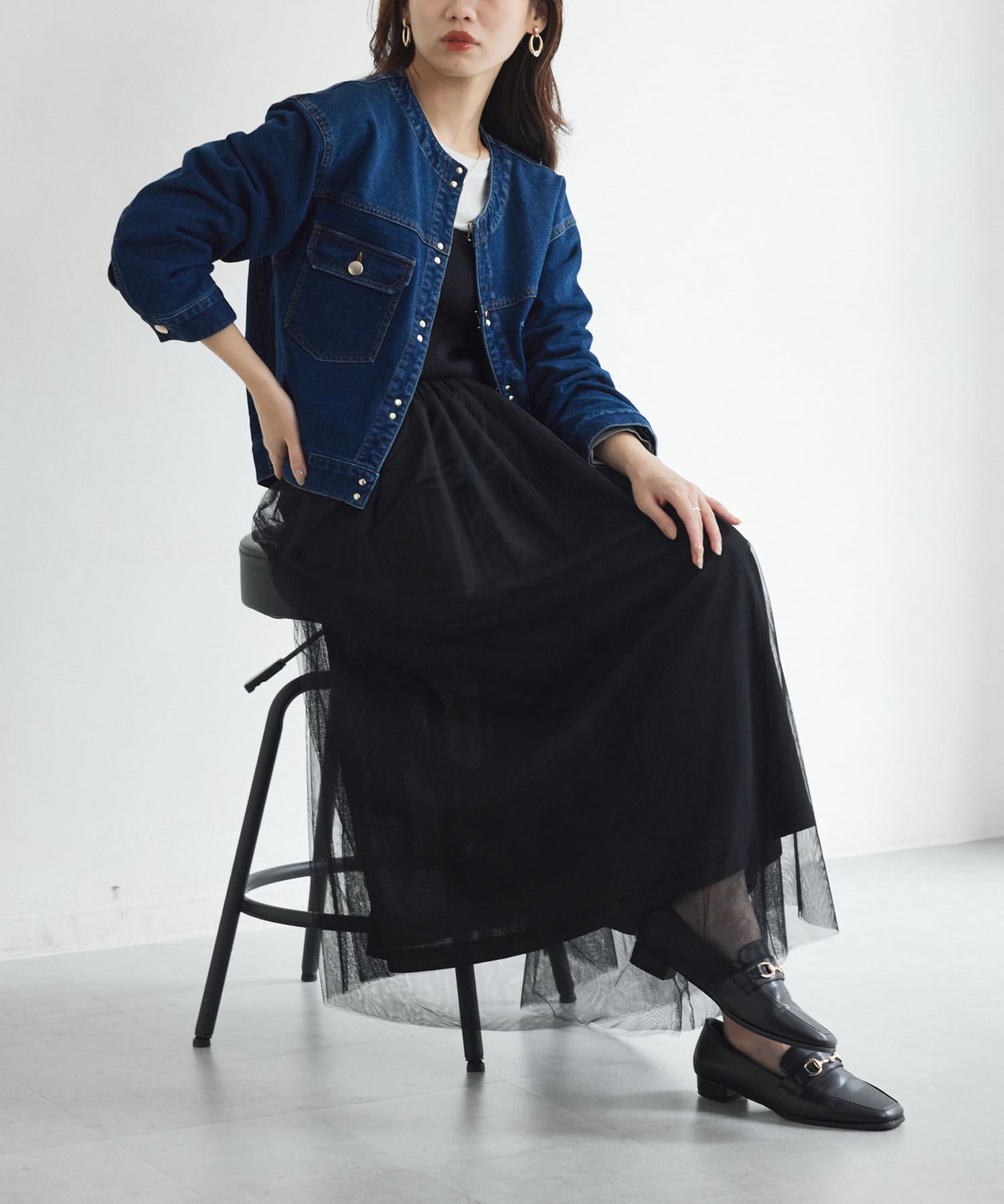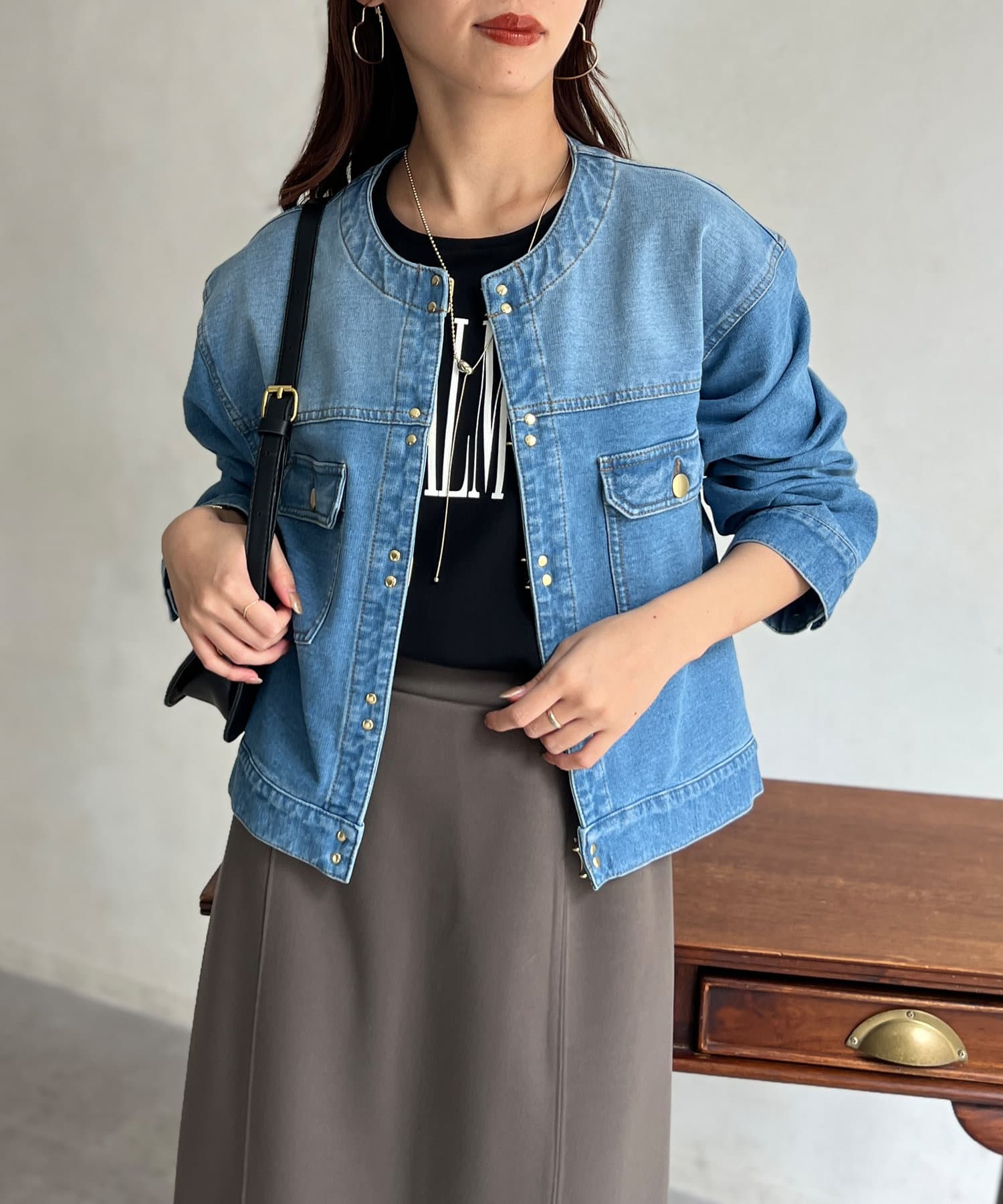 カジュアルながらも女性らしく仕上がるノーカラーのジージャン。