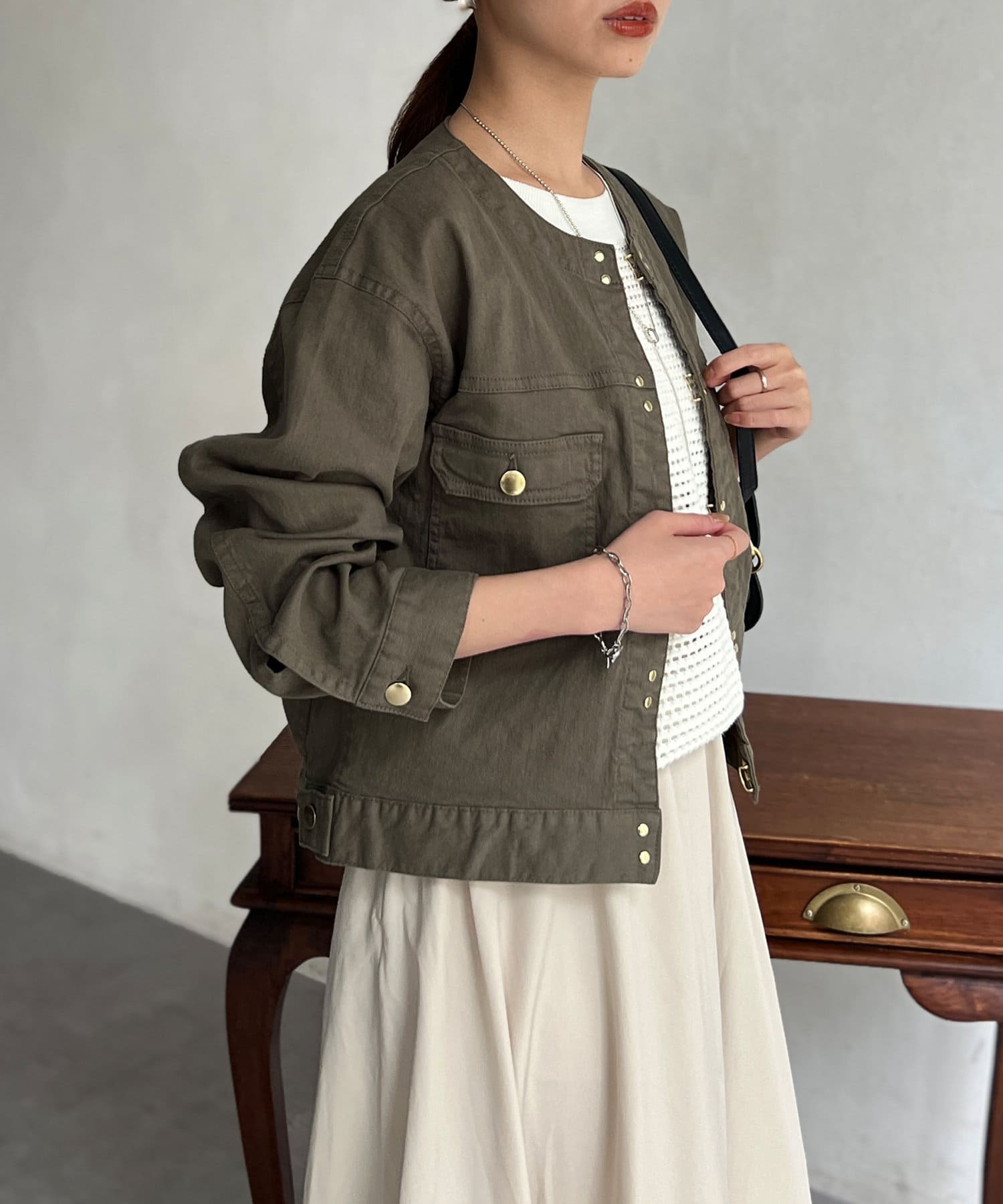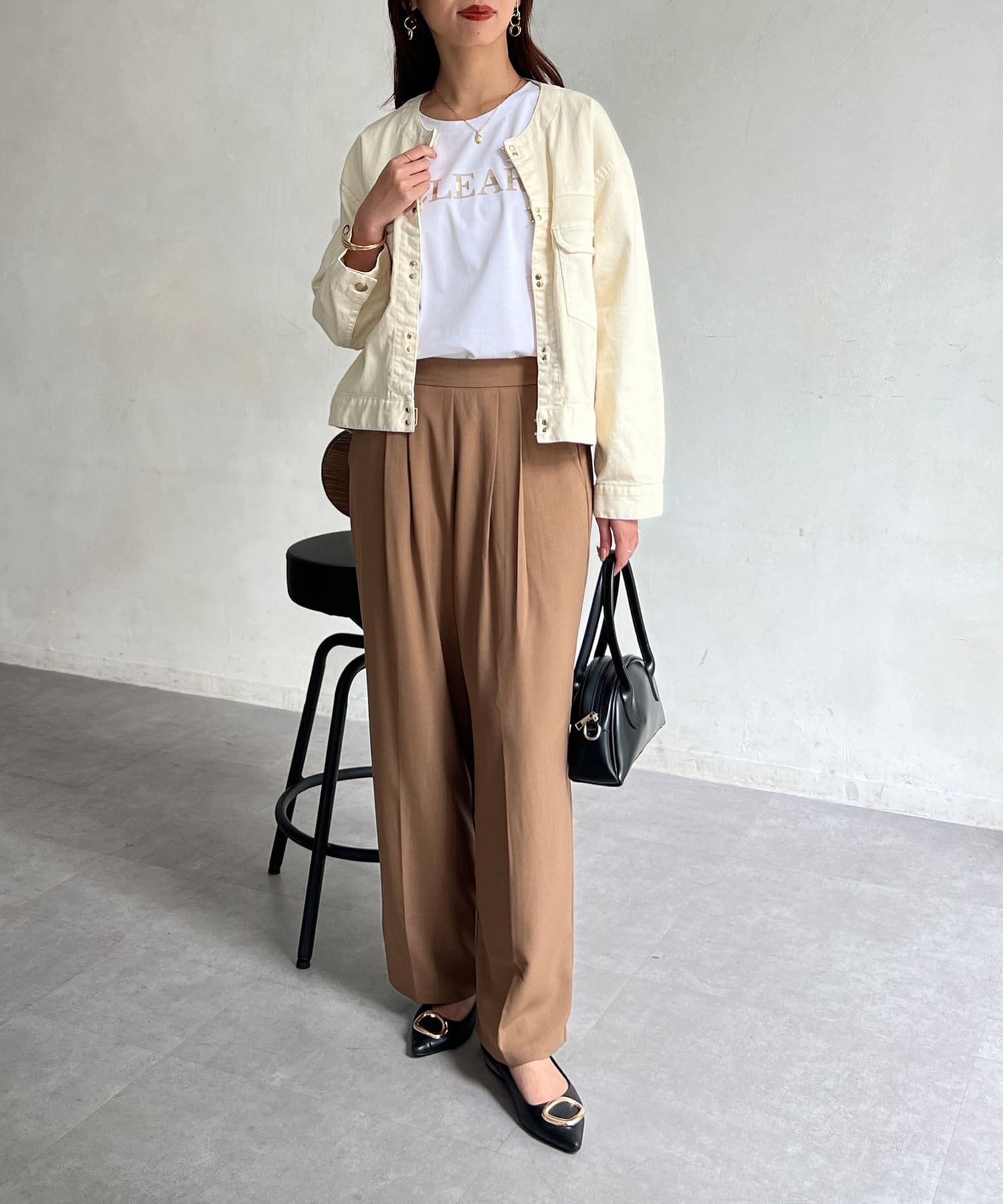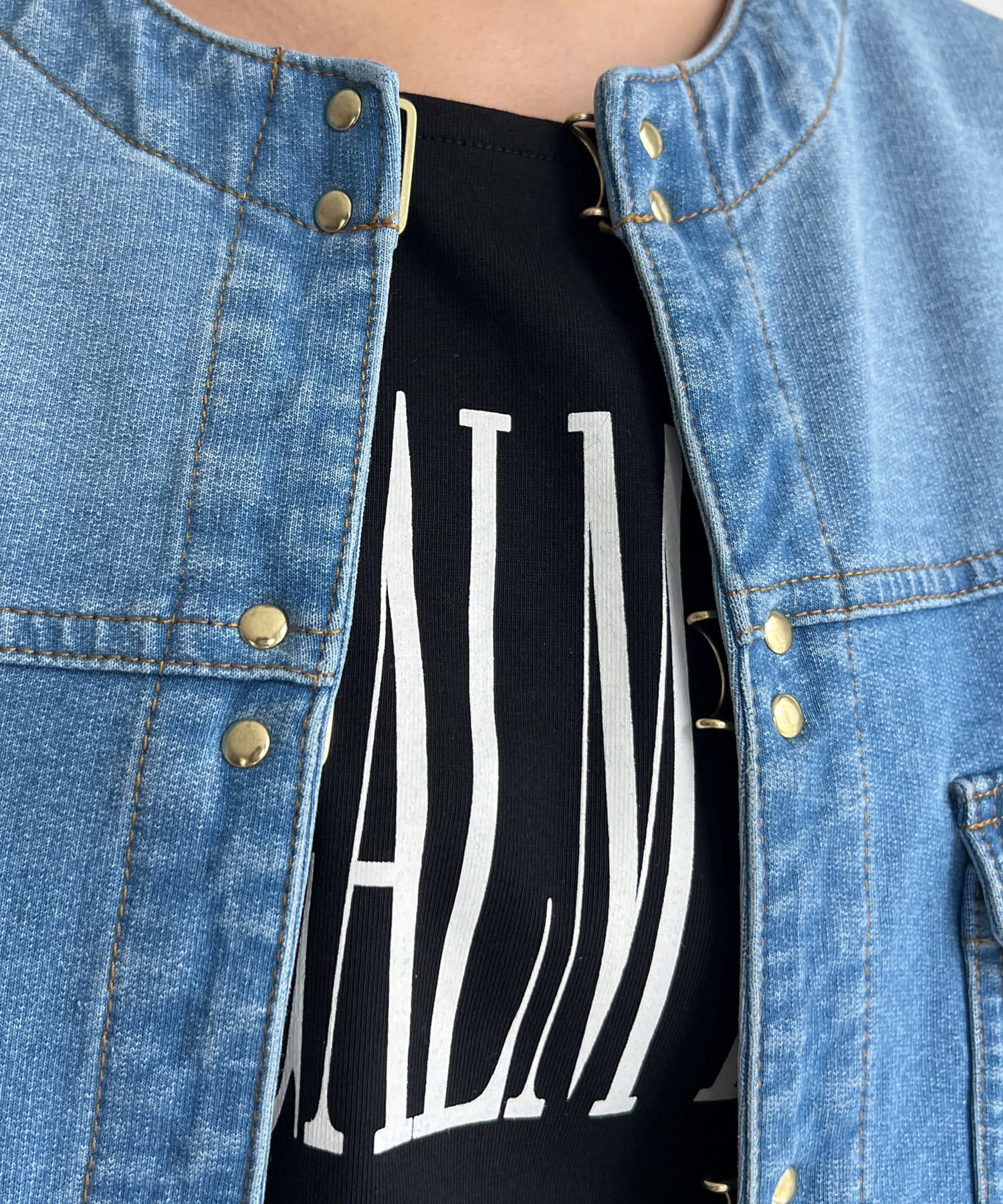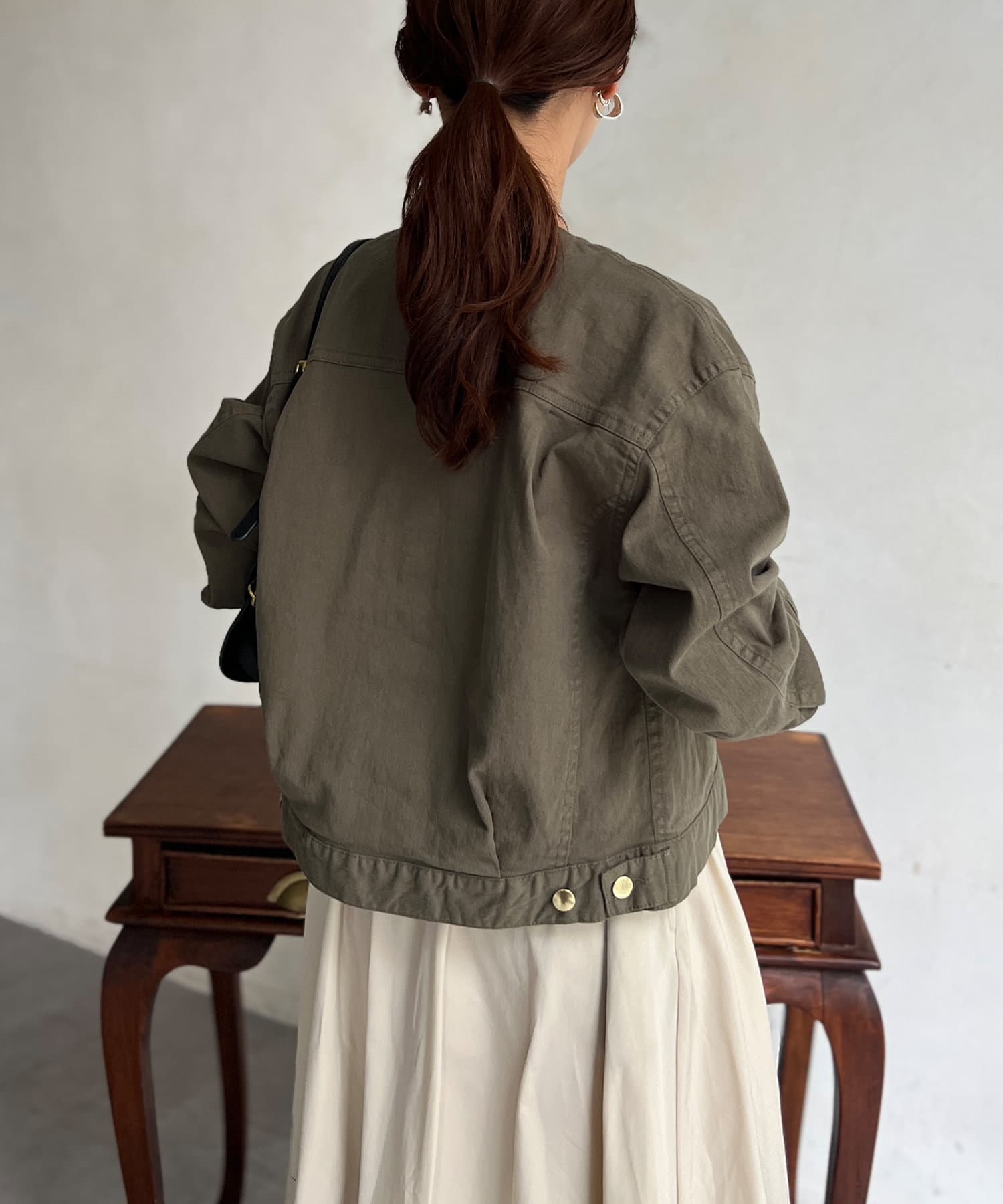 カジュアルながらも女性らしく仕上がるノーカラーのジージャン。