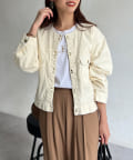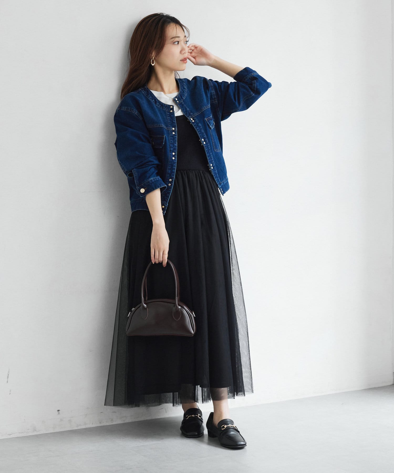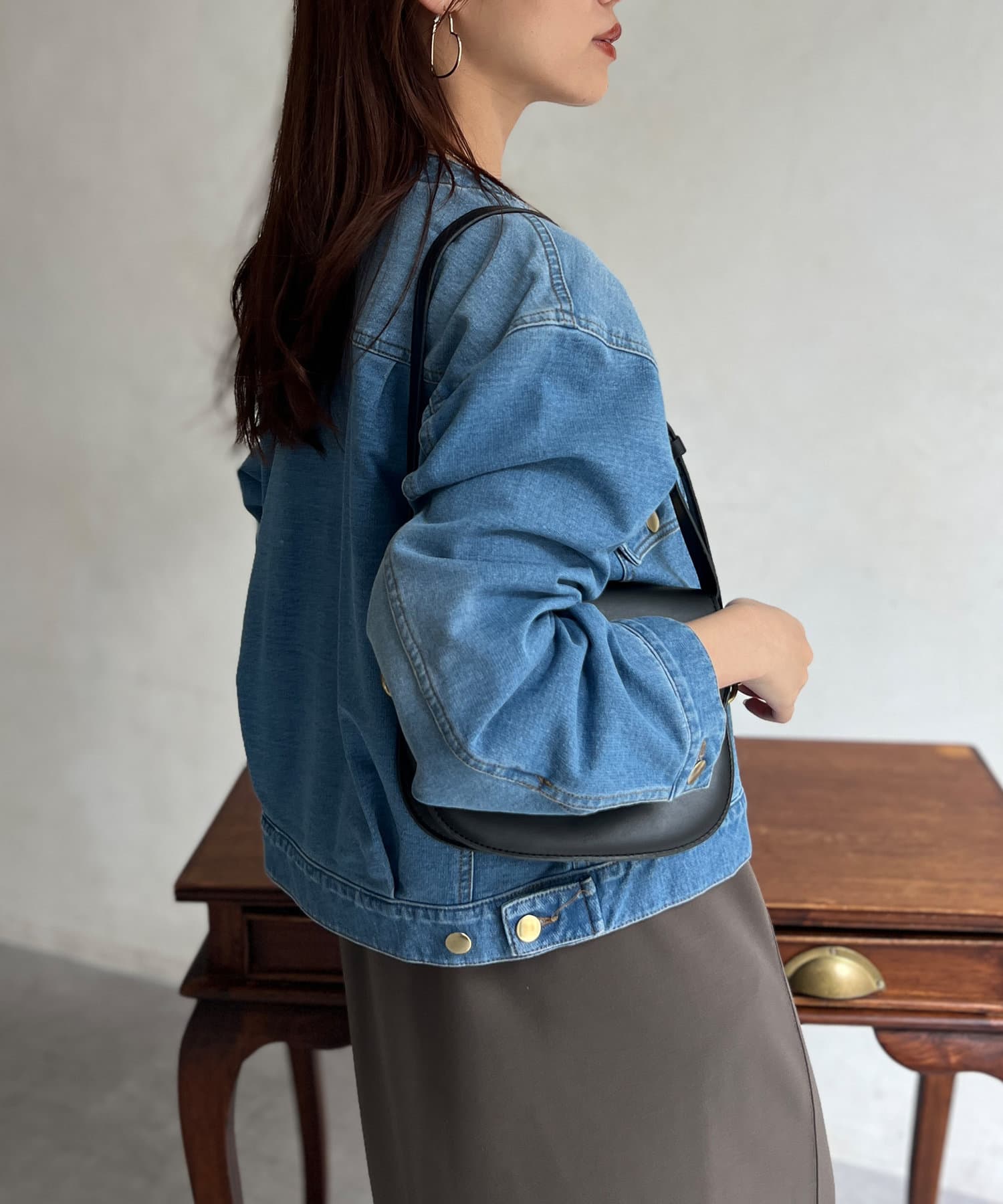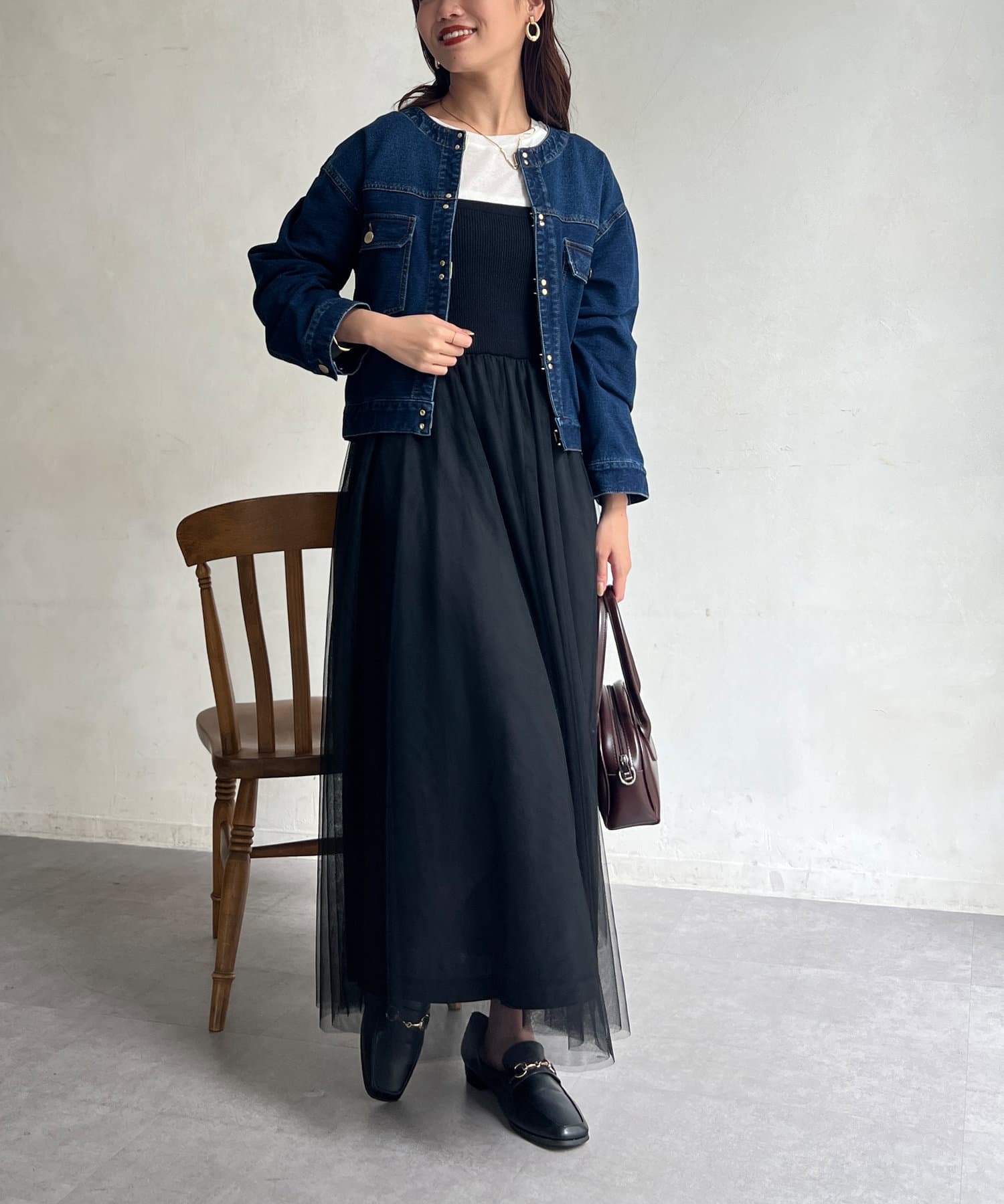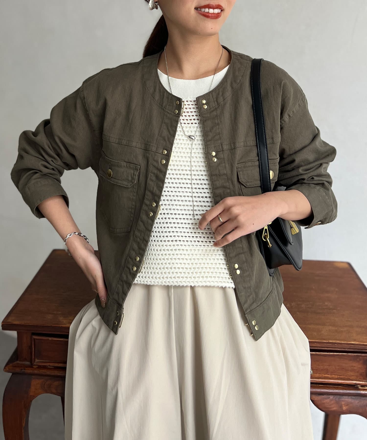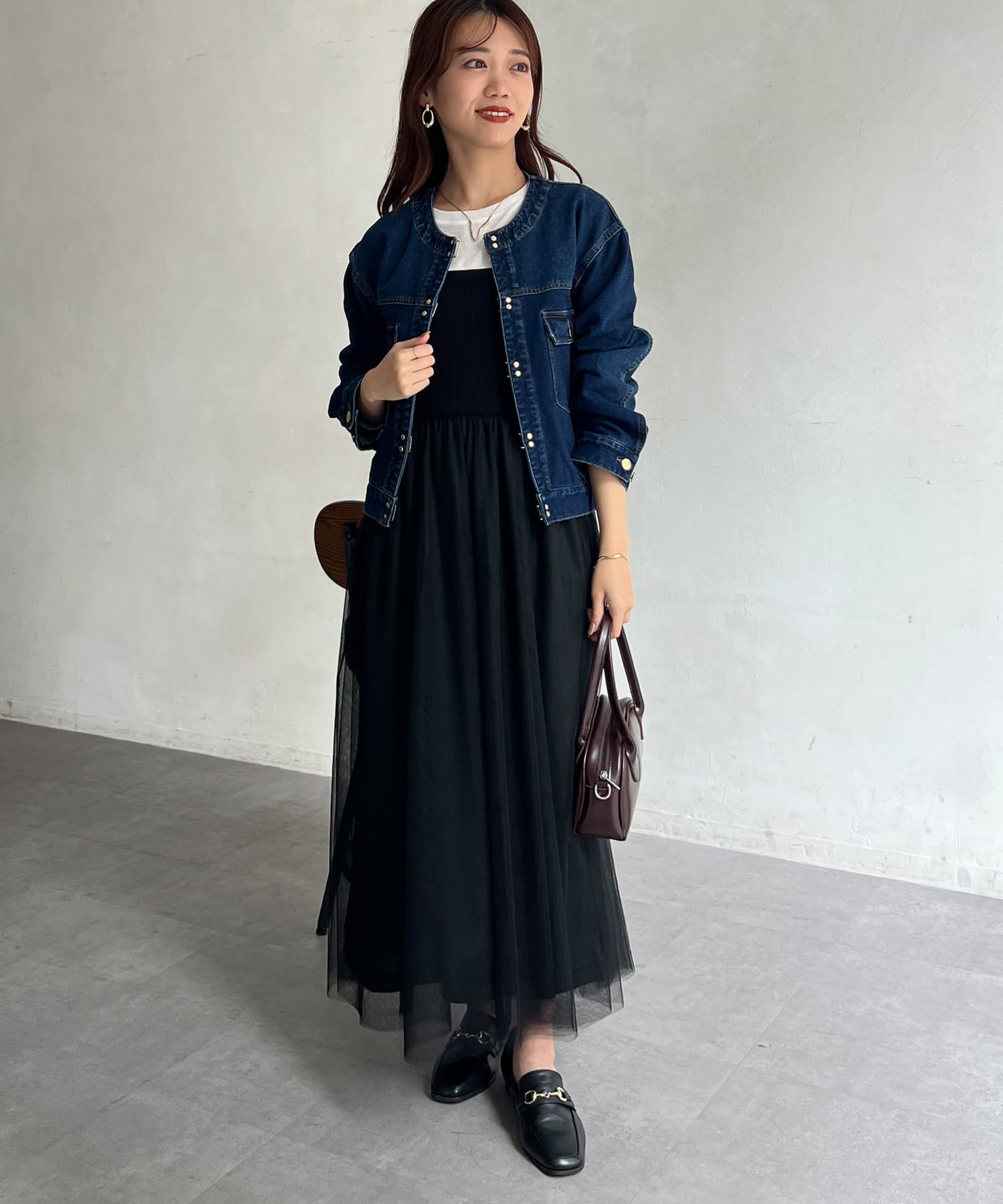 カジュアルながらも女性らしく仕上がるノーカラーのジージャン。