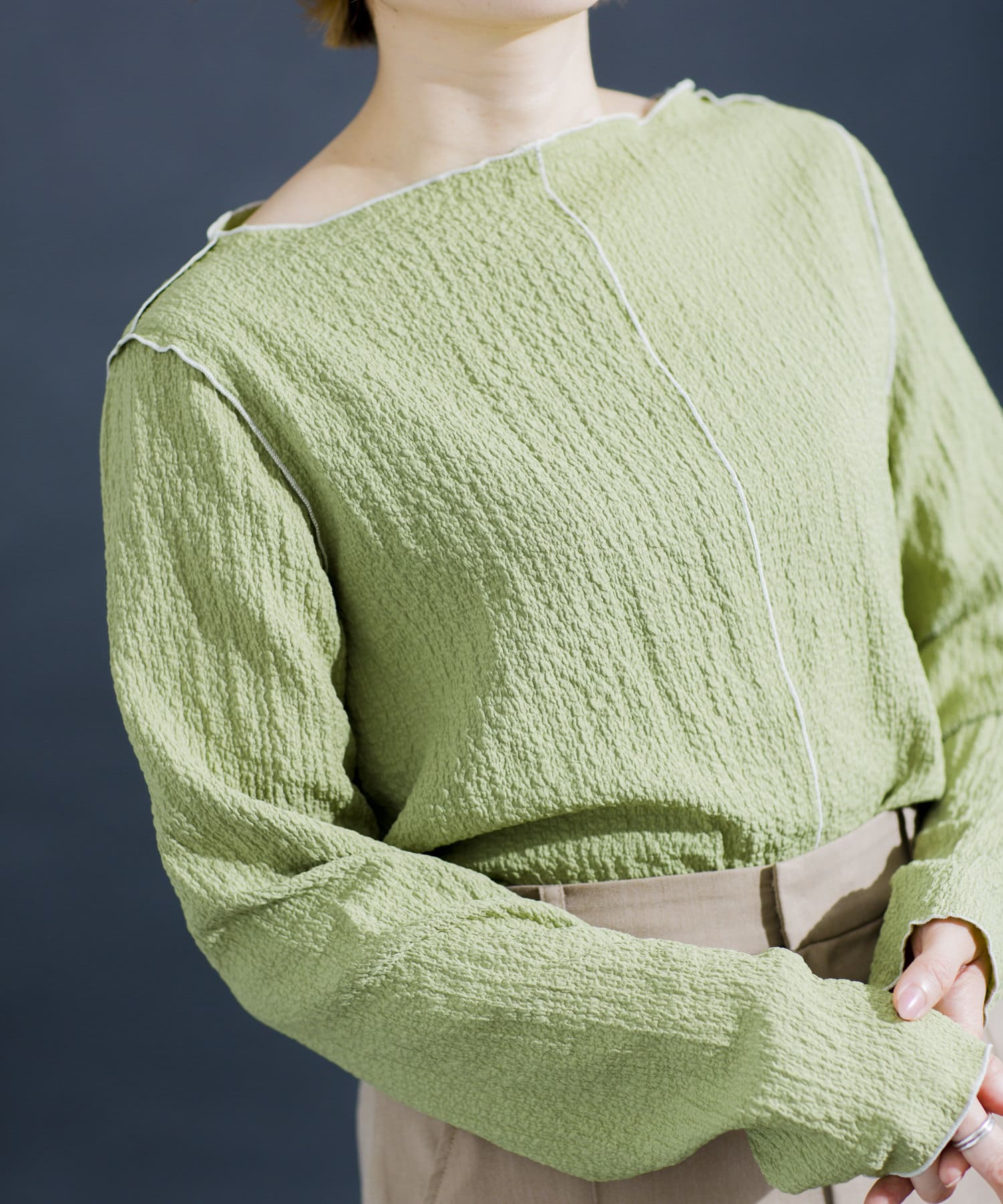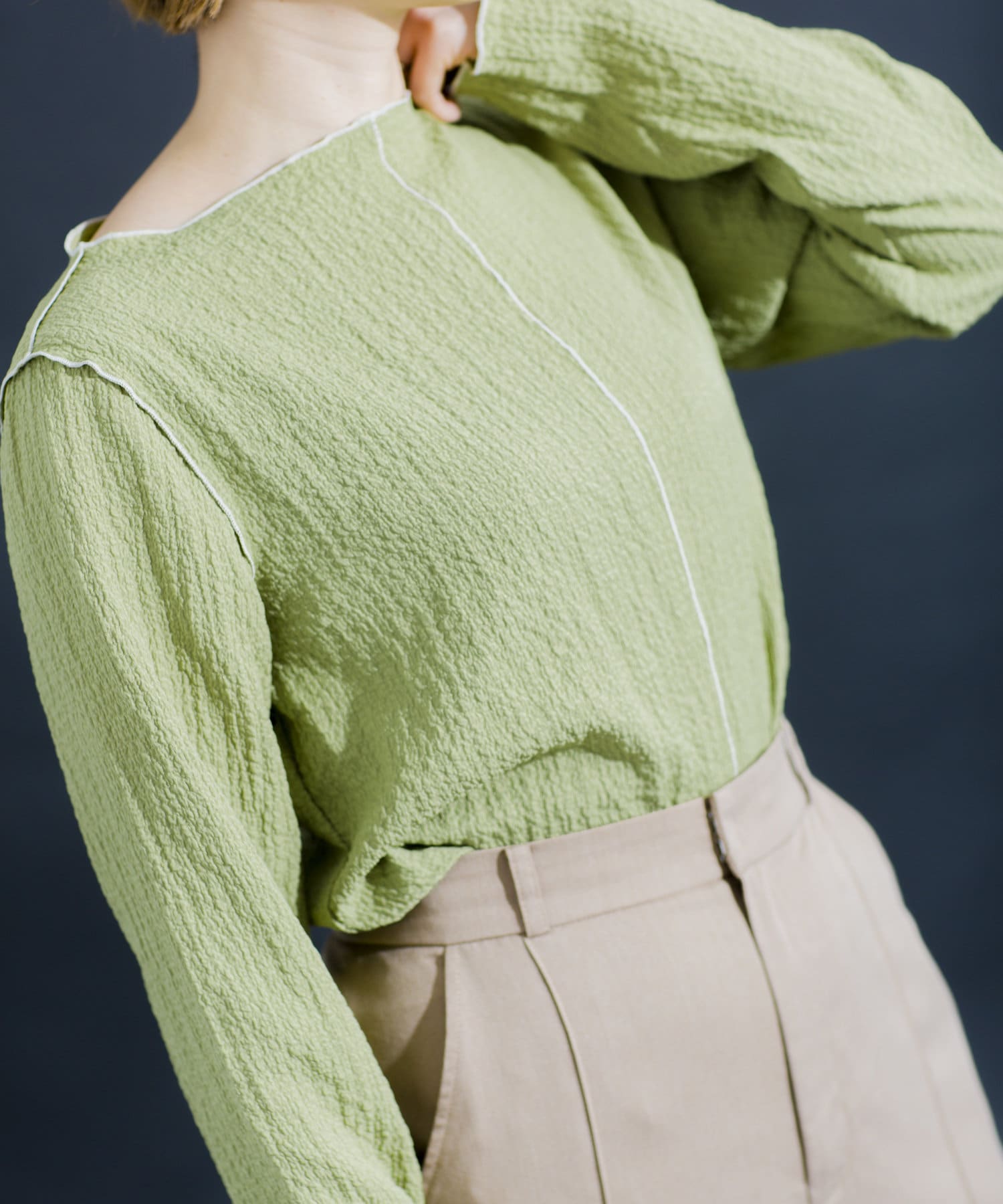 若干透け感があるのでインナー必須にはなりますが、1枚でもお洒落トップスとしてデニムやタック入りパンツと合わせて着たいデザインです!