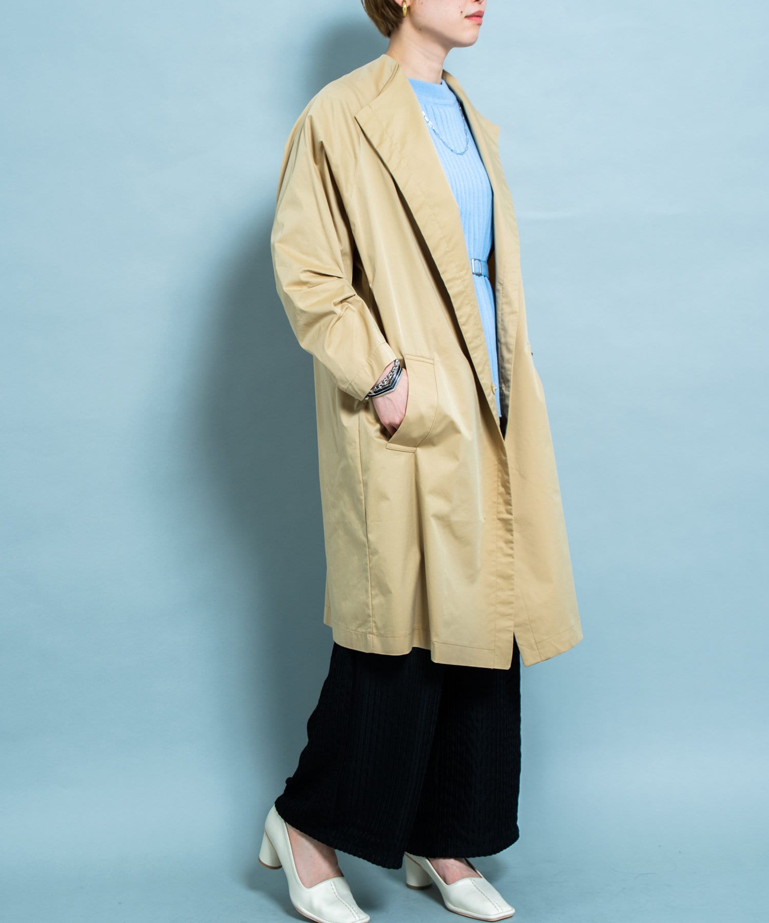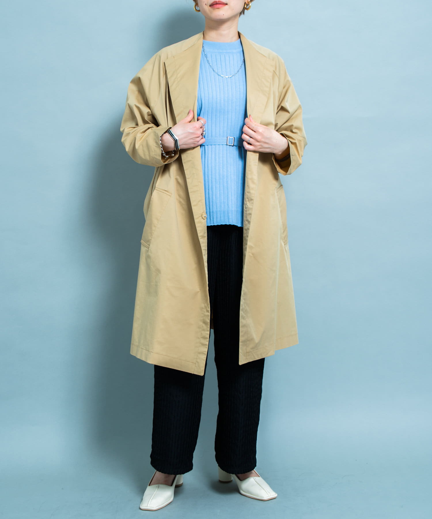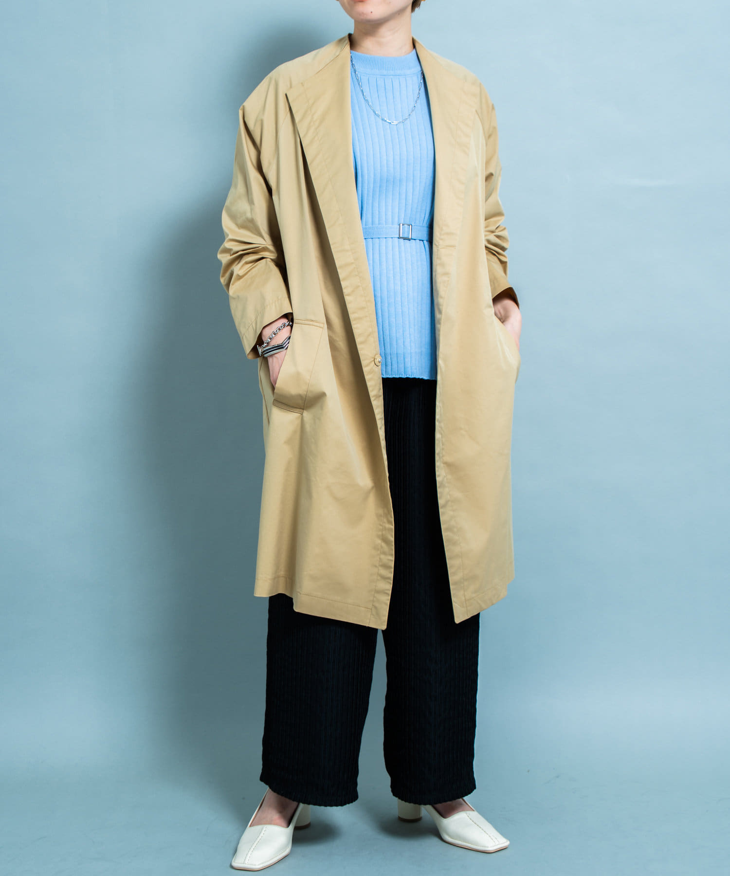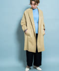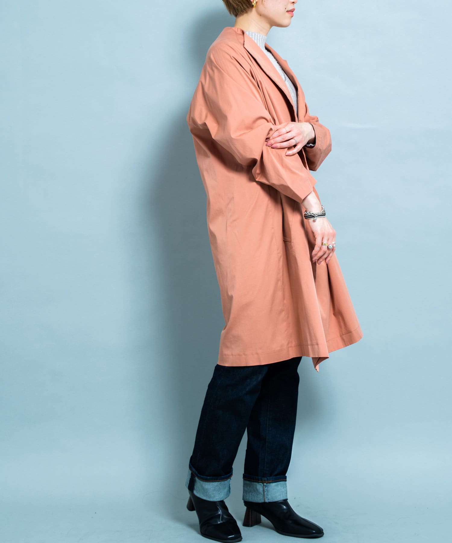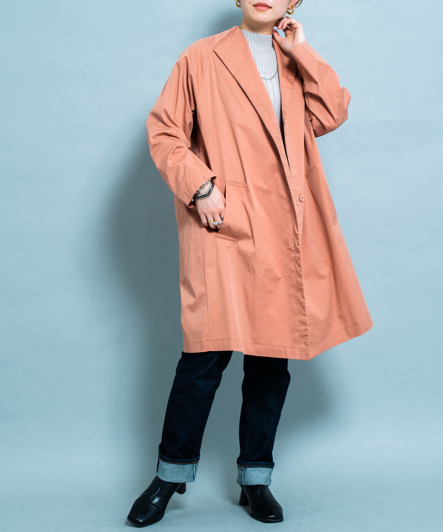 ややオーバーサイズなコートです。生地は薄手で春コートの位置づけになります。ざっくりと羽織れるので、ニットで合わせても着やすいサイズ感です。