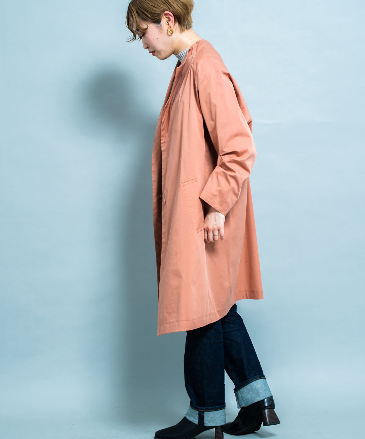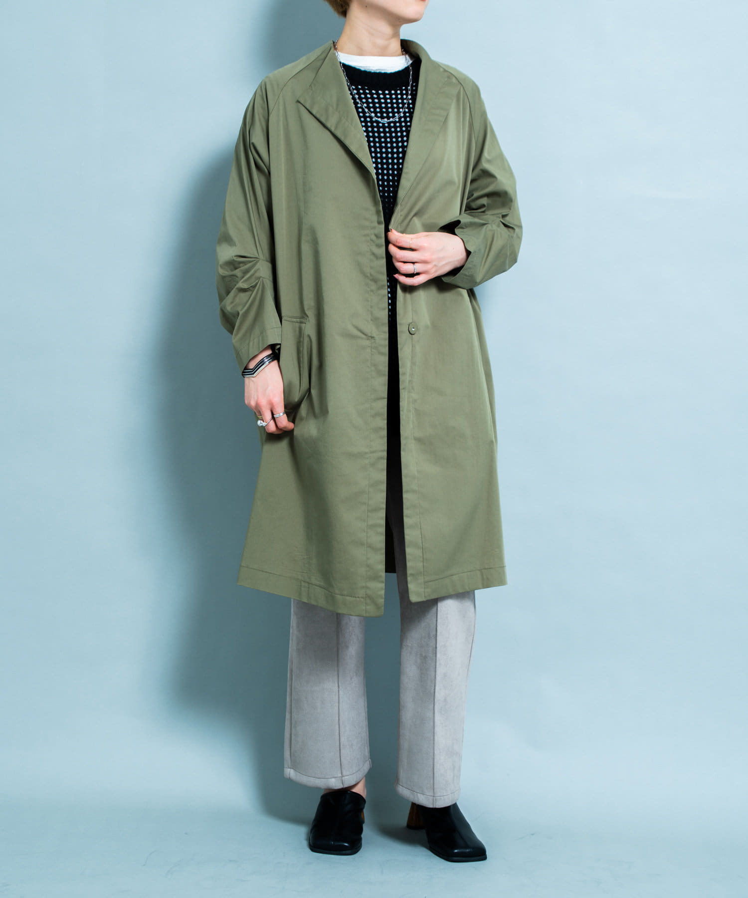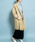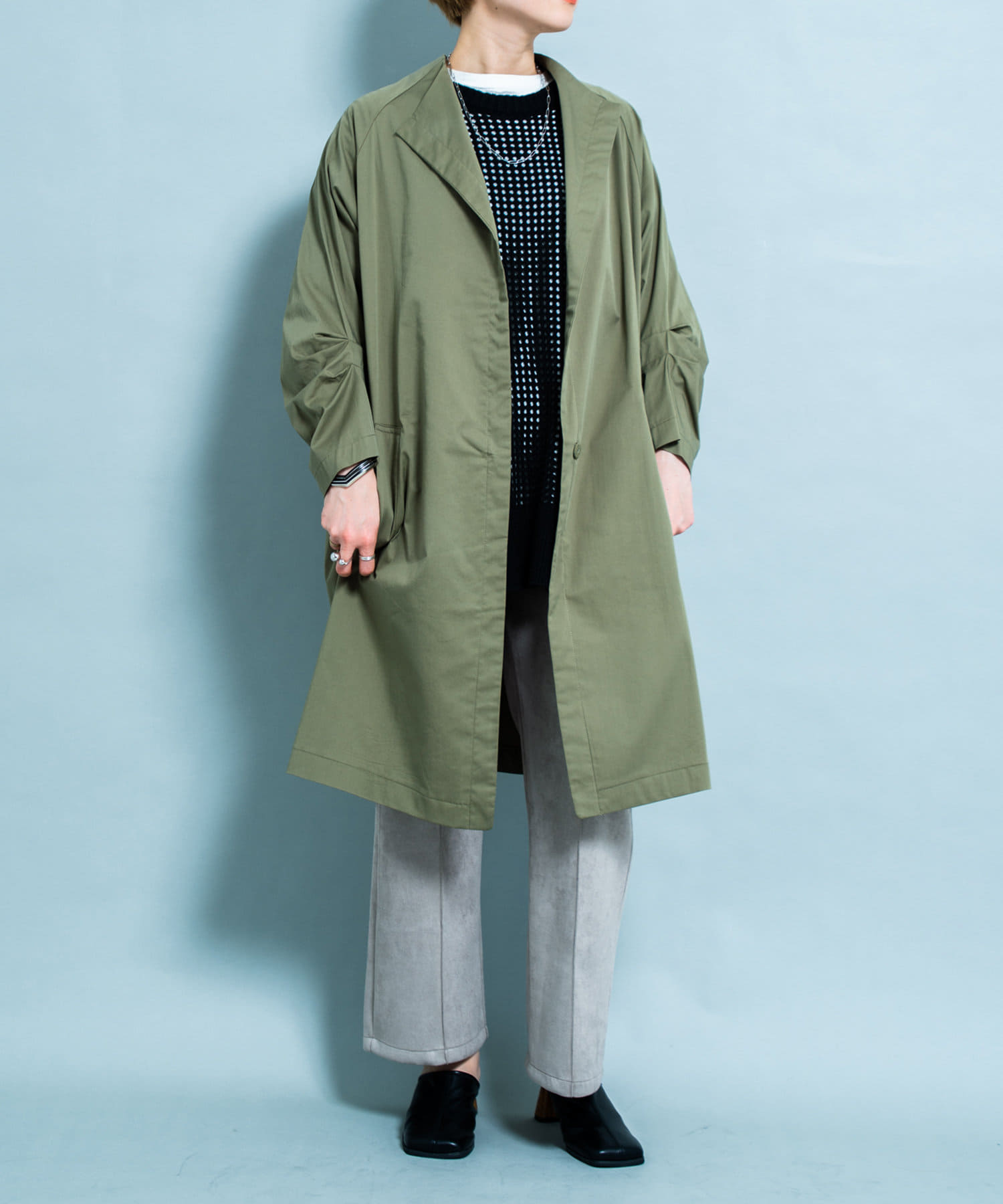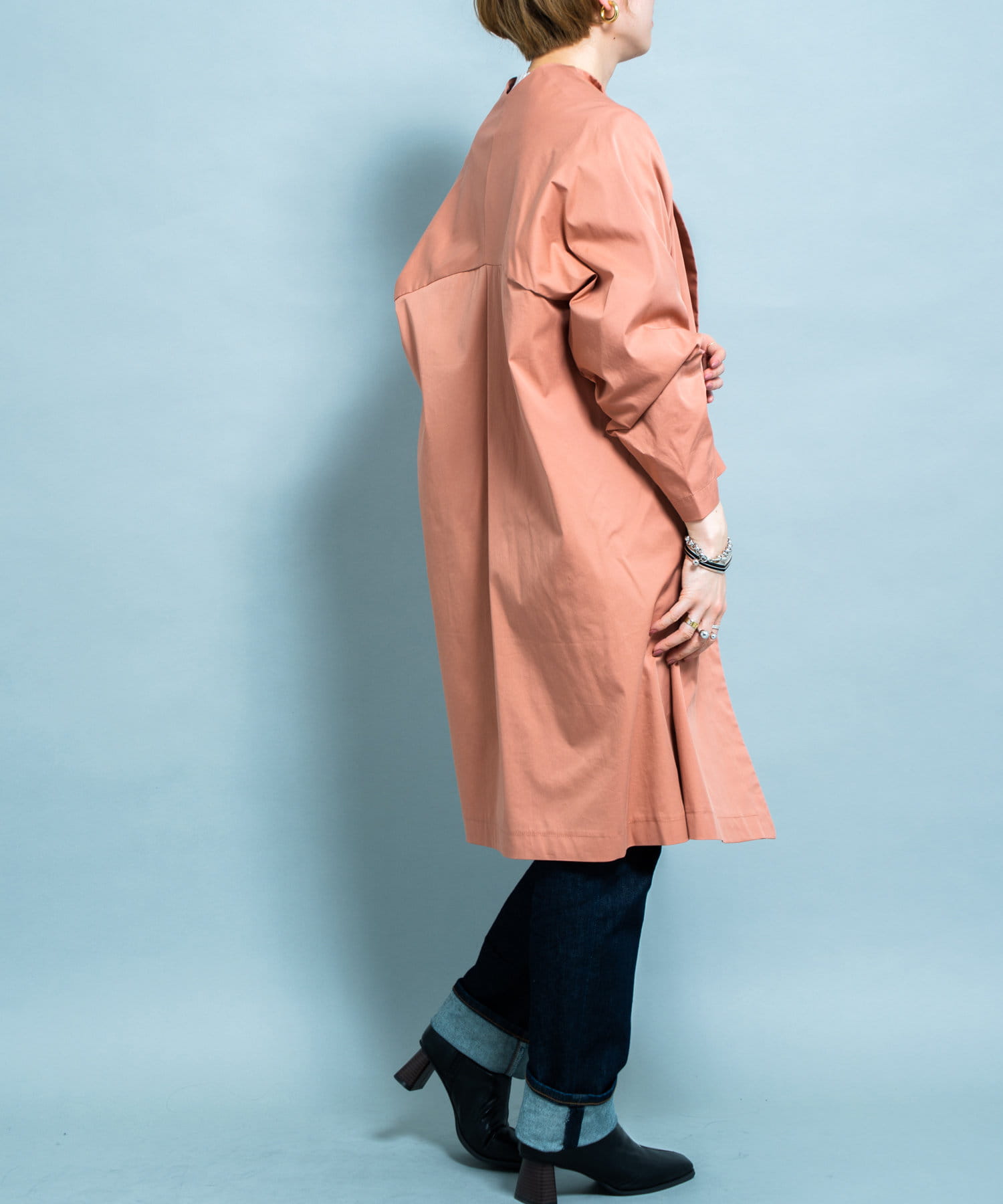 ややオーバーサイズなコートです。生地は薄手で春コートの位置づけになります。ざっくりと羽織れるので、ニットで合わせても着やすいサイズ感です。