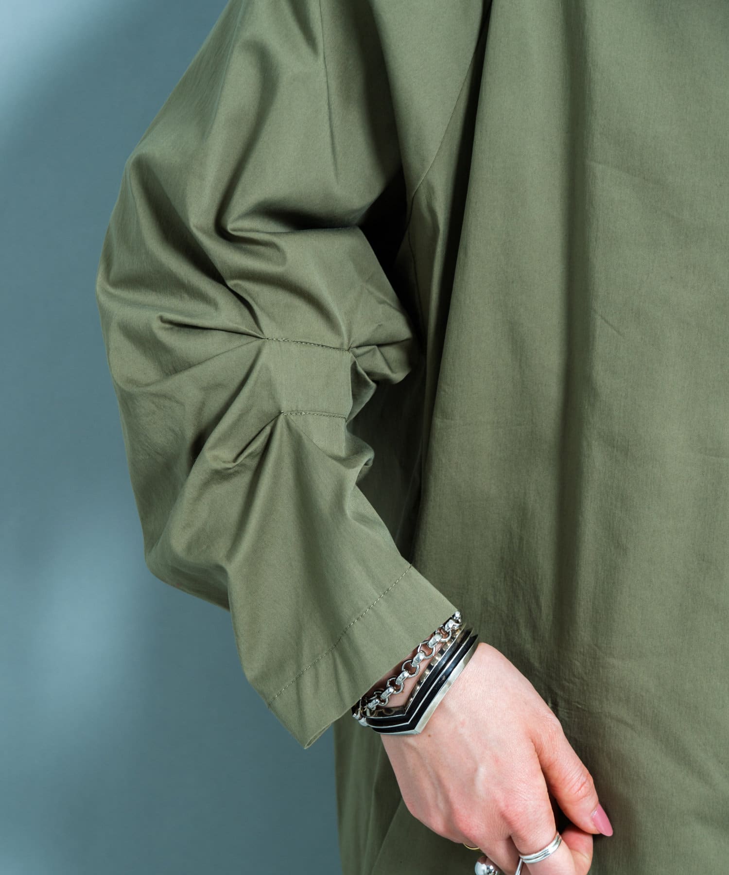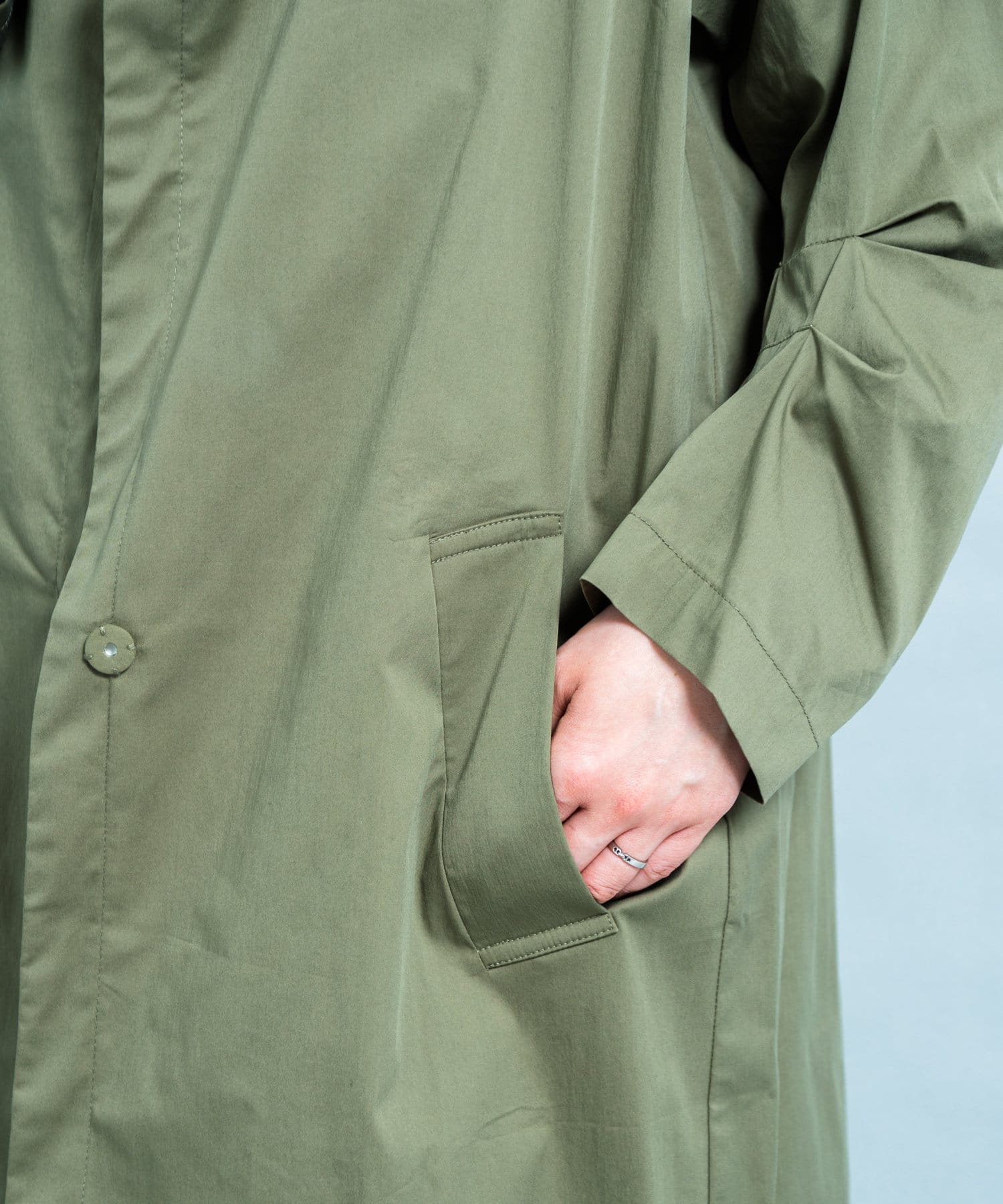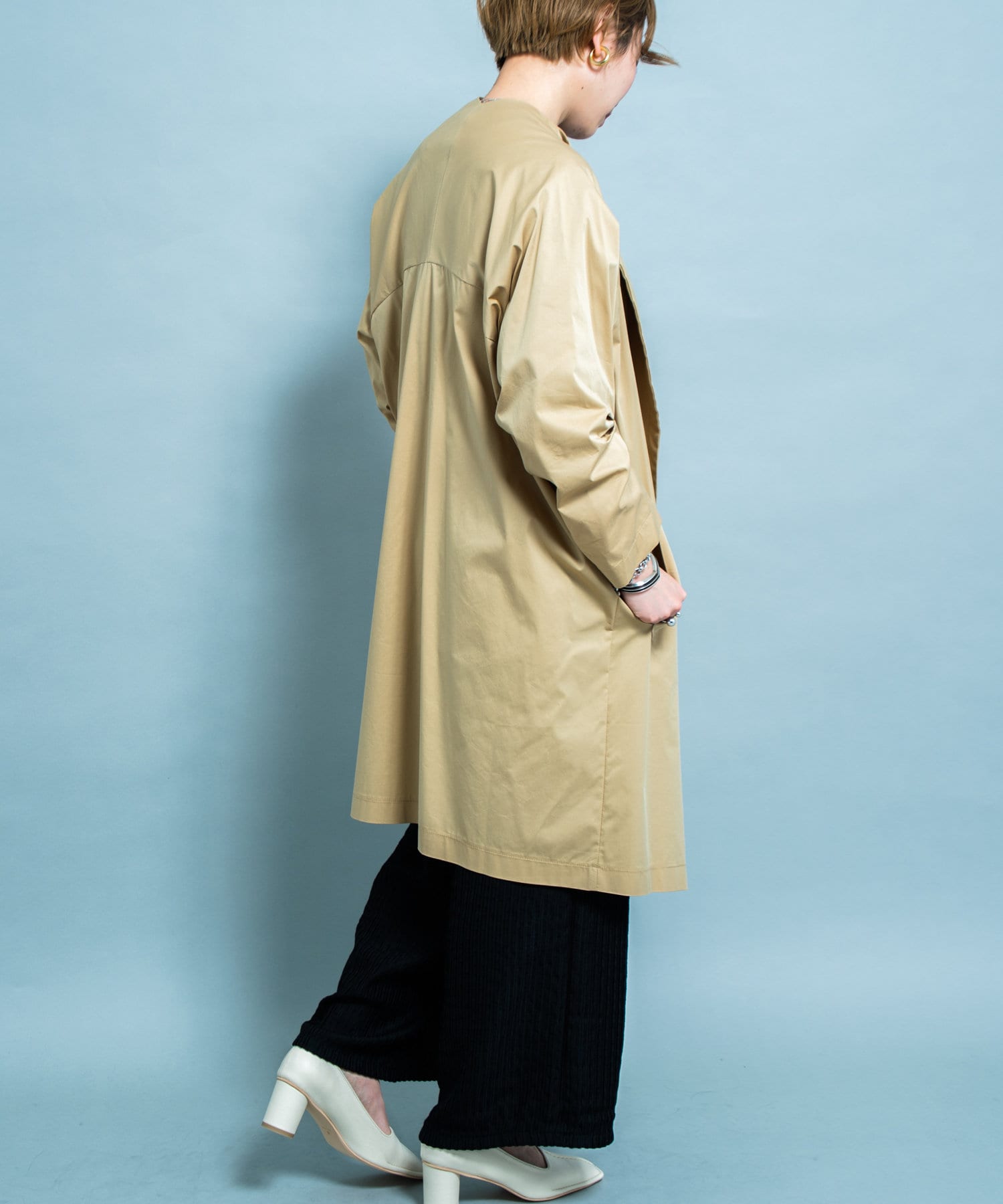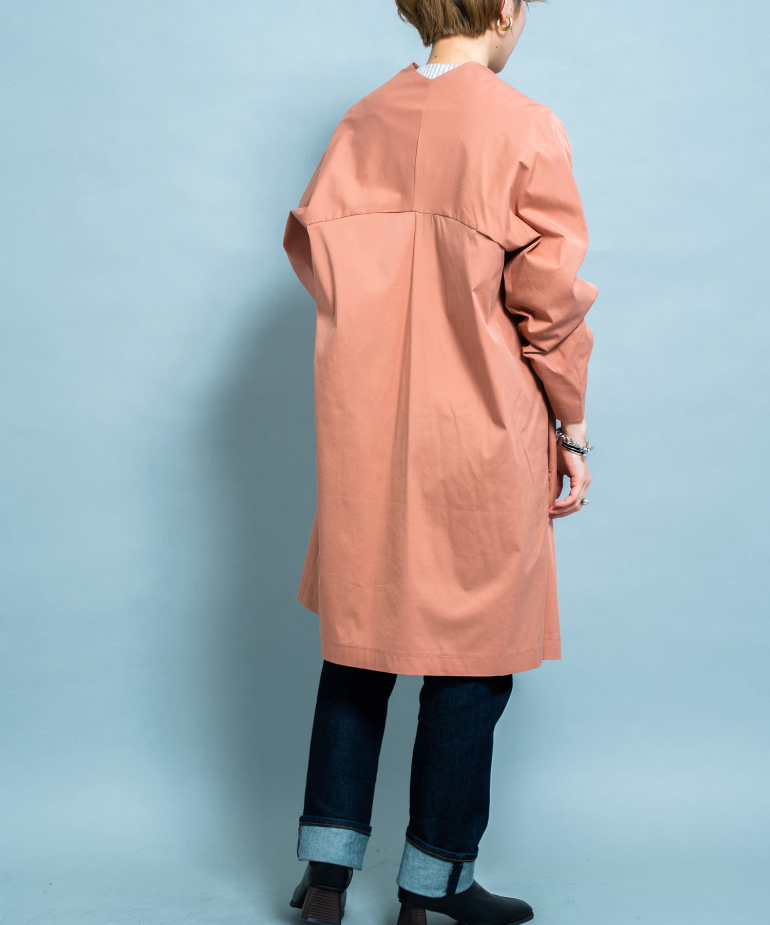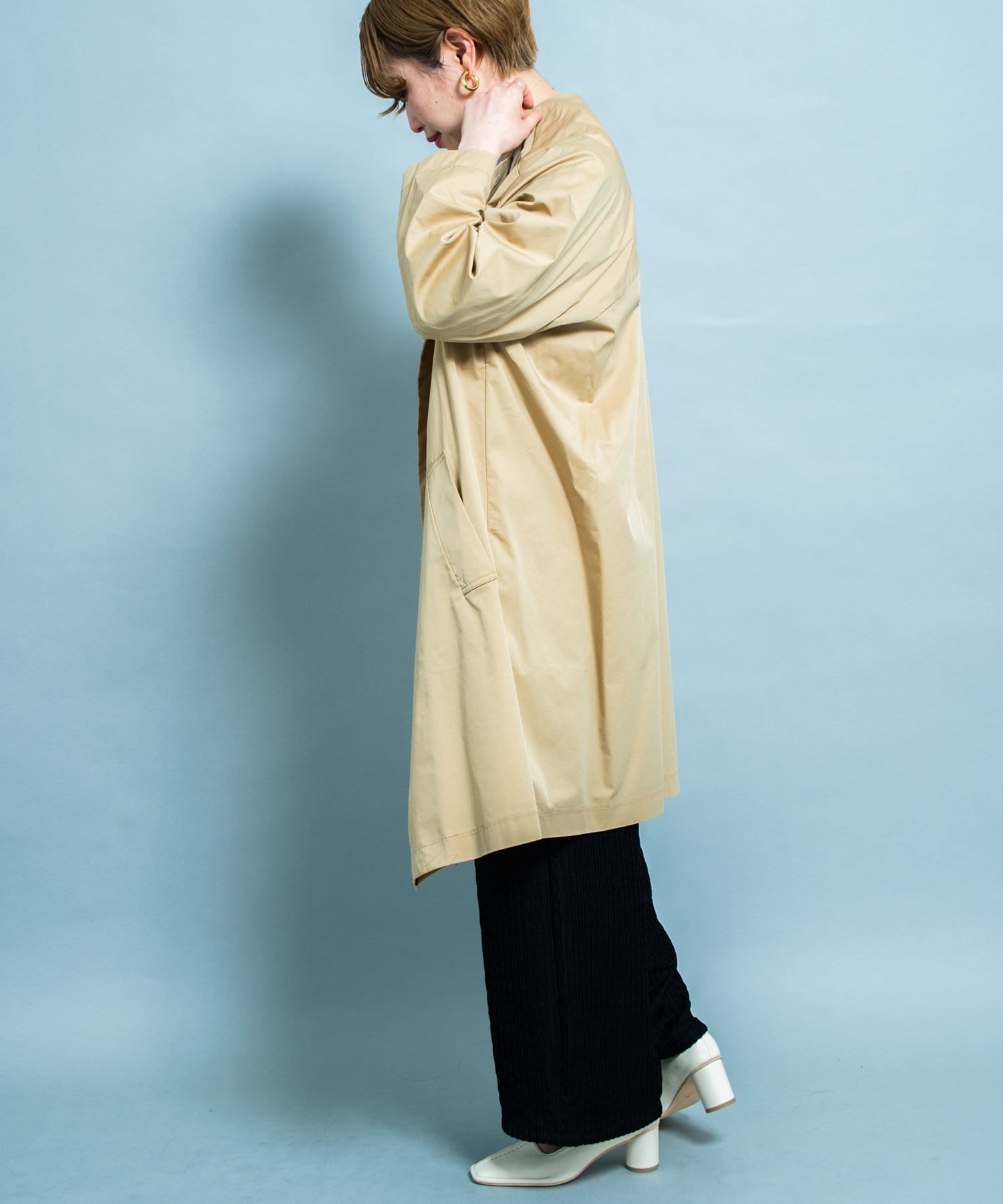 ややオーバーサイズなコートです。生地は薄手で春コートの位置づけになります。ざっくりと羽織れるので、ニットで合わせても着やすいサイズ感です。