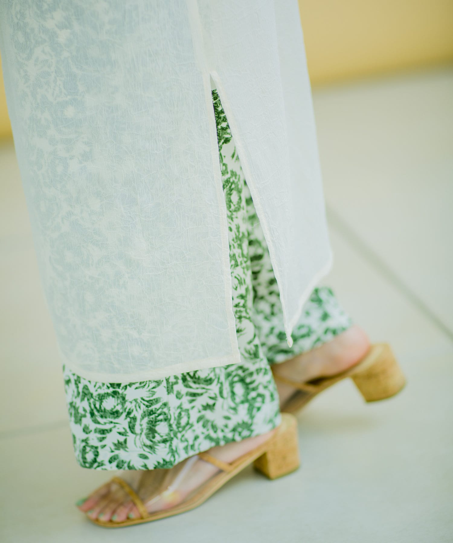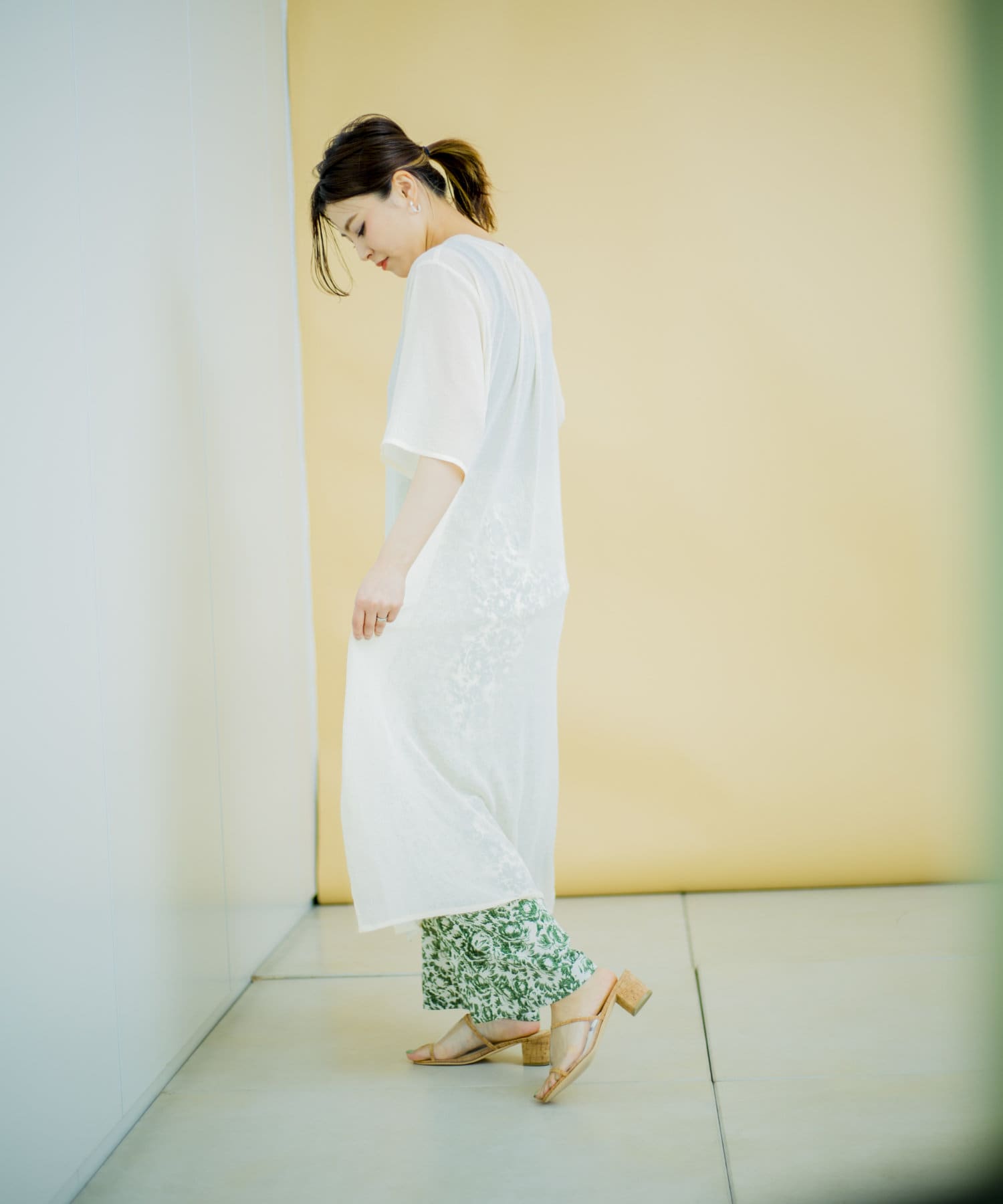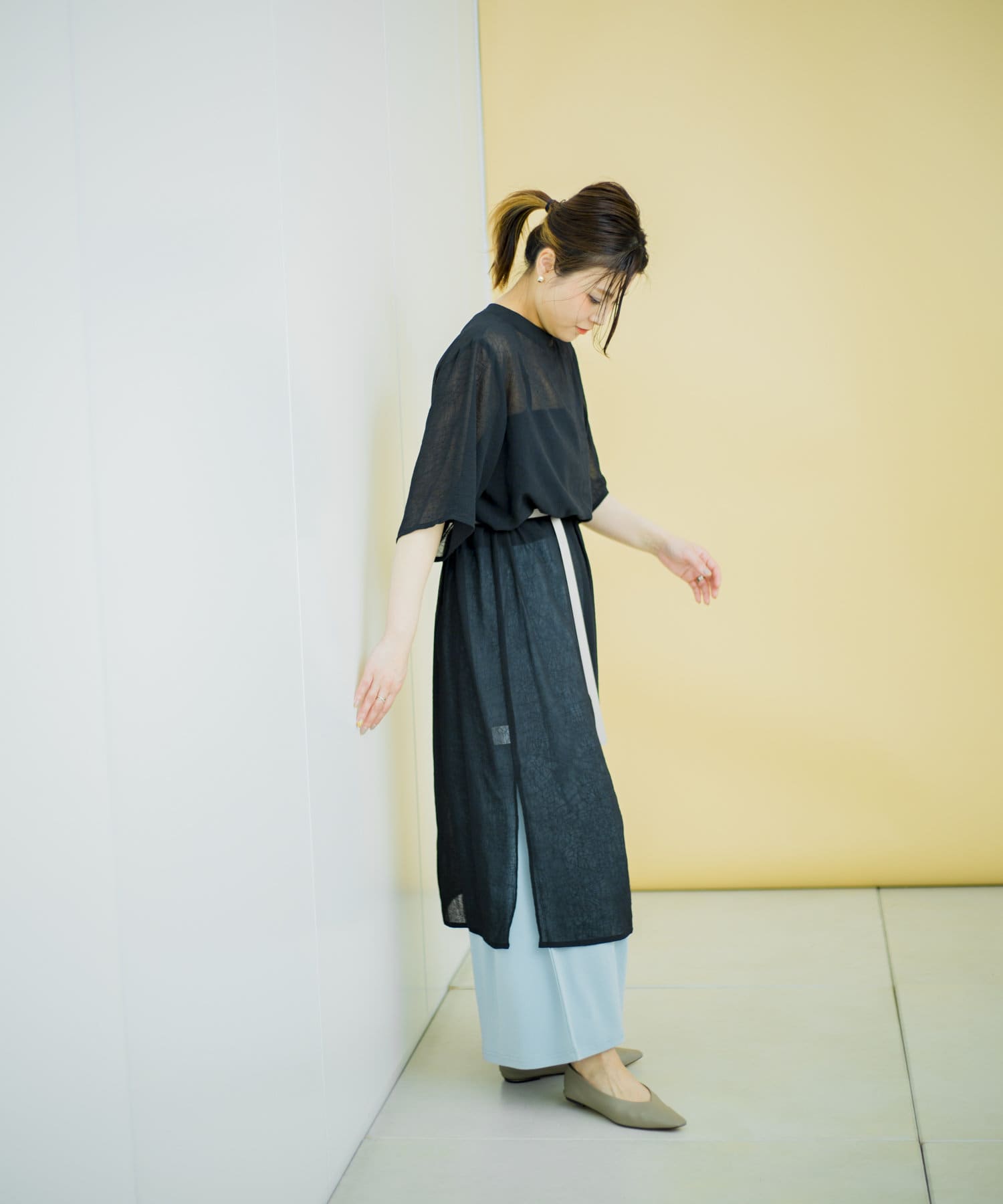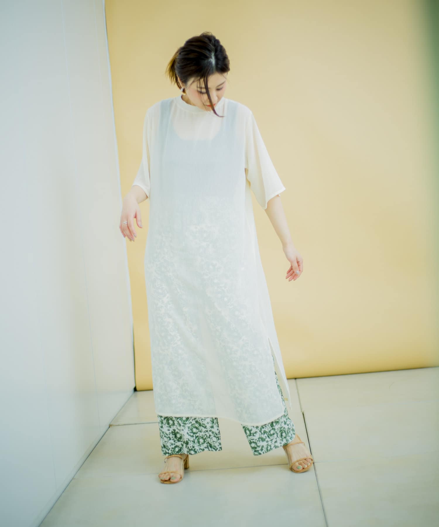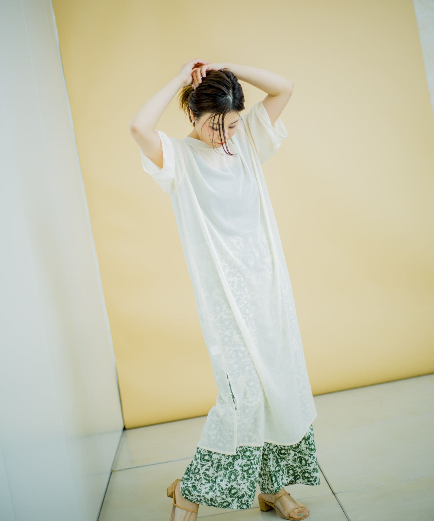 ・サイドにスリットがあり、しっかり透け感のある素材なのでレイヤードスタイルがオススメです。デニムでカジュアルダウンも可愛いですが、オススメはPGD1011102A0003単色フラワーイージーパンツです。柄がうっすら透ける程度なので末間のある無地と柄物のコントラストが綺麗に映えます。