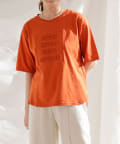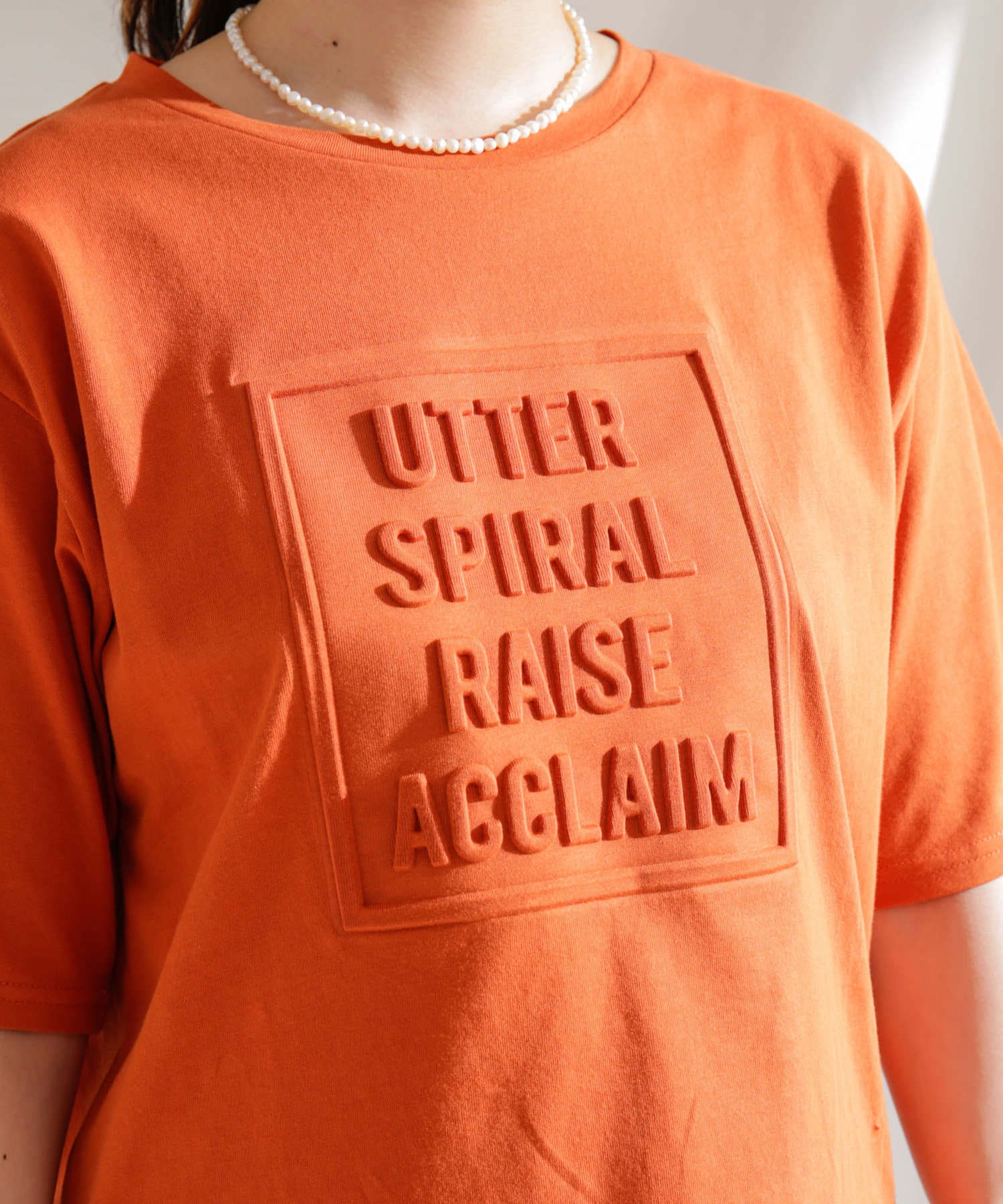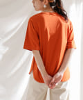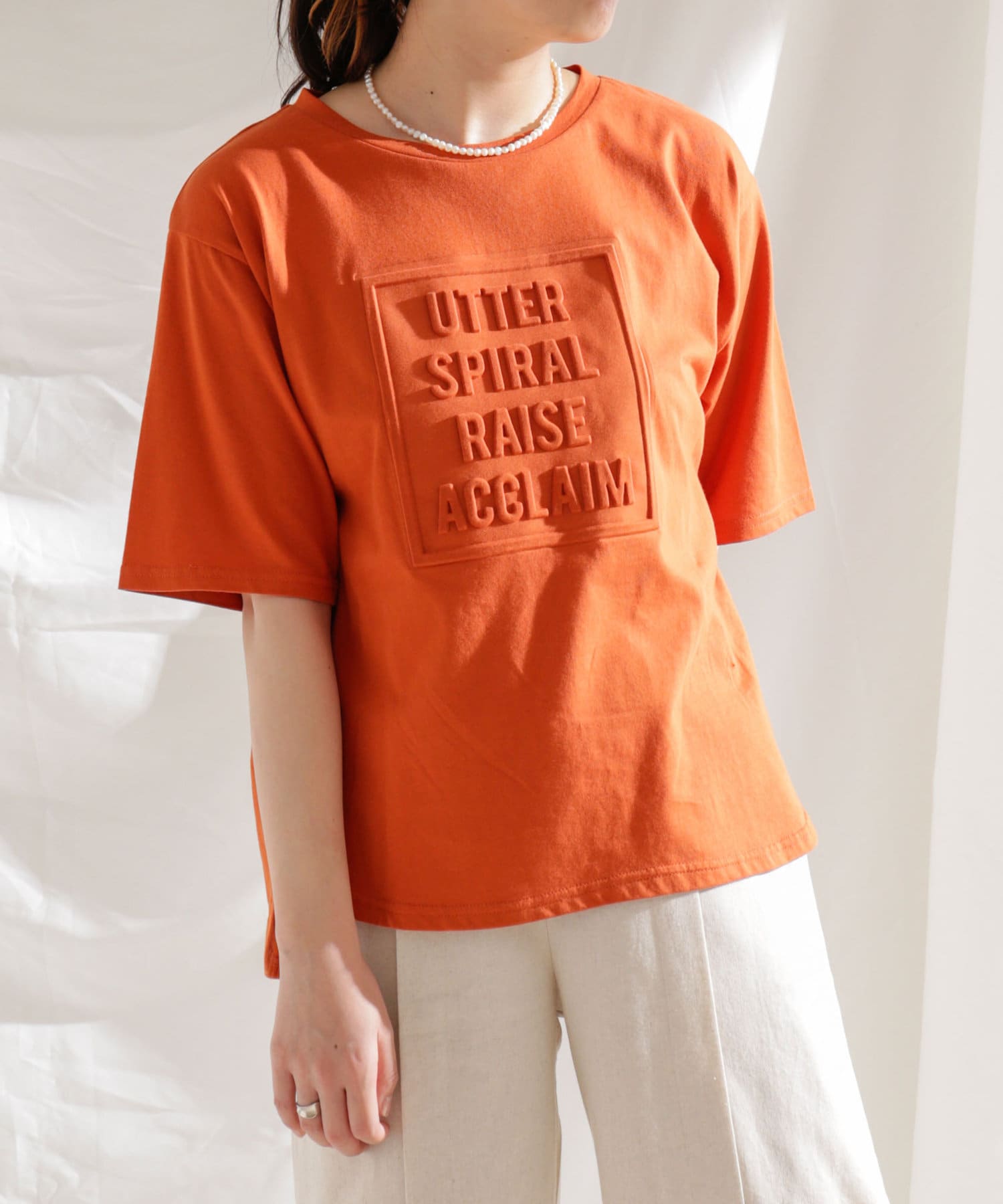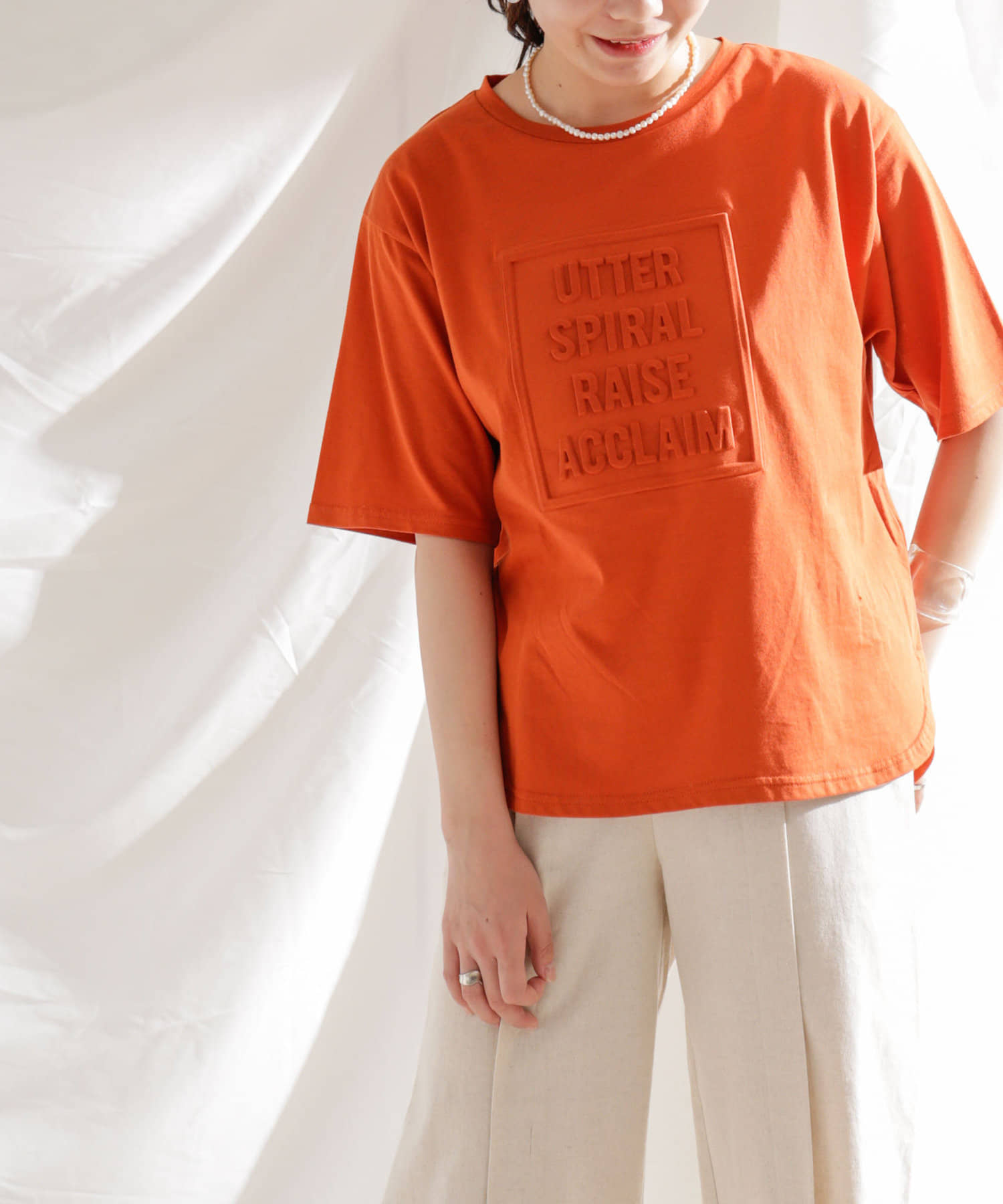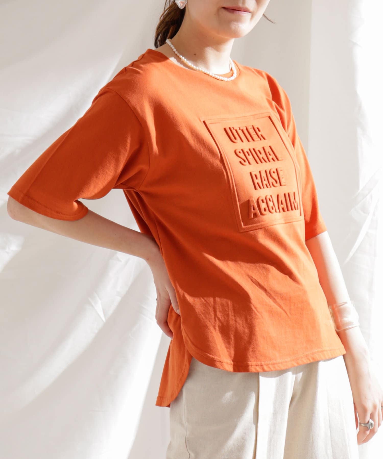 ・ロゴ・半袖Tシャツ・エンボスロゴ・スリット・オレンジ・くすみカラー・カジュアル・大人カジュアル・秋服・シンプル