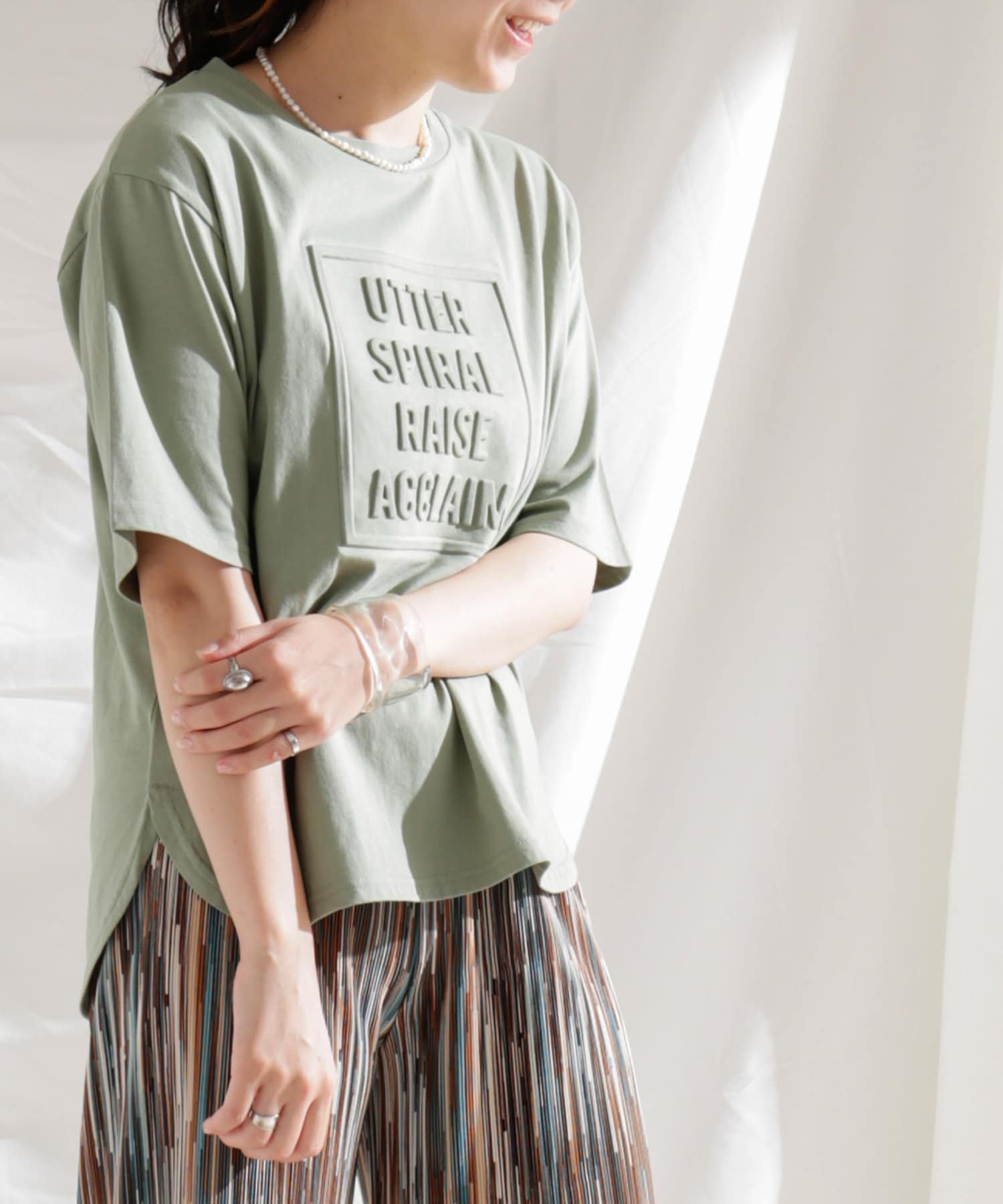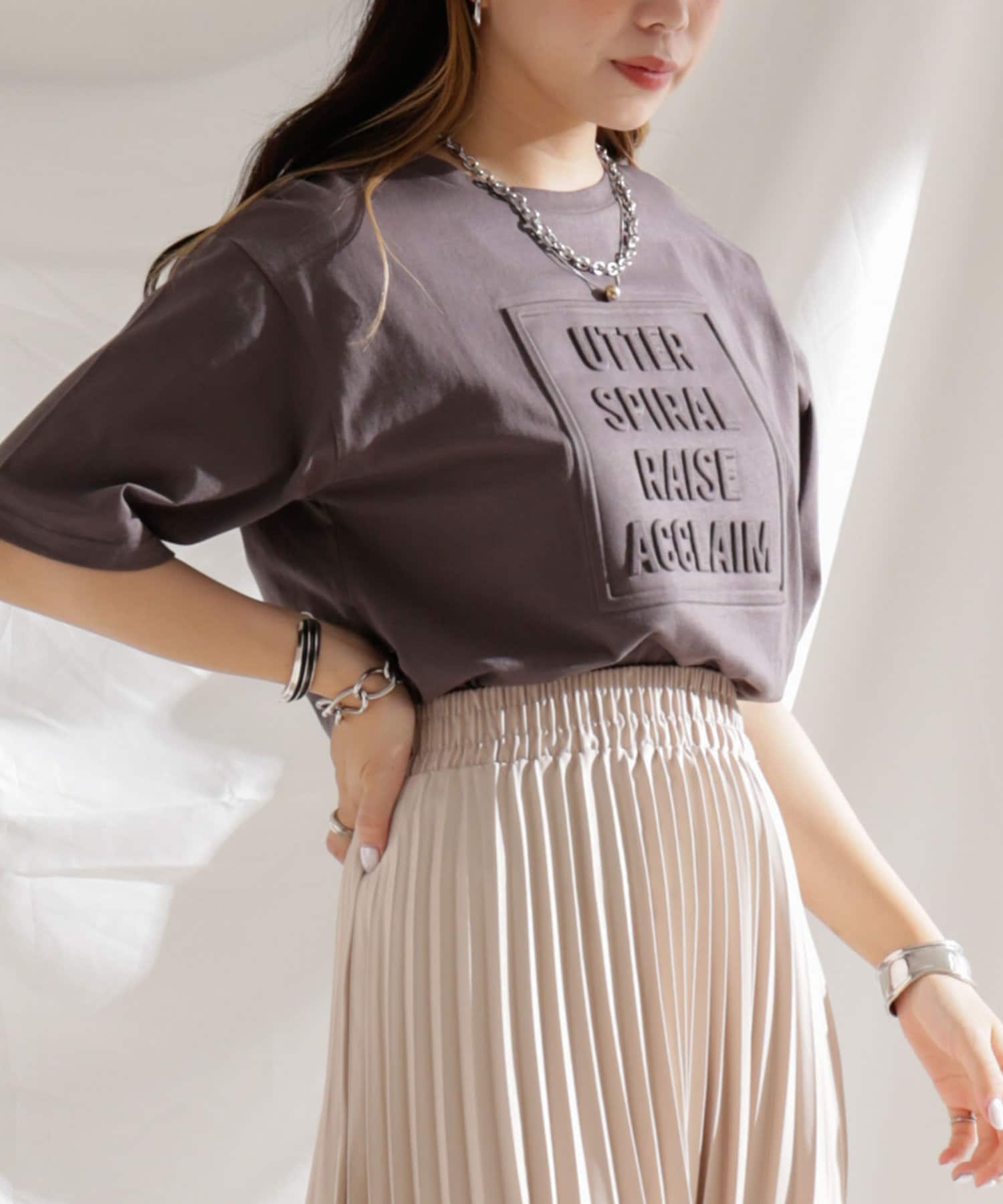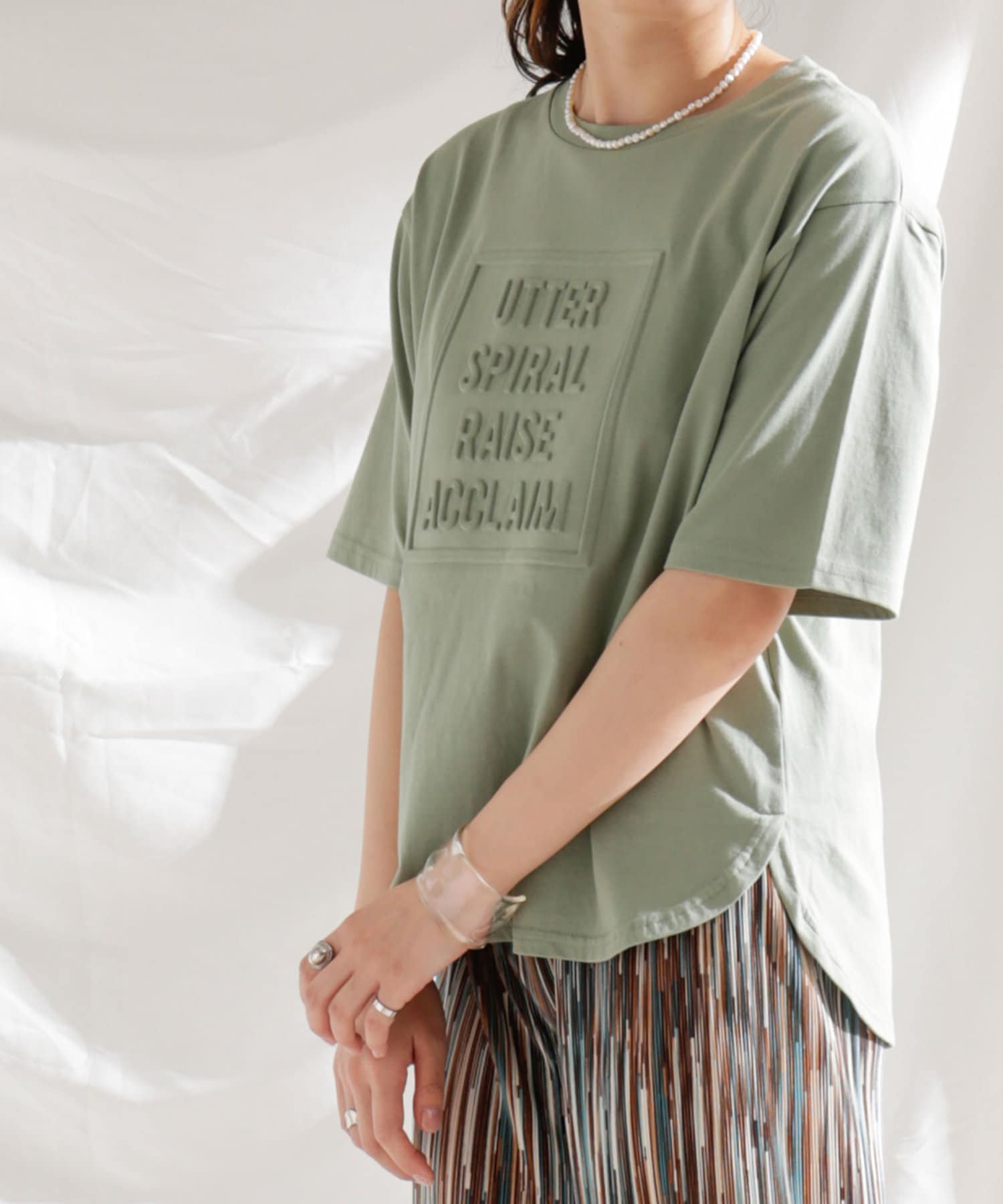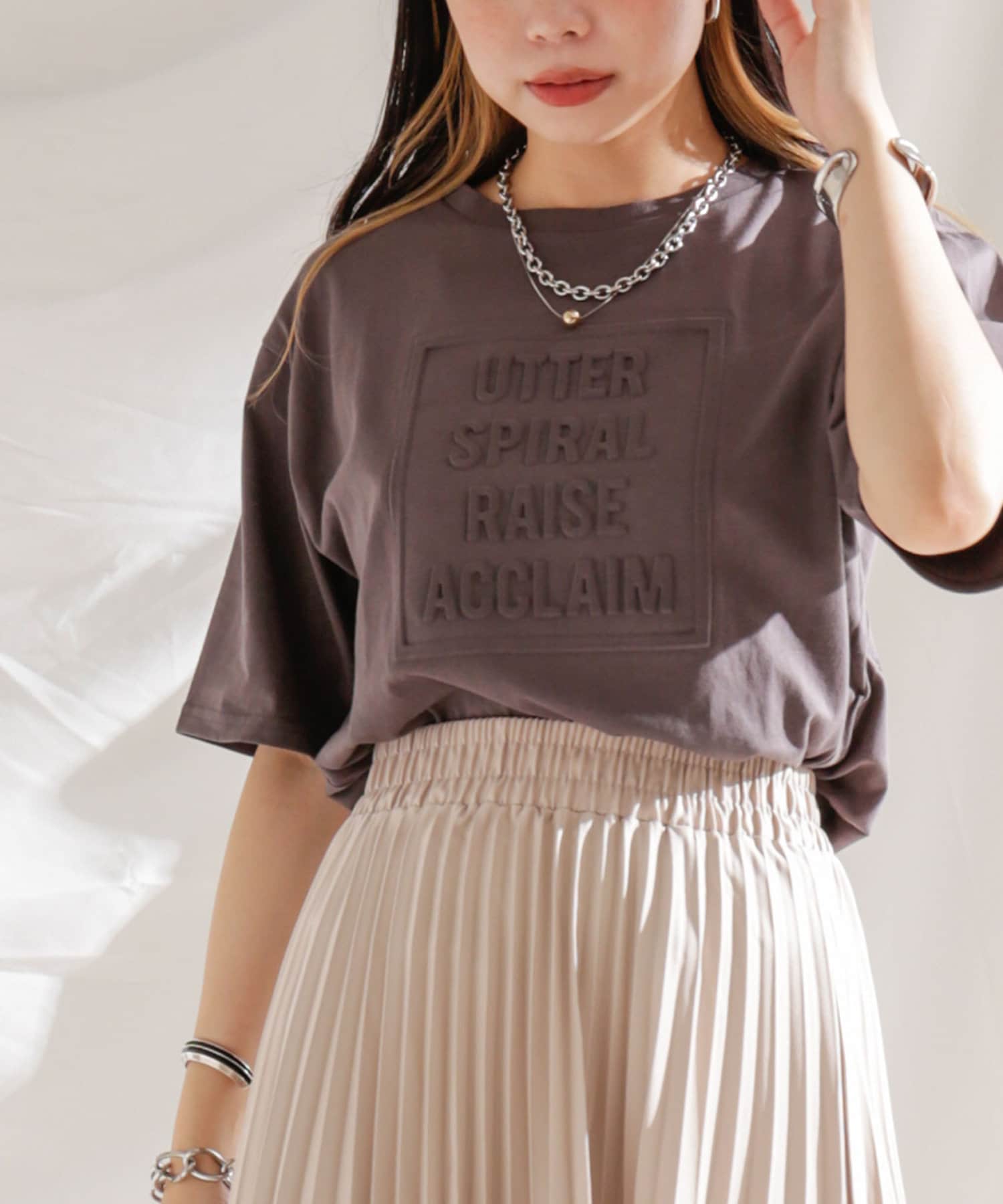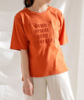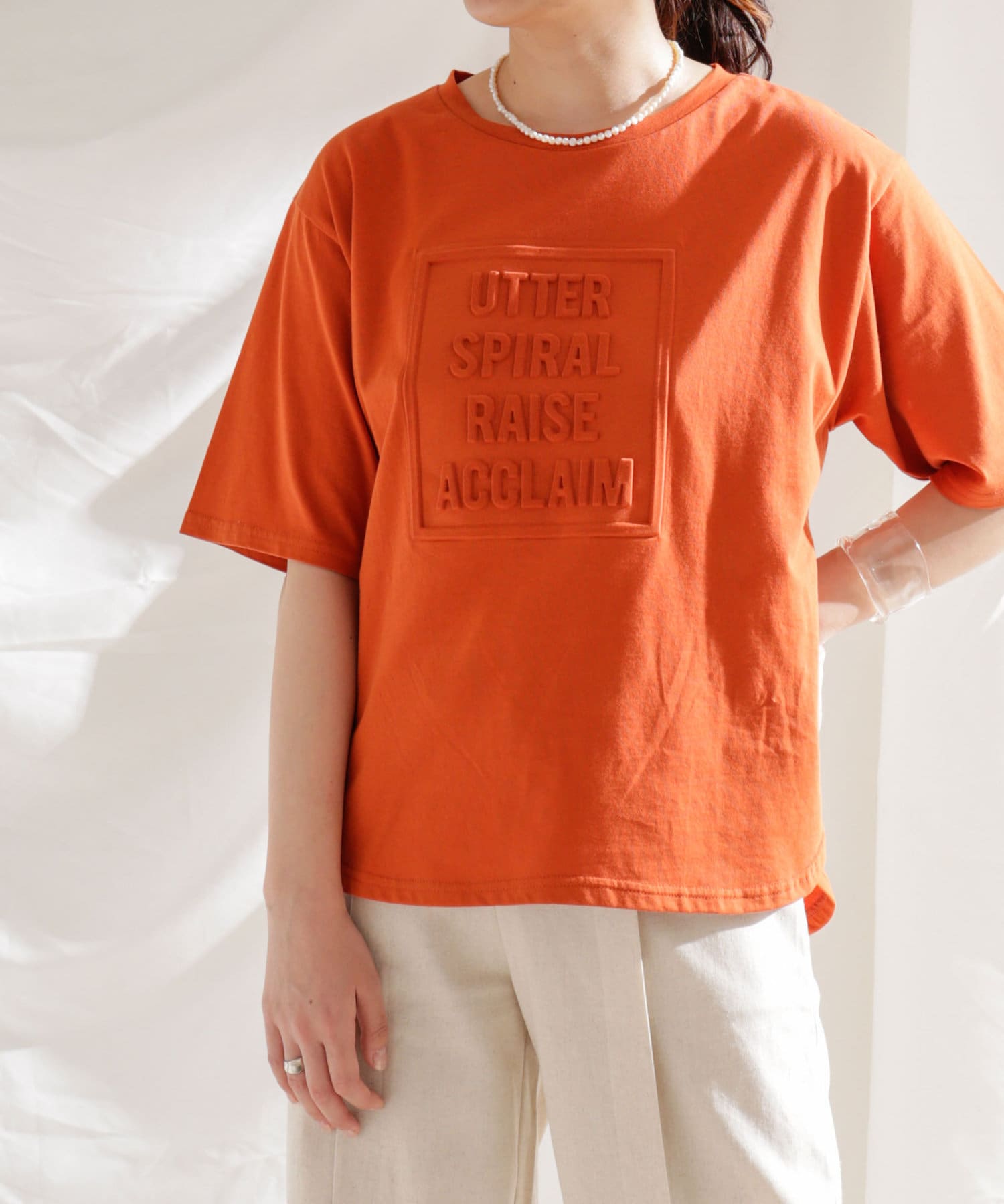 ・ロゴ・半袖Tシャツ・エンボスロゴ・スリット・オレンジ・くすみカラー・カジュアル・大人カジュアル・秋服・シンプル