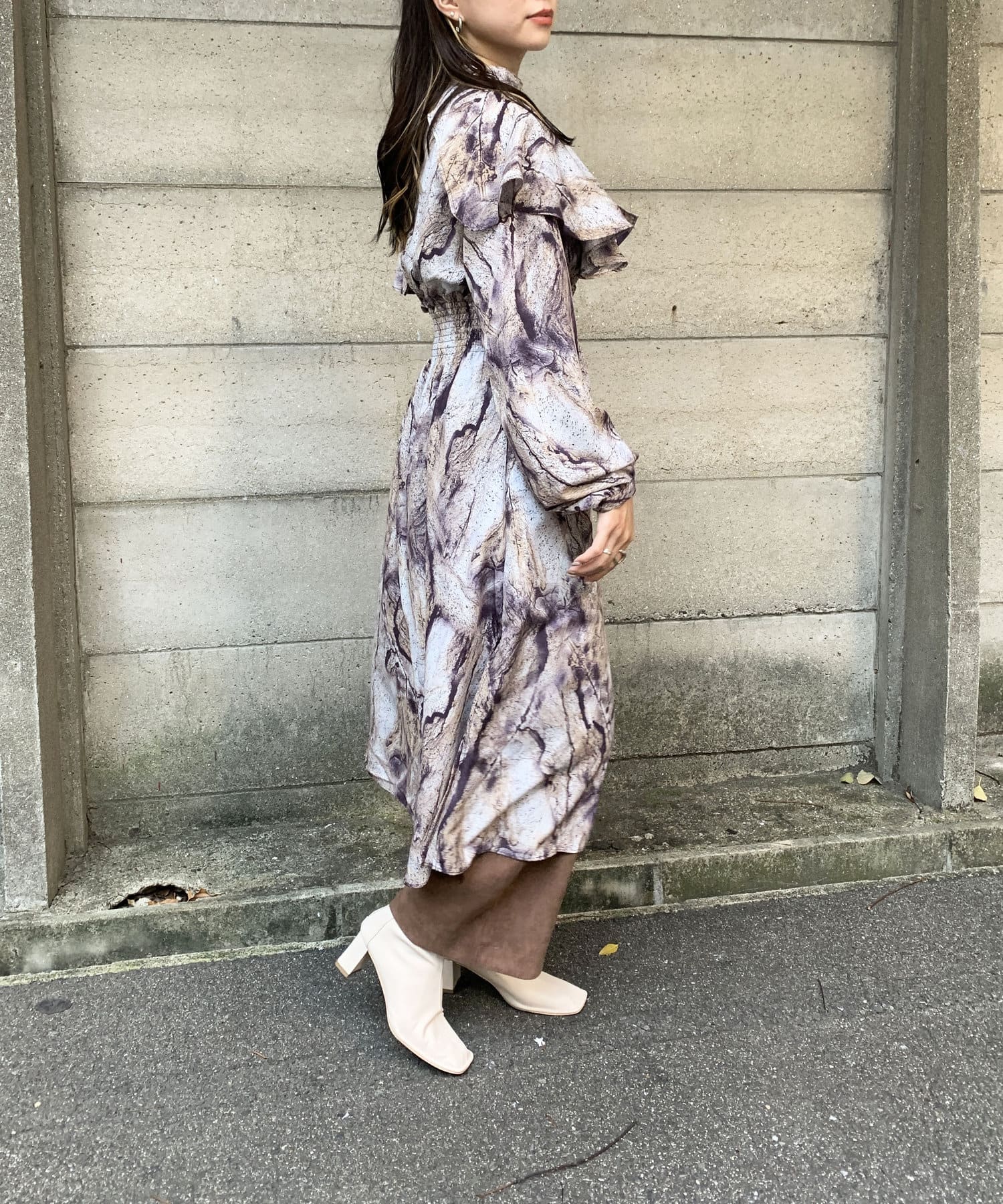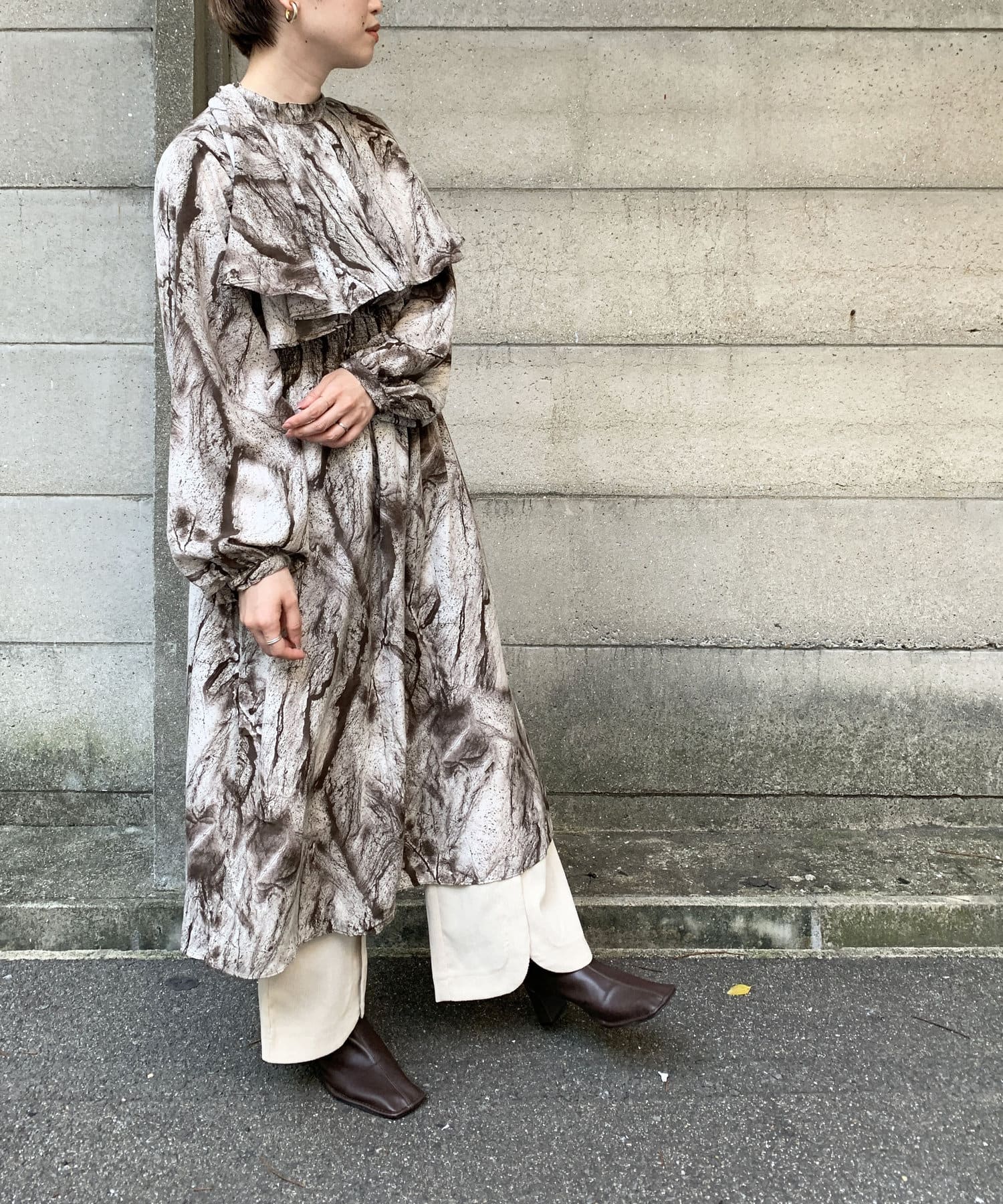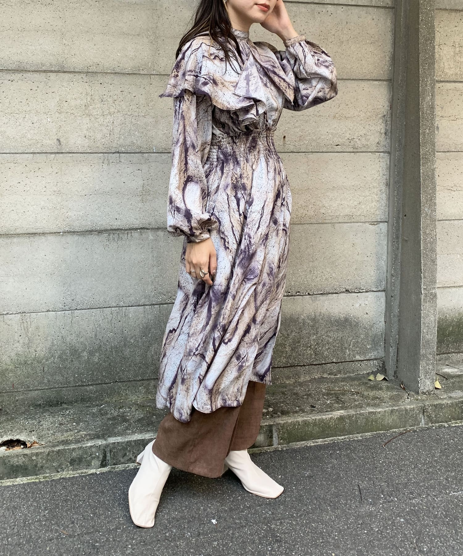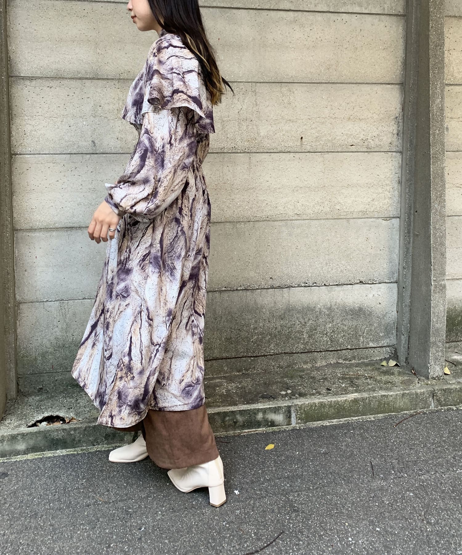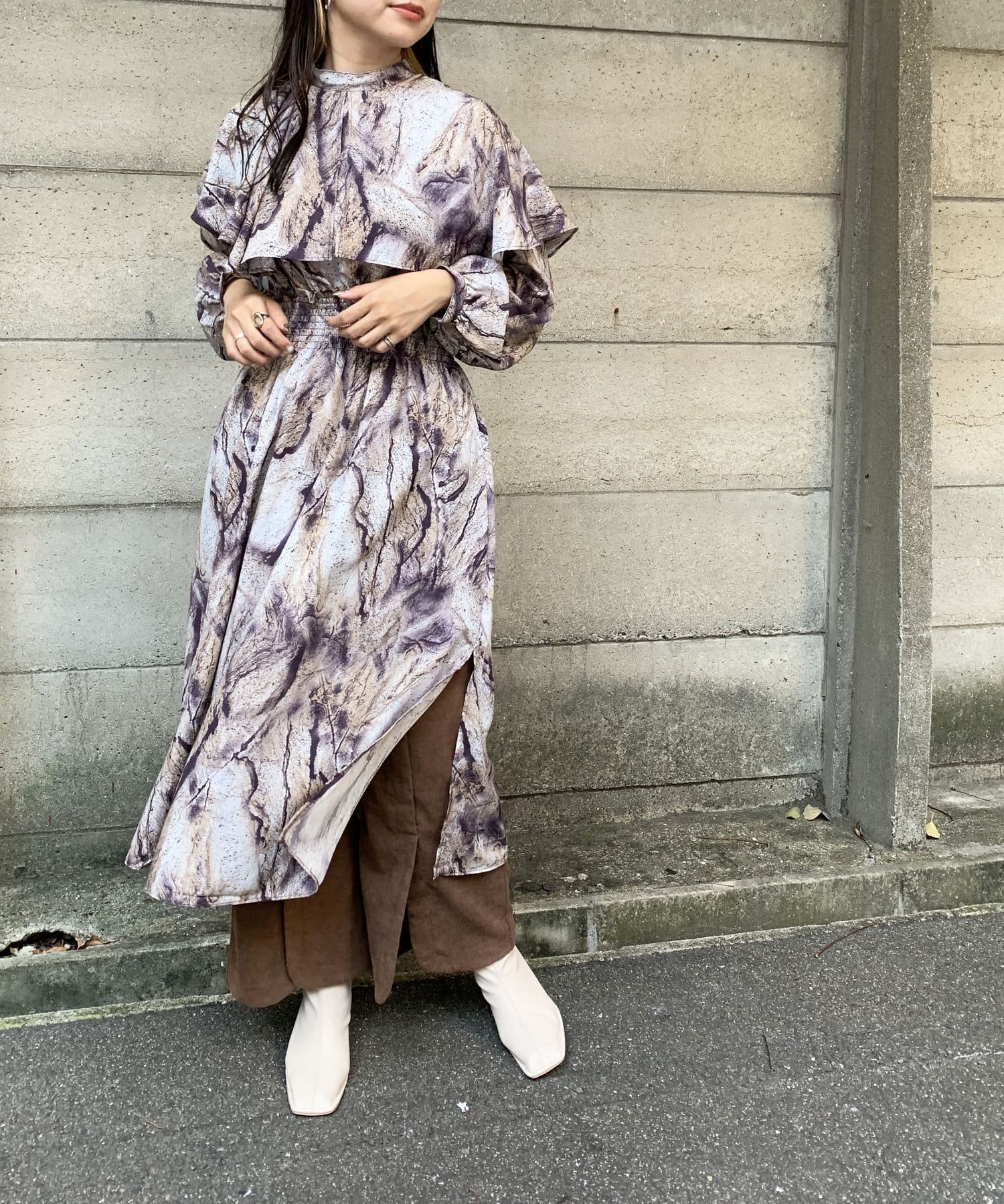 ・ケープ襟・デザインワンピース・マーブルパターン・ロングワンピース・サイドスリット・スリット入り・ビッグシルエット・ビッグ衿・秋ワンピース・結婚式・二次会・オケージョン・#otona_saleop