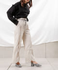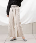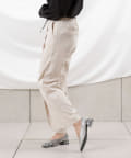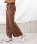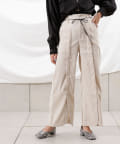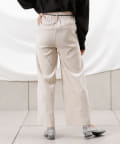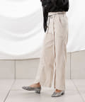 ワイドパンツですが、裾のスリットとタックがスッキリとした印象に見せてくれるので、トップスにカジュアルなスウェットやカットソーで合わせても大人っぽく着ていただけます。