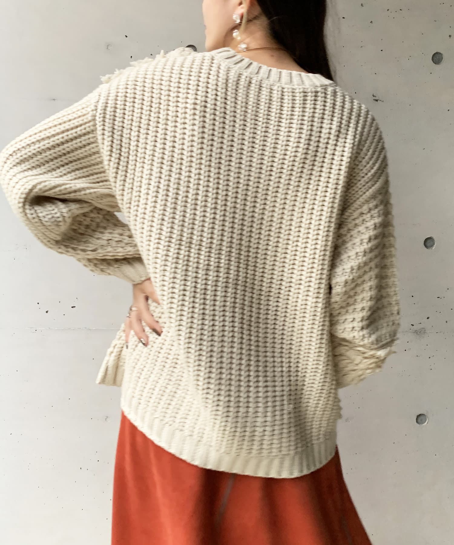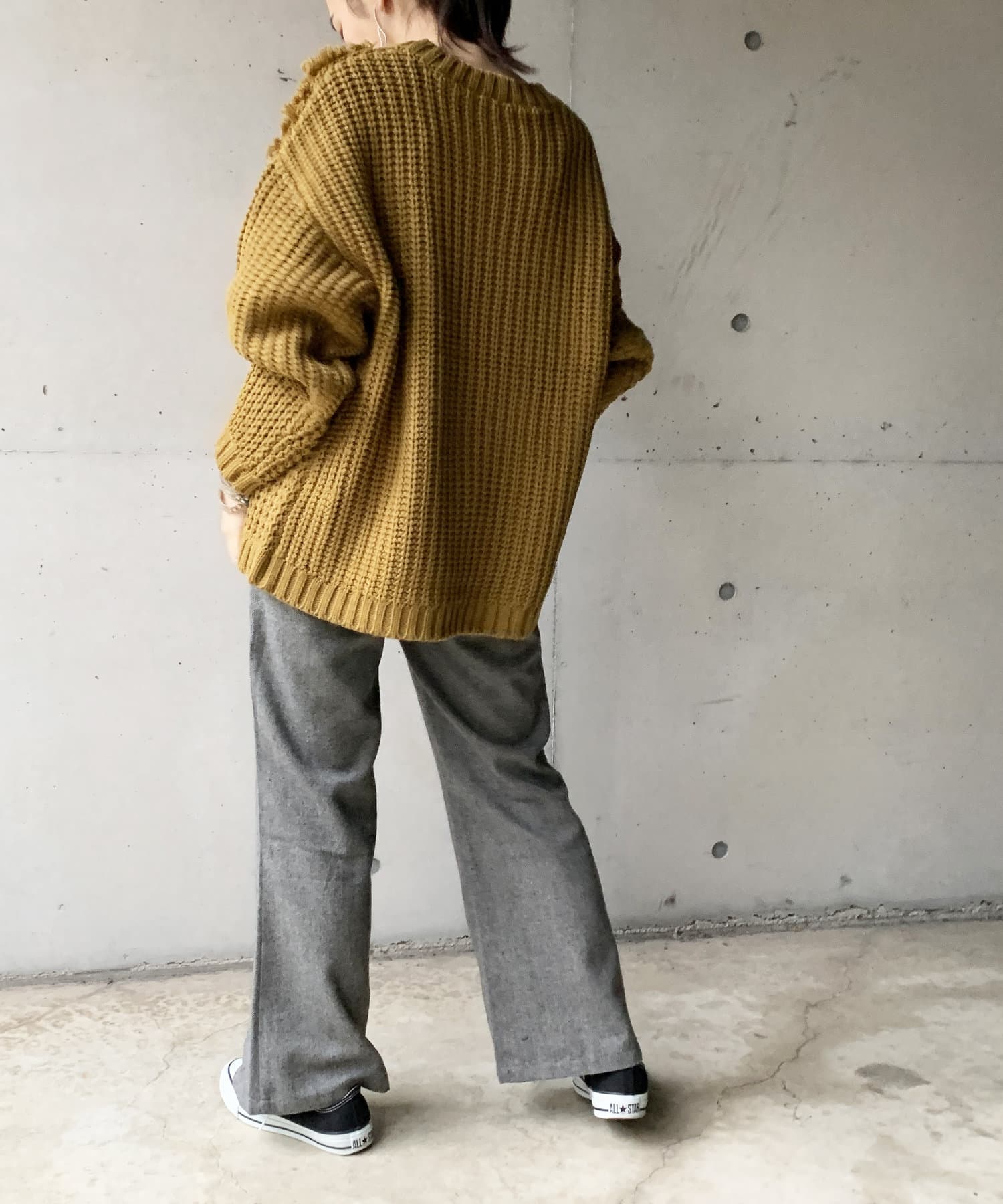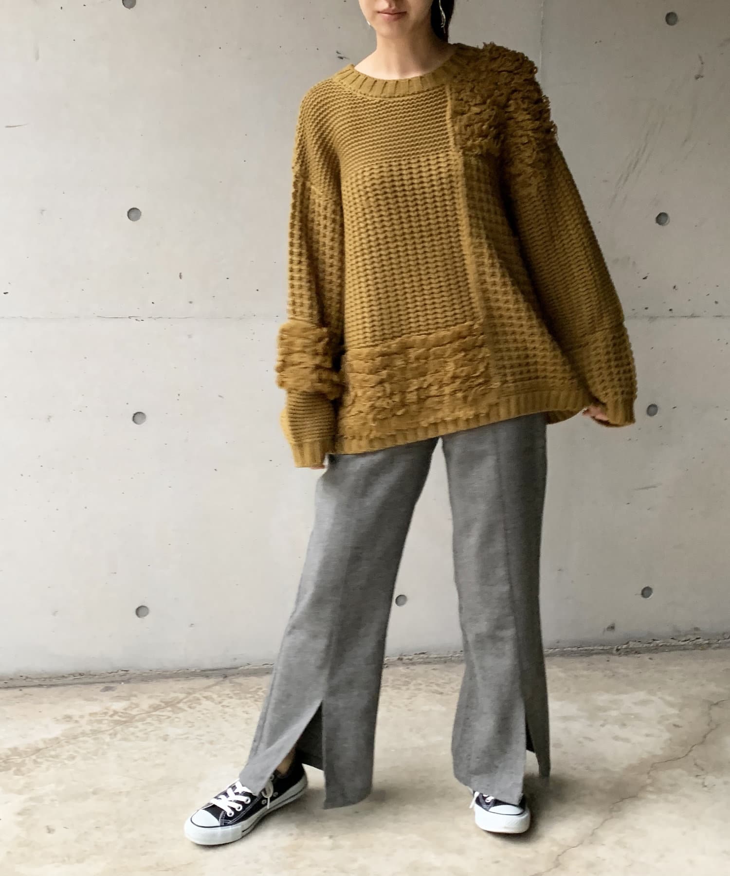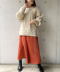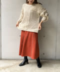 ・オーバーサイズのニットなので、ワイドパンツやロングスカートで合わせたルーズなコーディネートがオススメです。