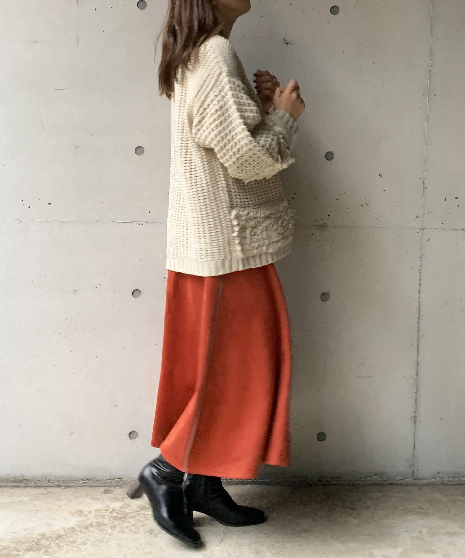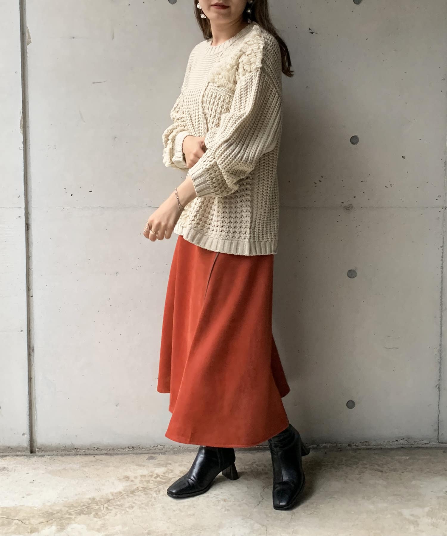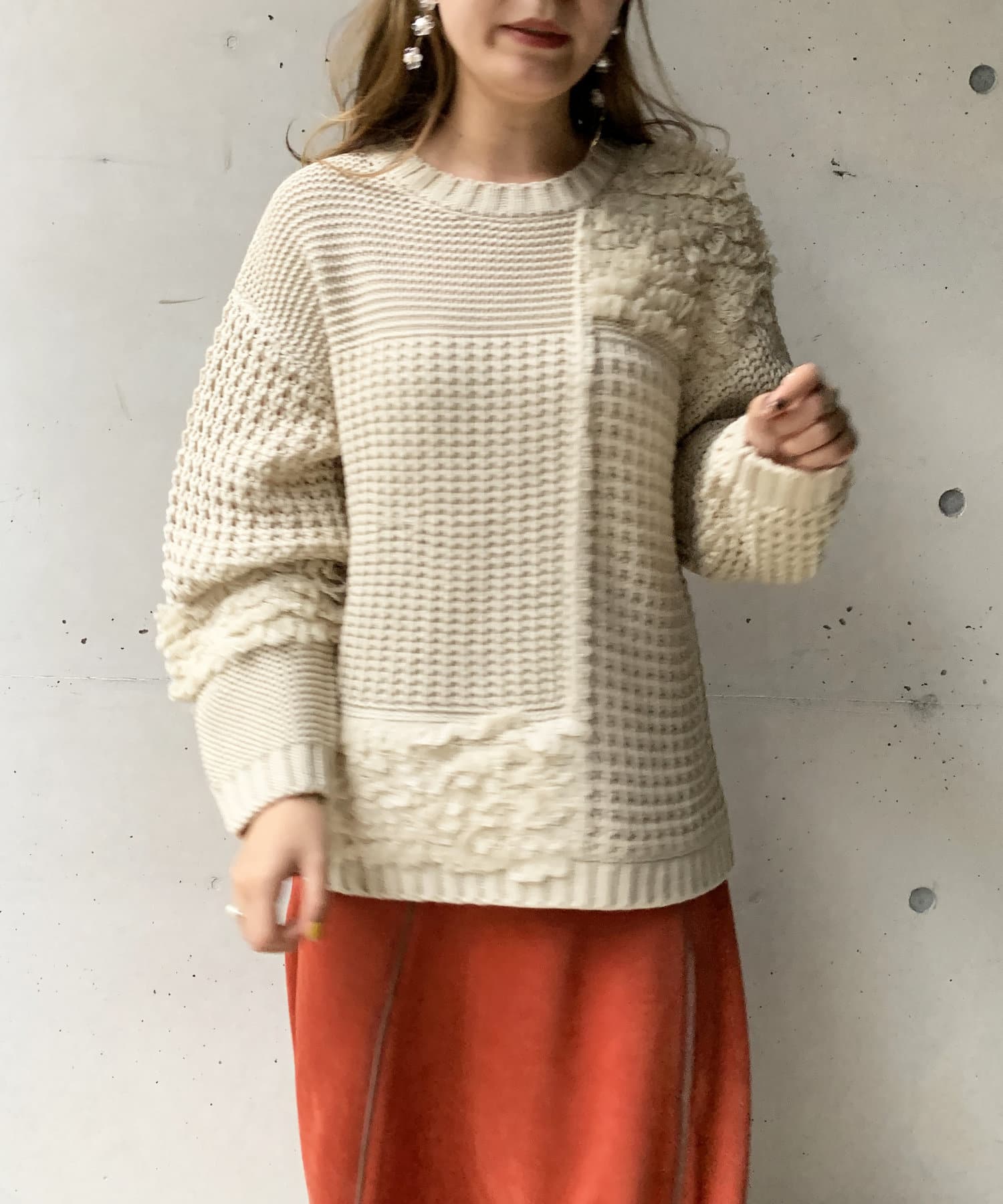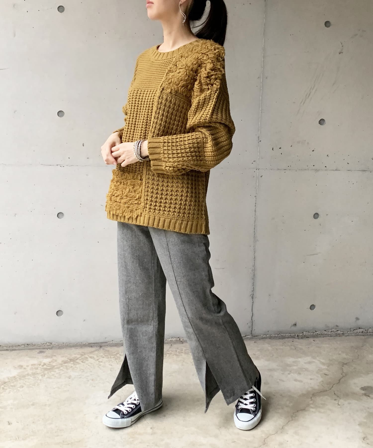 ・オーバーサイズのニットなので、ワイドパンツやロングスカートで合わせたルーズなコーディネートがオススメです。
