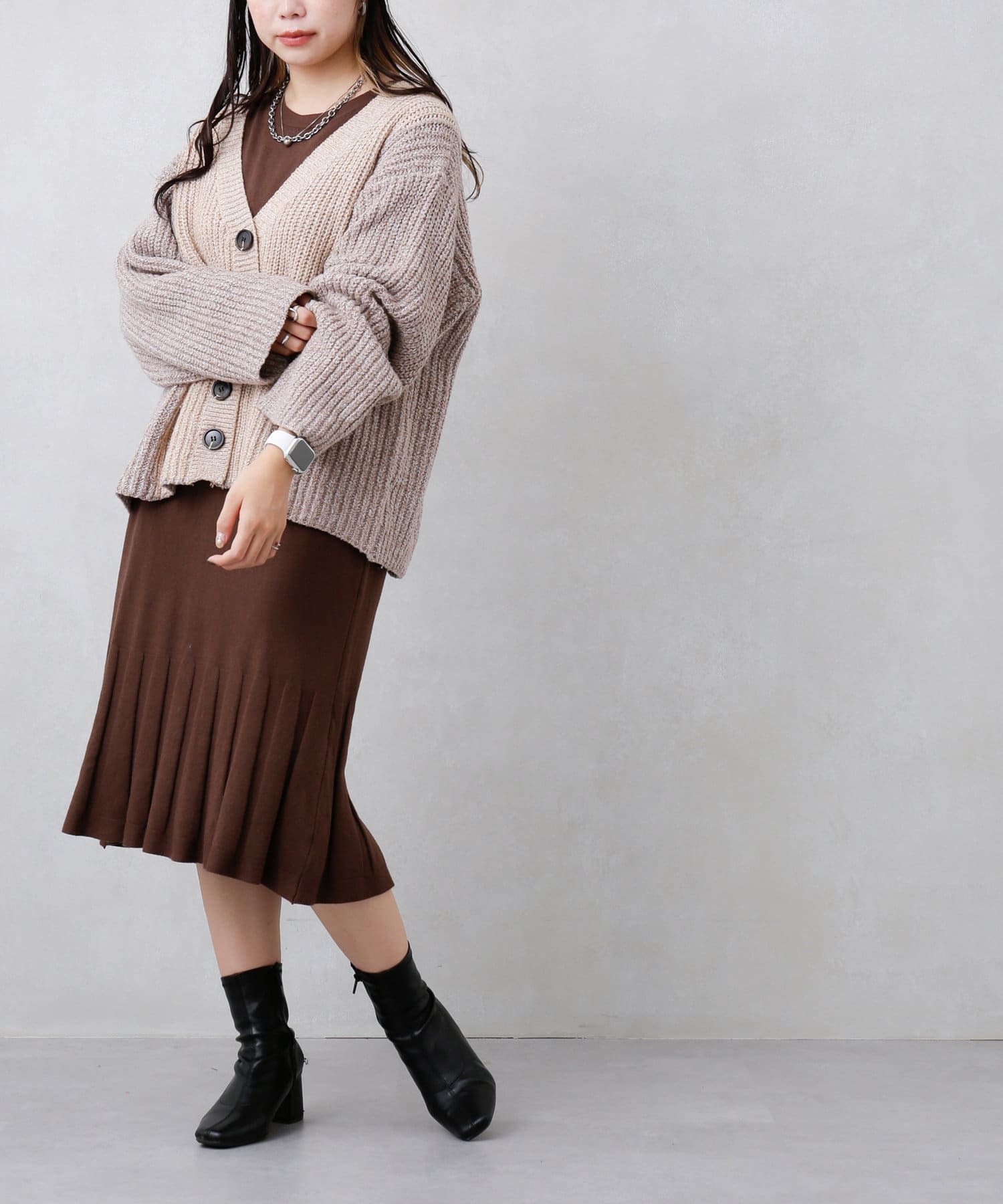 上からボリュームのあるカーディガンを羽織ったり、パンツと合わせたレイヤードコーディネートもオススメです。