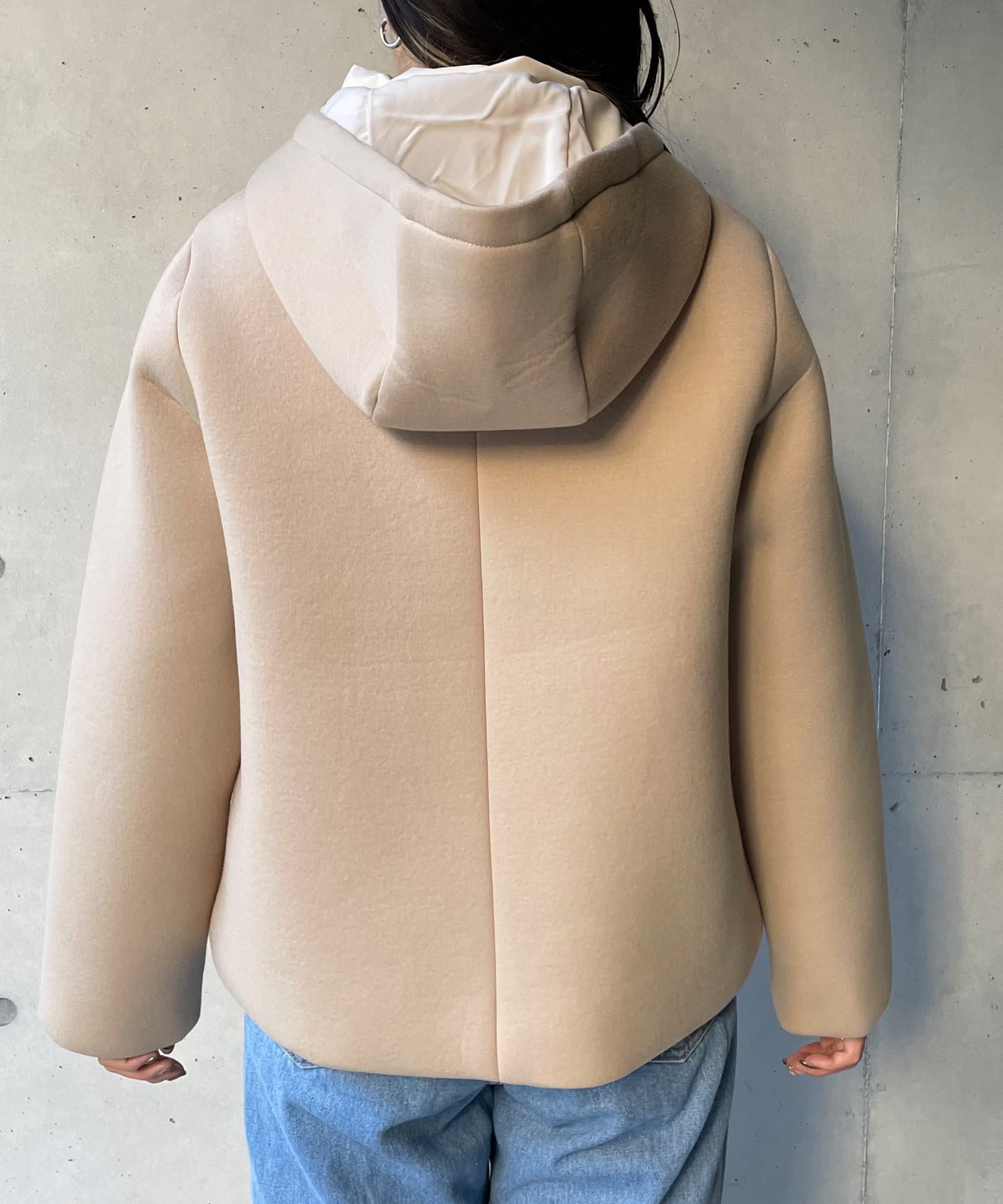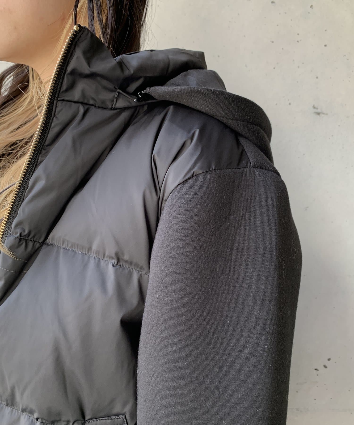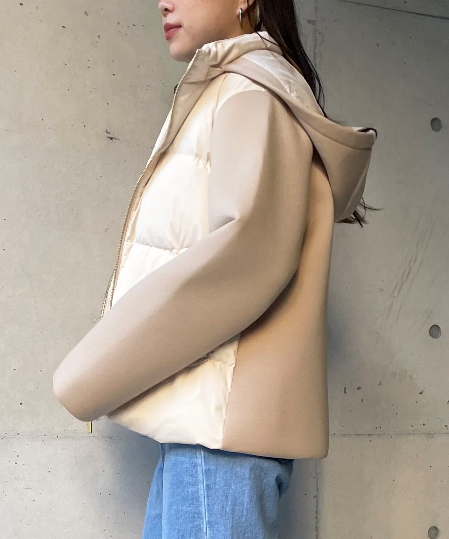 ・ダウンジャケット・ショート丈・フード脱着・ボンディング・切替デザイン・シンプルアウター・モノトーン・定番アウター・通勤着・通勤アウター
