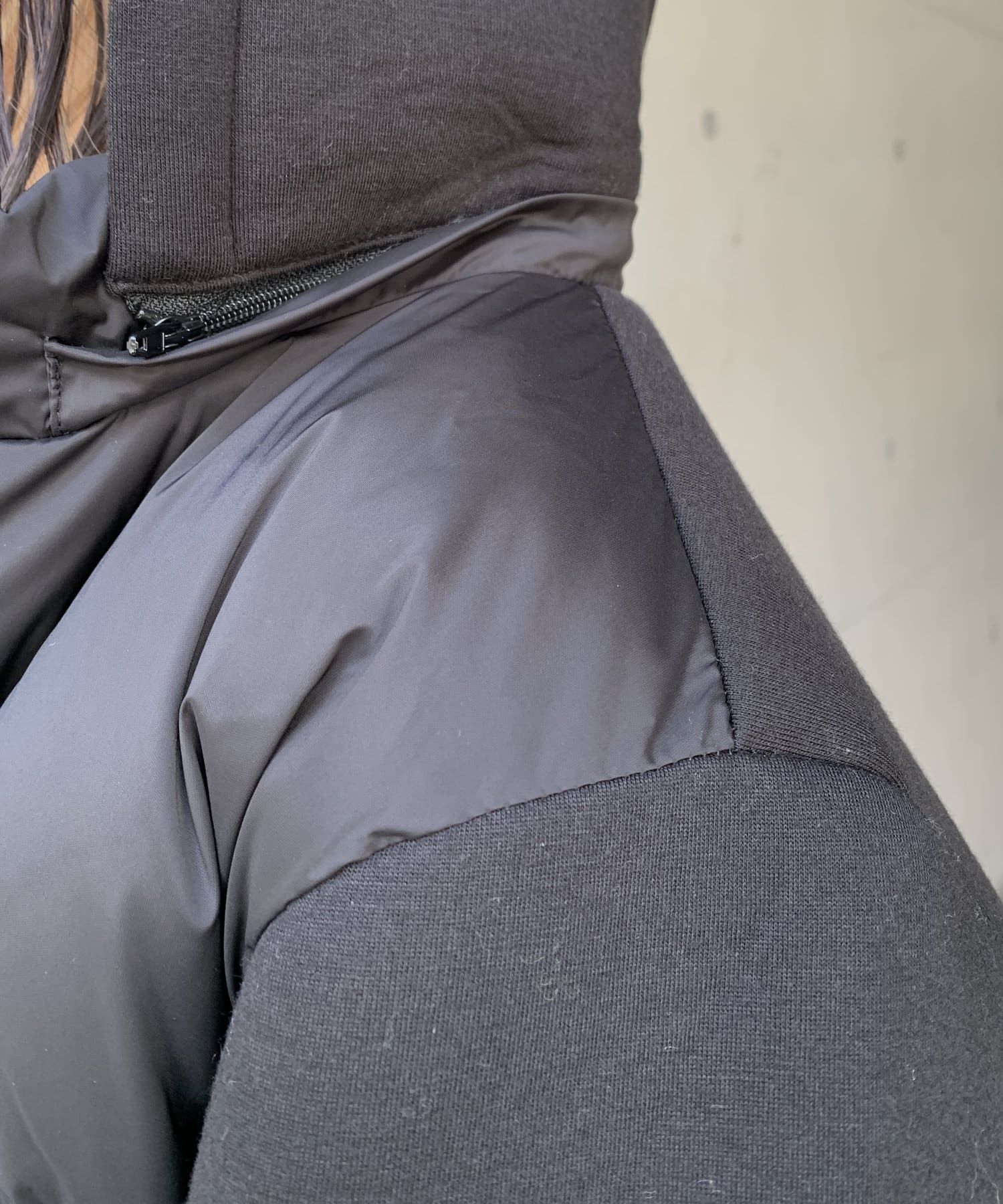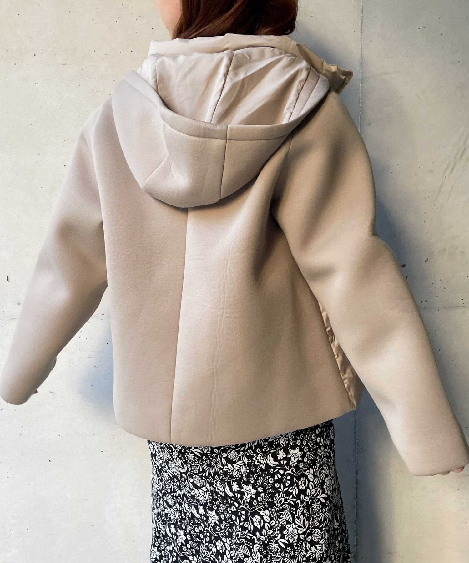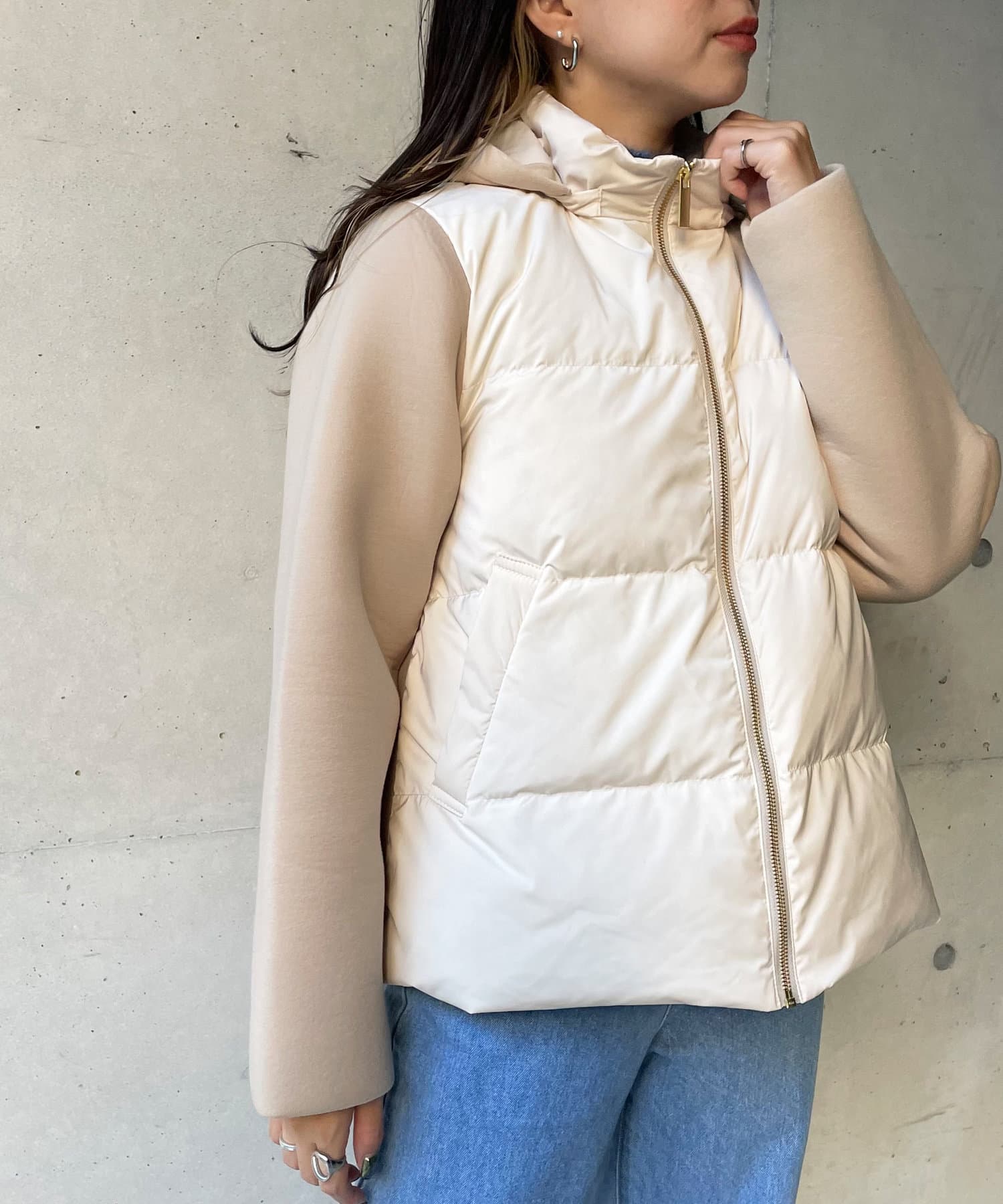 ・ダウンジャケット・ショート丈・フード脱着・ボンディング・切替デザイン・シンプルアウター・モノトーン・定番アウター・通勤着・通勤アウター