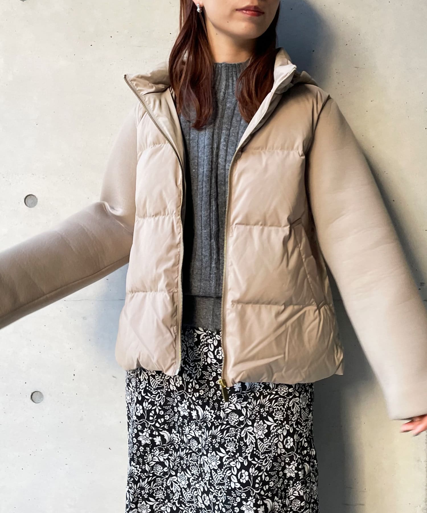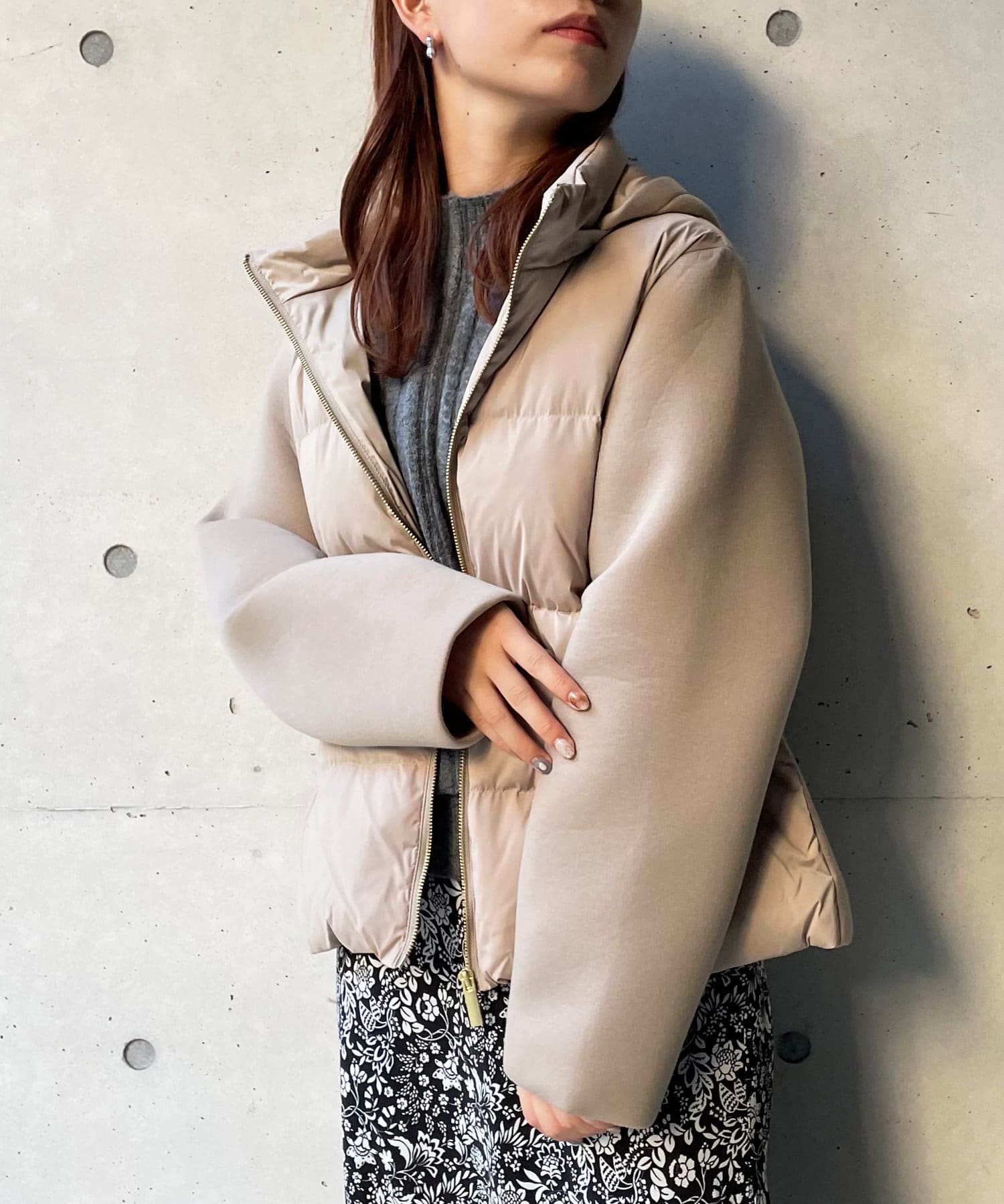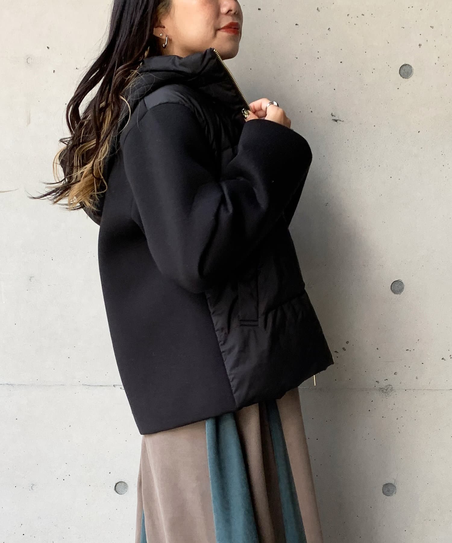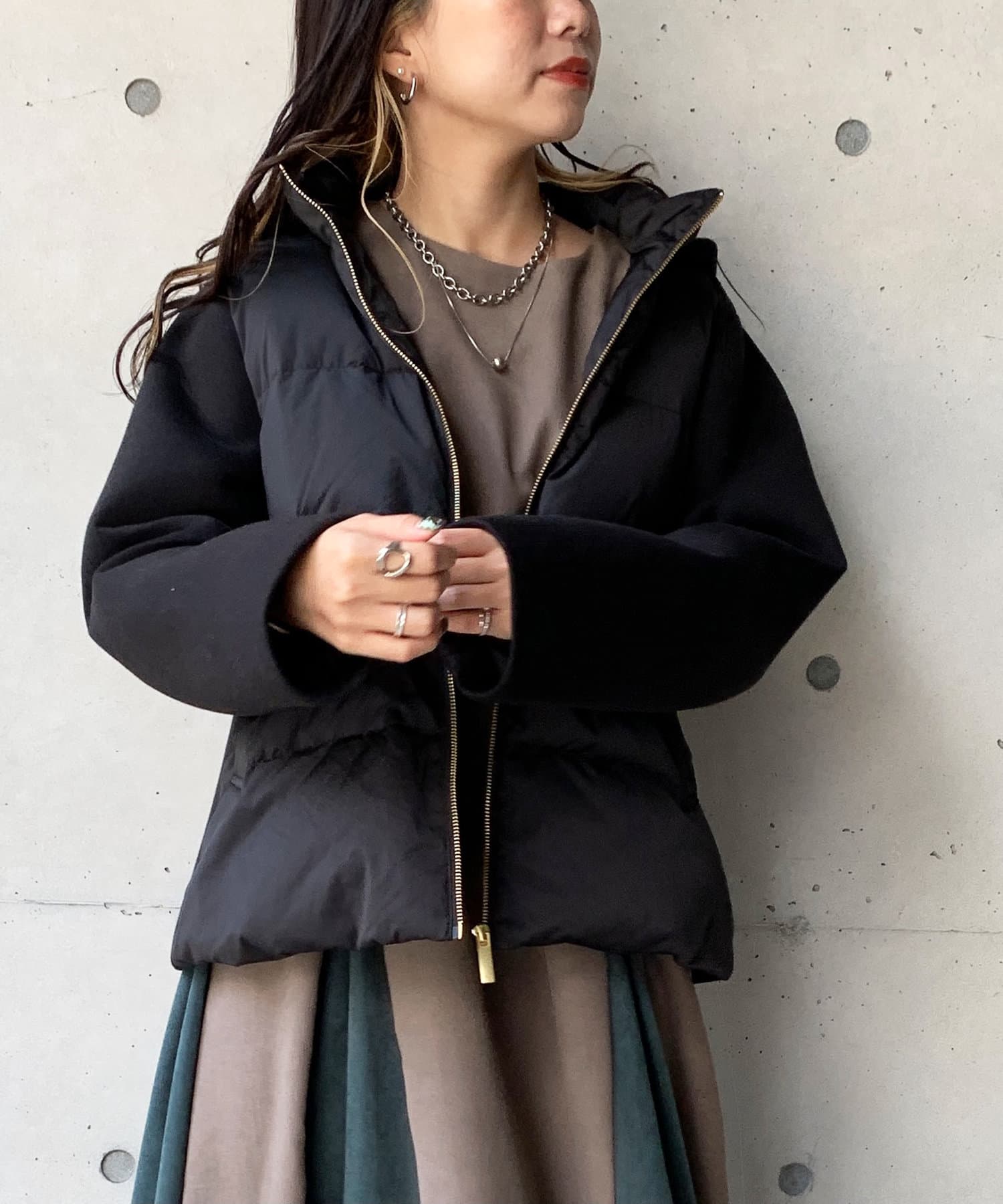 ショート丈で着膨れ感もないので、ニットワンピースやハイネックニットとコーディネートするのがオススメです。