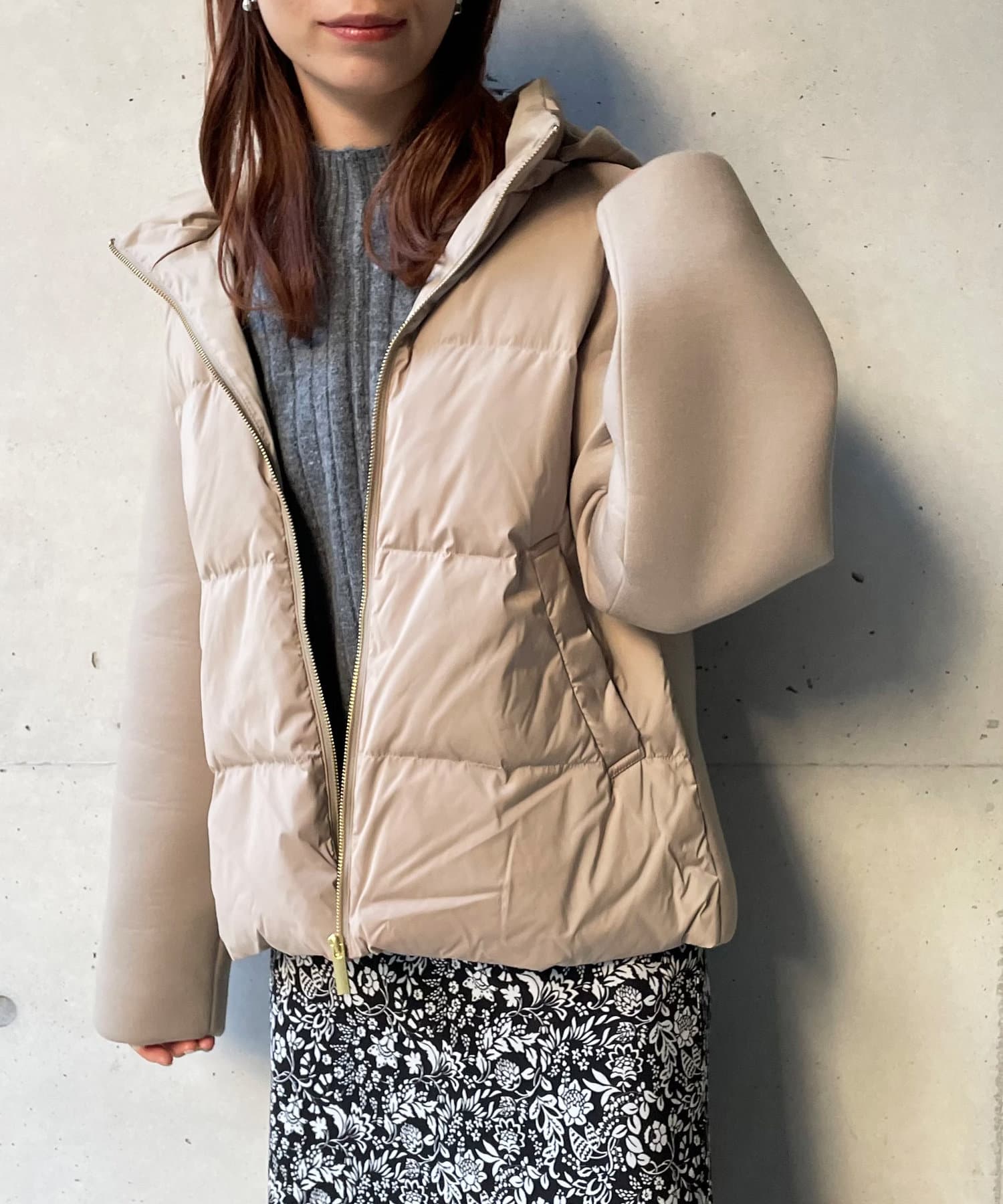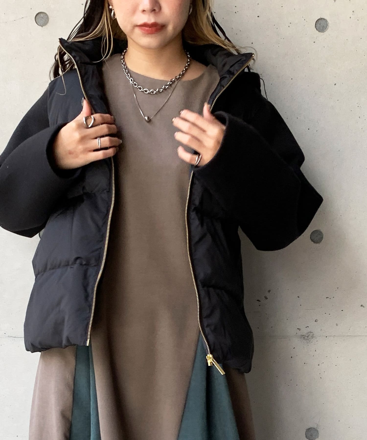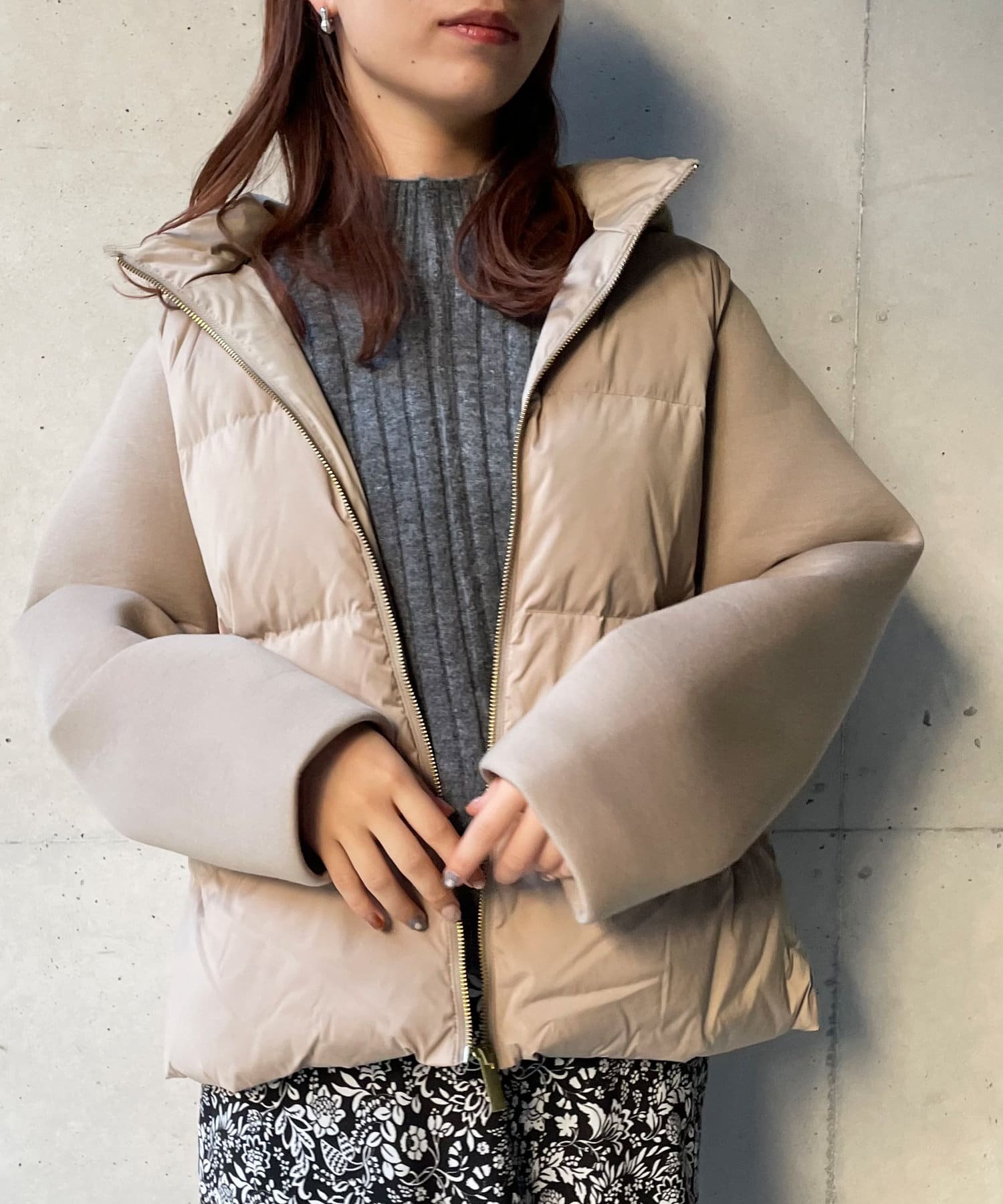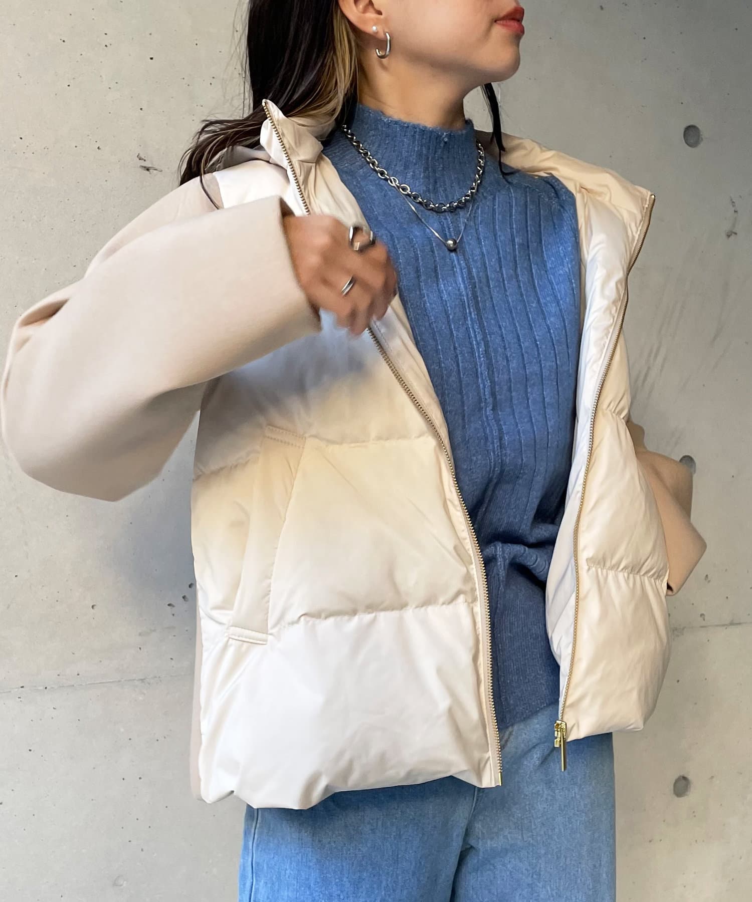 ショート丈で着膨れ感もないので、ニットワンピースやハイネックニットとコーディネートするのがオススメです。