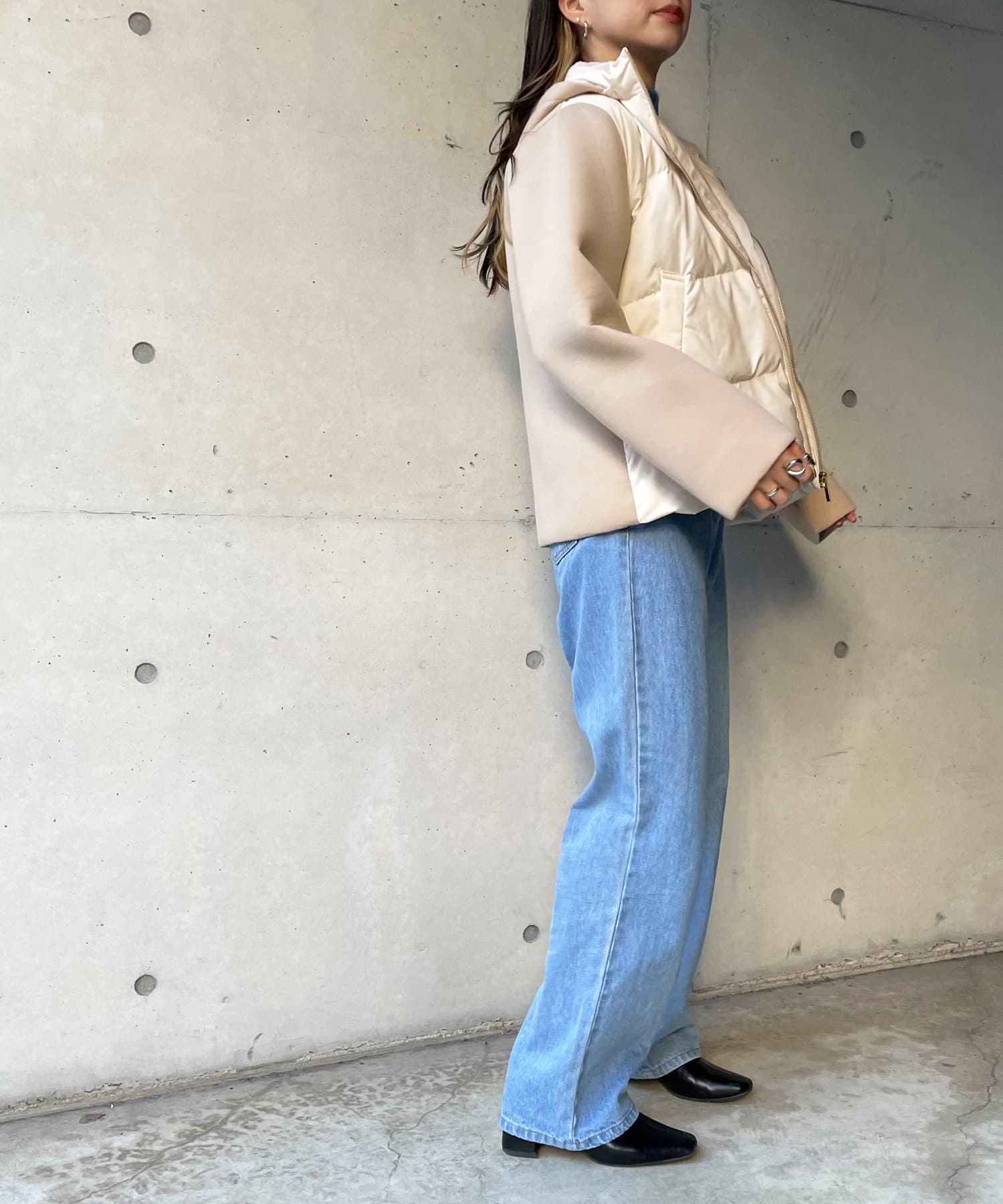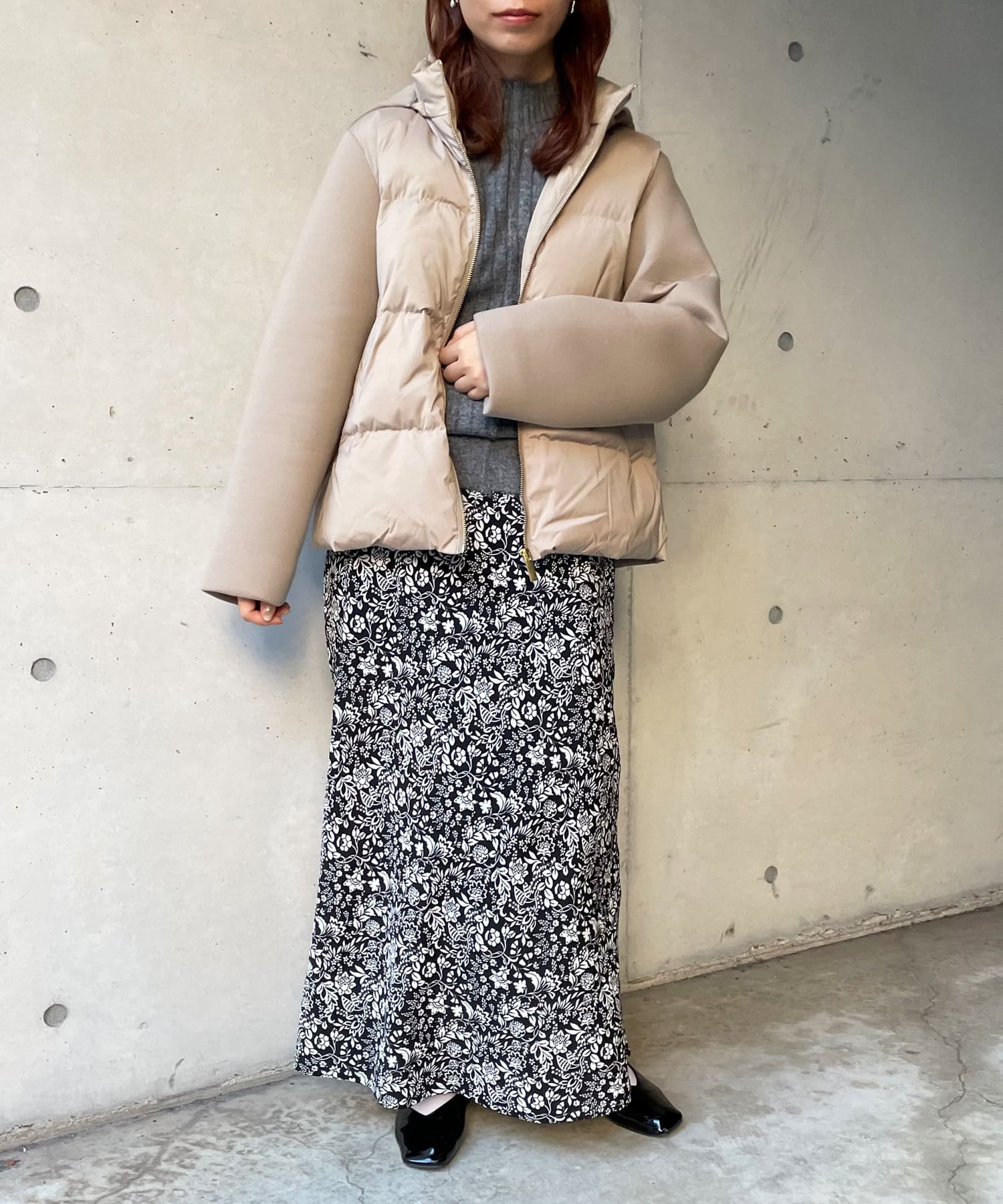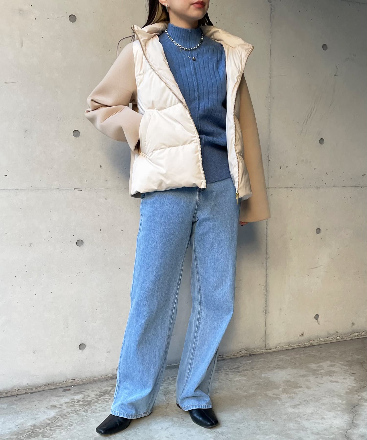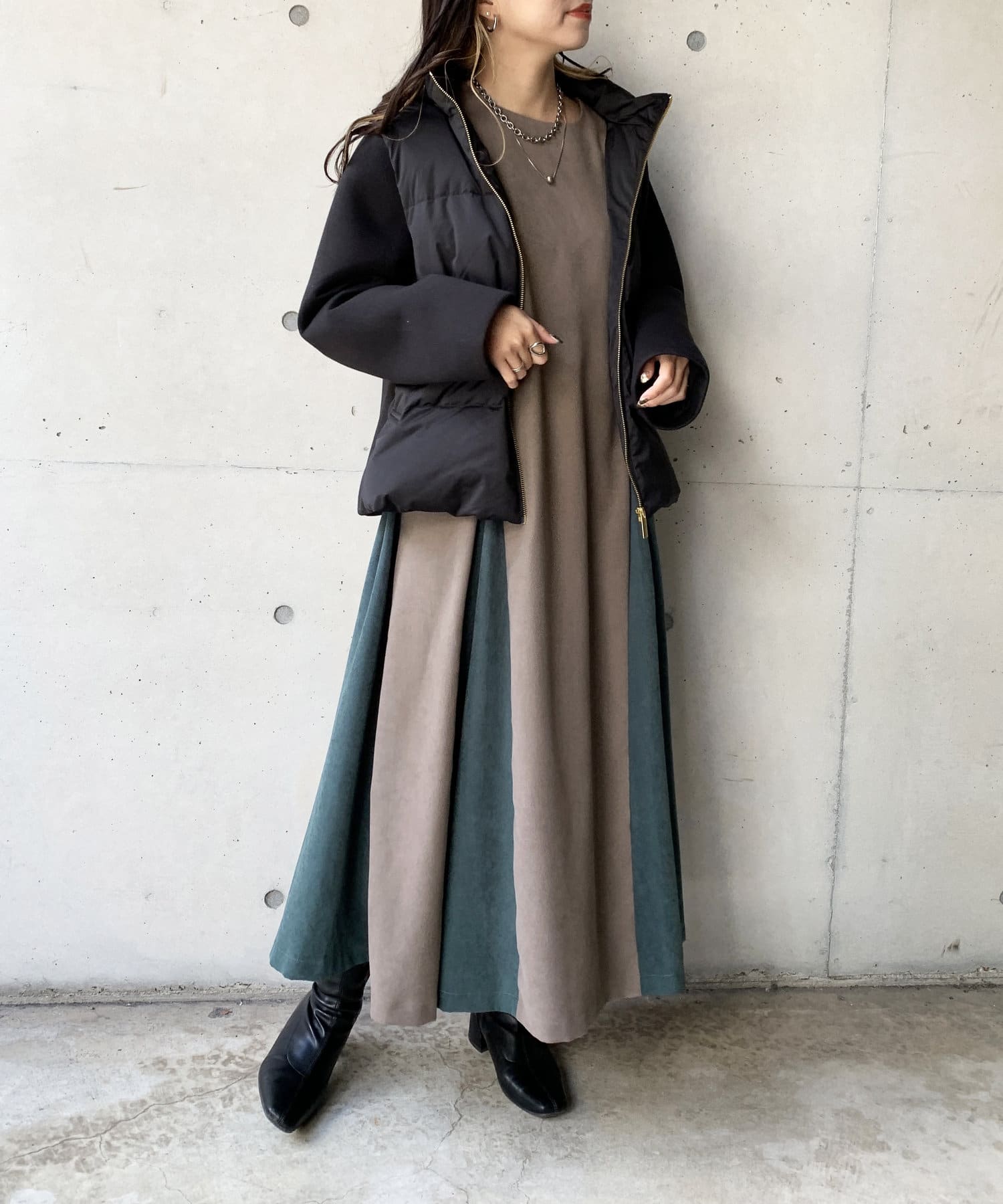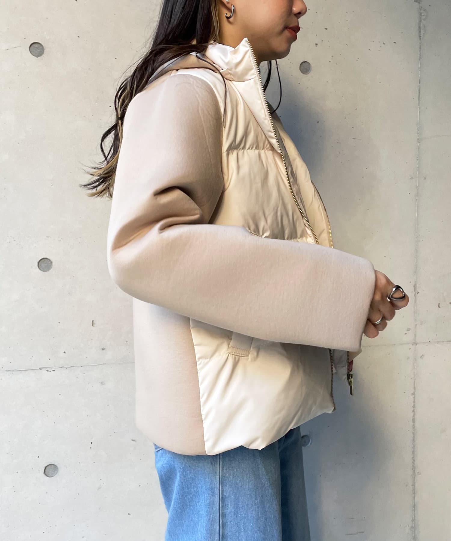 ショート丈で着膨れ感もないので、ニットワンピースやハイネックニットとコーディネートするのがオススメです。