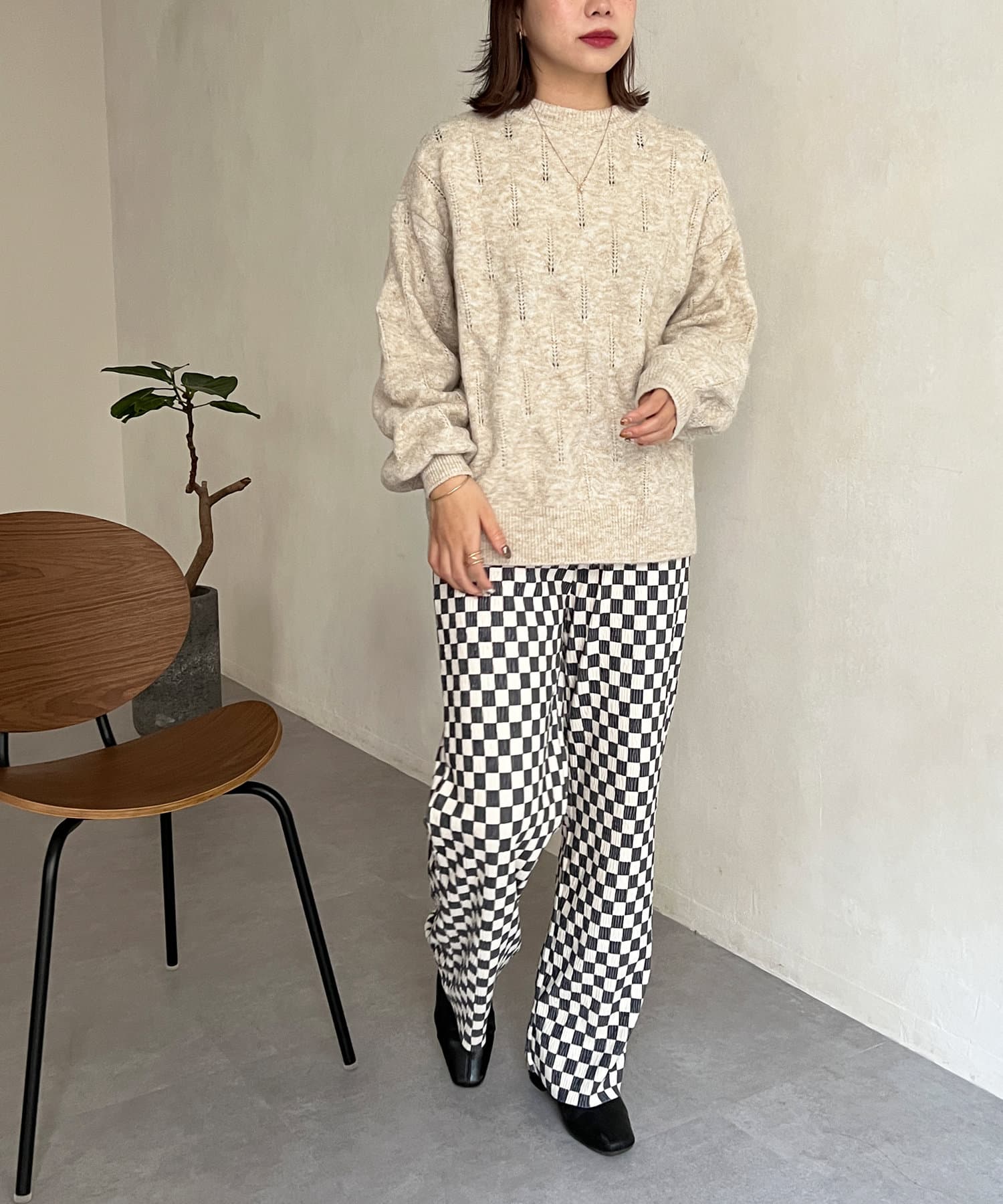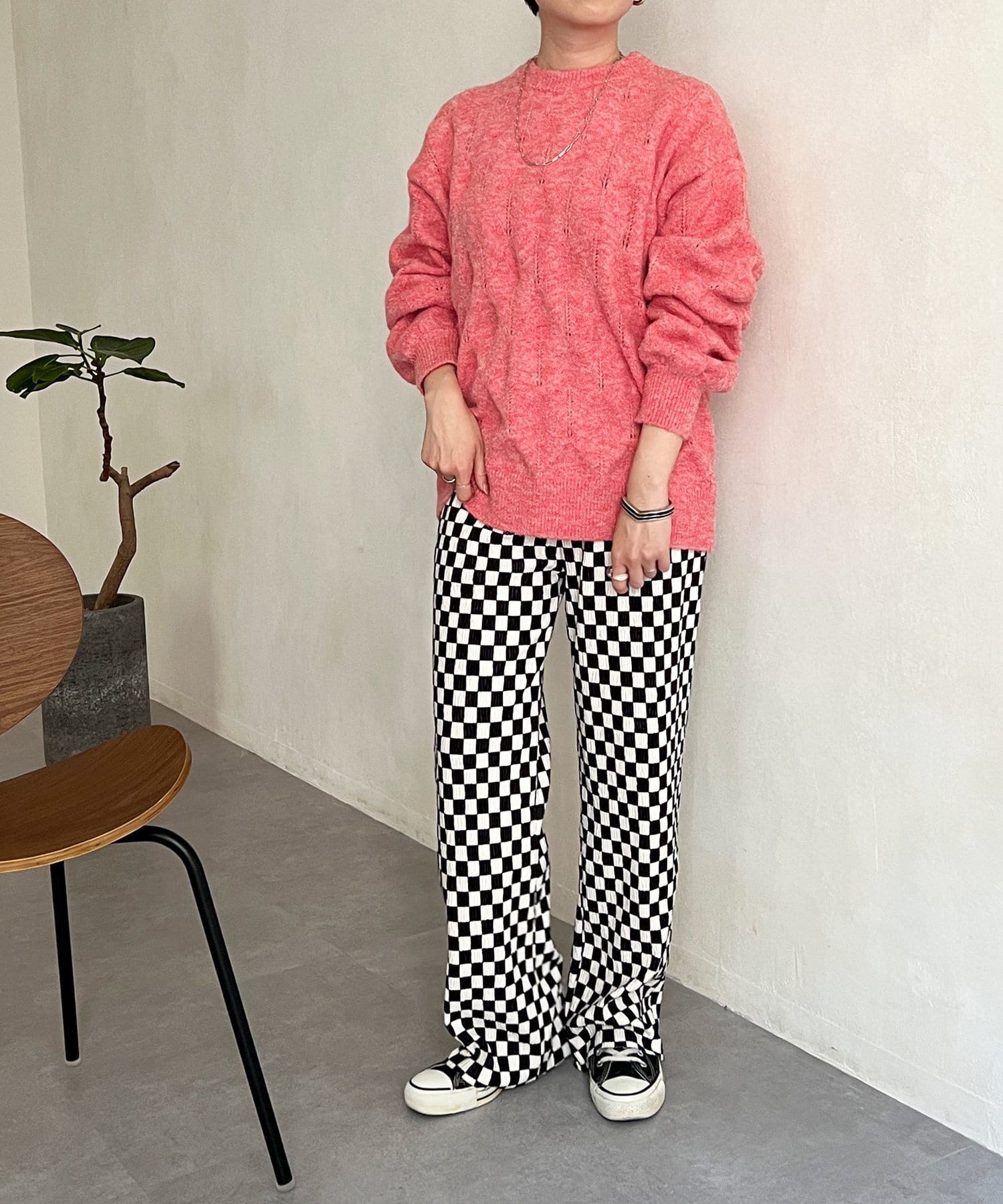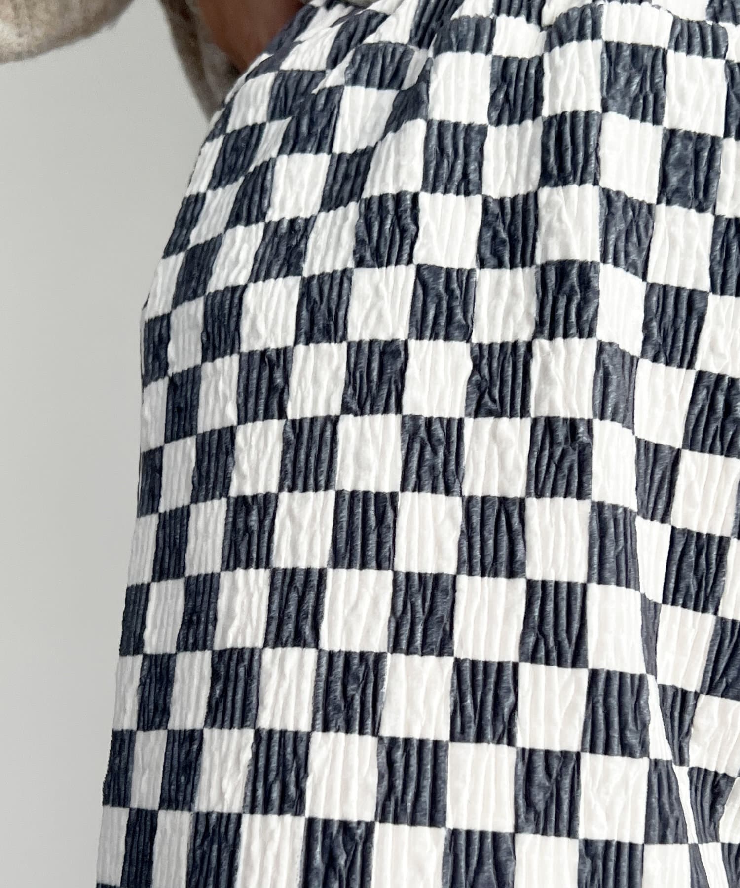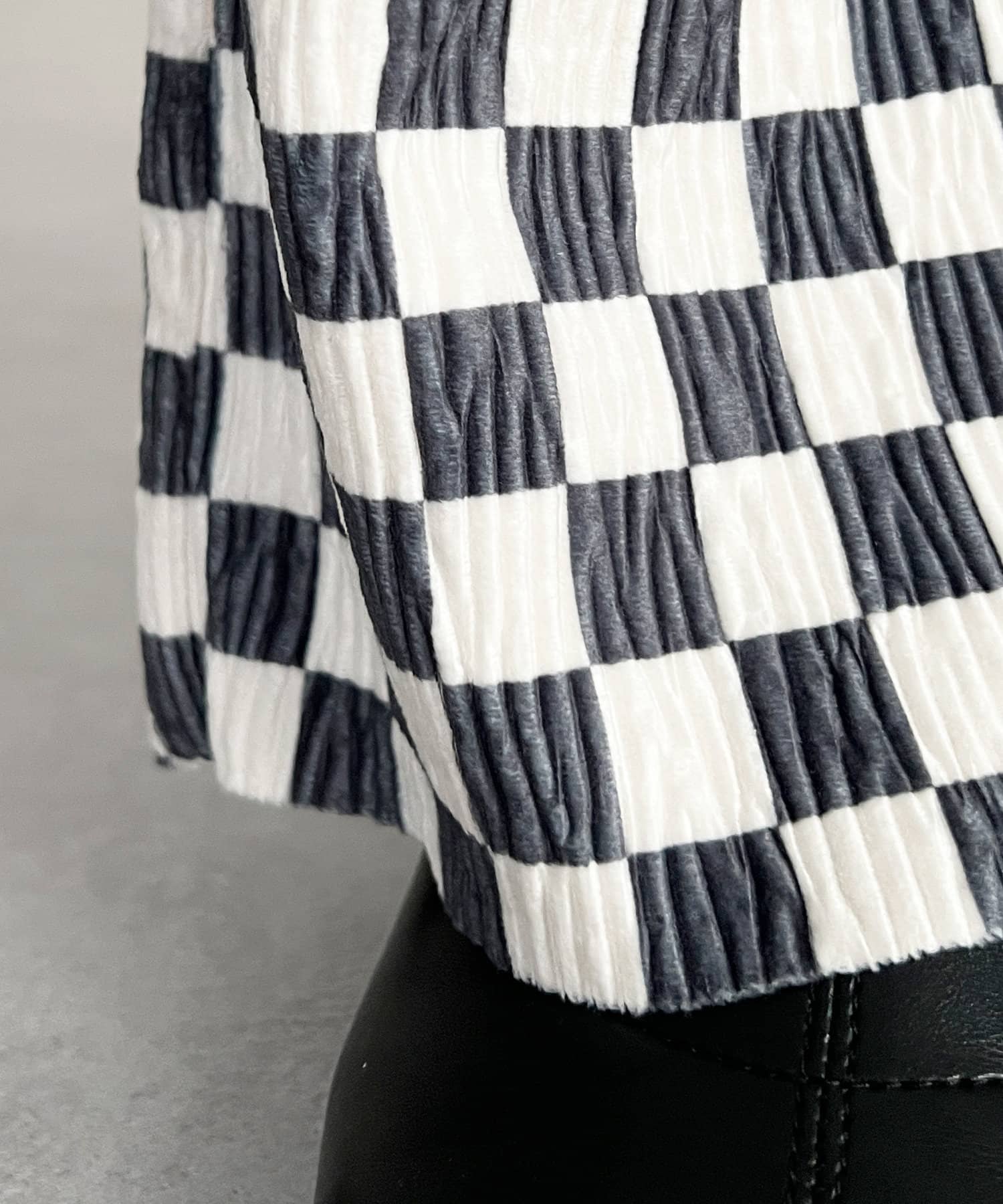 ・存在感のあるチェッカーフラッグ柄とリブのスッキリ効果で、シンプルなコーディネートがお洒落見えします。