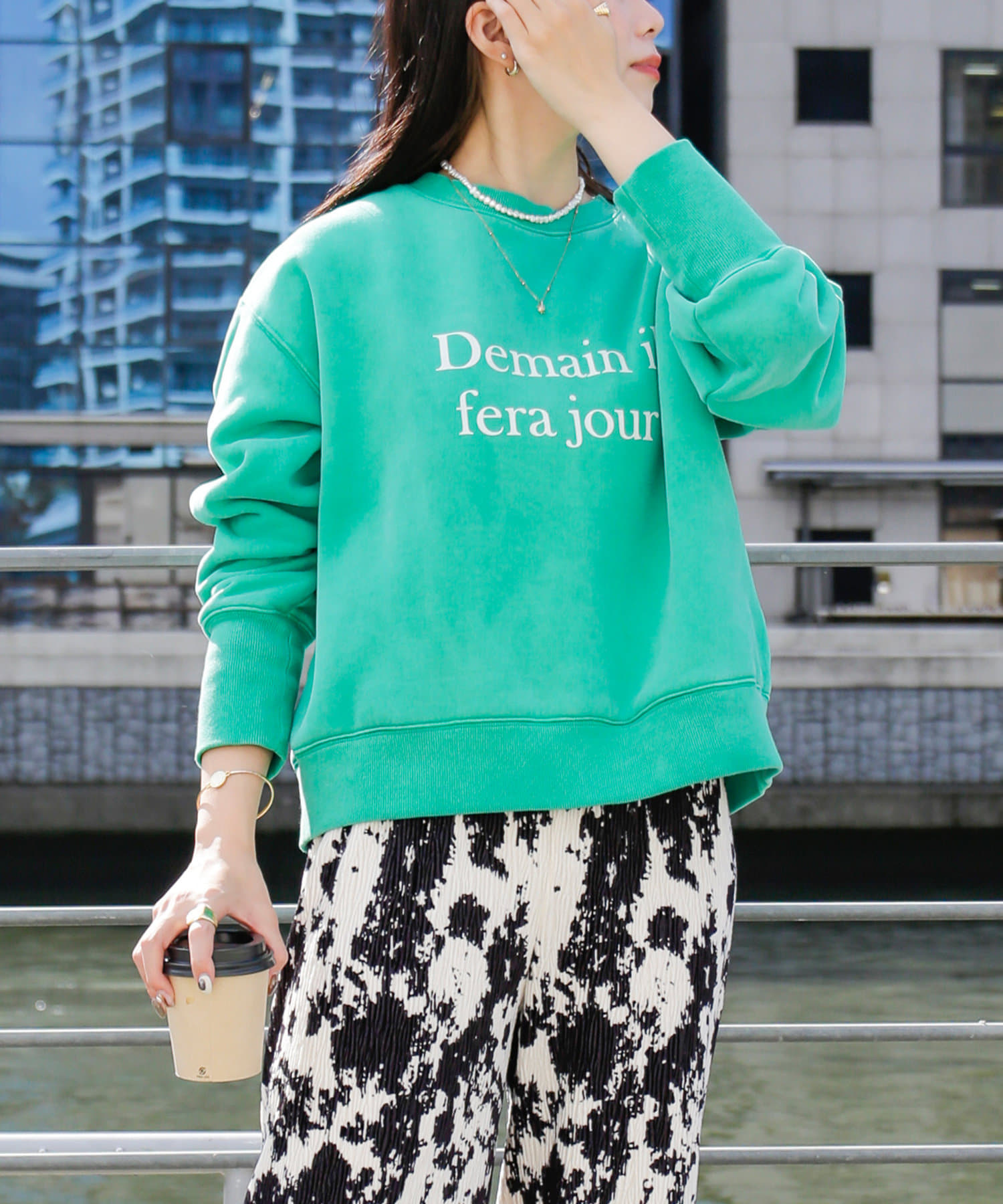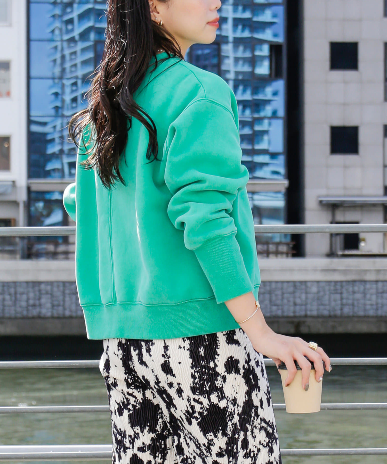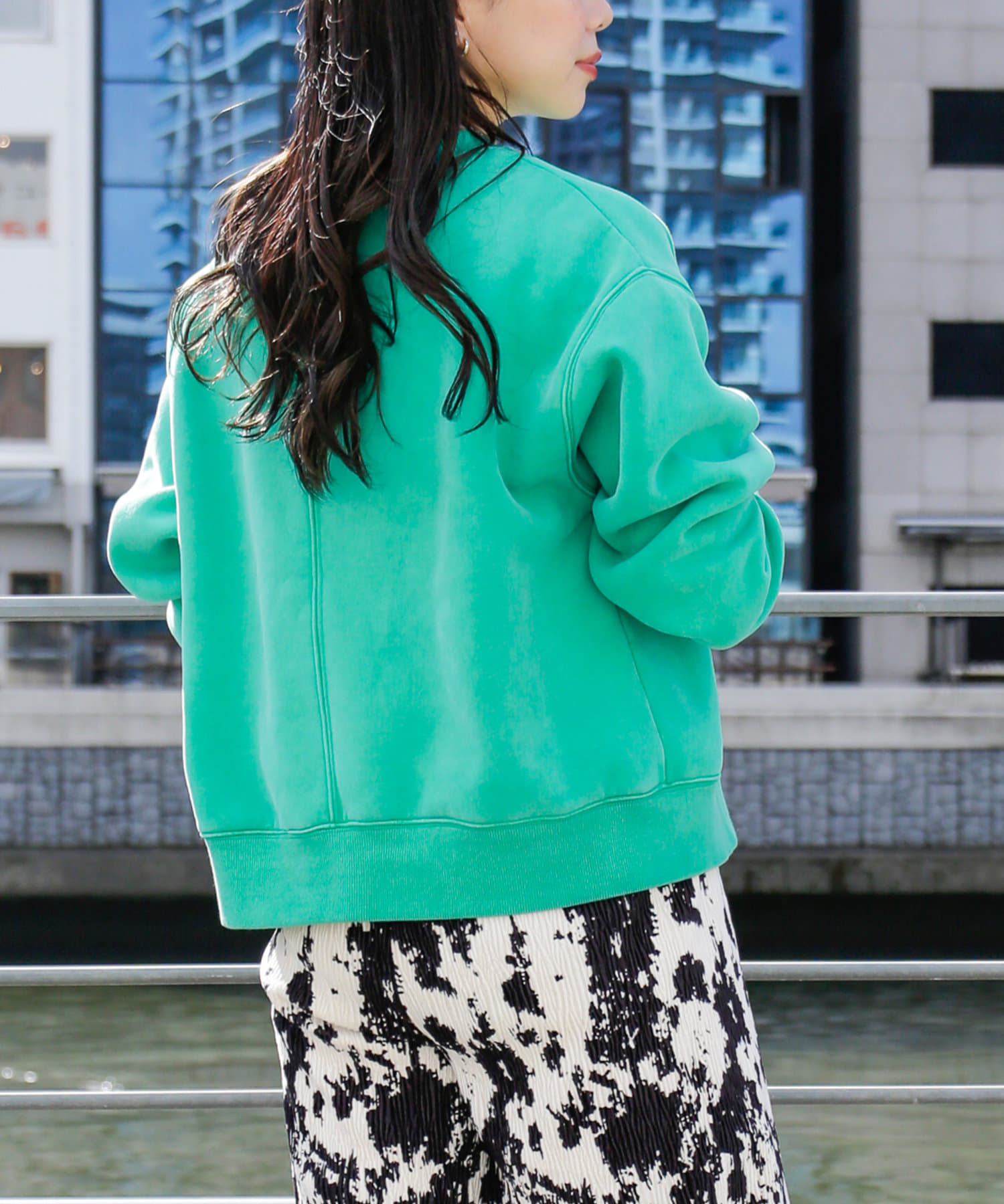 ・鮮やかなグリーン、ピンクのカラーはコーデの主役にぴったりの一着です。