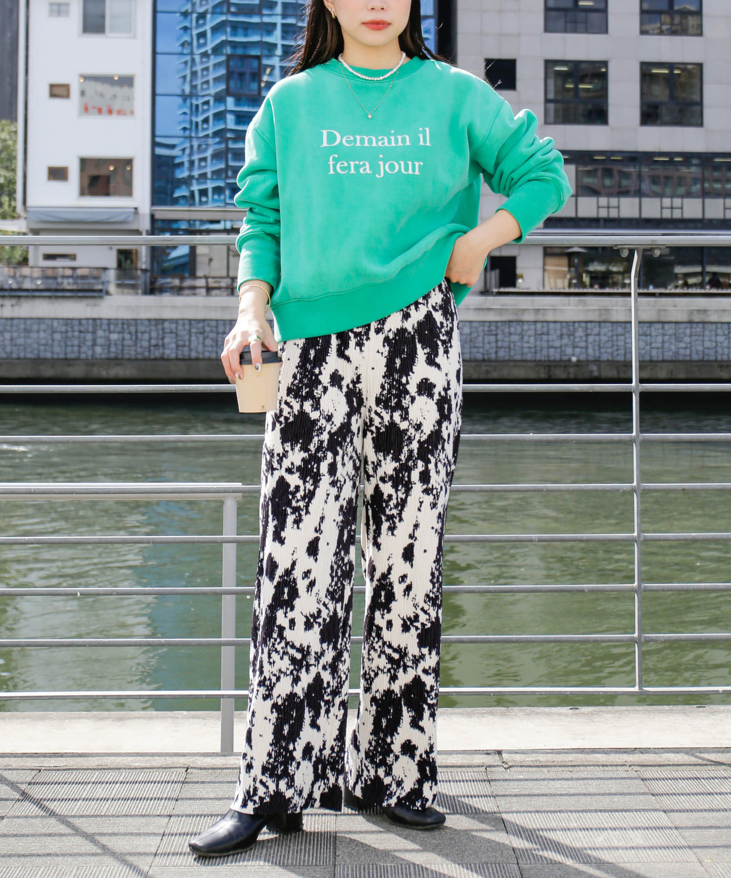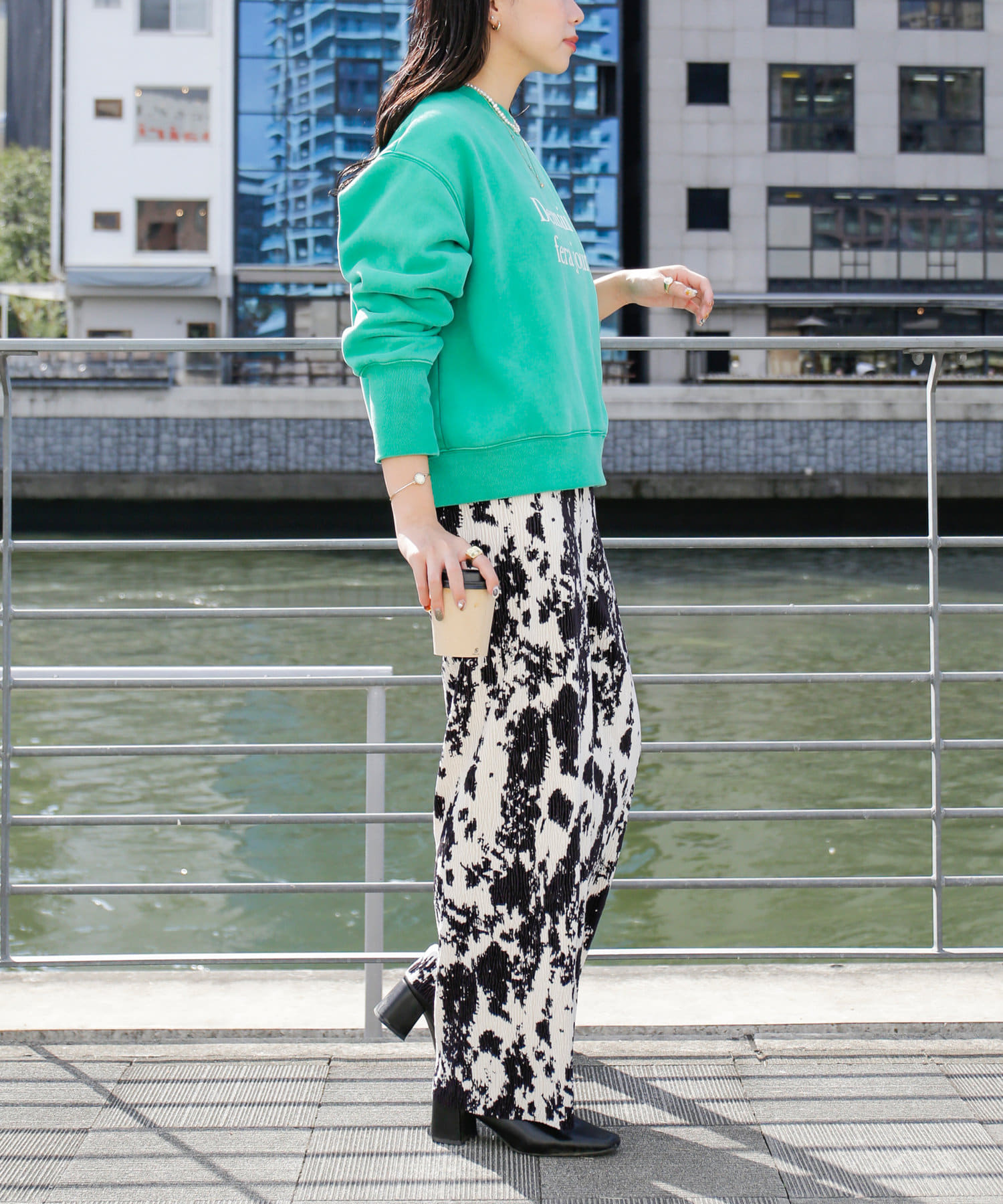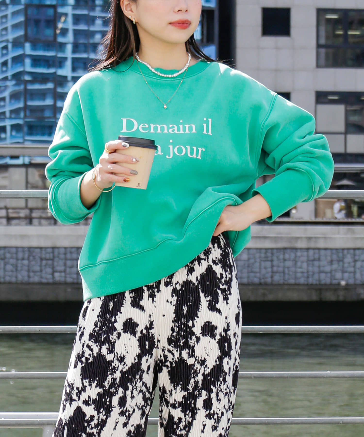 ・鮮やかなグリーン、ピンクのカラーはコーデの主役にぴったりの一着です。