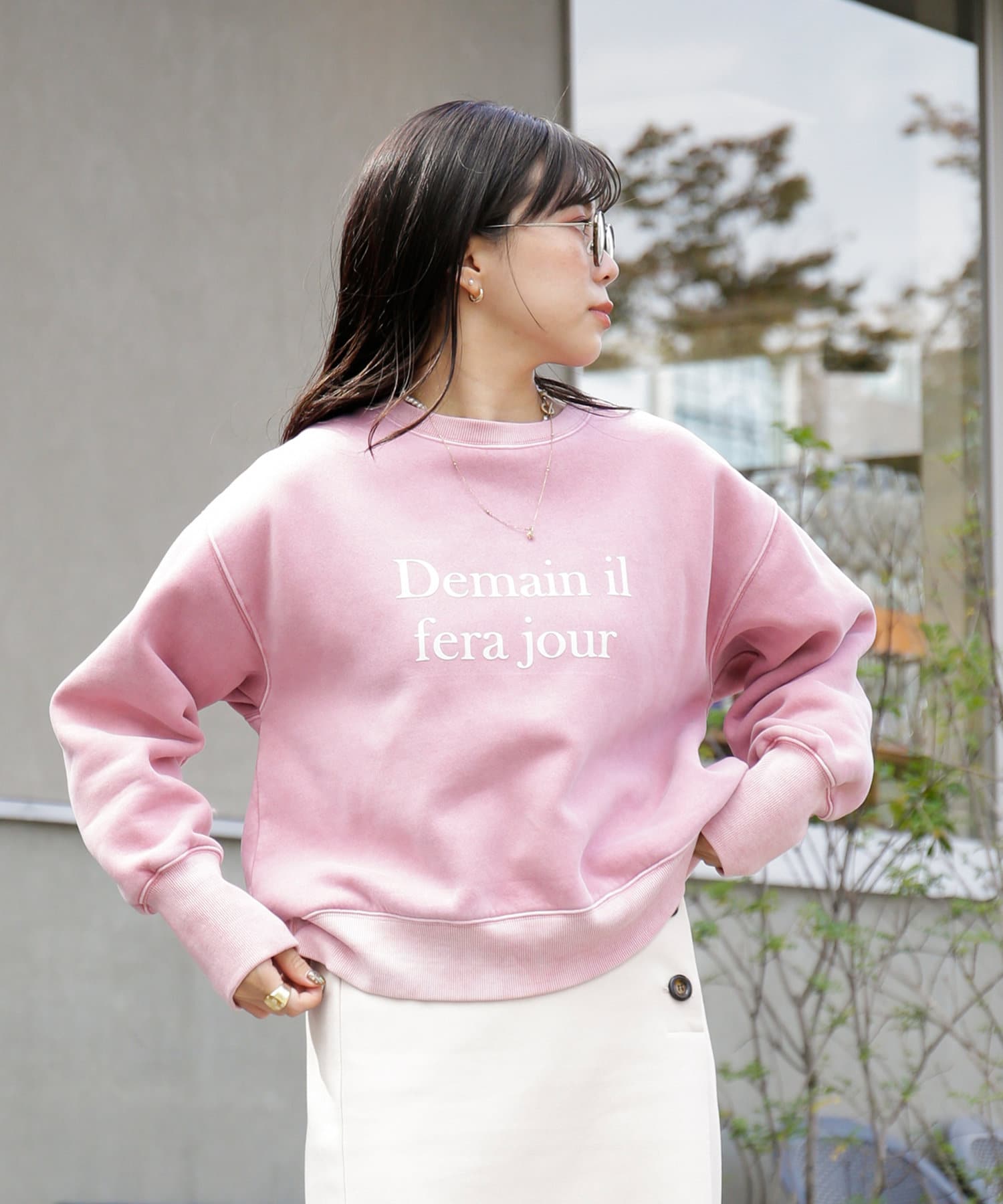 ・短めの丈とゆるっと感が女性らしいシルエットに仕上がります。