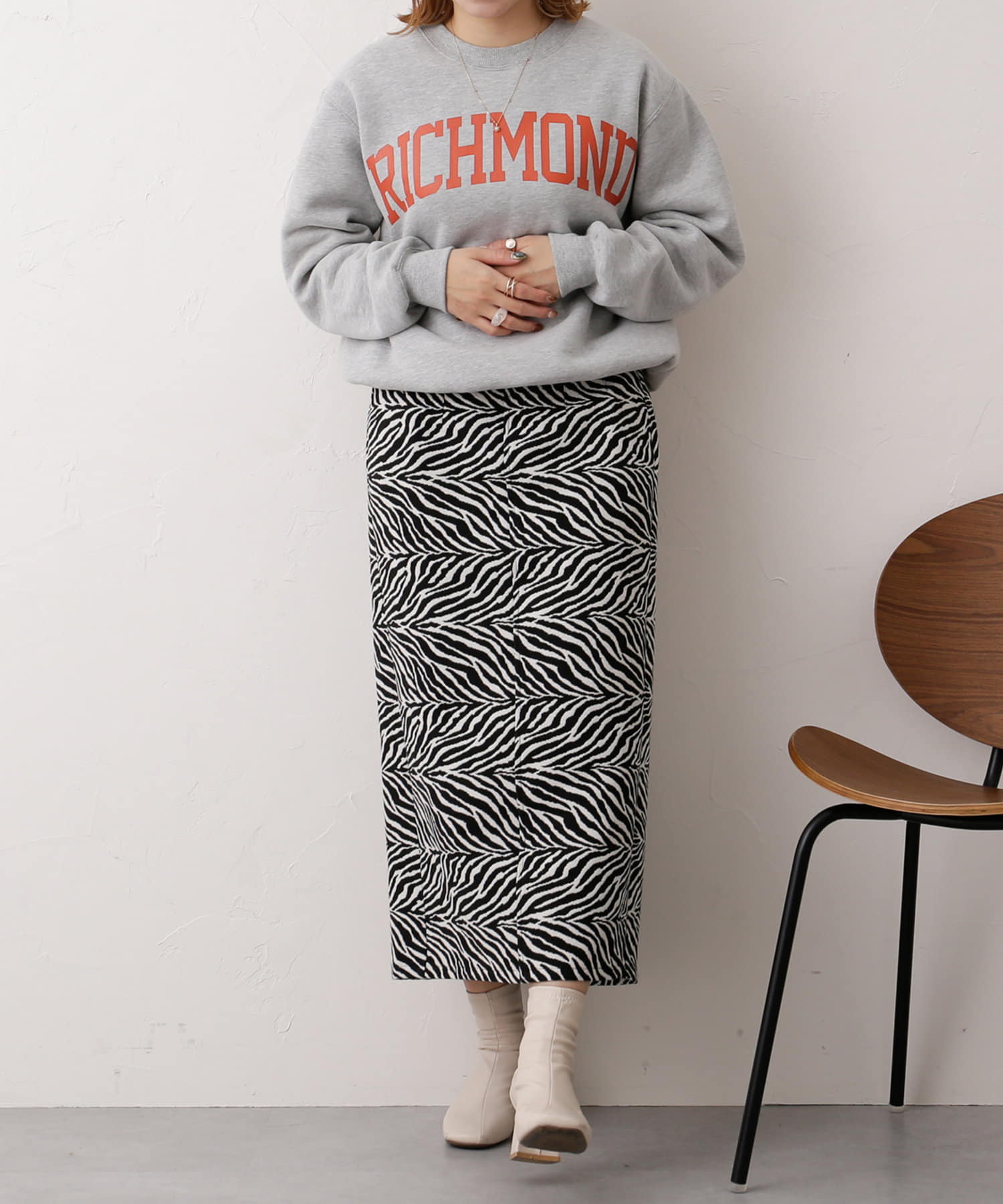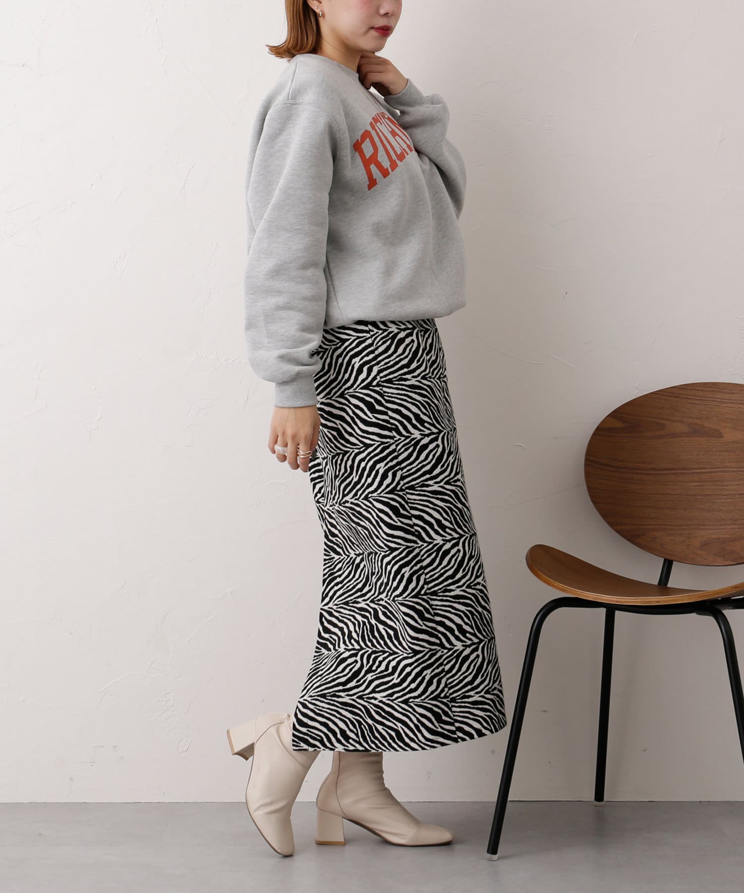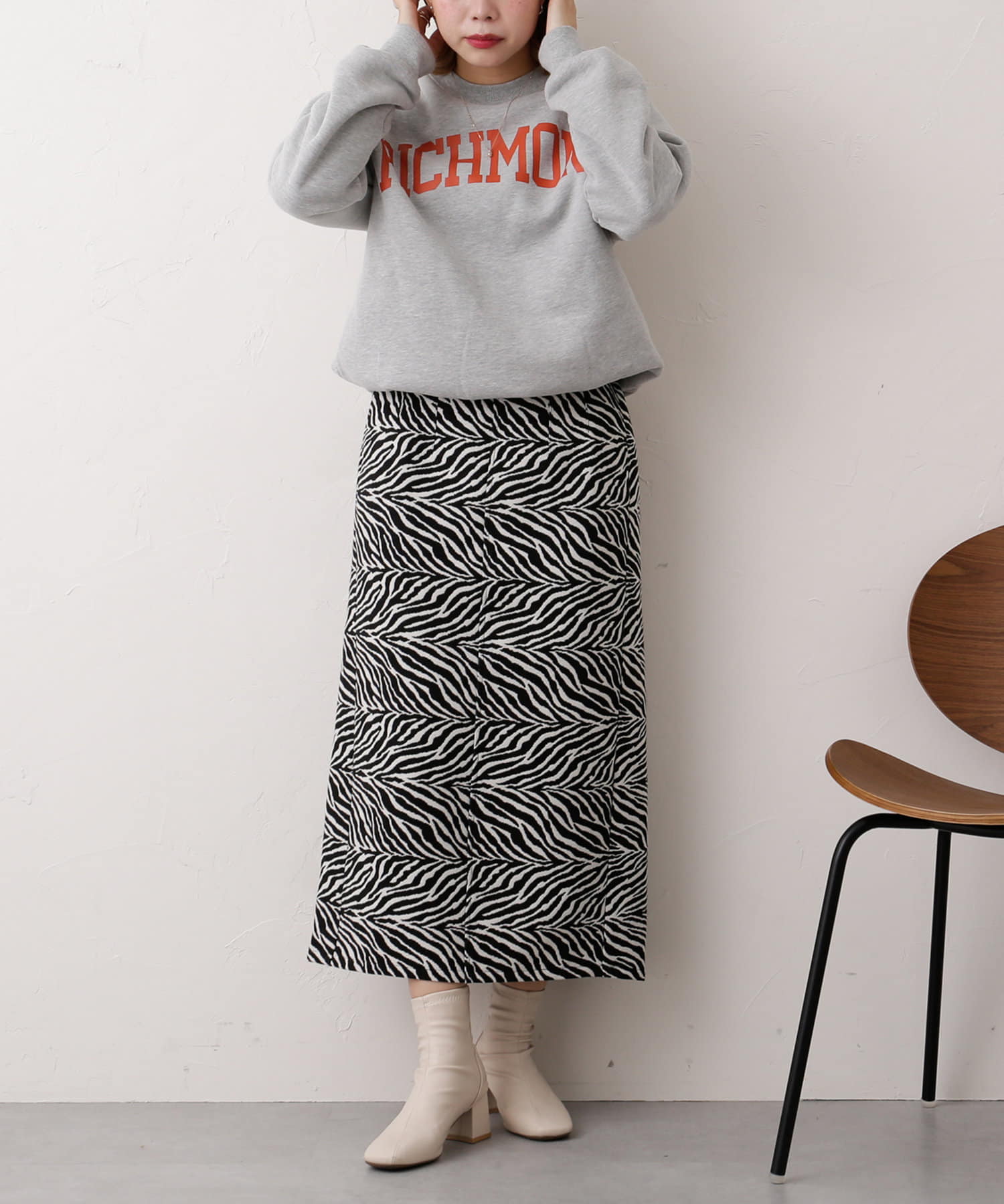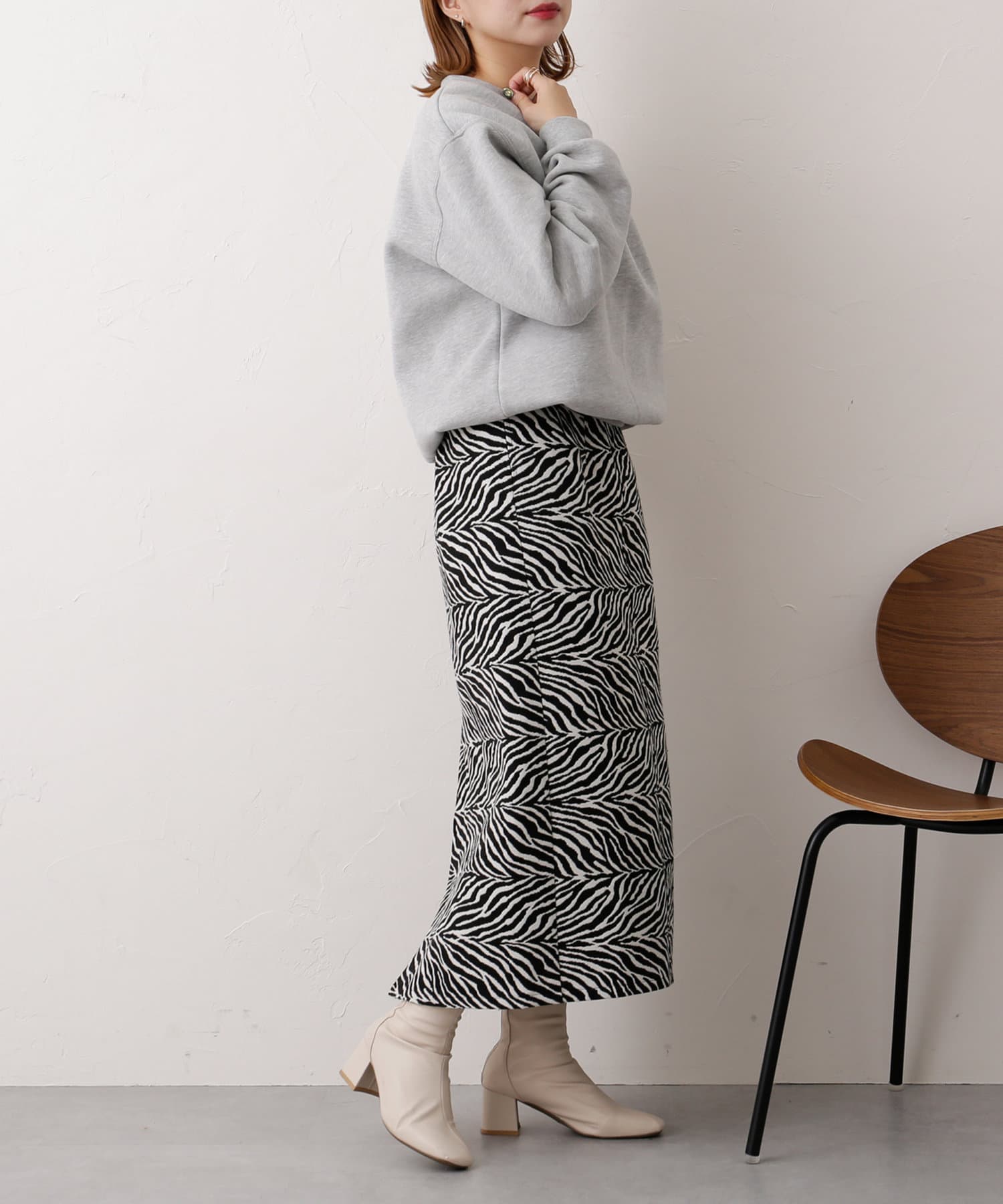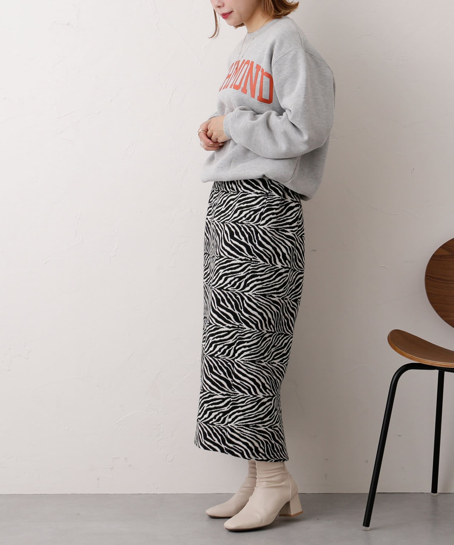 ゼブラの総柄でインパクトのあるスカートなので、トップスはシンプルにまとめてもお洒落見えします。